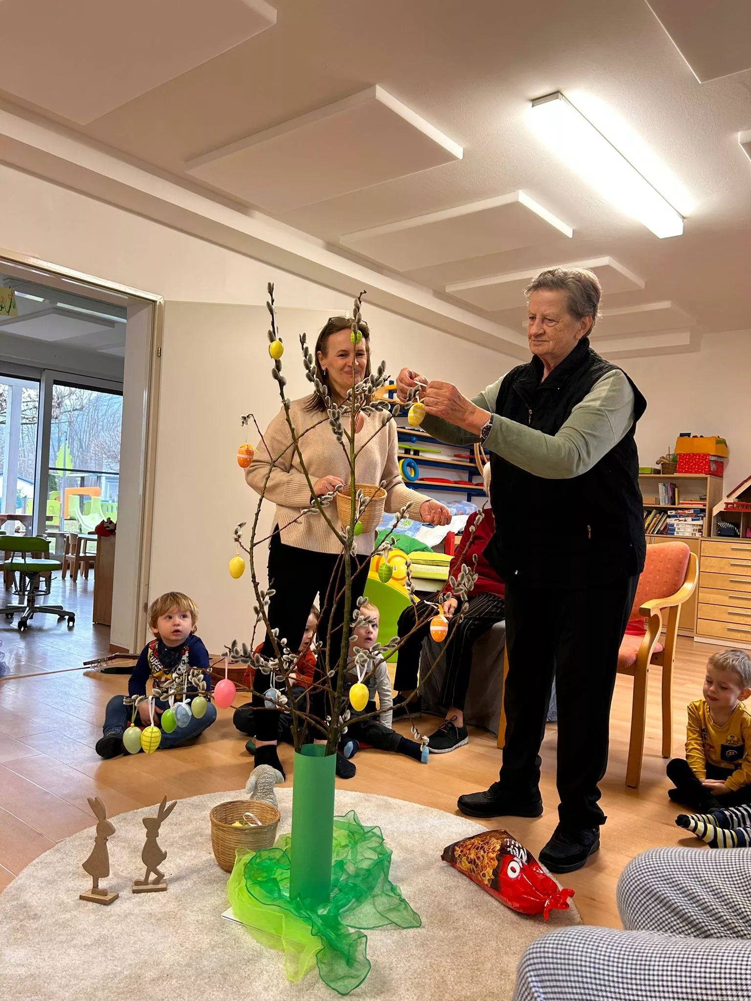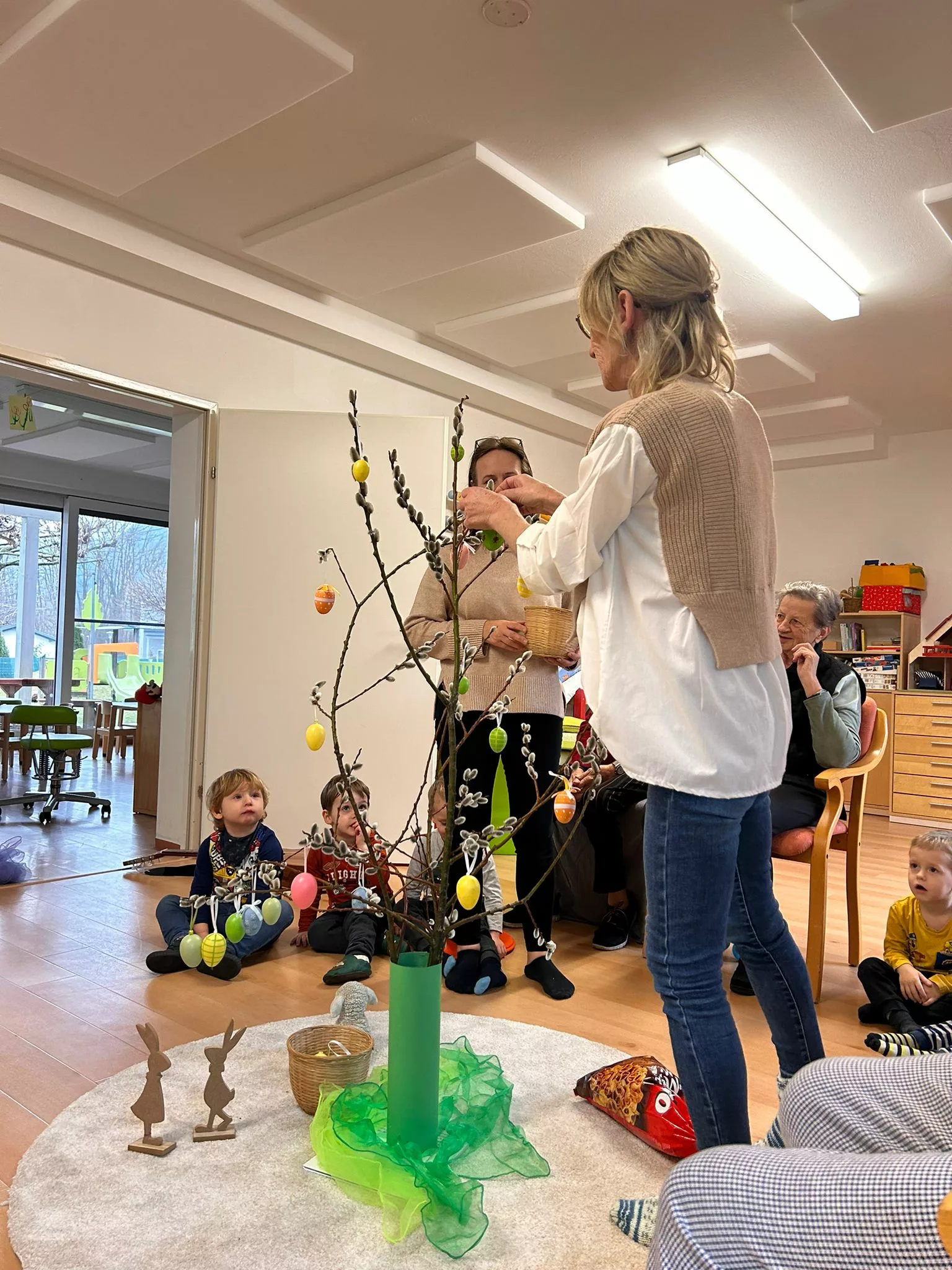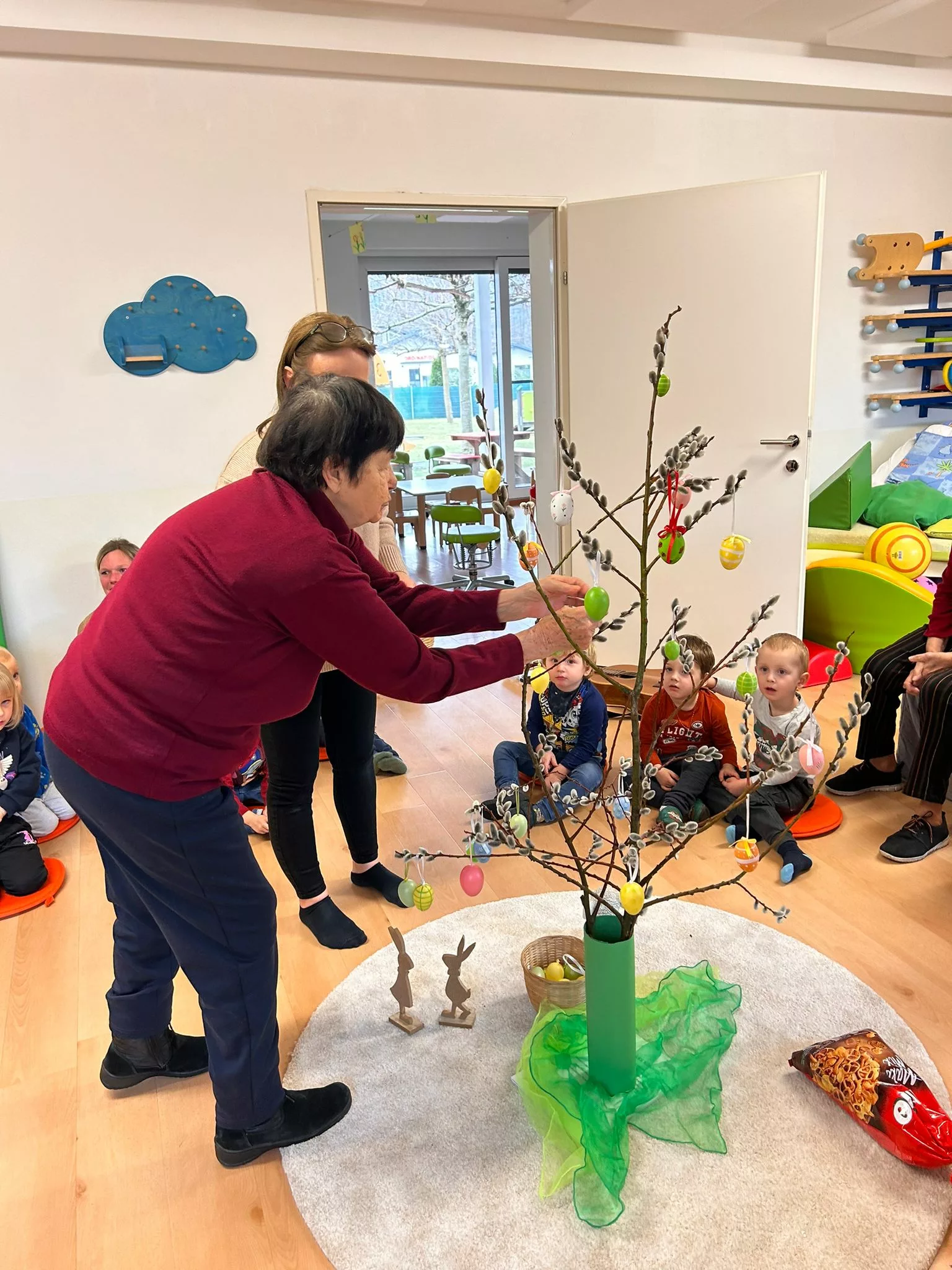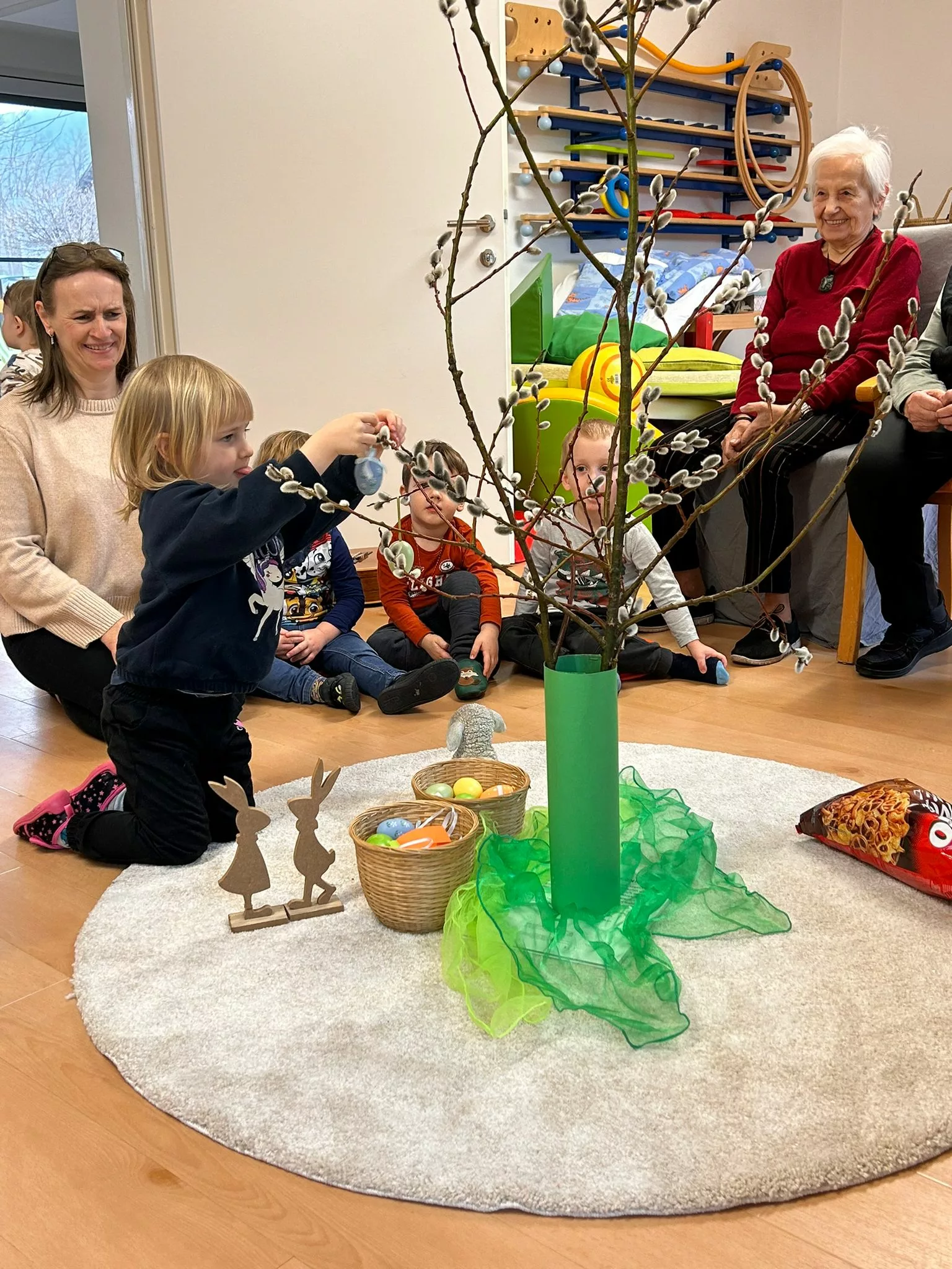 Wir halfen den Kindern beim Bemalen der Ostereier und tobten uns im Bewegungsraum mit den Bällen richtig aus. Im Sitzkreis sangen wir Lieder und schmückten den wunderschönen Osterstrauch mit bunten Ostereiern.