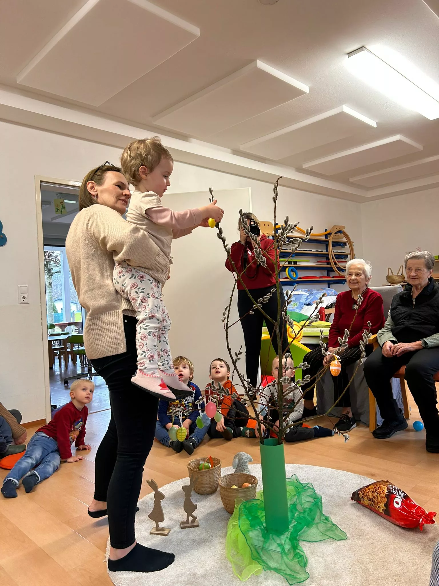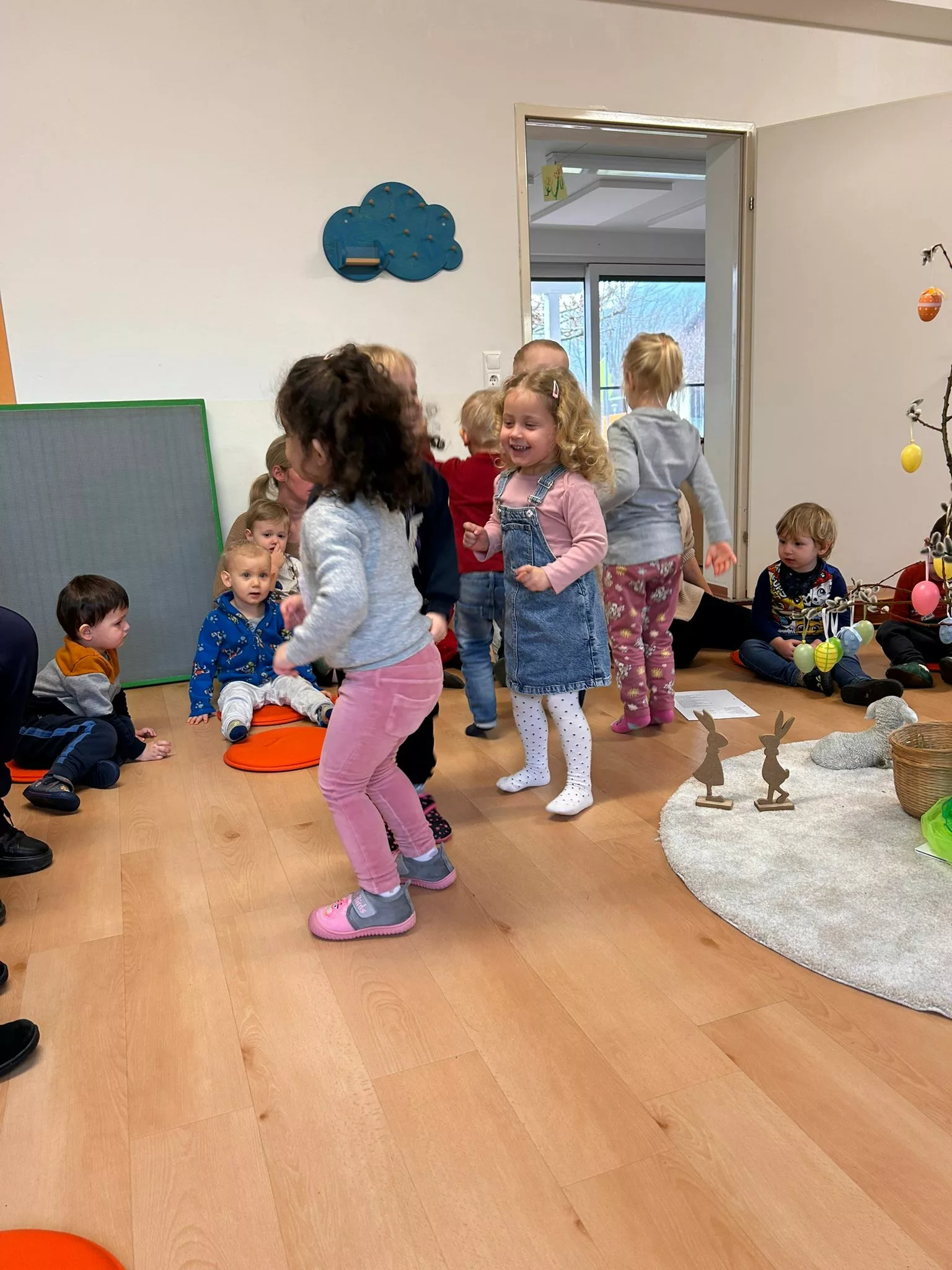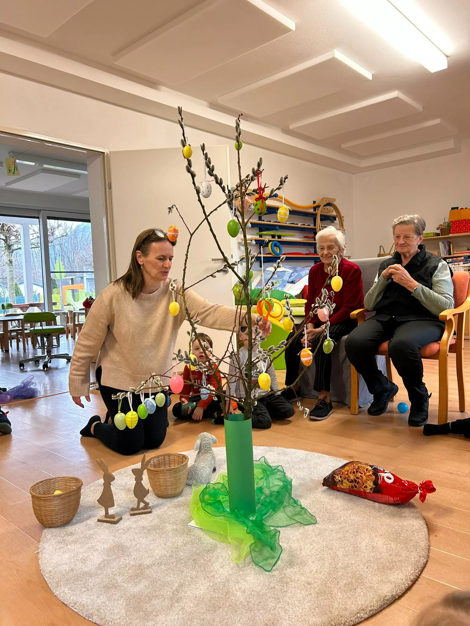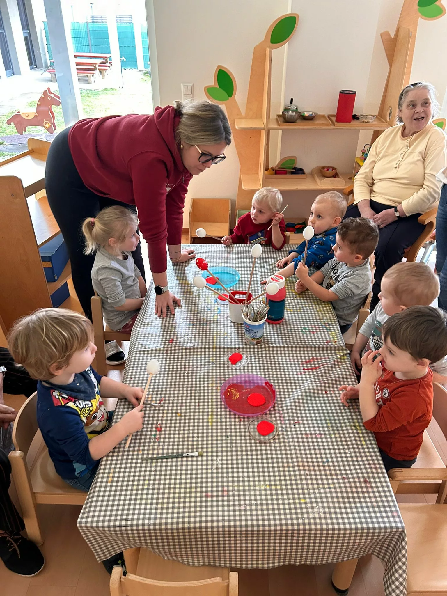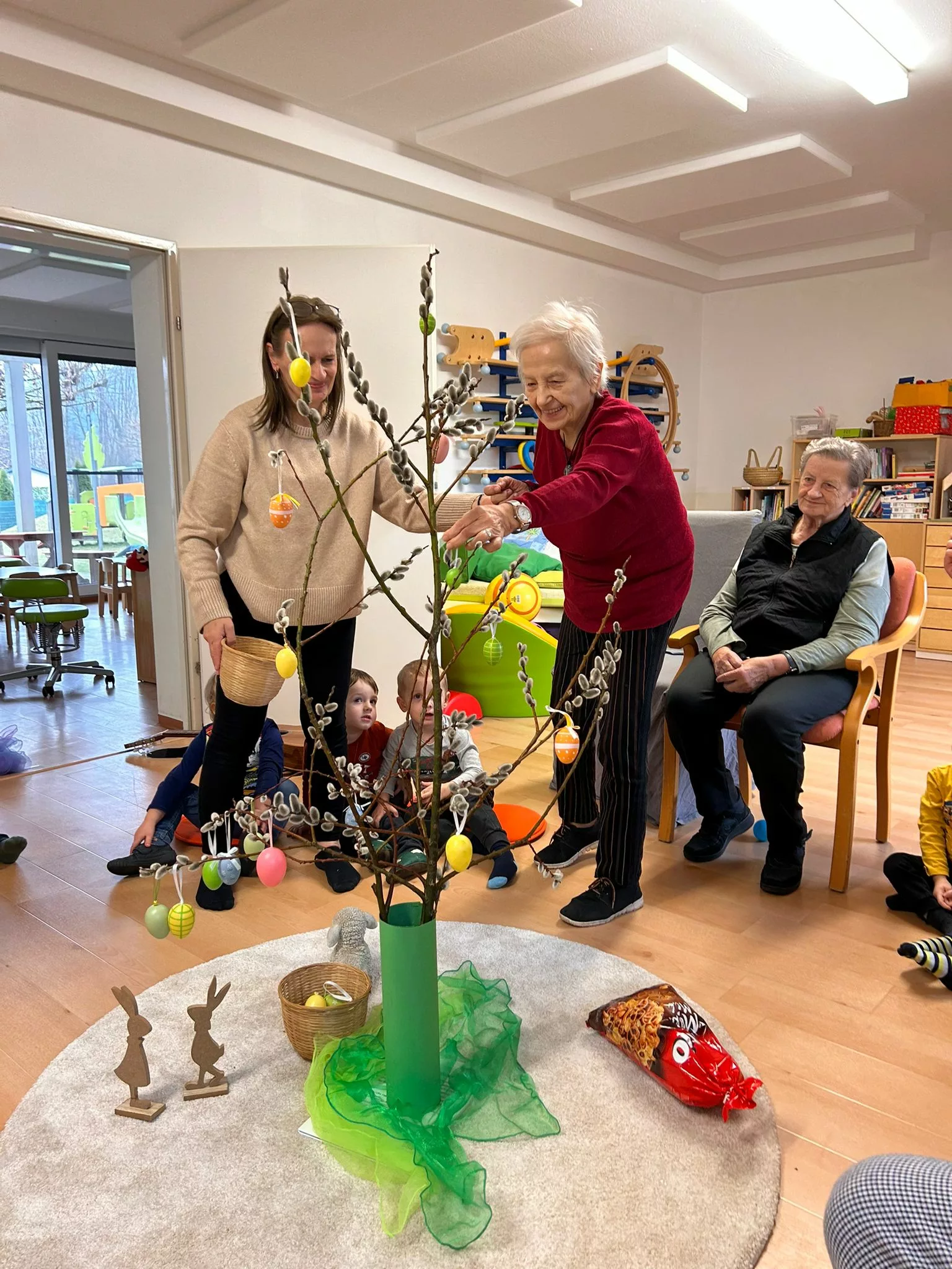 Wir halfen den Kindern beim Bemalen der Ostereier und tobten uns im Bewegungsraum mit den Bällen richtig aus. Im Sitzkreis sangen wir Lieder und schmückten den wunderschönen Osterstrauch mit bunten Ostereiern.