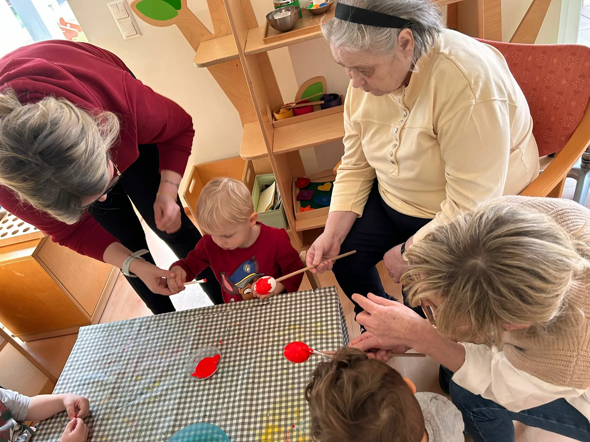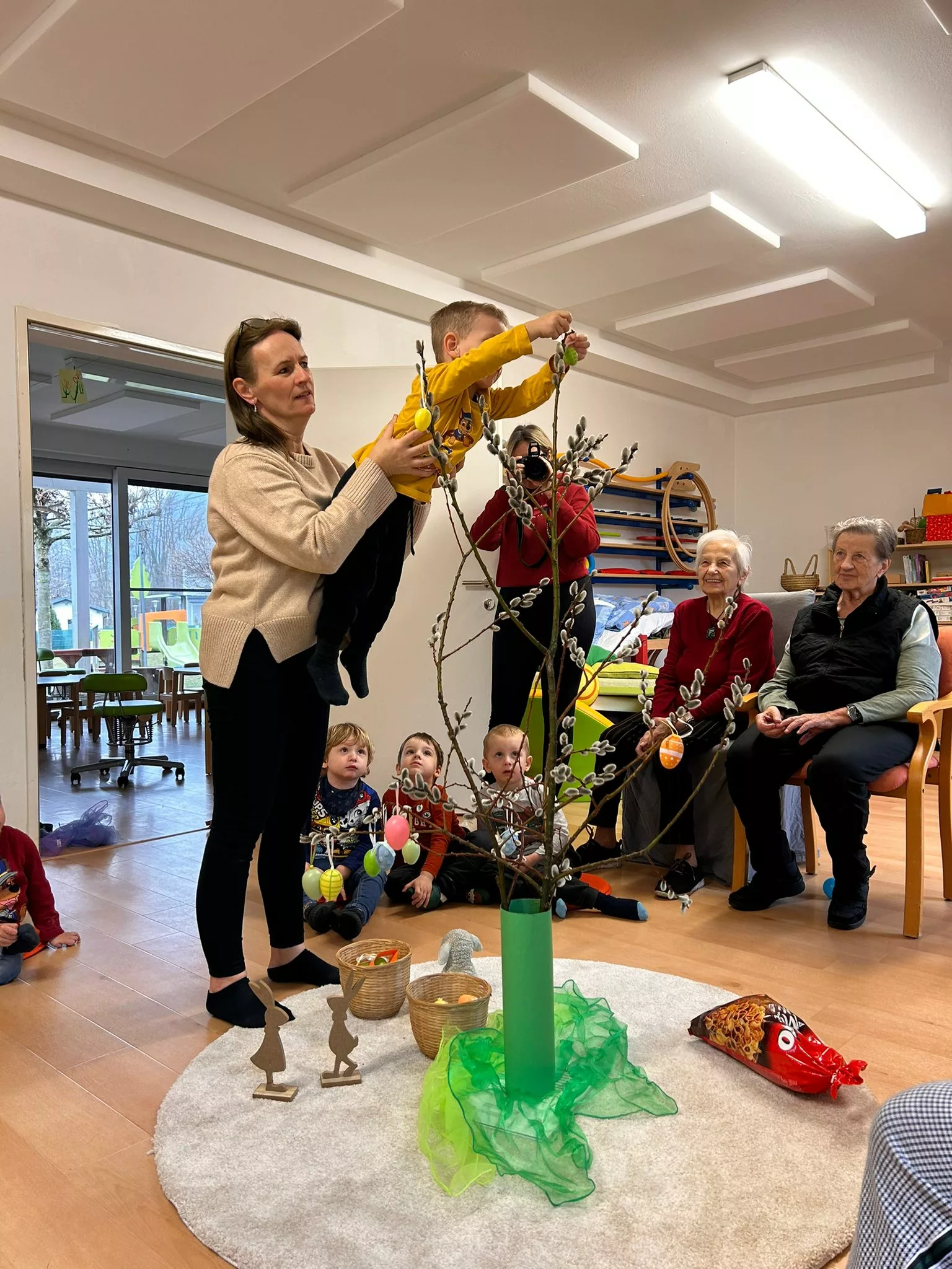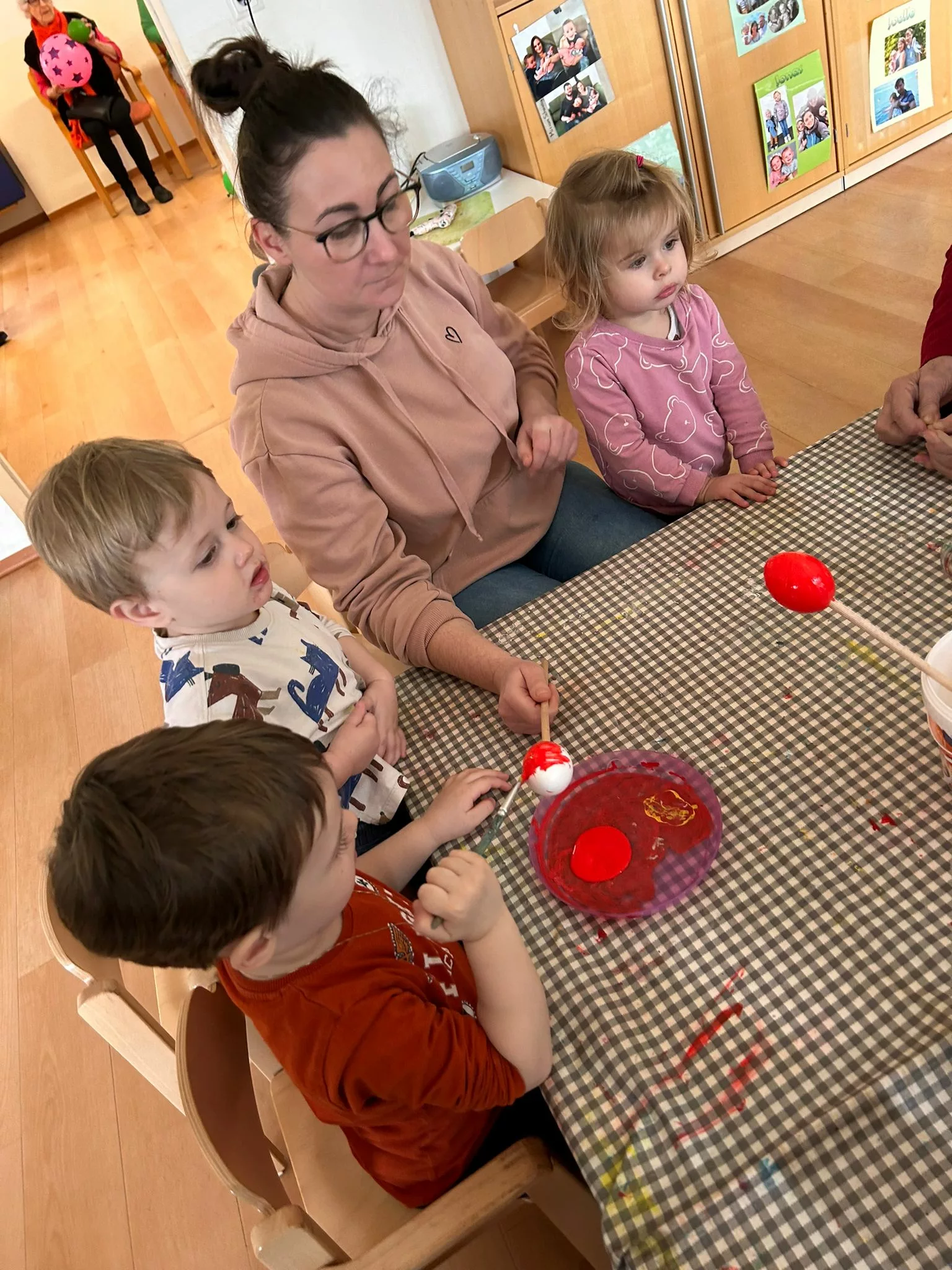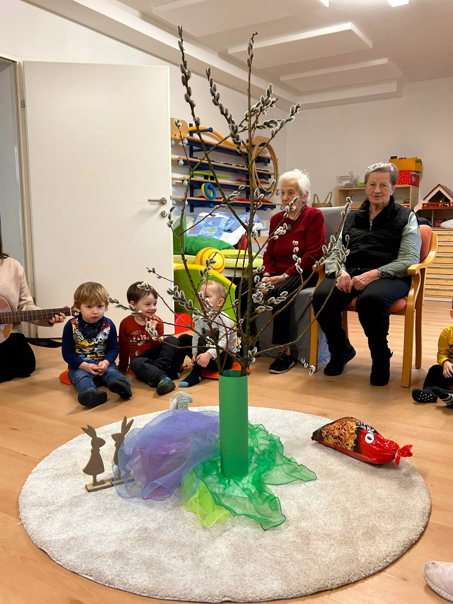 Wir halfen den Kindern beim Bemalen der Ostereier und tobten uns im Bewegungsraum mit den Bällen richtig aus. Im Sitzkreis sangen wir Lieder und schmückten den wunderschönen Osterstrauch mit bunten Ostereiern.