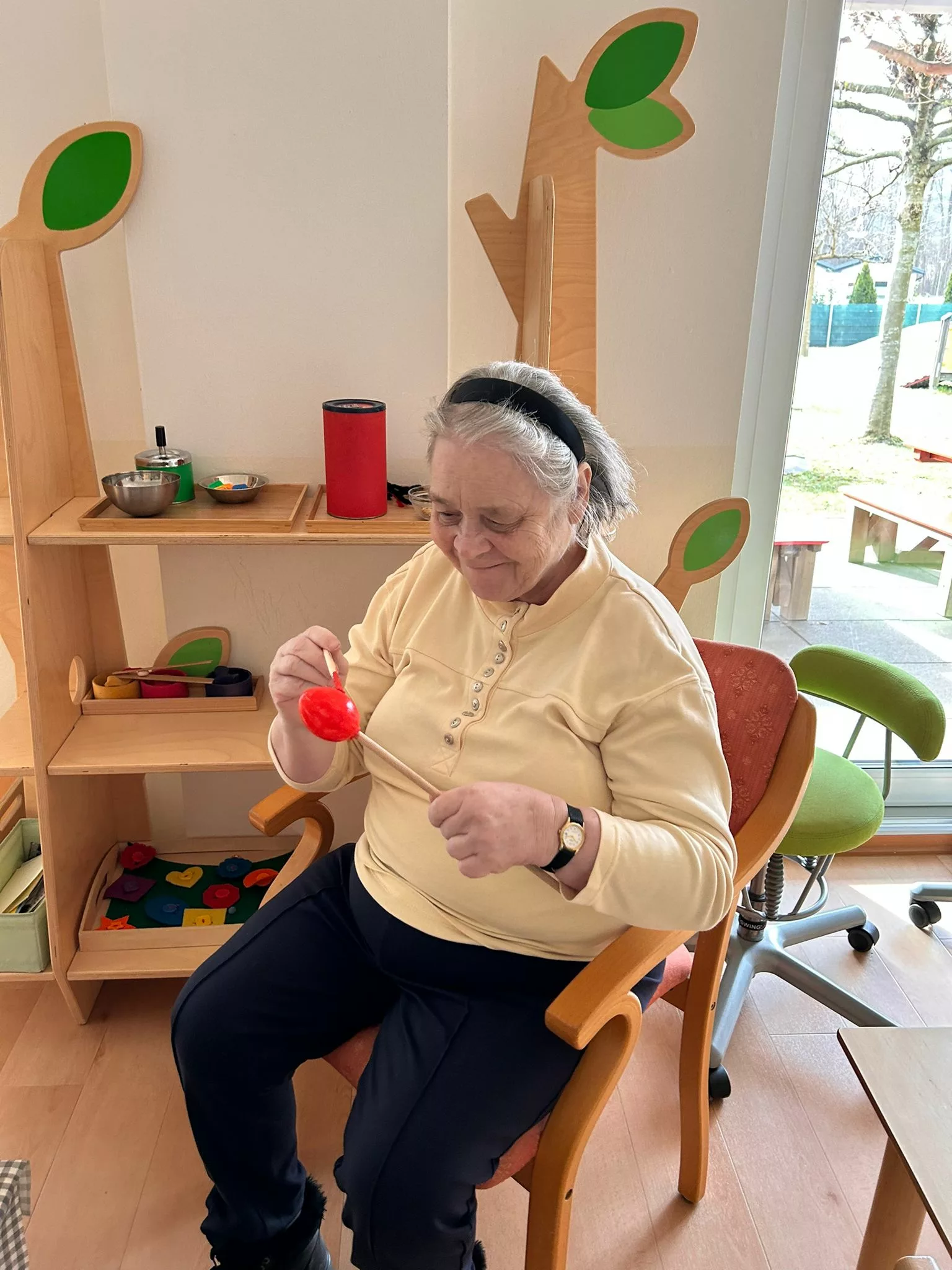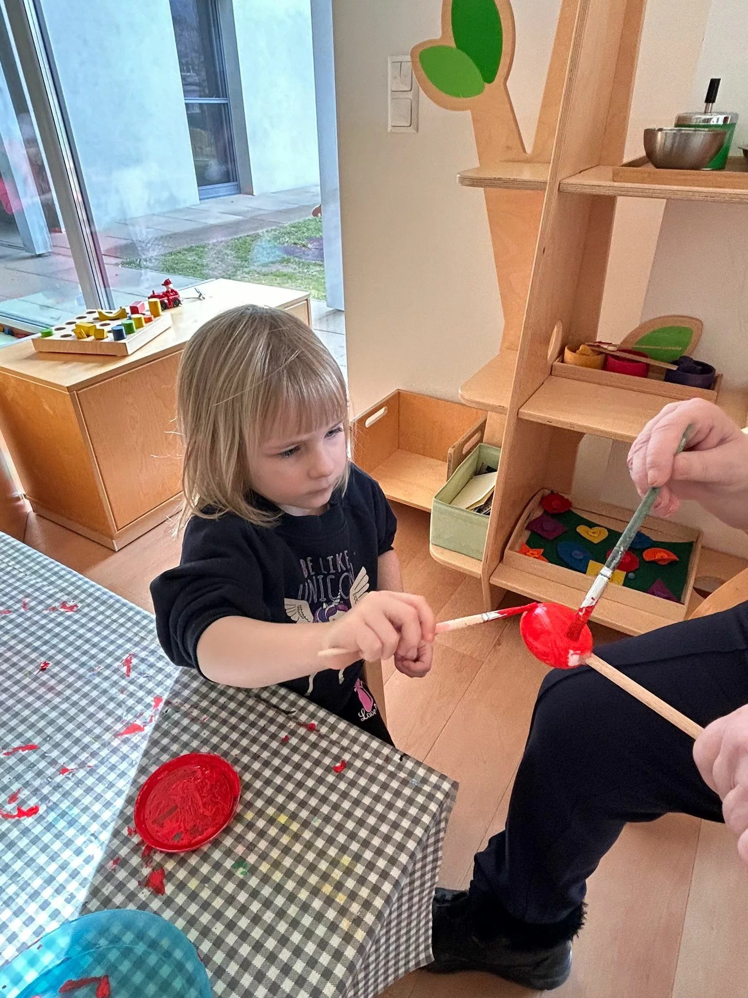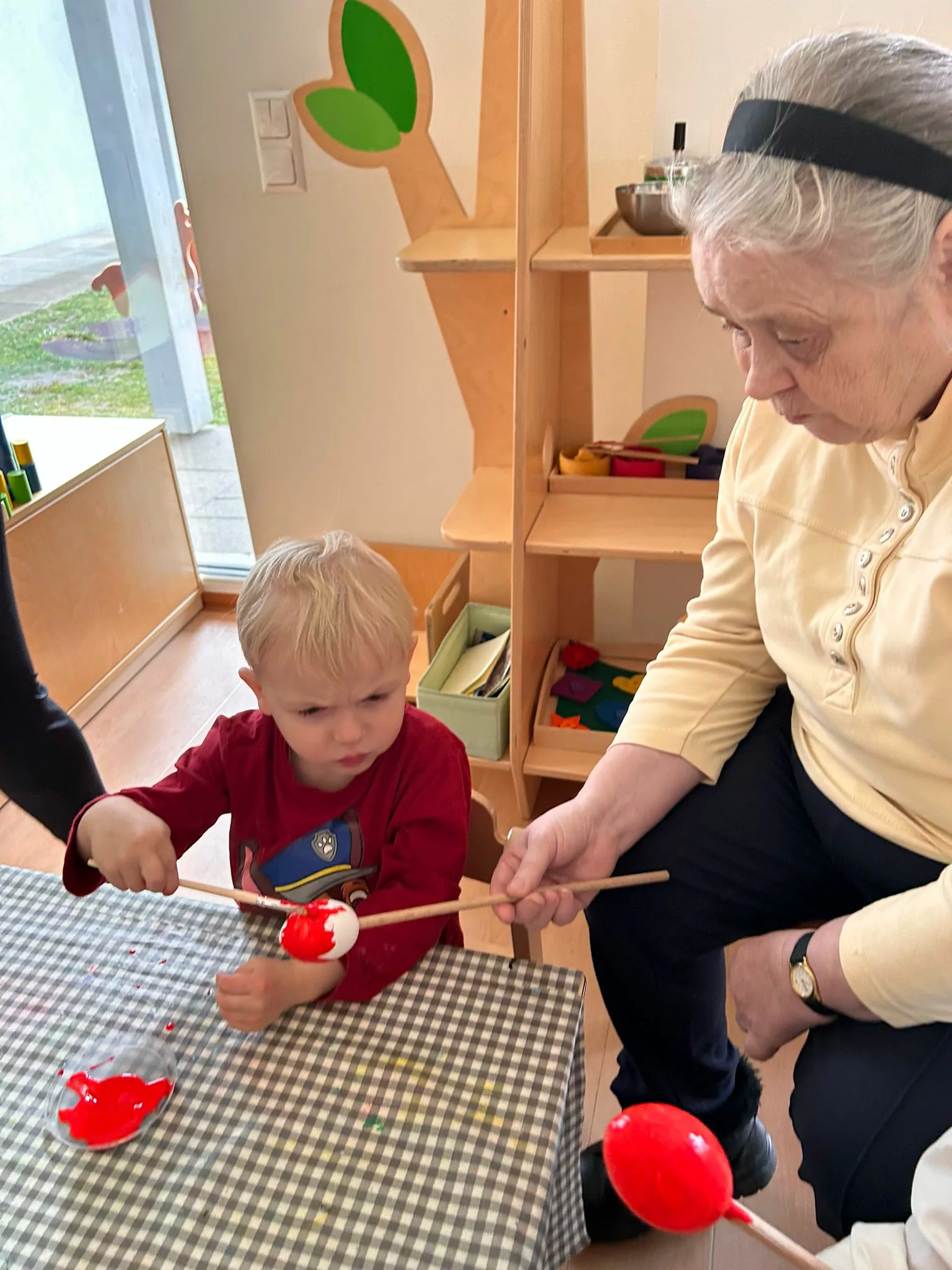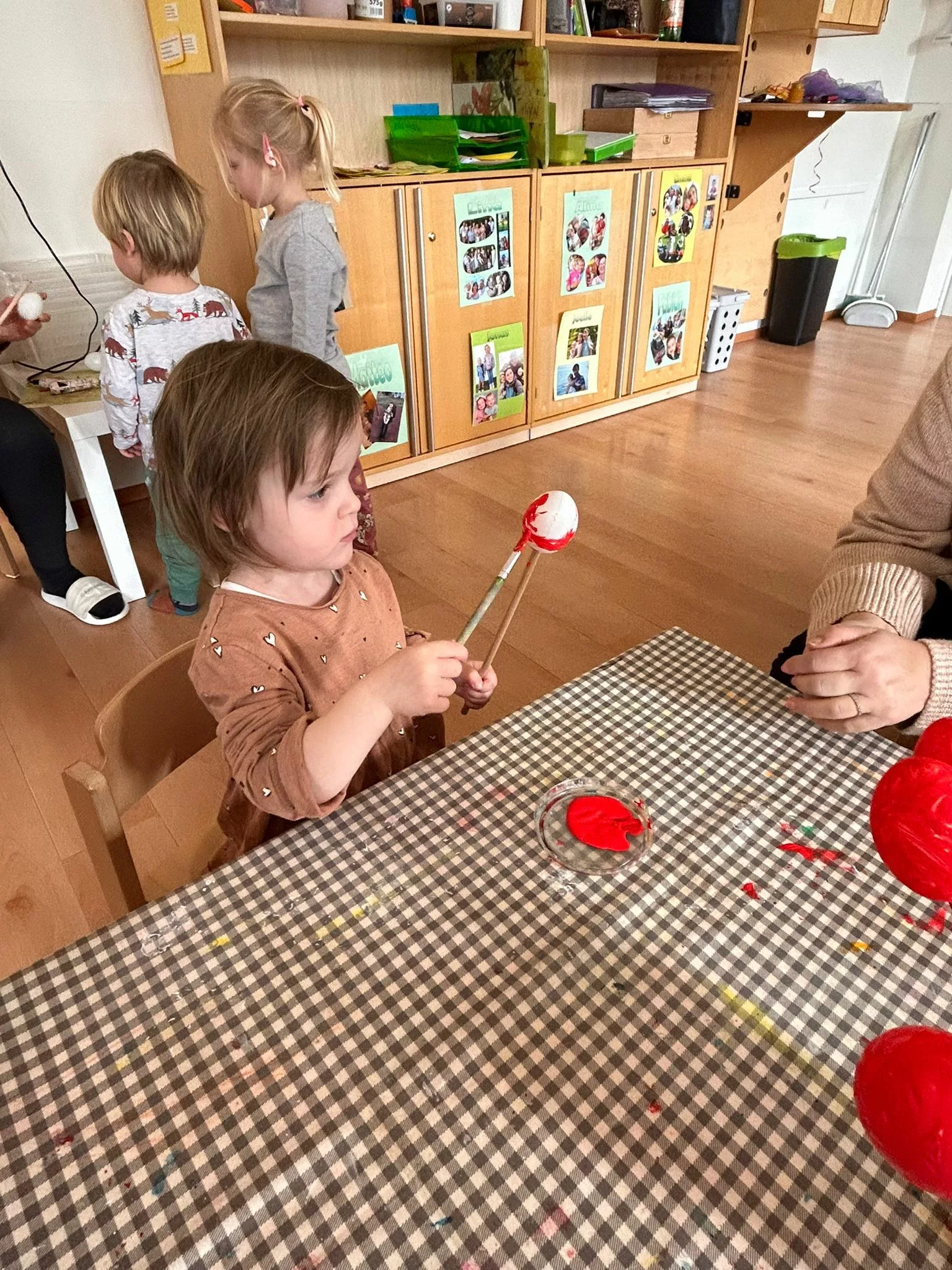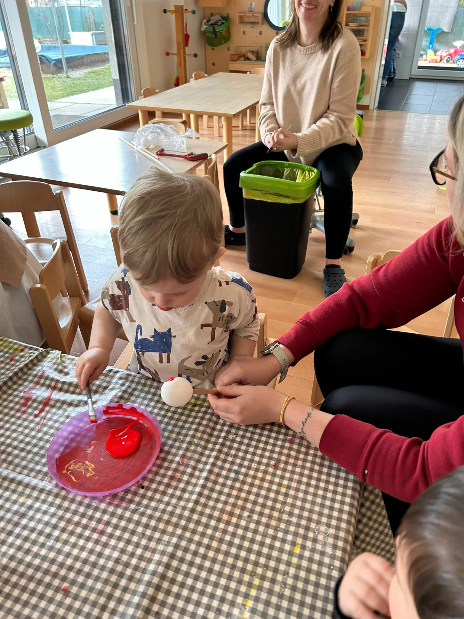 Wir halfen den Kindern beim Bemalen der Ostereier und tobten uns im Bewegungsraum mit den Bällen richtig aus. Im Sitzkreis sangen wir Lieder und schmückten den wunderschönen Osterstrauch mit bunten Ostereiern.