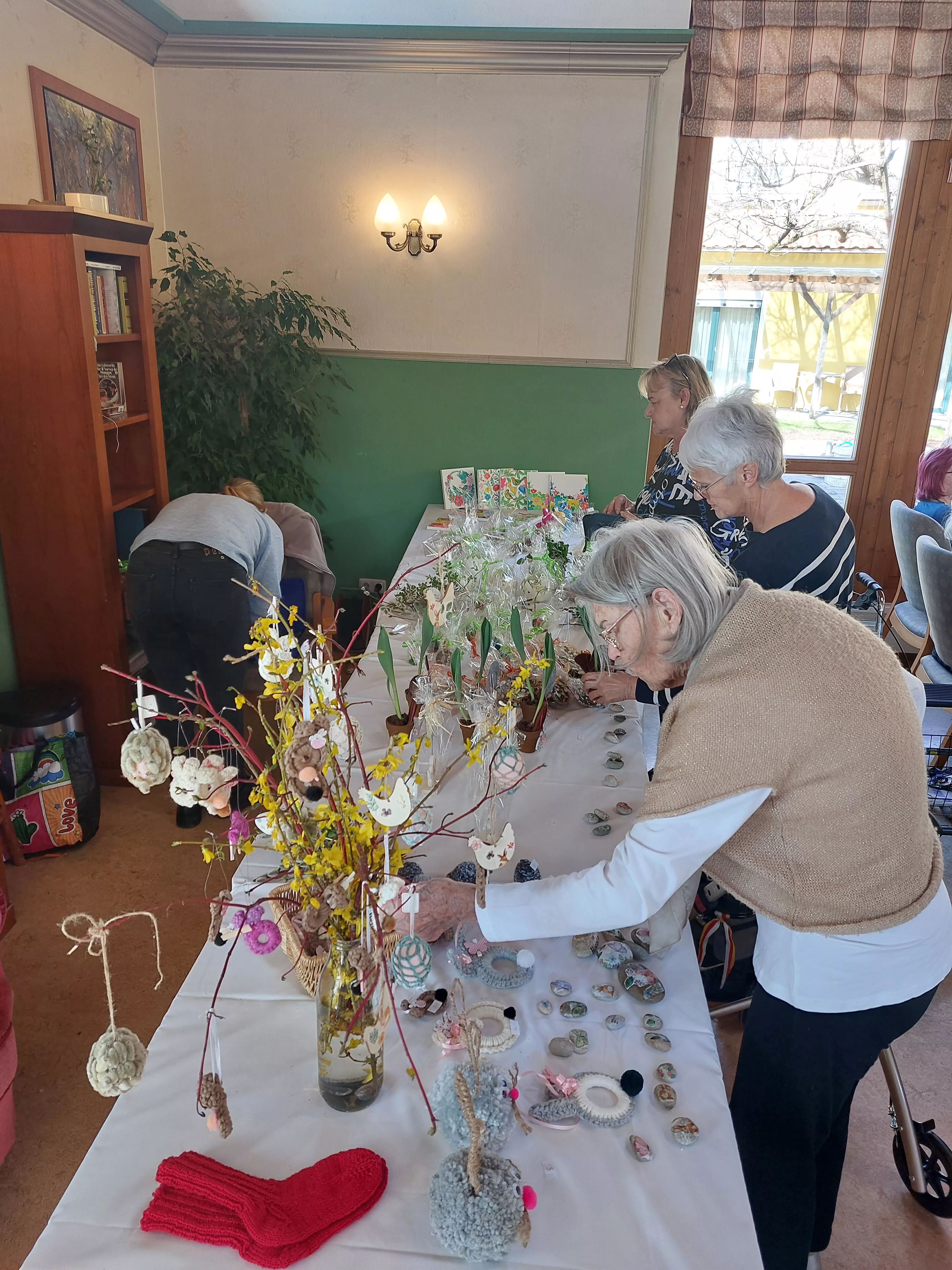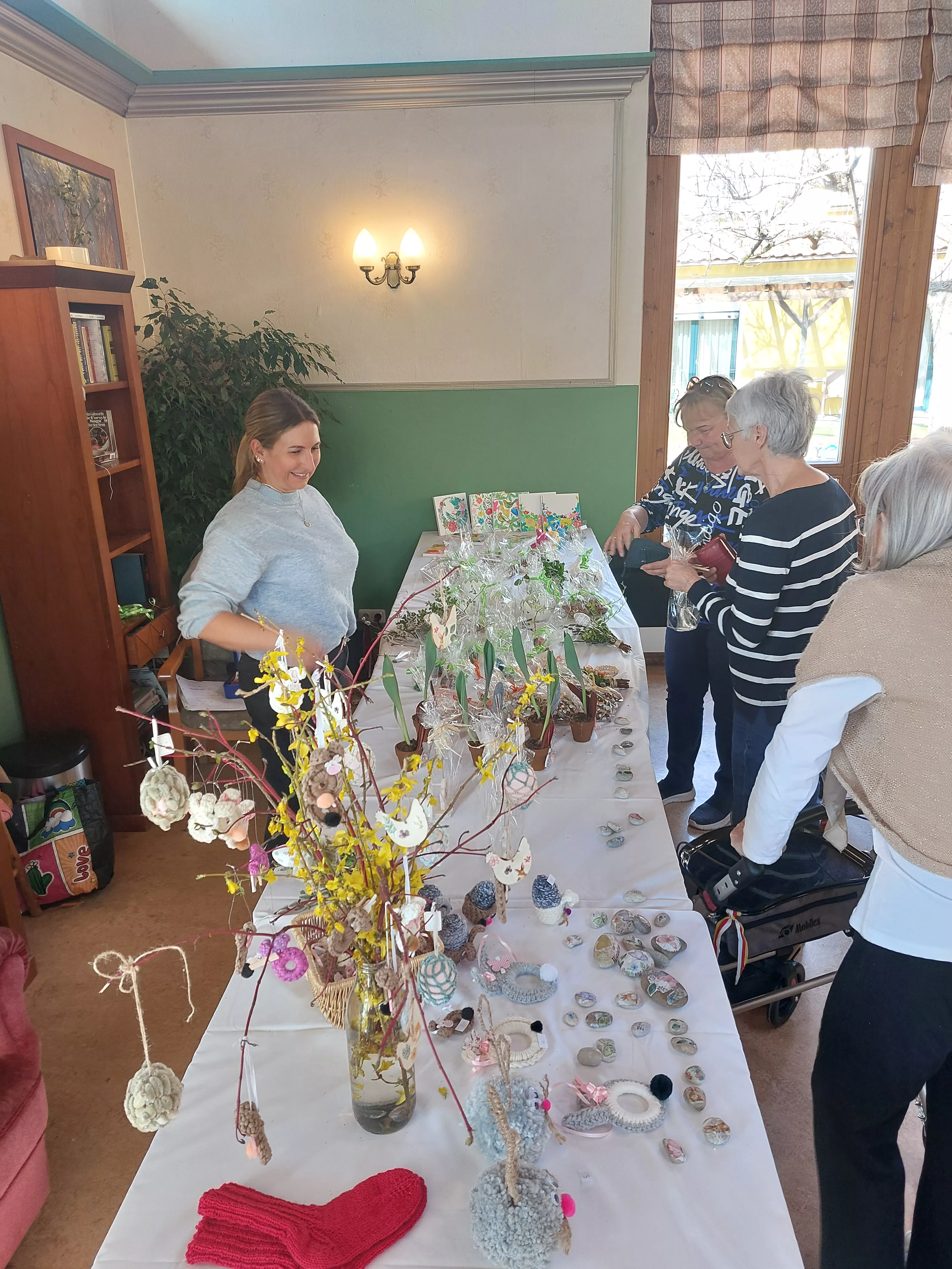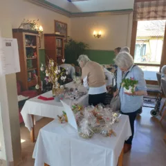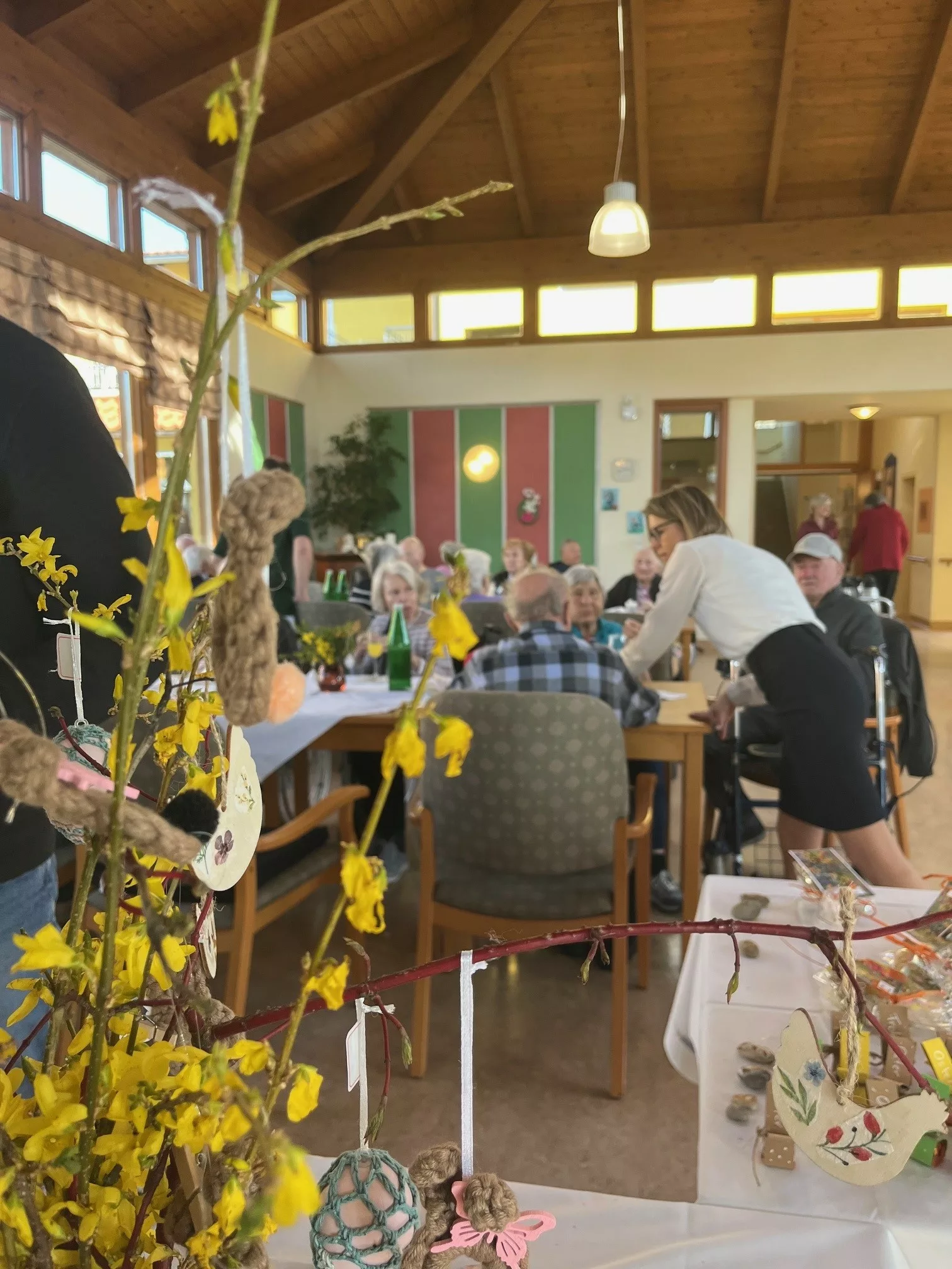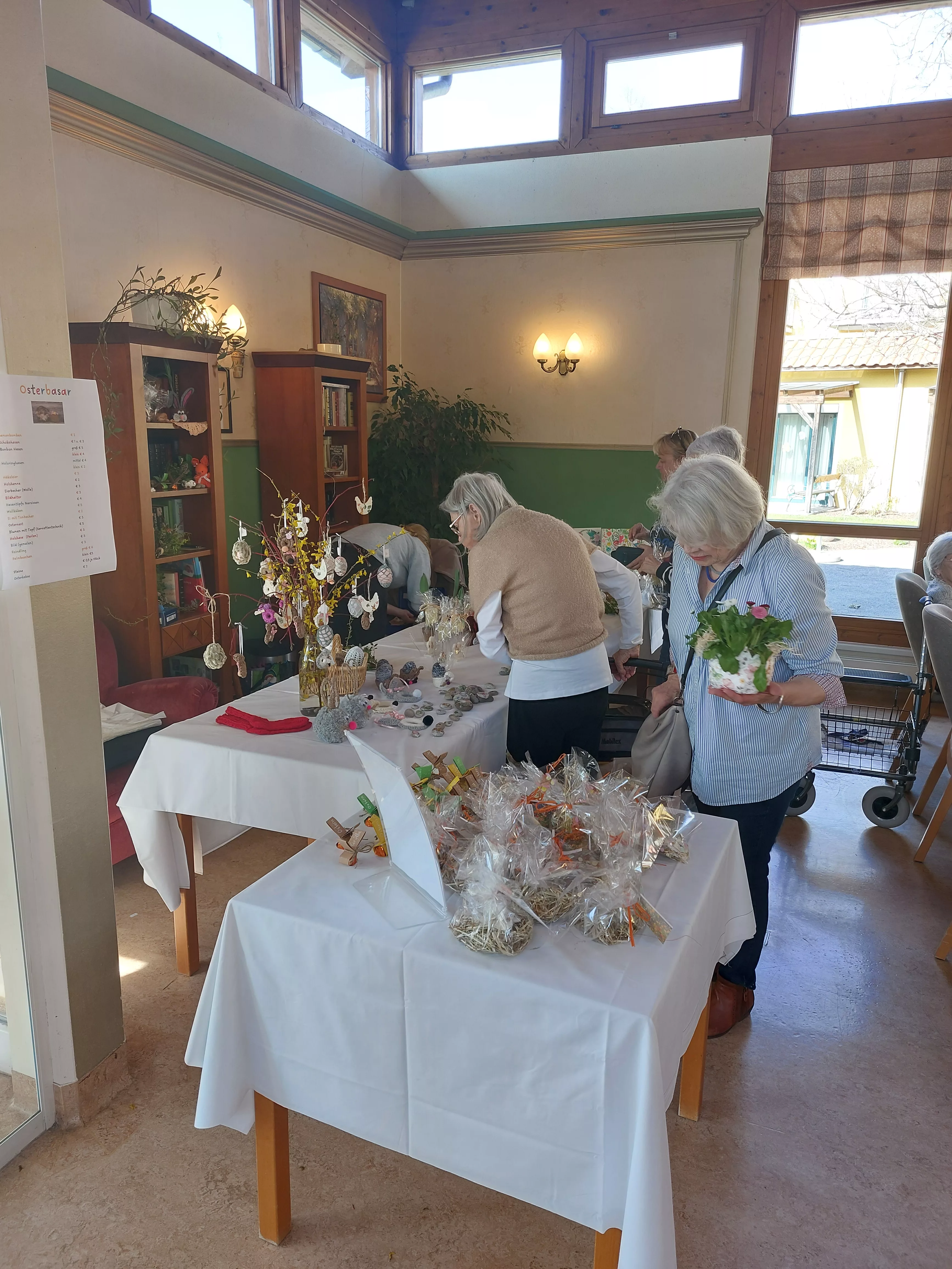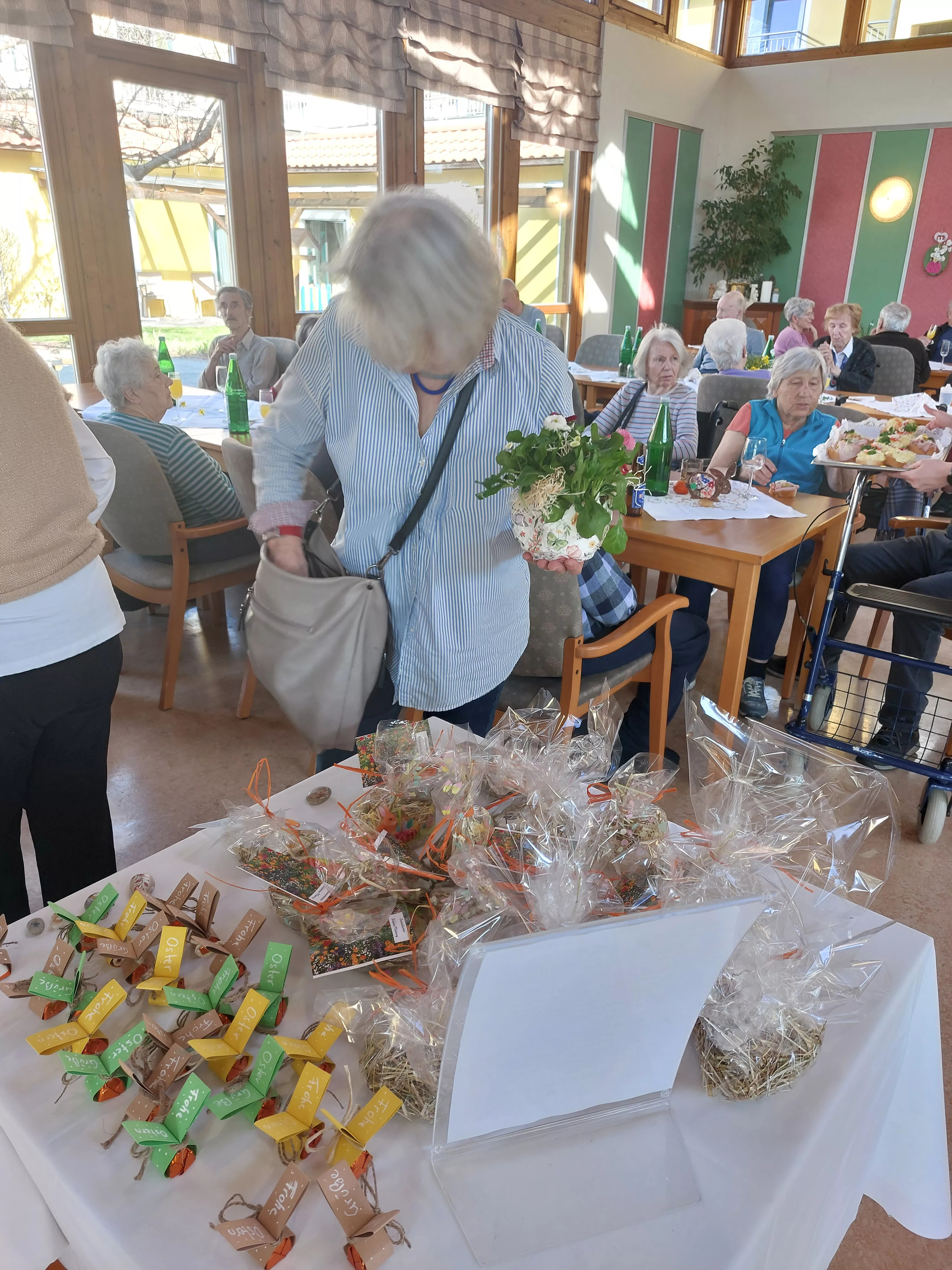 Es gab nicht nur, wie in den Jahren zuvor, einen gewöhnlichen Verkaufsstand, an dem Bewohnerinnen und Bewohner, sowie Angehörige und auch wir Mitarbeiter von den Senioren selbstgebastelte Osterdekorationen ergattern konnten.