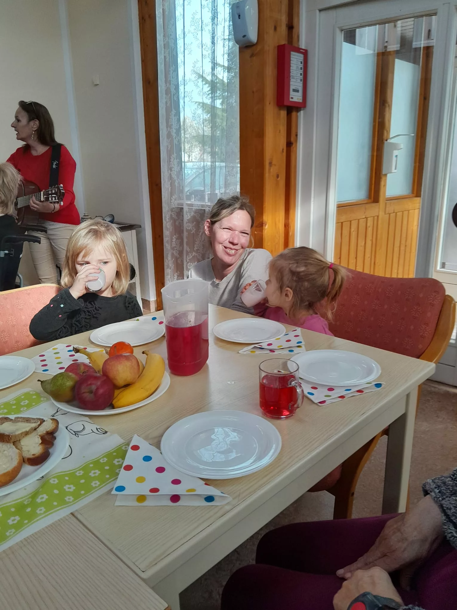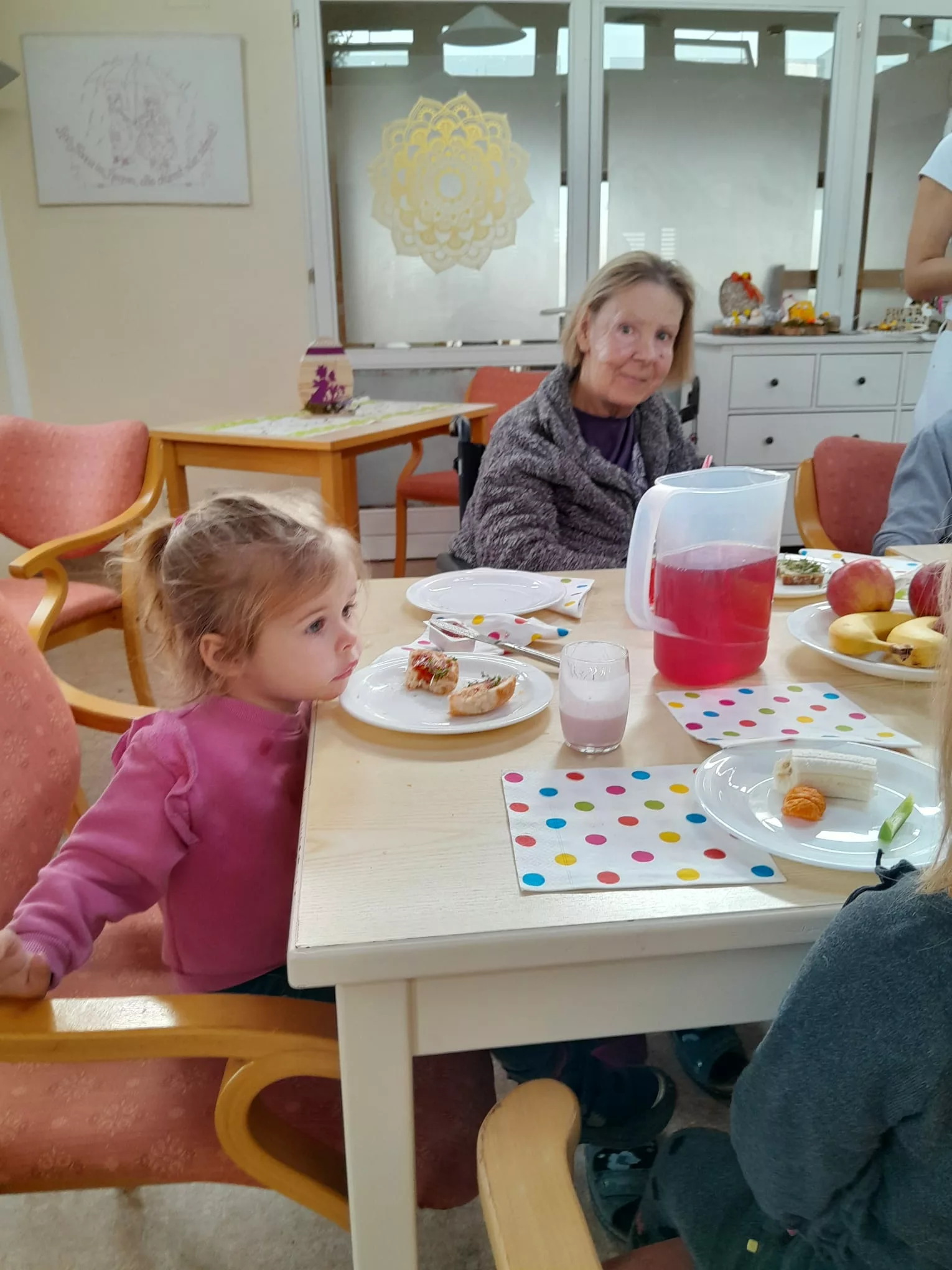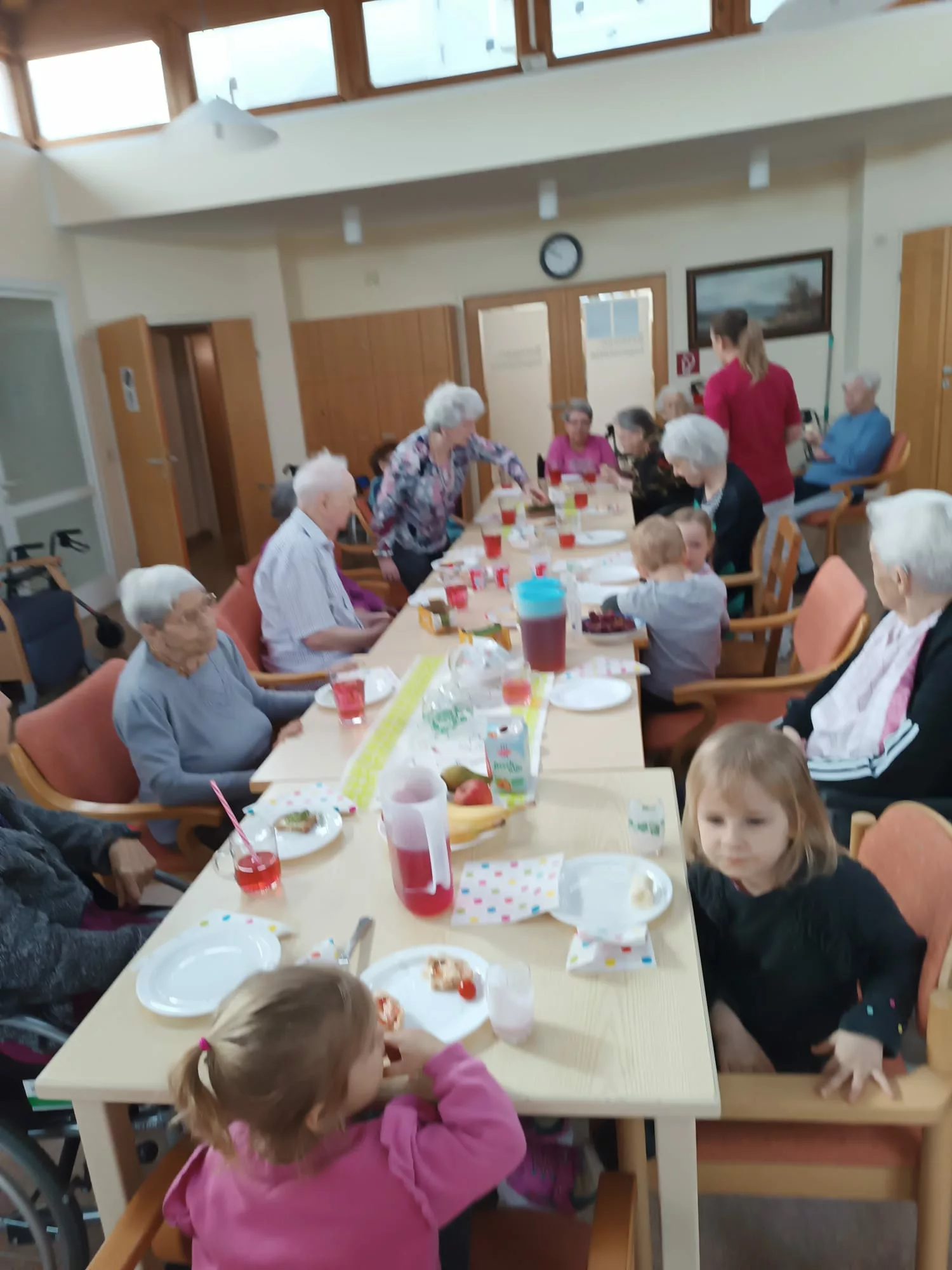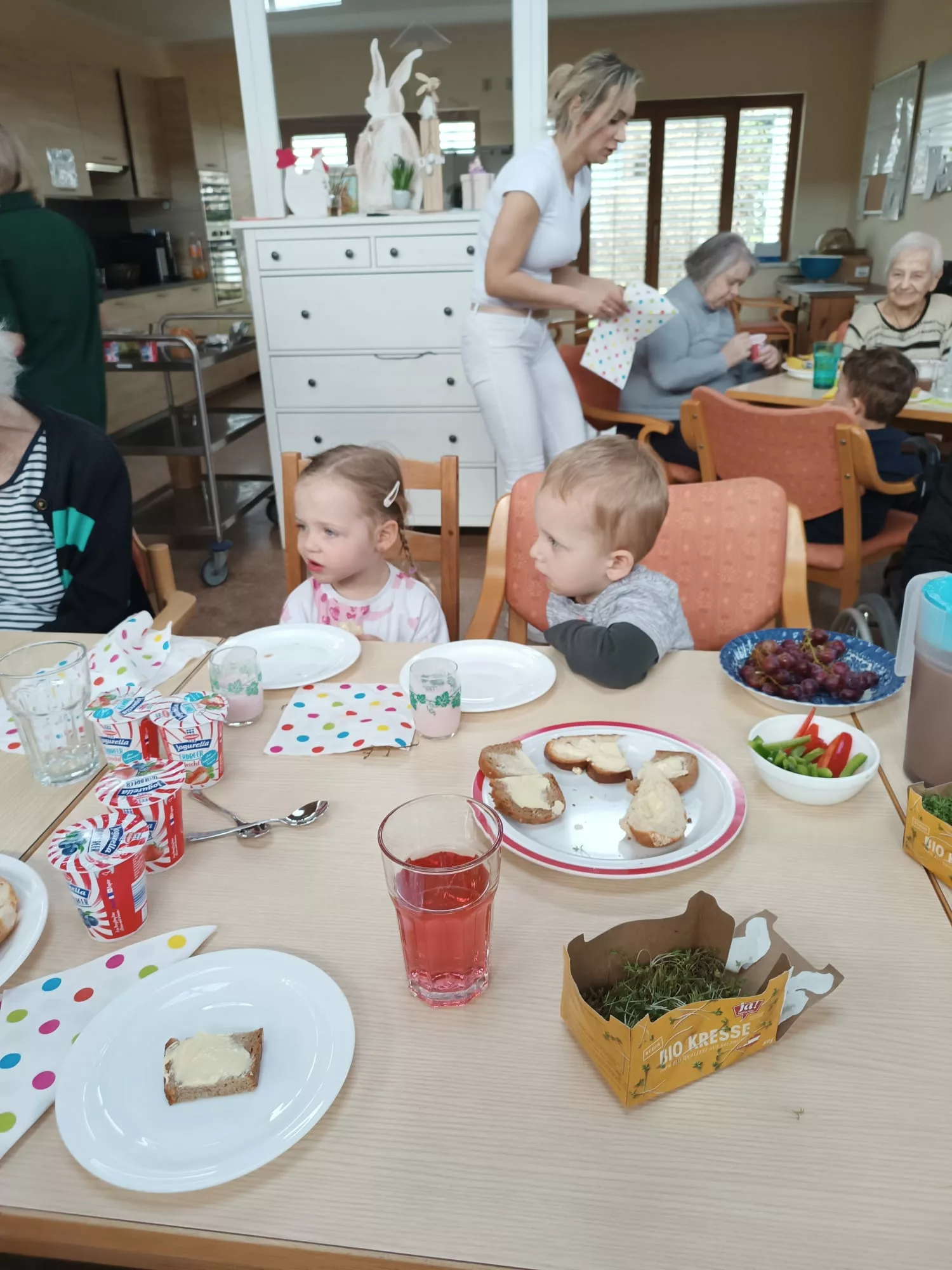 Die Kinder wurden mit einer leckeren Jause empfangen und sie begrüßten uns mit einem Willkommenslied. Es wurde gegessen, gespielt und herzlich gelacht.