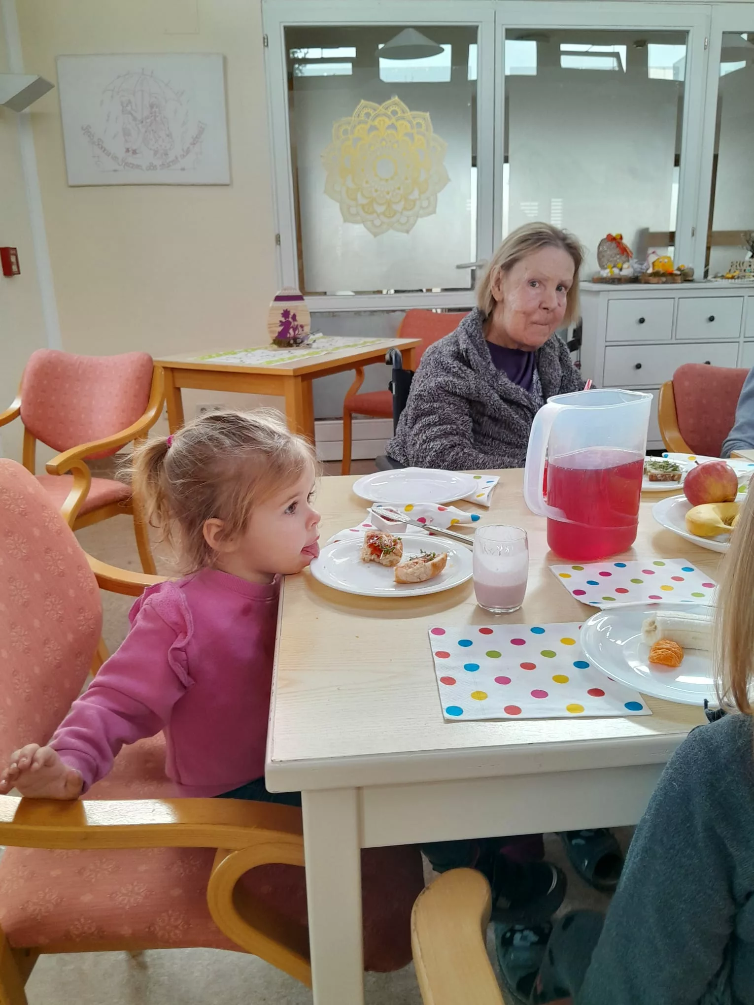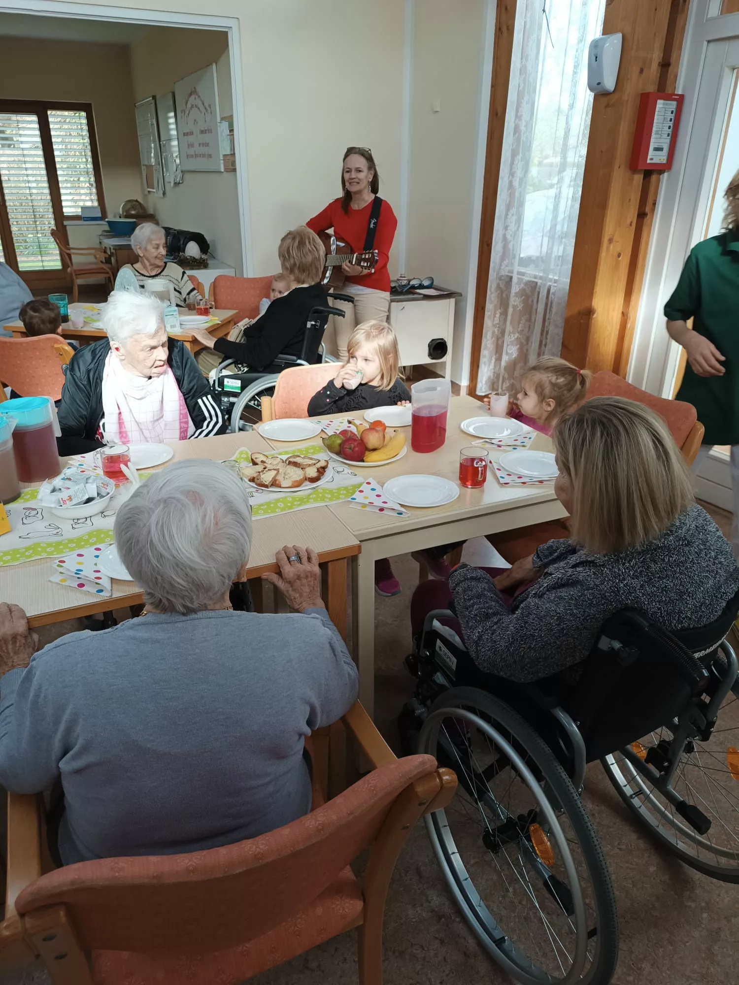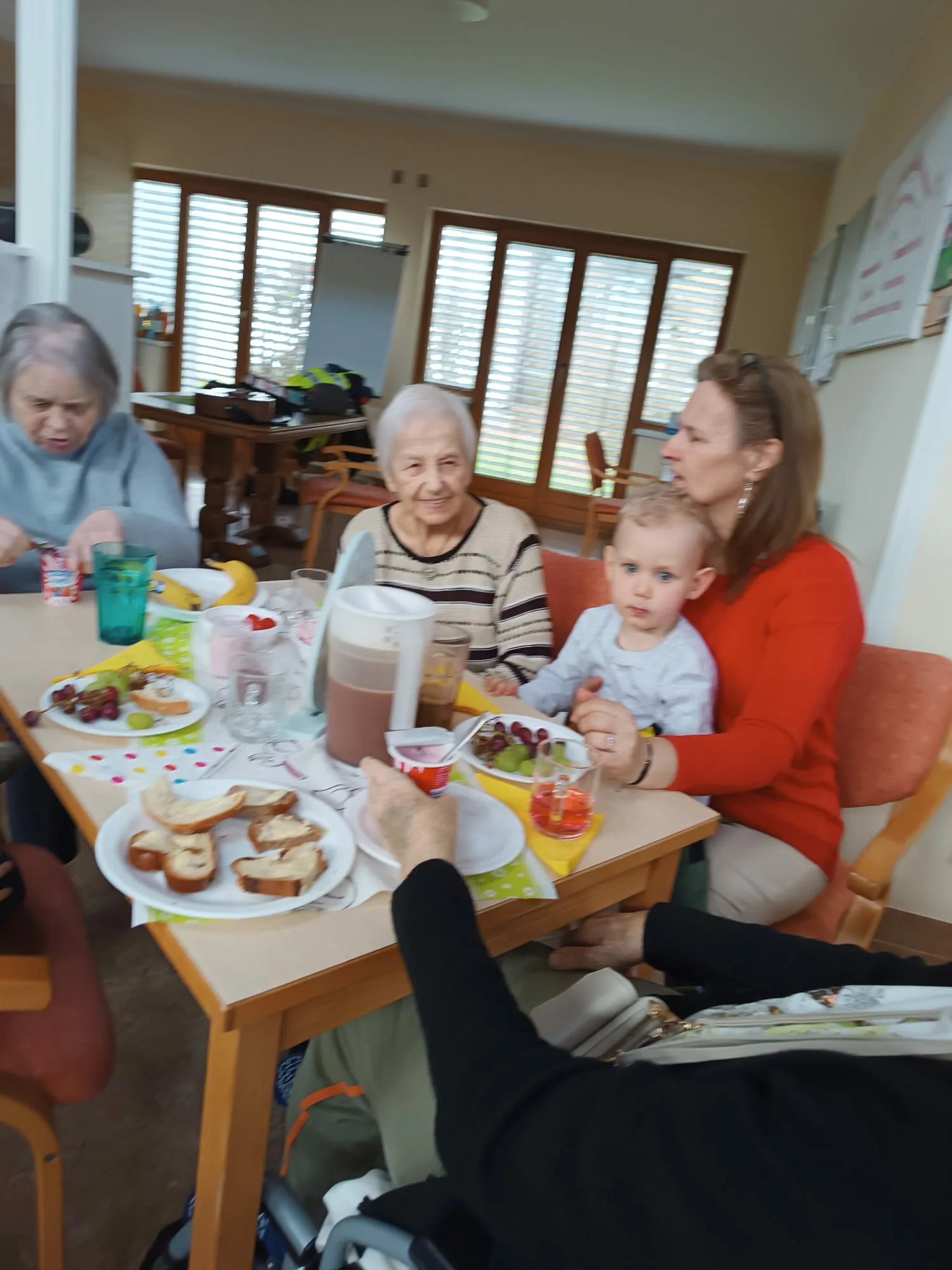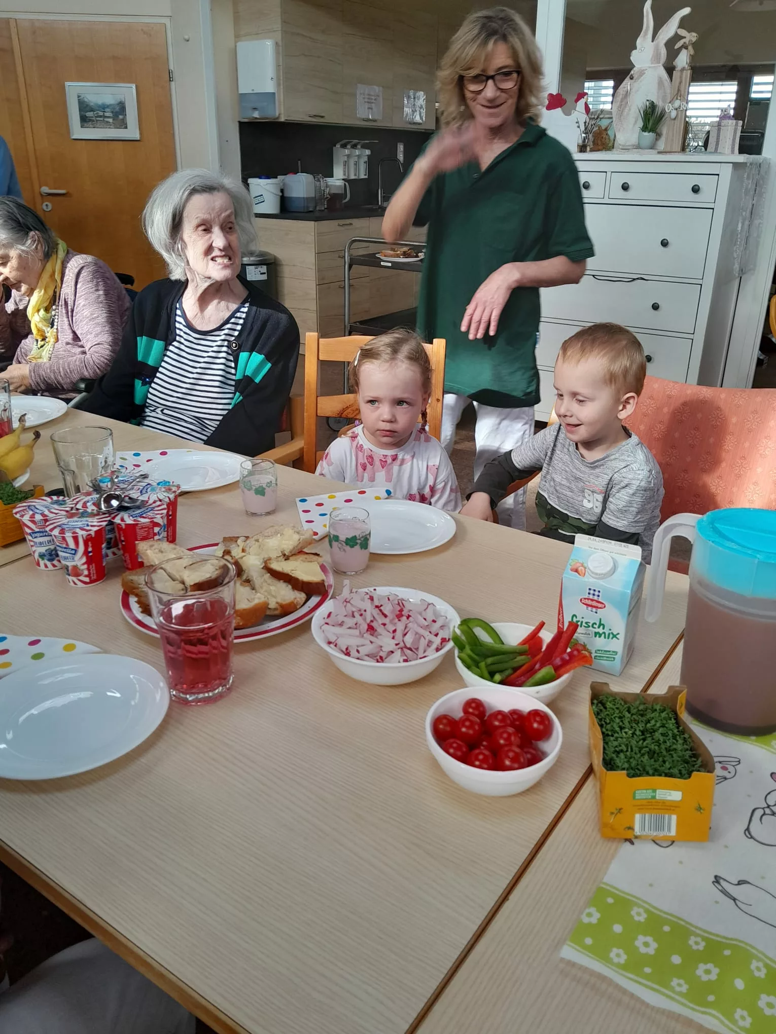 Die Kinder wurden mit einer leckeren Jause empfangen und sie begrüßten uns mit einem Willkommenslied. Es wurde gegessen, gespielt und herzlich gelacht.