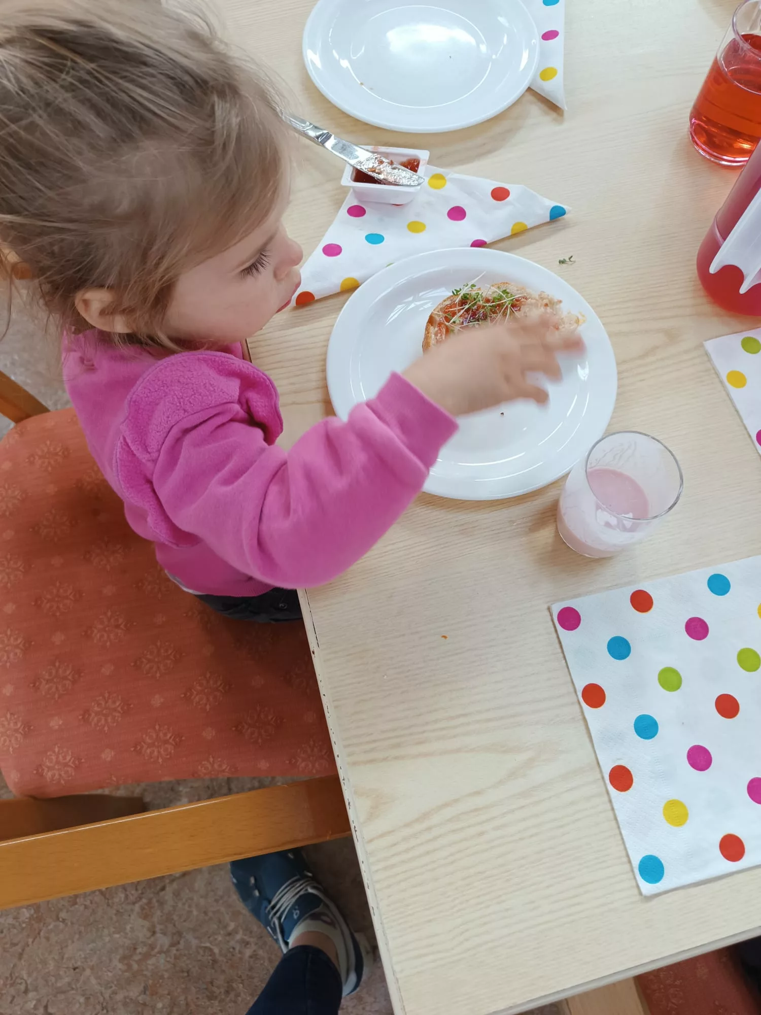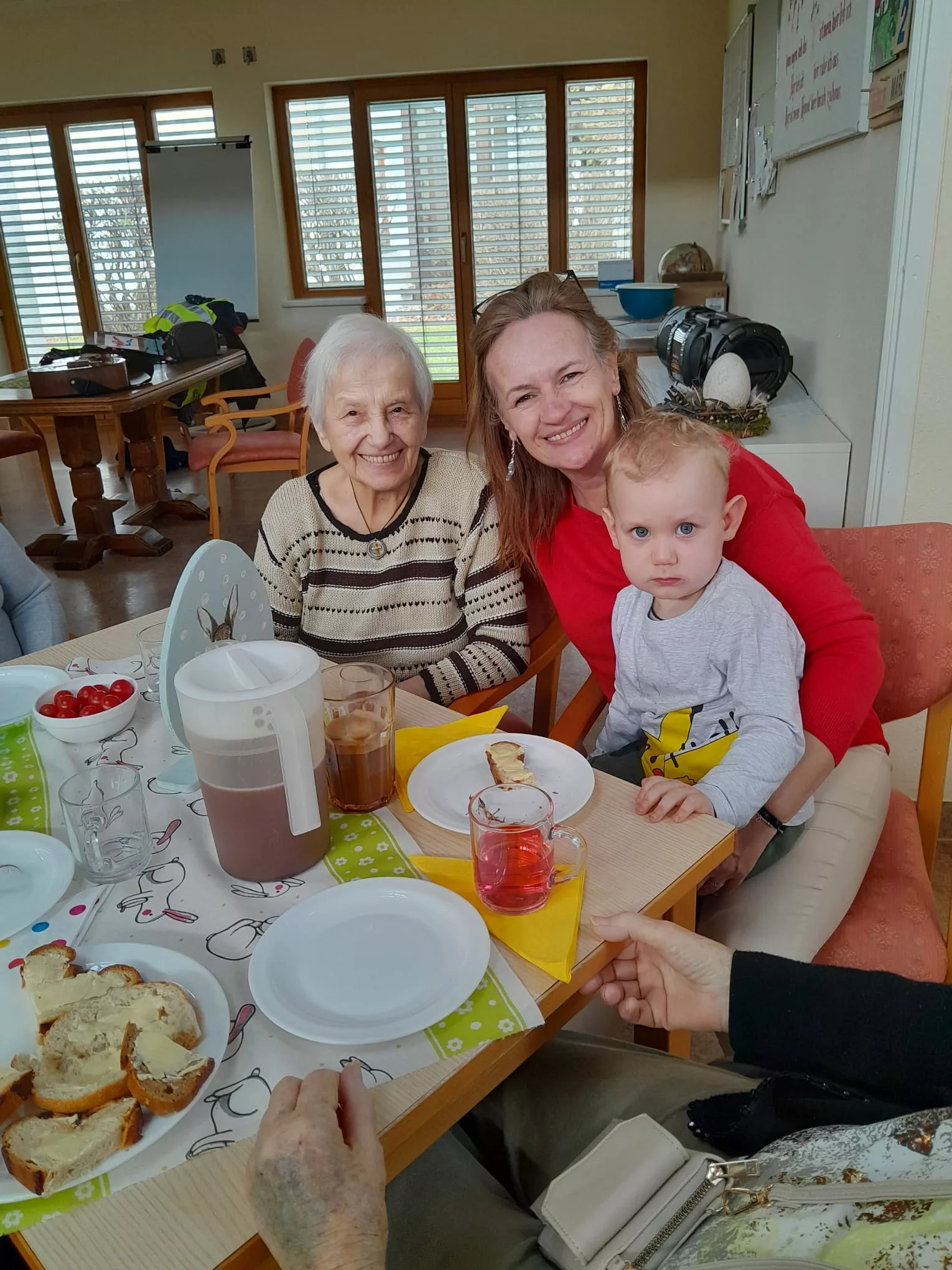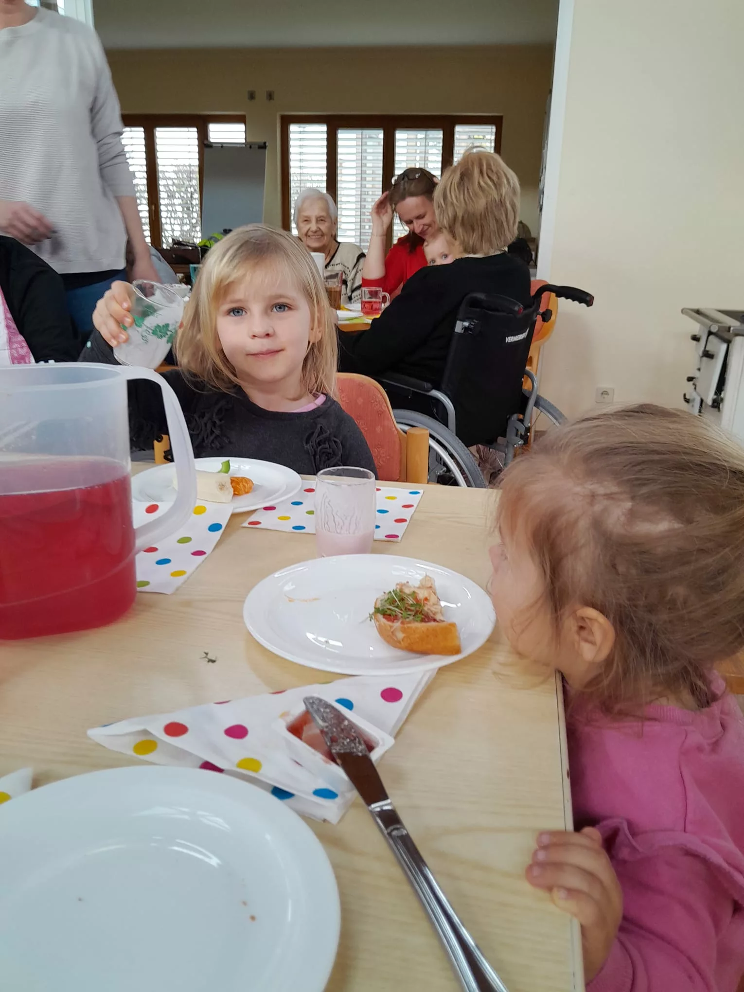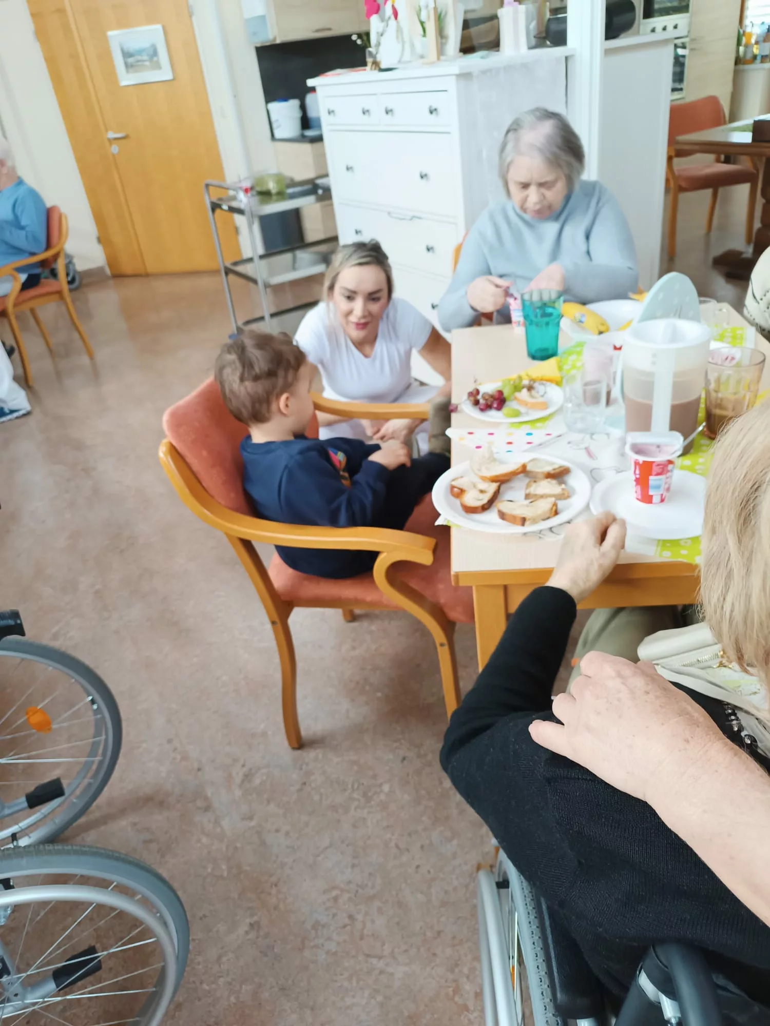 Die Kinder wurden mit einer leckeren Jause empfangen und sie begrüßten uns mit einem Willkommenslied. Es wurde gegessen, gespielt und herzlich gelacht.