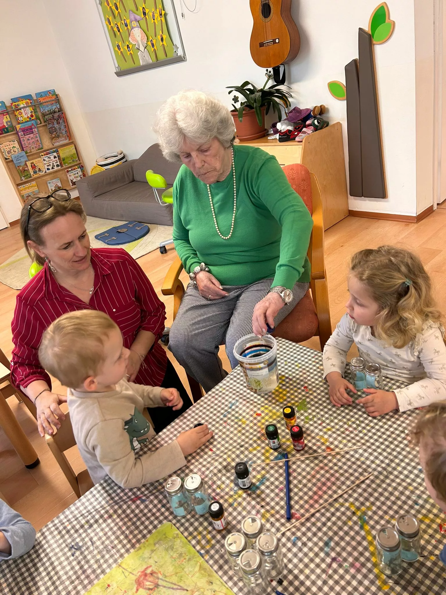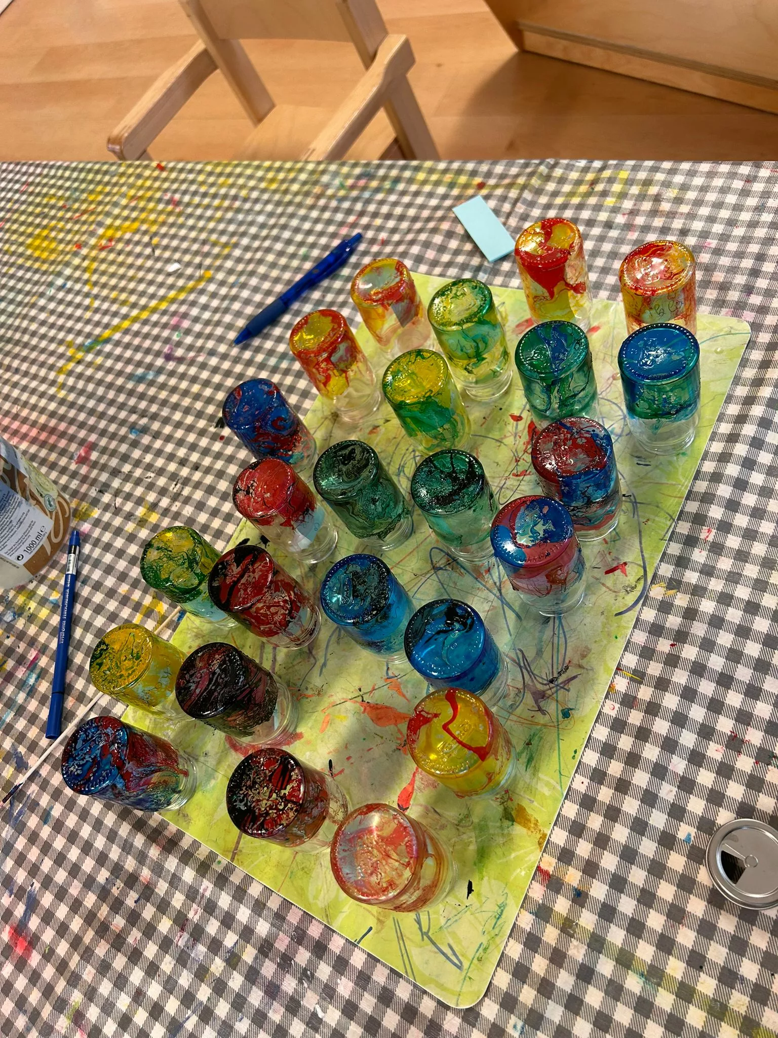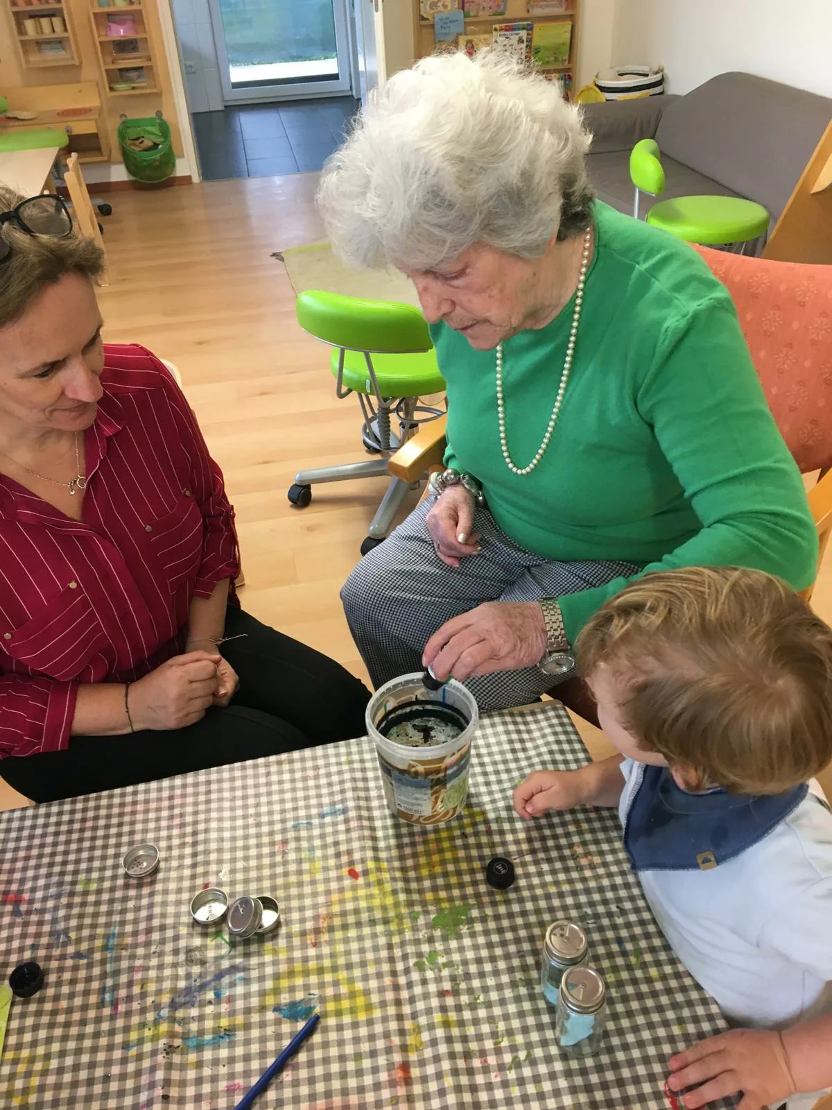 Jedes Kind hat einen Salz- und Pfefferstreuer mit Marmorierfarbe gestaltet und die Omi’s und Opi’s halfen ihnen natürlich dabei.
