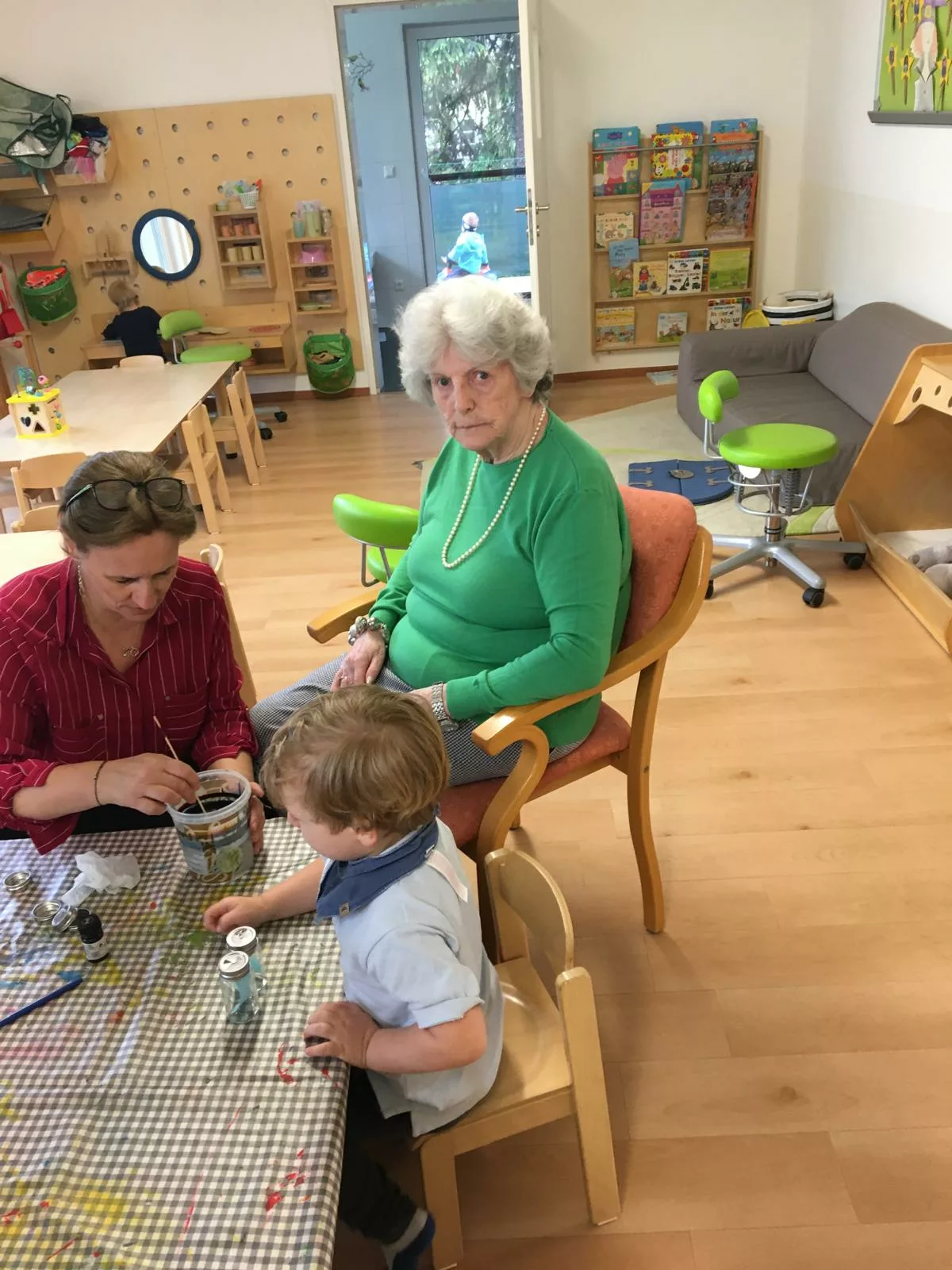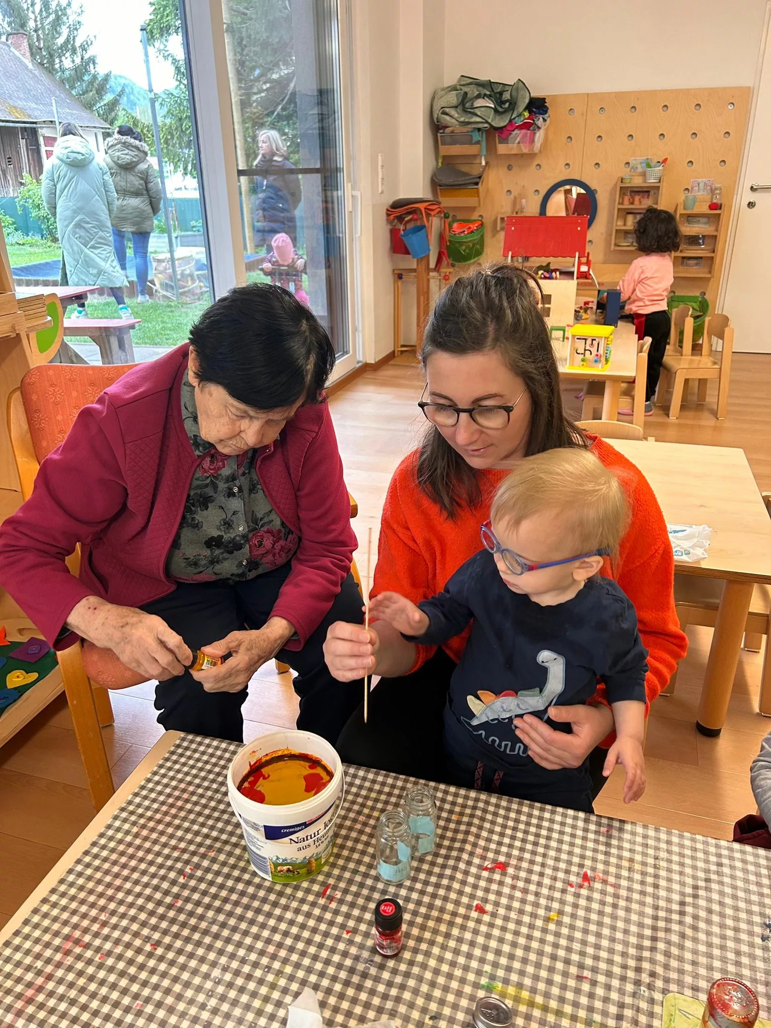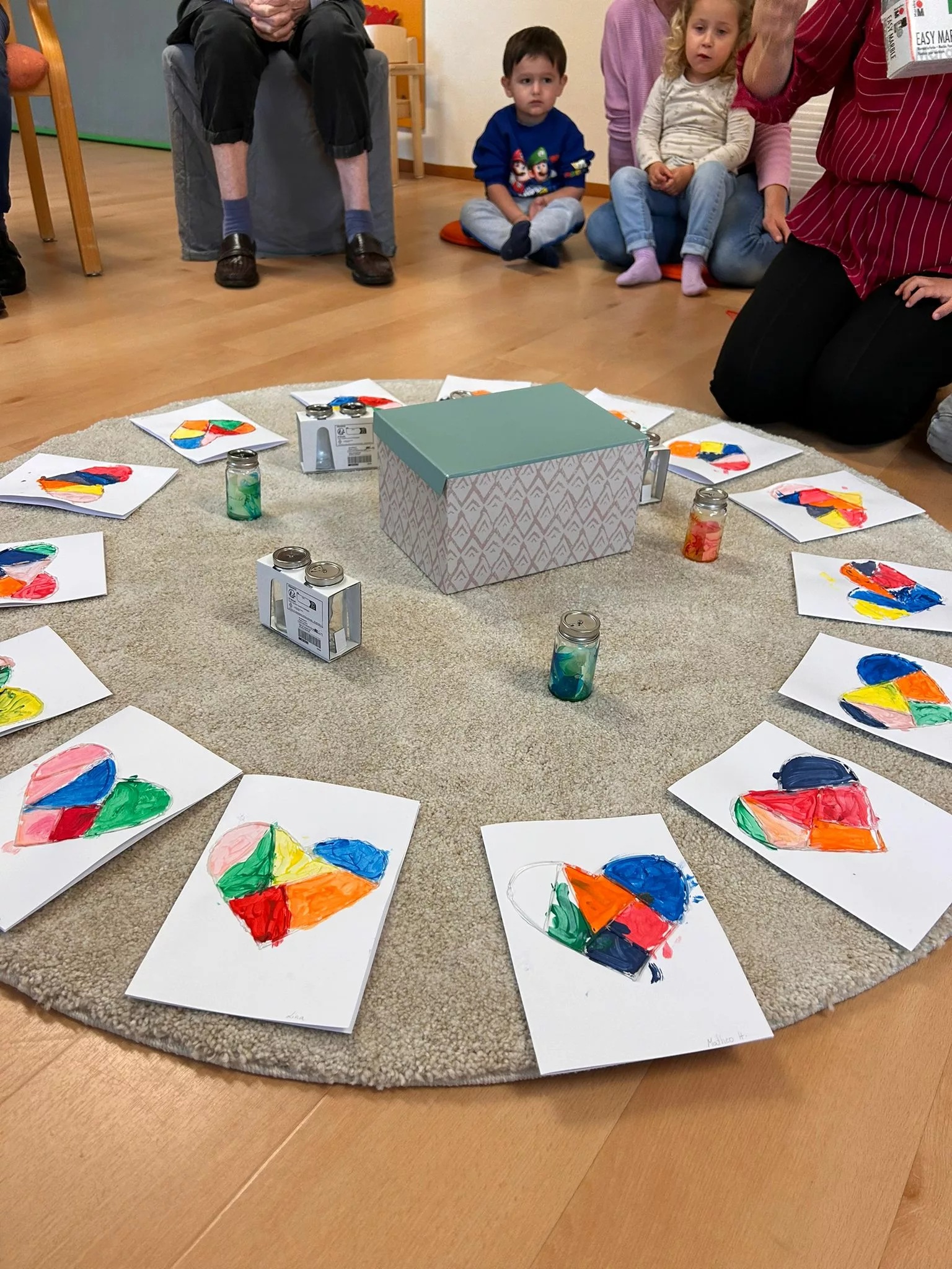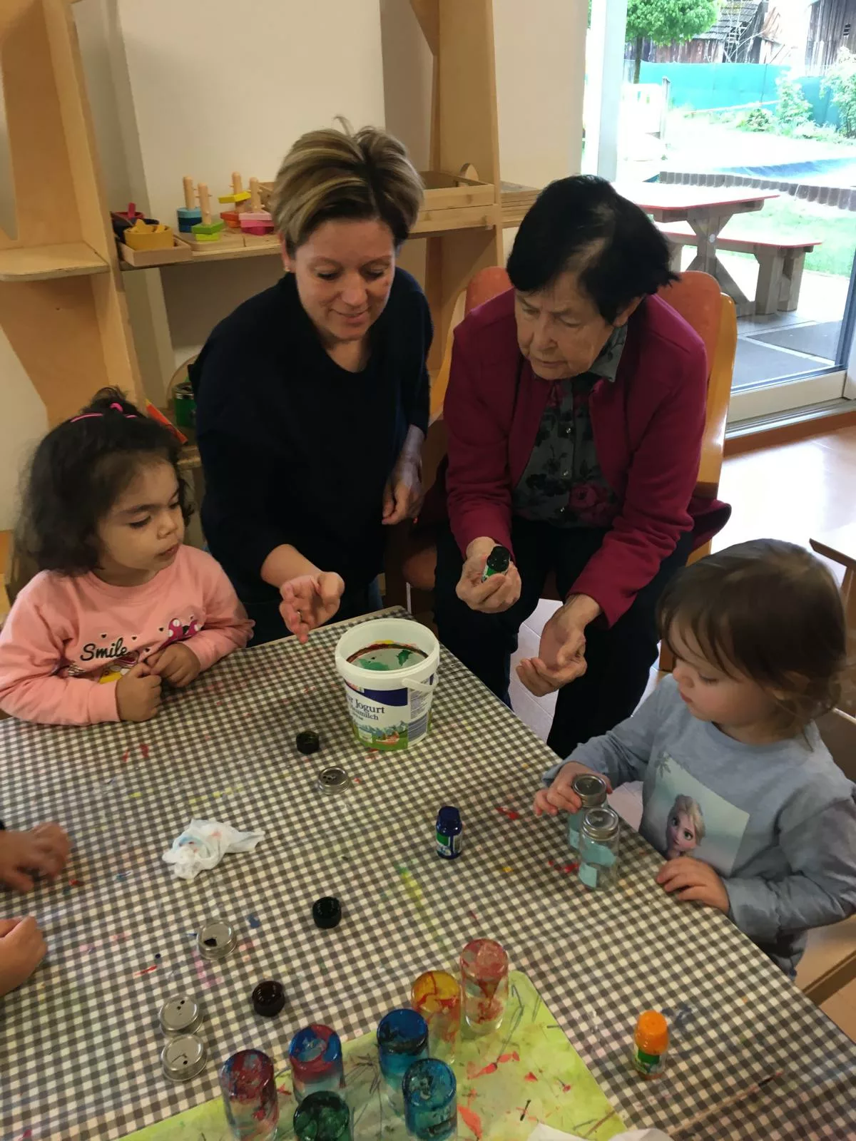 Jedes Kind hat einen Salz- und Pfefferstreuer mit Marmorierfarbe gestaltet und die Omi’s und Opi’s halfen ihnen natürlich dabei.