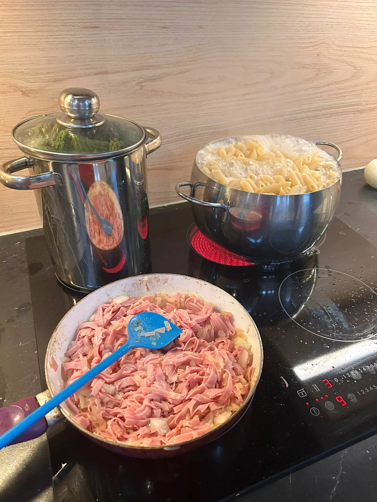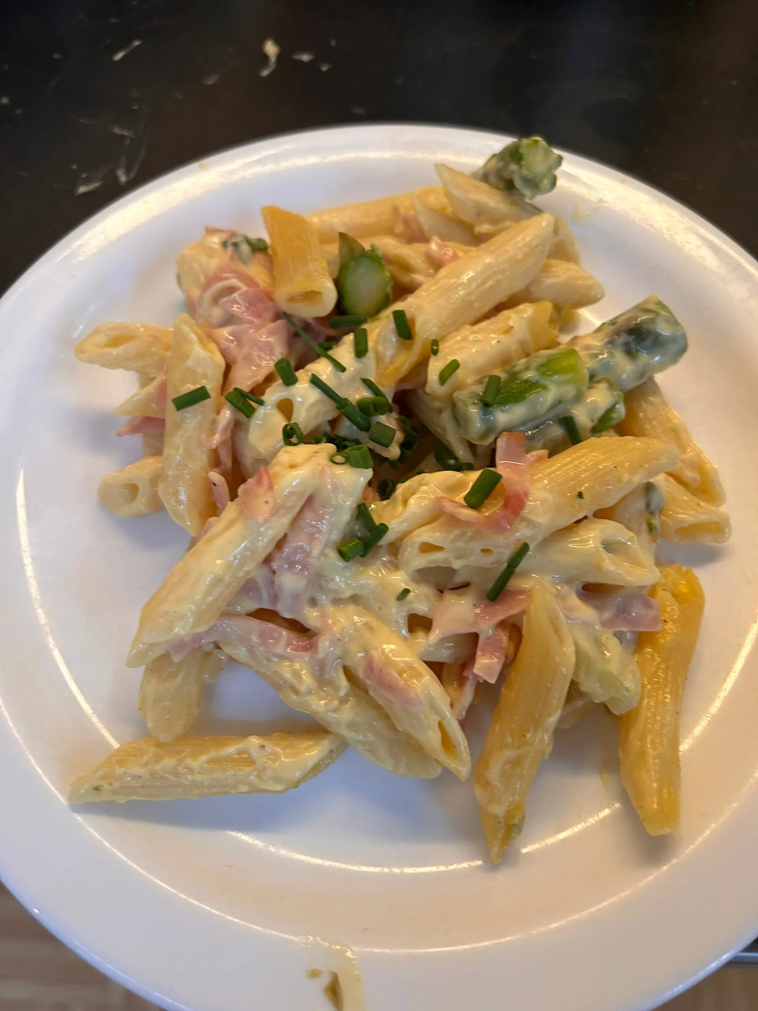 Rezept: Grünen Spargel in Salzwasser bissfest kochen. In der Zwischenzeit Zwiebel mit Schinken und Knoblauch anrösten und mit Salz und Pfeffer würzen. Den gekochten Spargel abkühlen lassen und in kleine Stücke schneiden. Gekochte Nudeln mit dem Spargel und dem Schinken und Zwiebel vermischen und dann die warme Sauce Hollandaise darüber geben. Alles gut durchmischen und mit Salz und Pfeffer je nach Geschmack würzen.