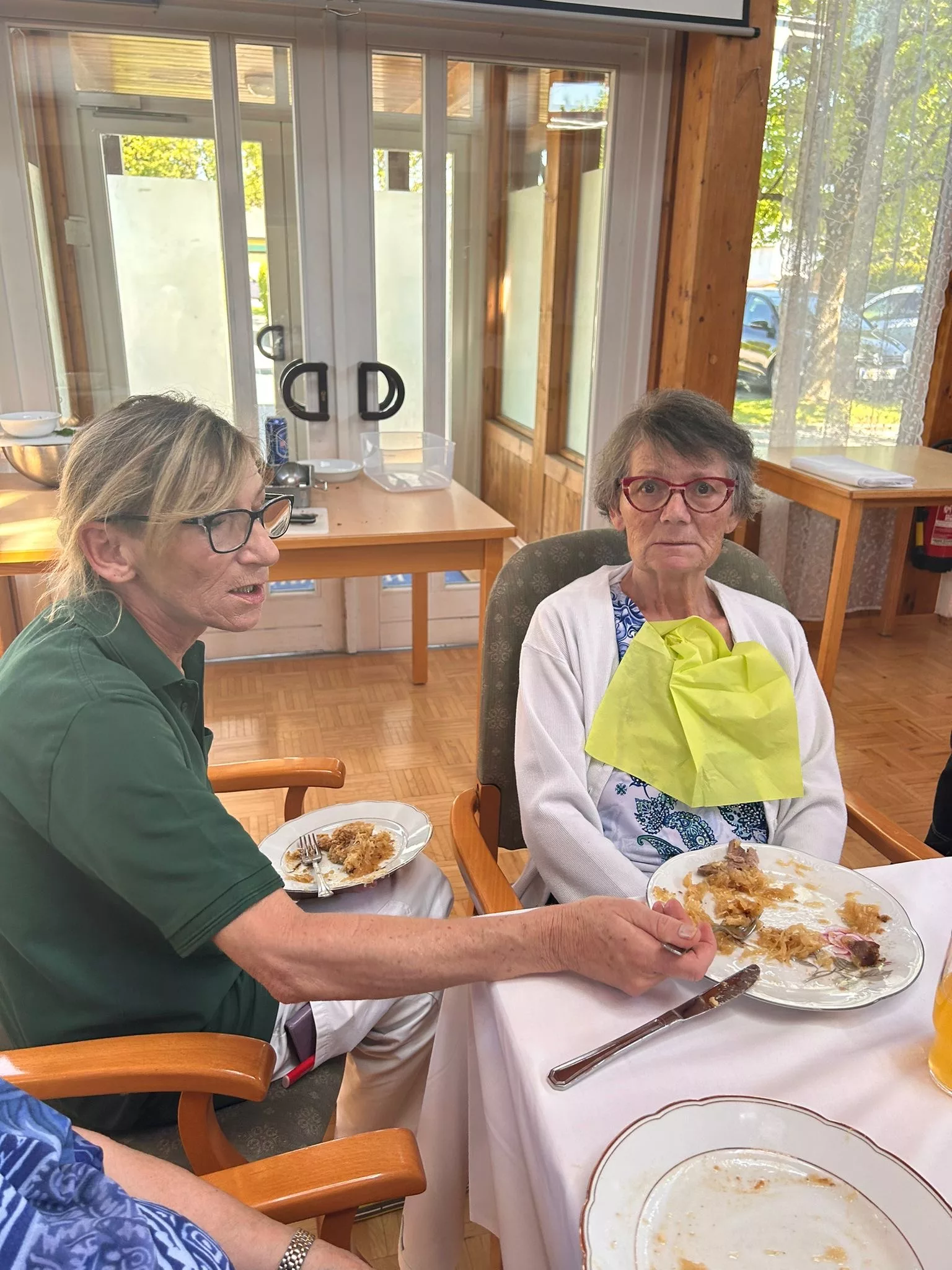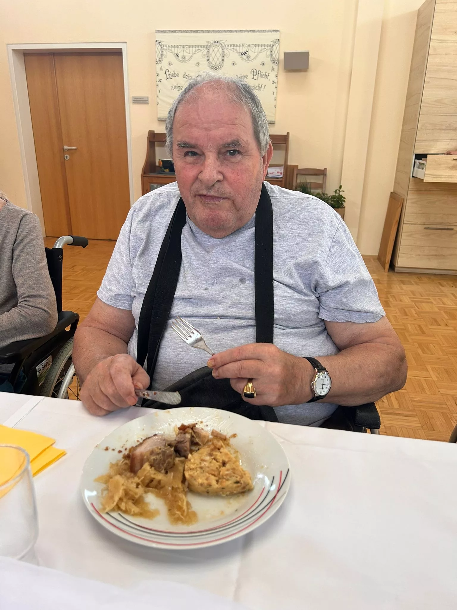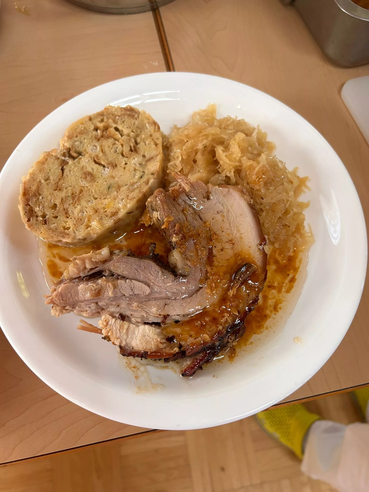 Es gab Schweinsbraten mit Sauerkraut und Serviettenknödel und als Dessert Topfentorte mit Kaffee.