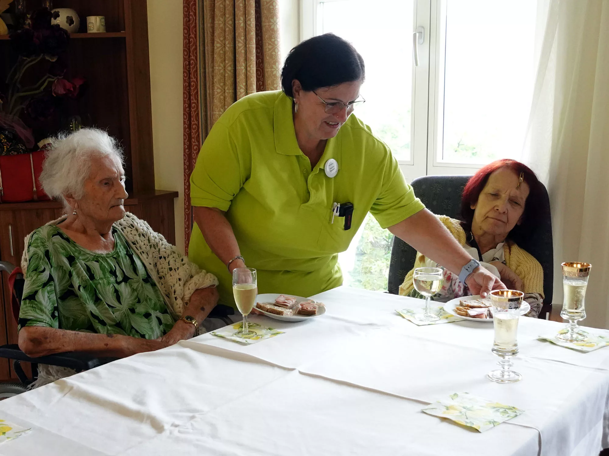 Frau Friederike Schweiger betätigt sich seit einigen Jahren ehrenamtlich im „Wie daham…“ Seniorenschlössl Brigittenau, wo sie bereits ihre Mutter und ihren Gatten gut untergebracht wusste. Bevor es für die rüstige Seniorin in die Sommerpause geht, verabschiedete sie sich von den BewohnerInnen mit einer herzhaften Jause.