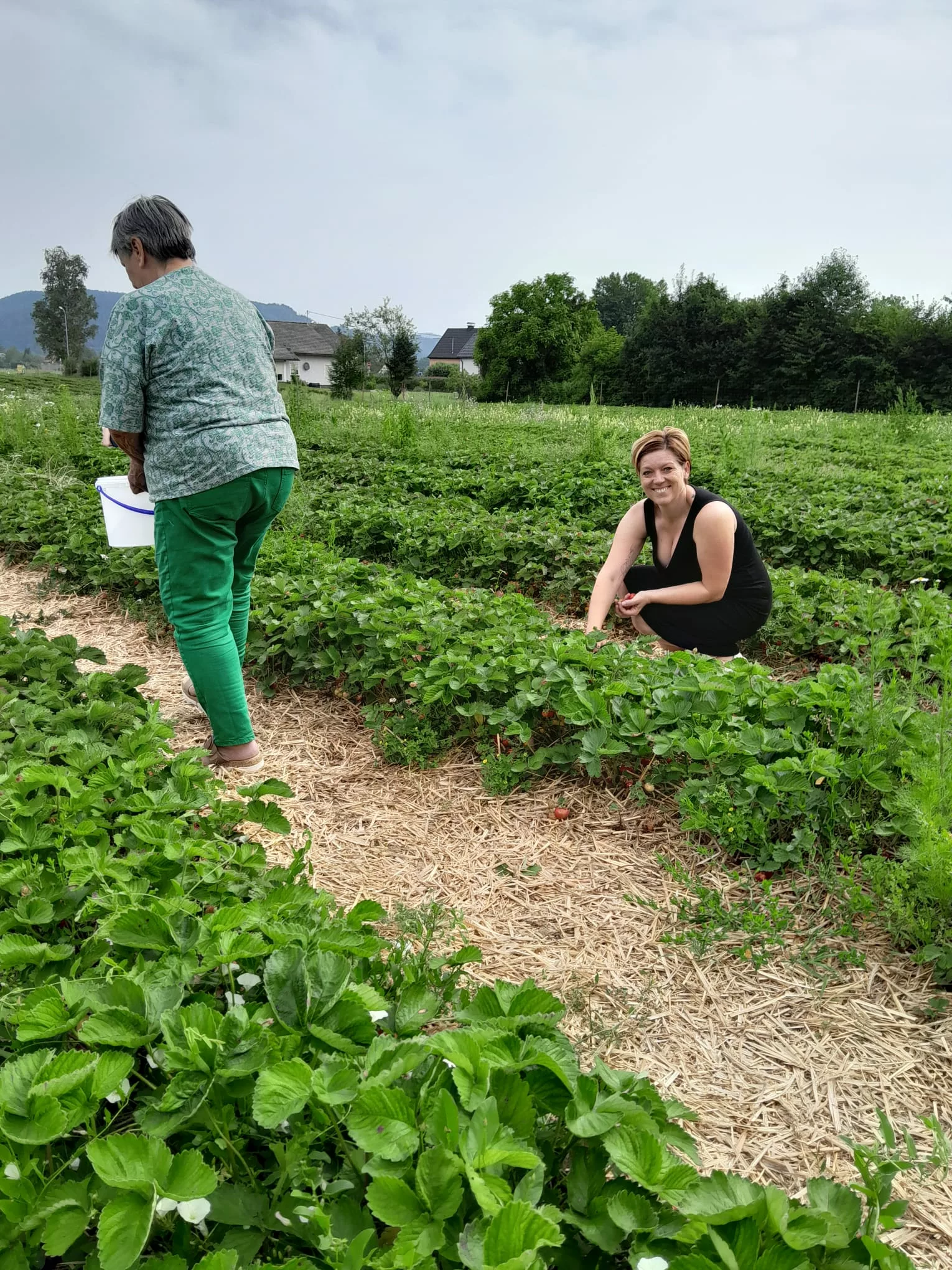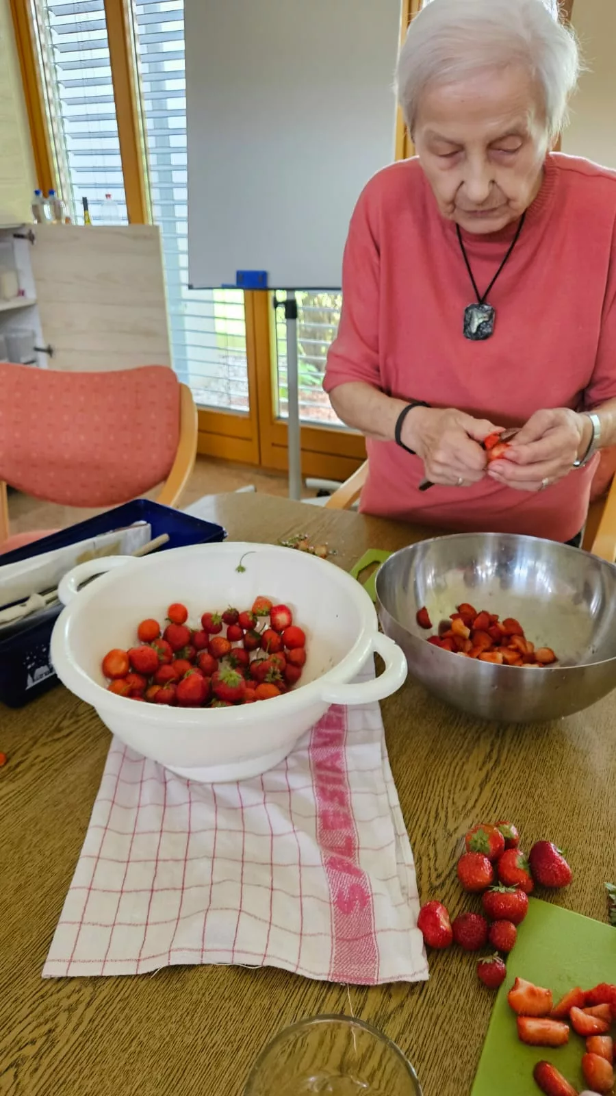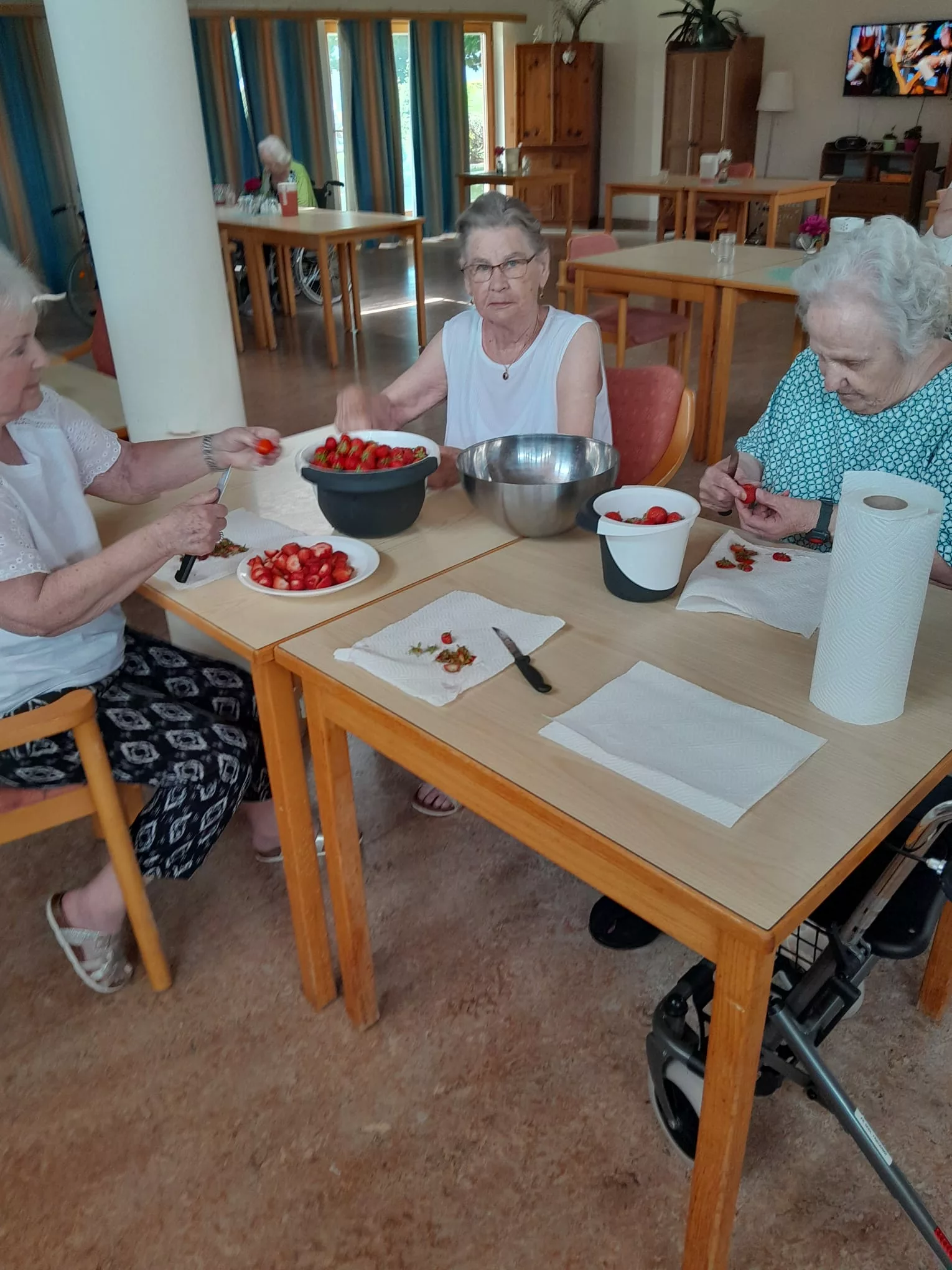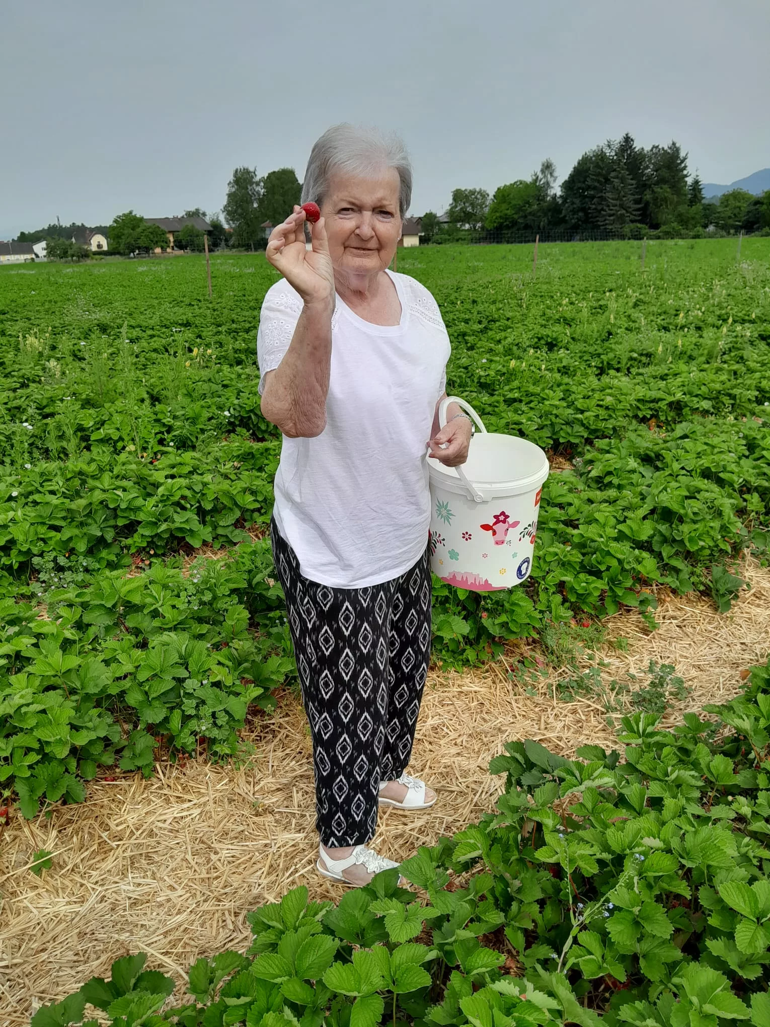Wir fuhren gemeinsam mit einigen BewohnerInnen ins Erdbeerland und pflückten fleißig die vollreifen Erdbeeren. Nach getaner Arbeit stärkten wir uns bei einem gemeinsamen Erfrischungsgetränk. Nach unserem gemeinsamen Ausflug wurden natürlich die Erdbeeren gemeinsam von allen BewohnerInnen vom gemütlichen Eck verarbeitet. Wir machten Erdbeermarmelade, Erdbeerlikör und Erdbeeren mit Schlag, die vorzüglich schmeckten, genossen wir bei unserem Gedächtnistraining, mit Erinnerungsarbeit sowie Wortfindungsübungen.