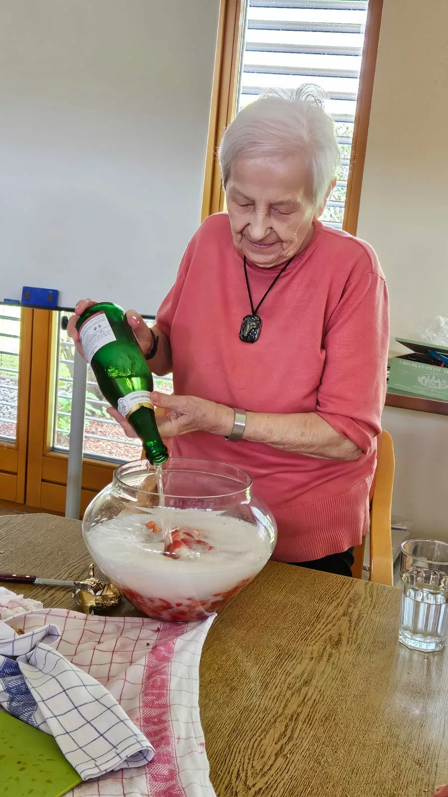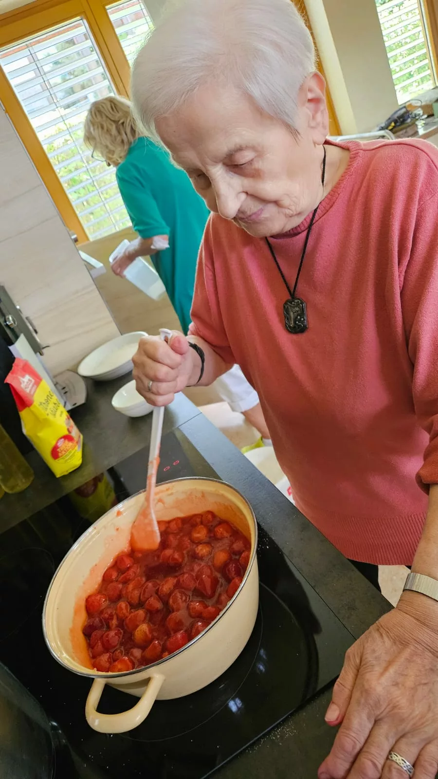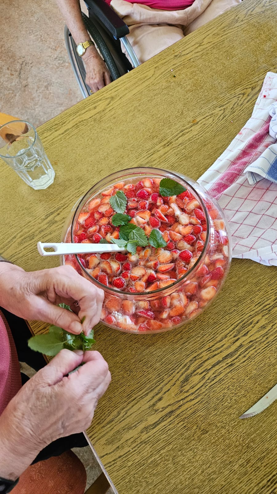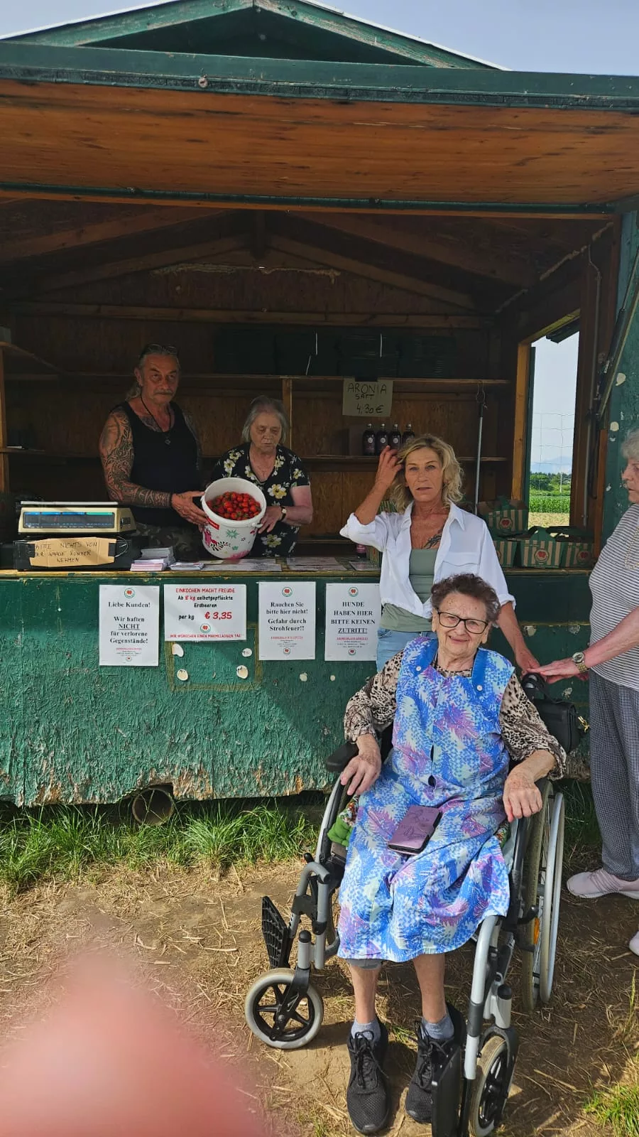 Wir fuhren gemeinsam mit einigen BewohnerInnen ins Erdbeerland und pflückten fleißig die vollreifen Erdbeeren. Nach getaner Arbeit stärkten wir uns bei einem gemeinsamen Erfrischungsgetränk. Nach unserem gemeinsamen Ausflug wurden natürlich die Erdbeeren gemeinsam von allen BewohnerInnen vom gemütlichen Eck verarbeitet. Wir machten Erdbeermarmelade, Erdbeerlikör und Erdbeeren mit Schlag, die vorzüglich schmeckten, genossen wir bei unserem Gedächtnistraining, mit Erinnerungsarbeit sowie Wortfindungsübungen.