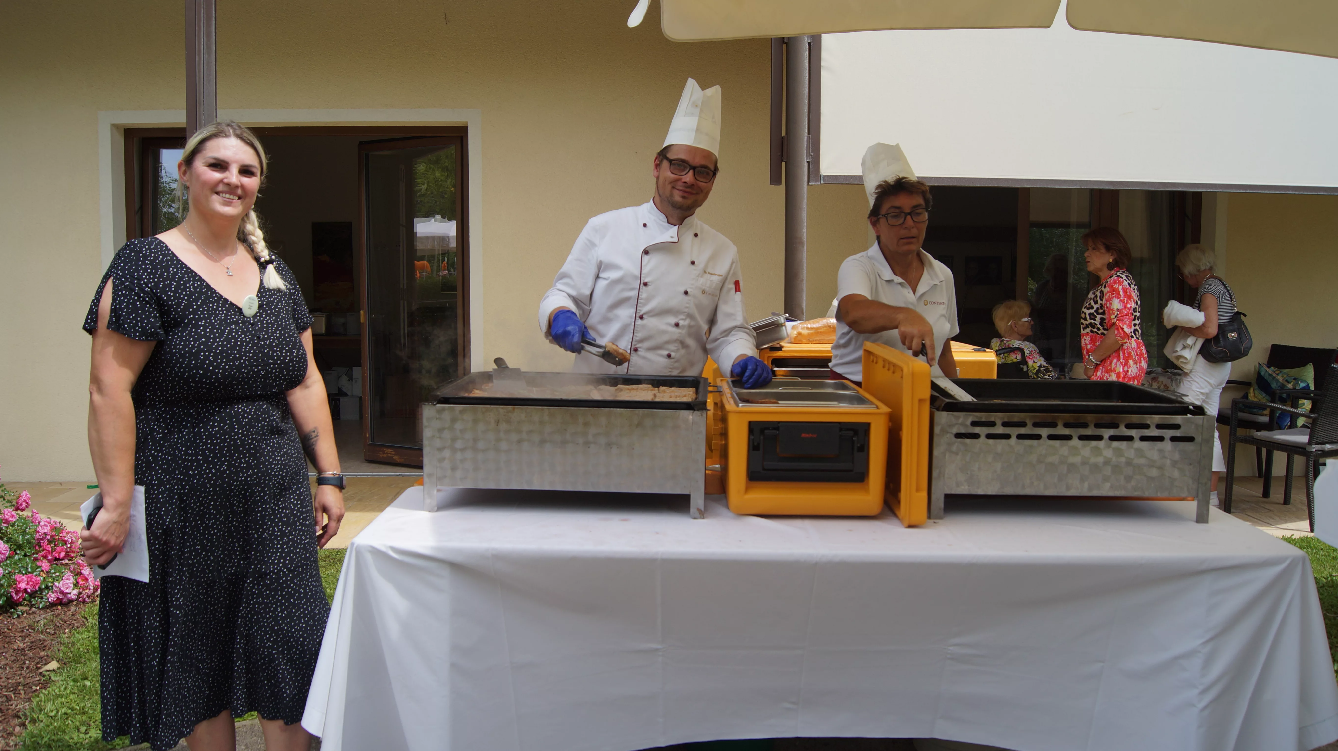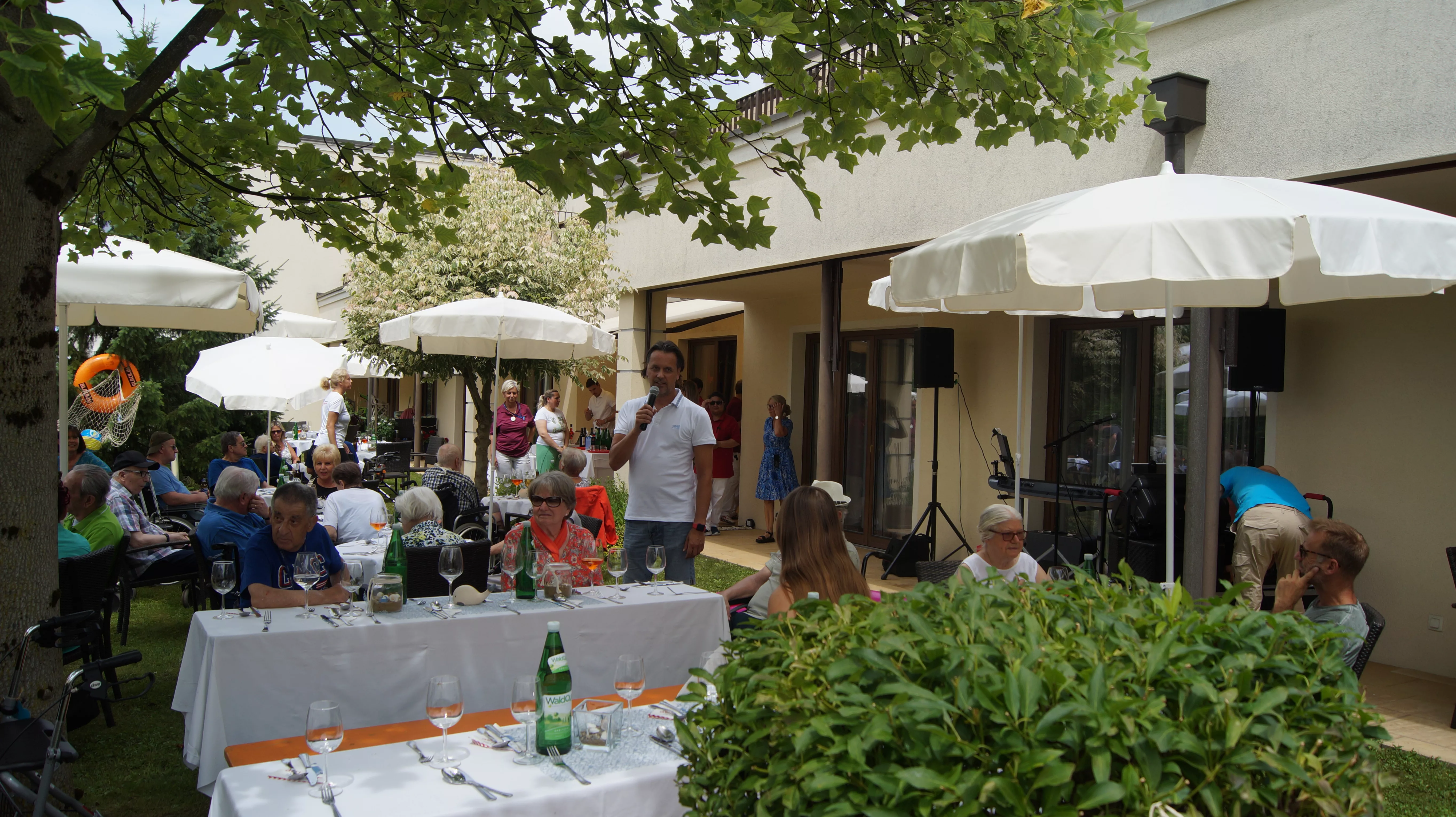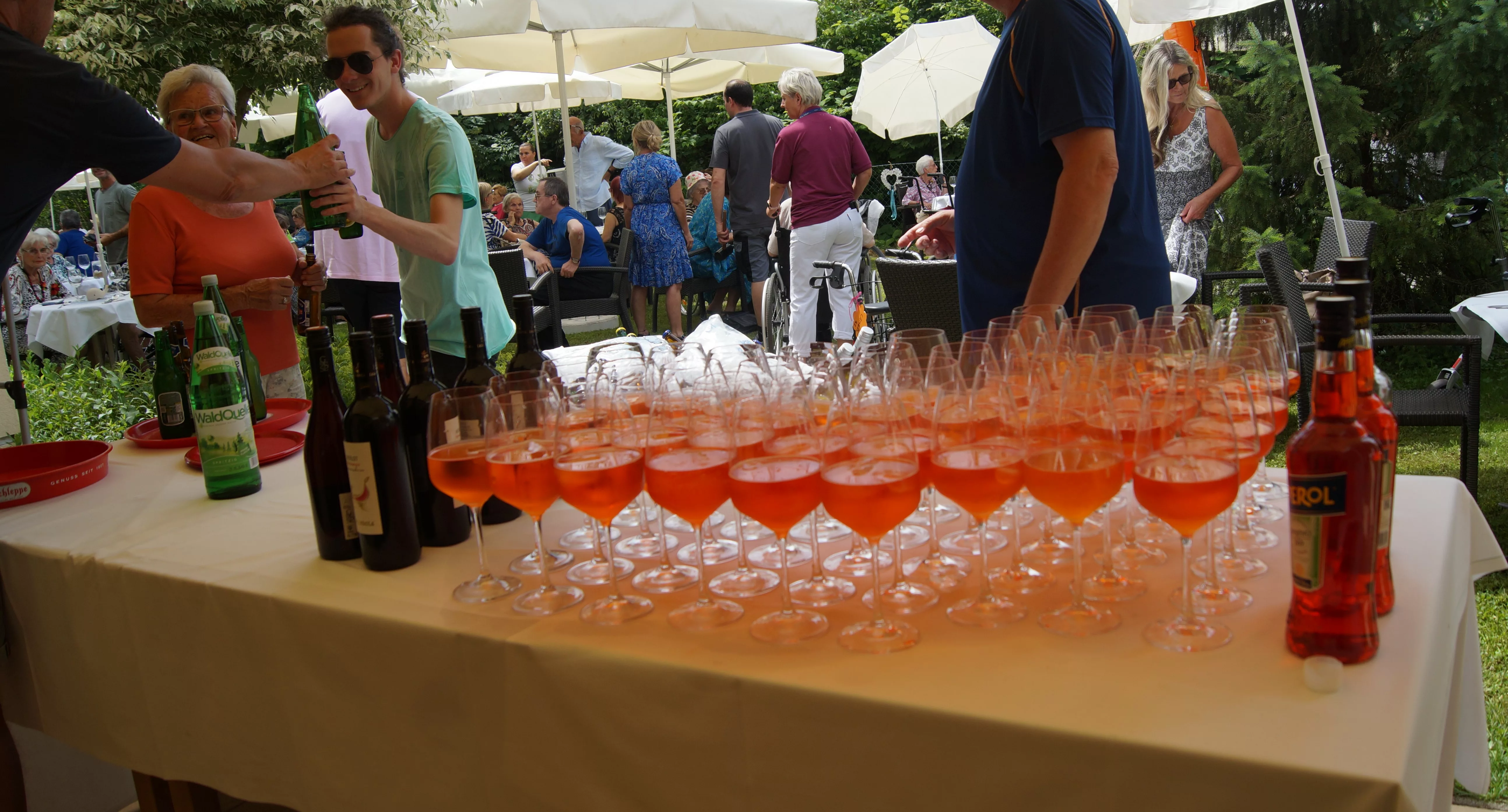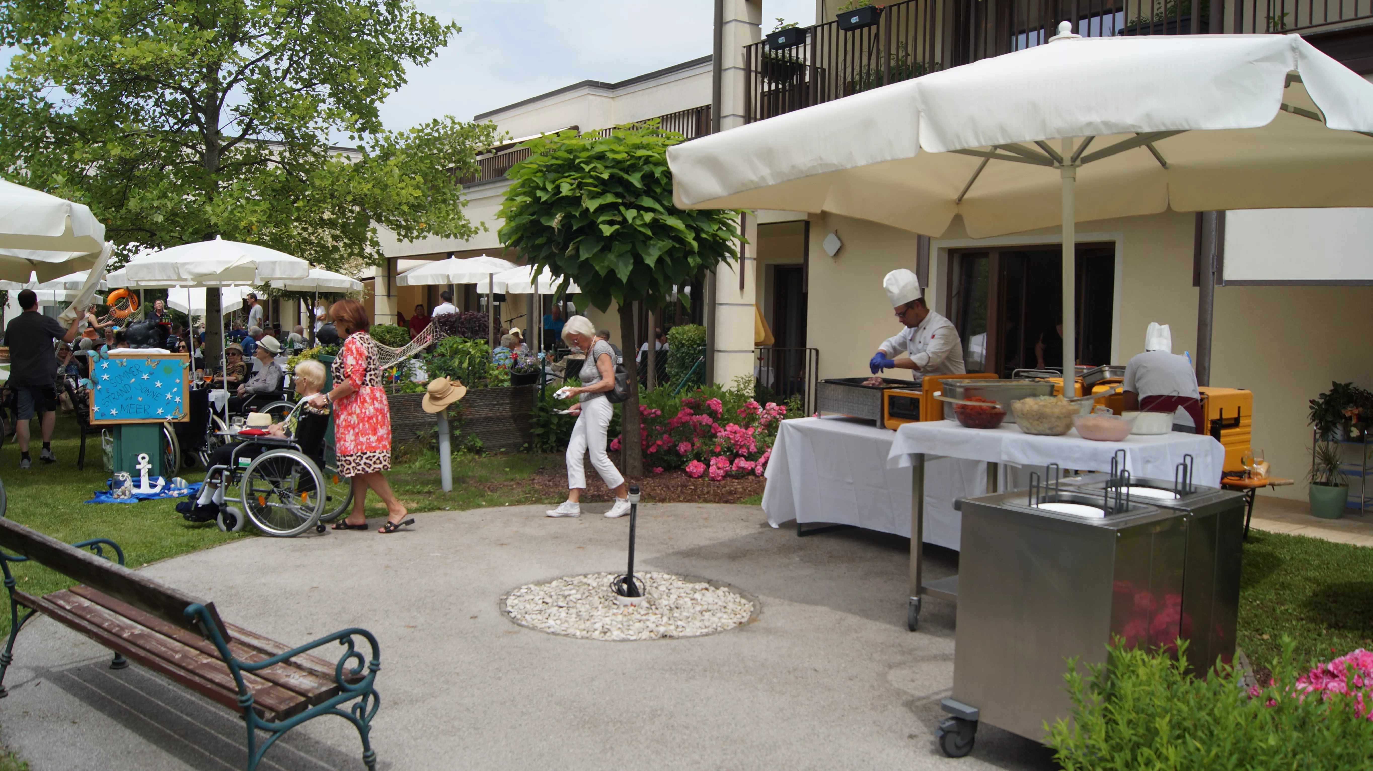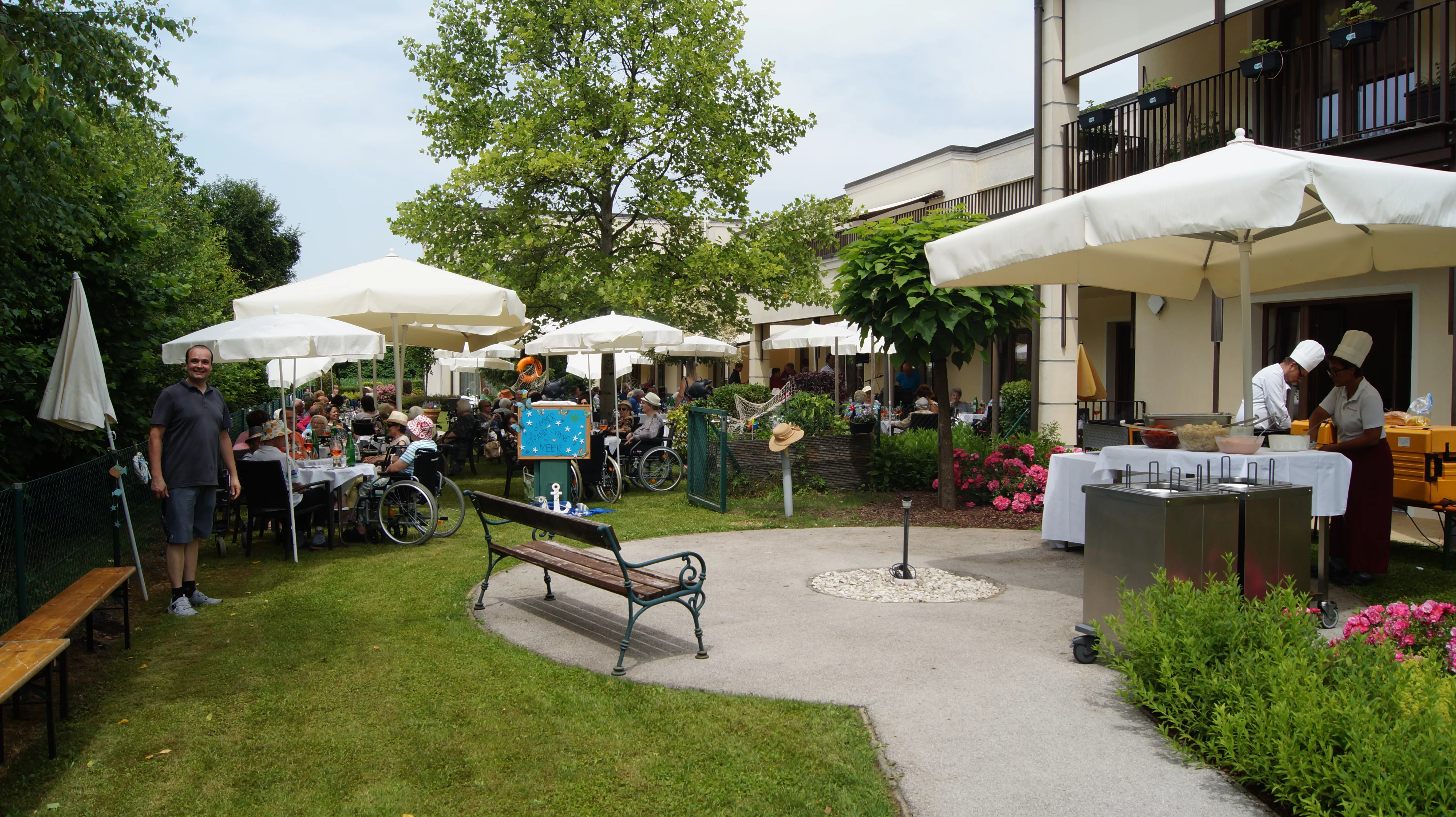 Eröffnet wurde das Spektakel mit Aperol Spritz als Aperitif, aber auch für die Kulinarik wurde gesorgt, da die Firma Contento für uns grillte. Es gab gegrillte Fleisch- und Fischspezialitäten mit einem ausgewogenen Mix aus Salaten und Gebäck als Beilage. Sowohl Bewohner*innen, Angehörige als auch Mitarbeiter*innen waren vom Essen begeistert, und es wurde kräftig Nachschlag geholt. Als Nachspeise wurden unsere Gäste mit Erdbeer-Tiramisu verwöhnt.