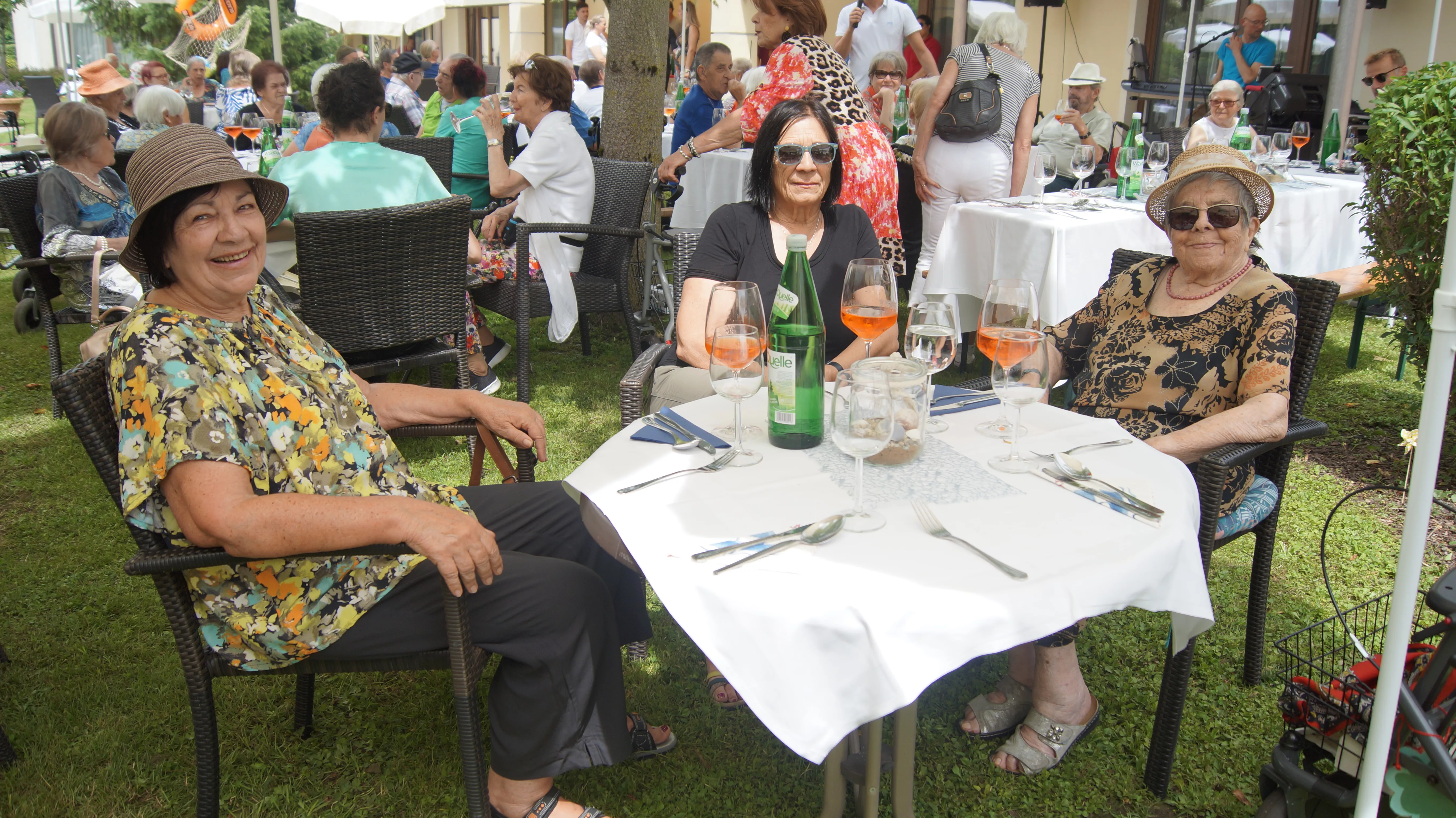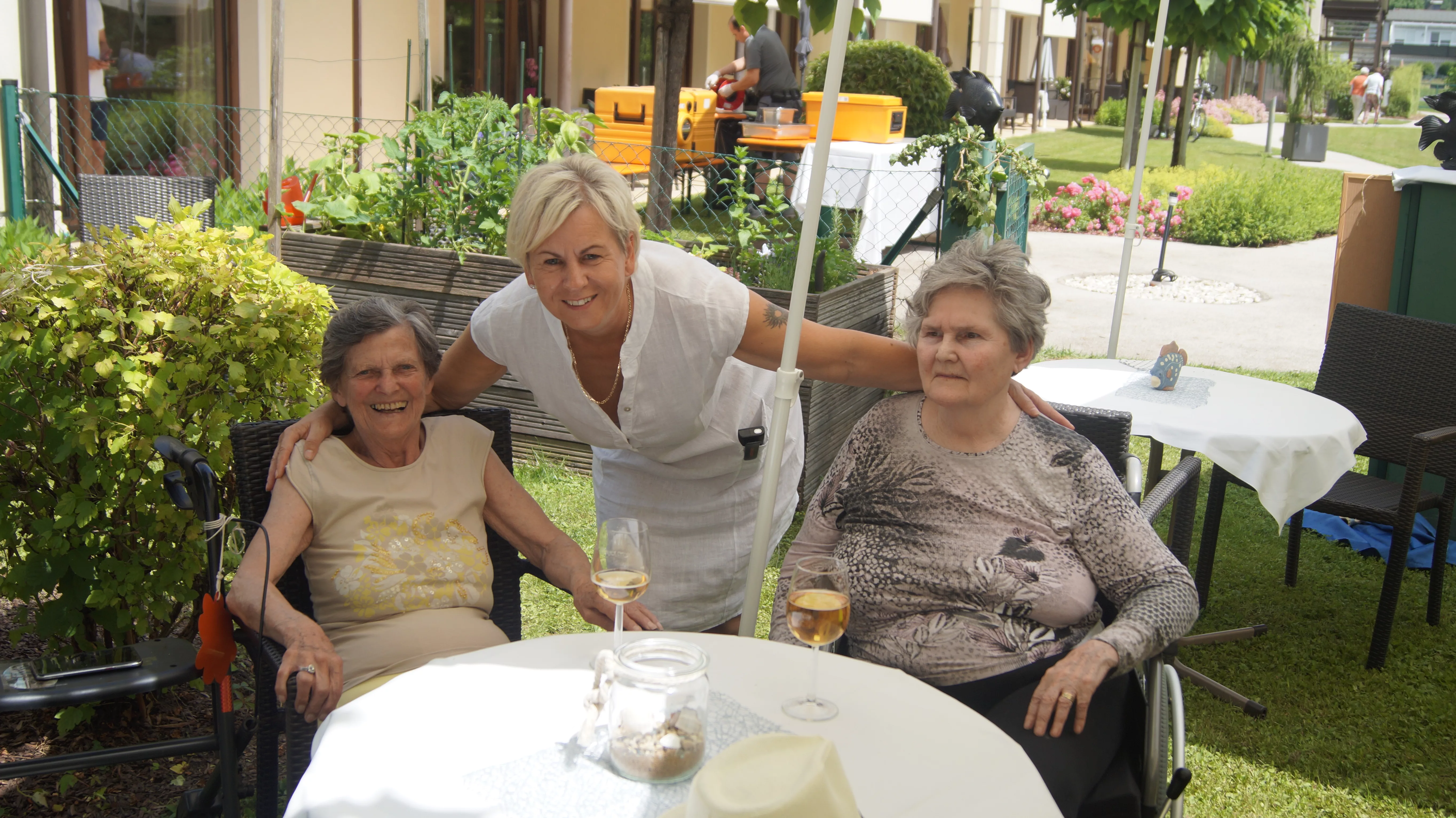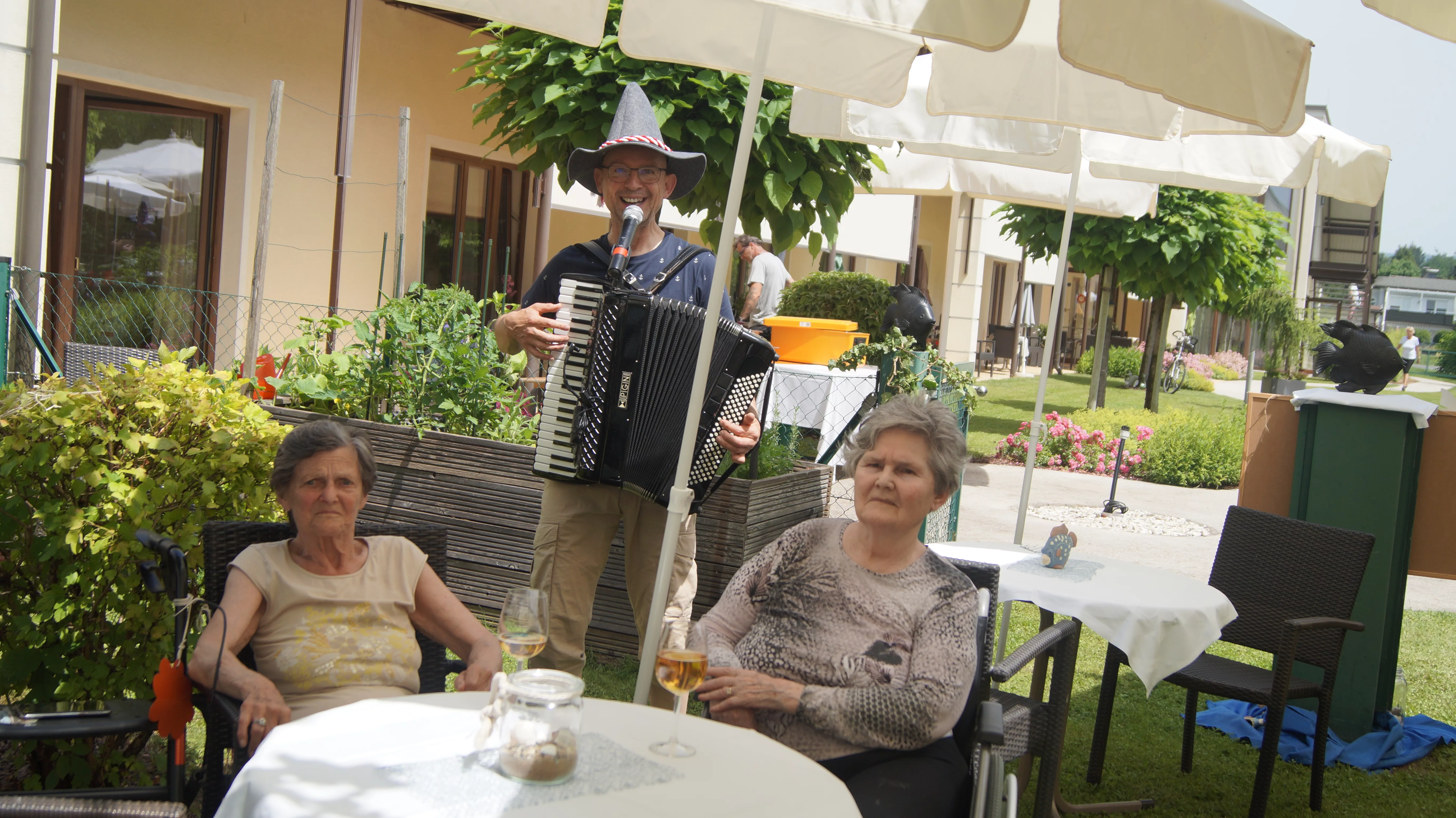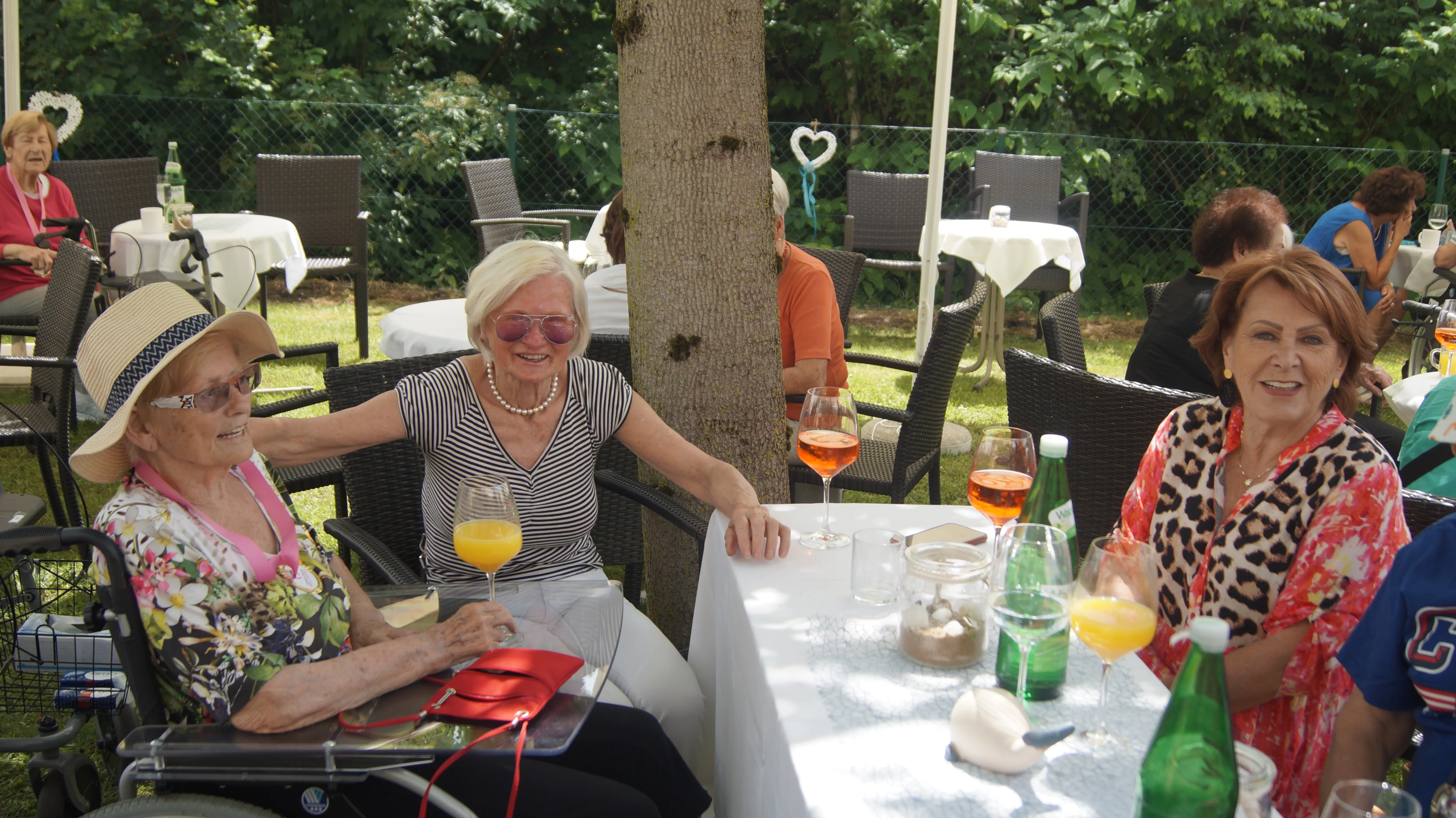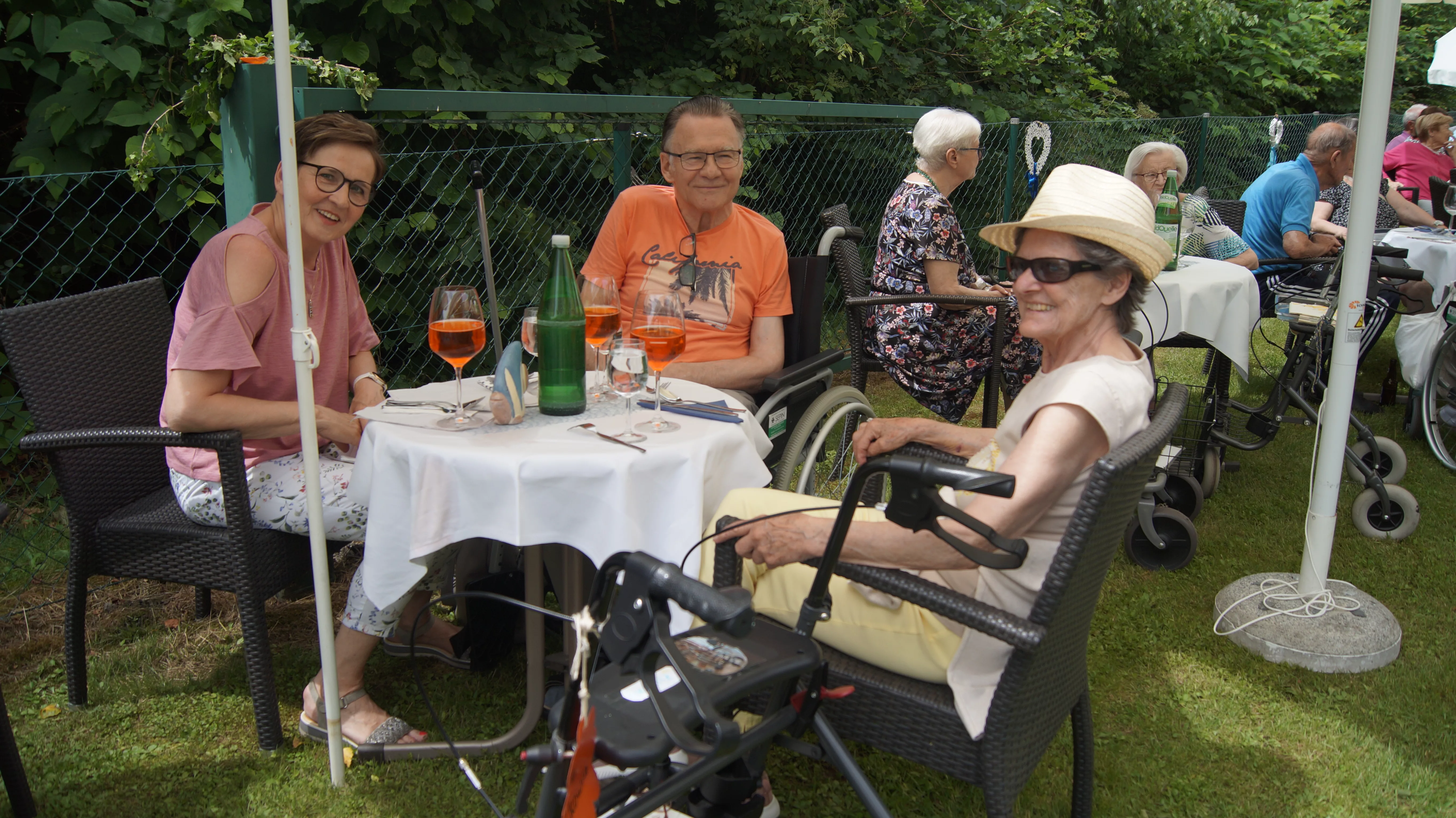 Eröffnet wurde das Spektakel mit Aperol Spritz als Aperitif, aber auch für die Kulinarik wurde gesorgt, da die Firma Contento für uns grillte. Es gab gegrillte Fleisch- und Fischspezialitäten mit einem ausgewogenen Mix aus Salaten und Gebäck als Beilage. Sowohl Bewohner*innen, Angehörige als auch Mitarbeiter*innen waren vom Essen begeistert, und es wurde kräftig Nachschlag geholt. Als Nachspeise wurden unsere Gäste mit Erdbeer-Tiramisu verwöhnt.