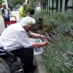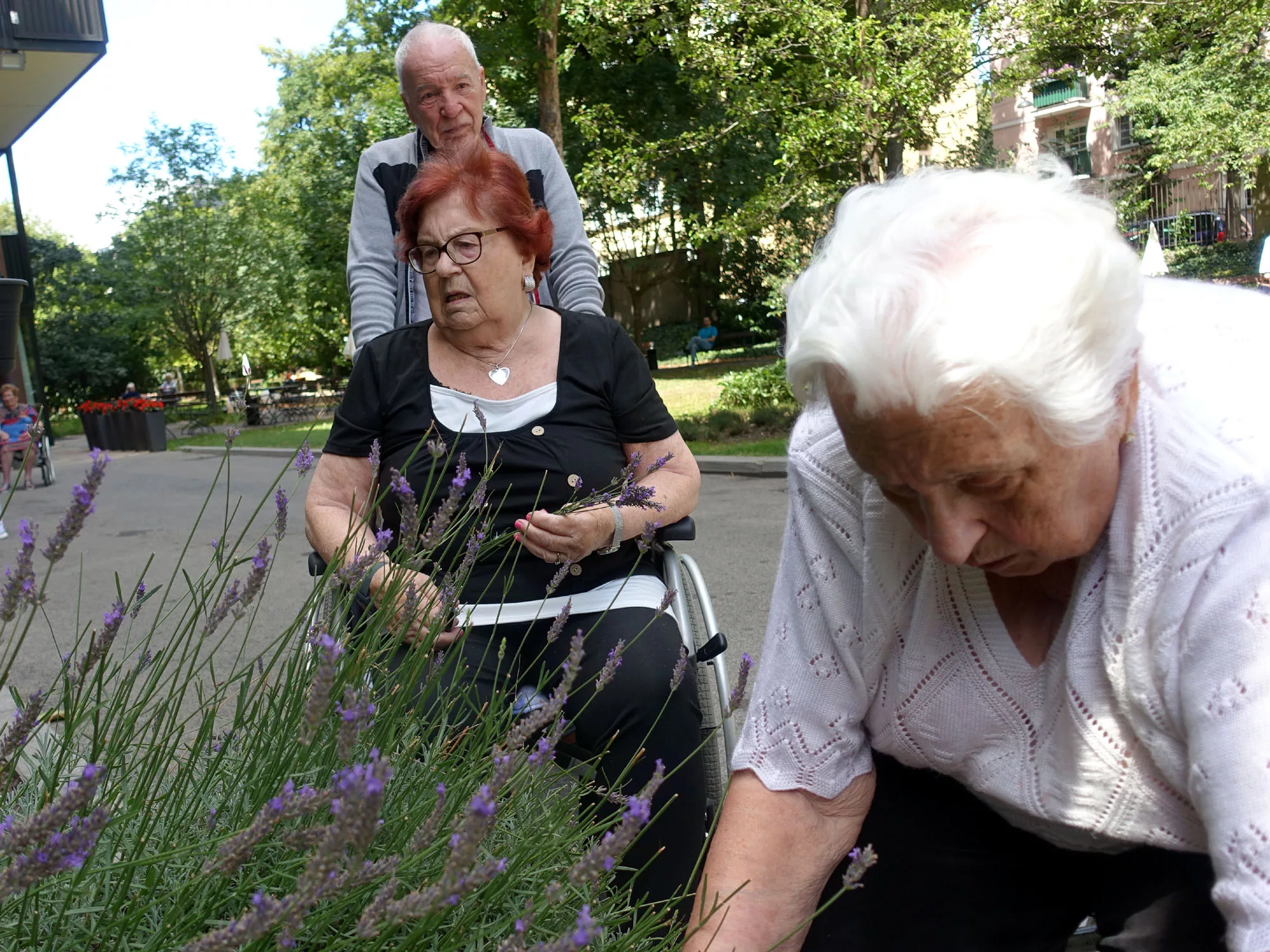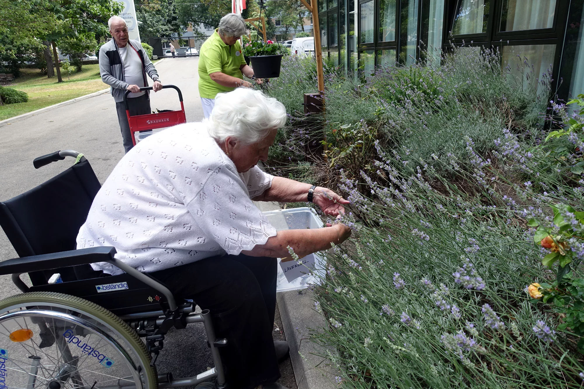 In der rund 6000 m² großen Parkanlage des „Wie daham…“ Seniorenschlössls Brigittenau befinden sich auch großzügig angelegte Rosenbeete, in welchen auch zahlreiche Levendelpflanzen zur Abwehr von Schädlingen ihren Platz gefunden haben. Heute wurden die abgeblühten Triebe geerntet, um sie zu Lavendelsäckchen zu verarbeiten, die im Winter am Adventmarkt angeboten werden.
