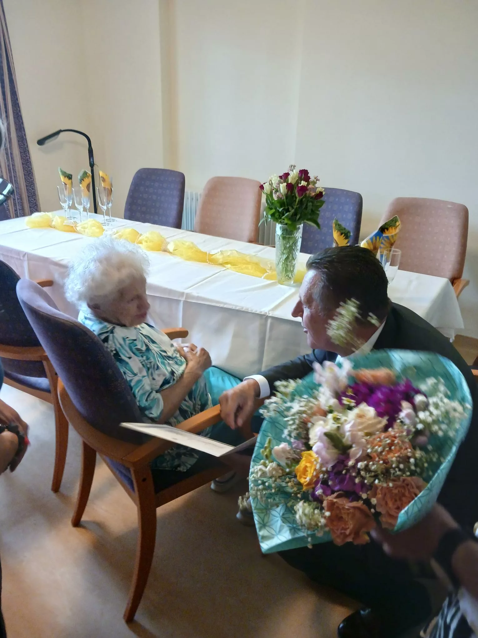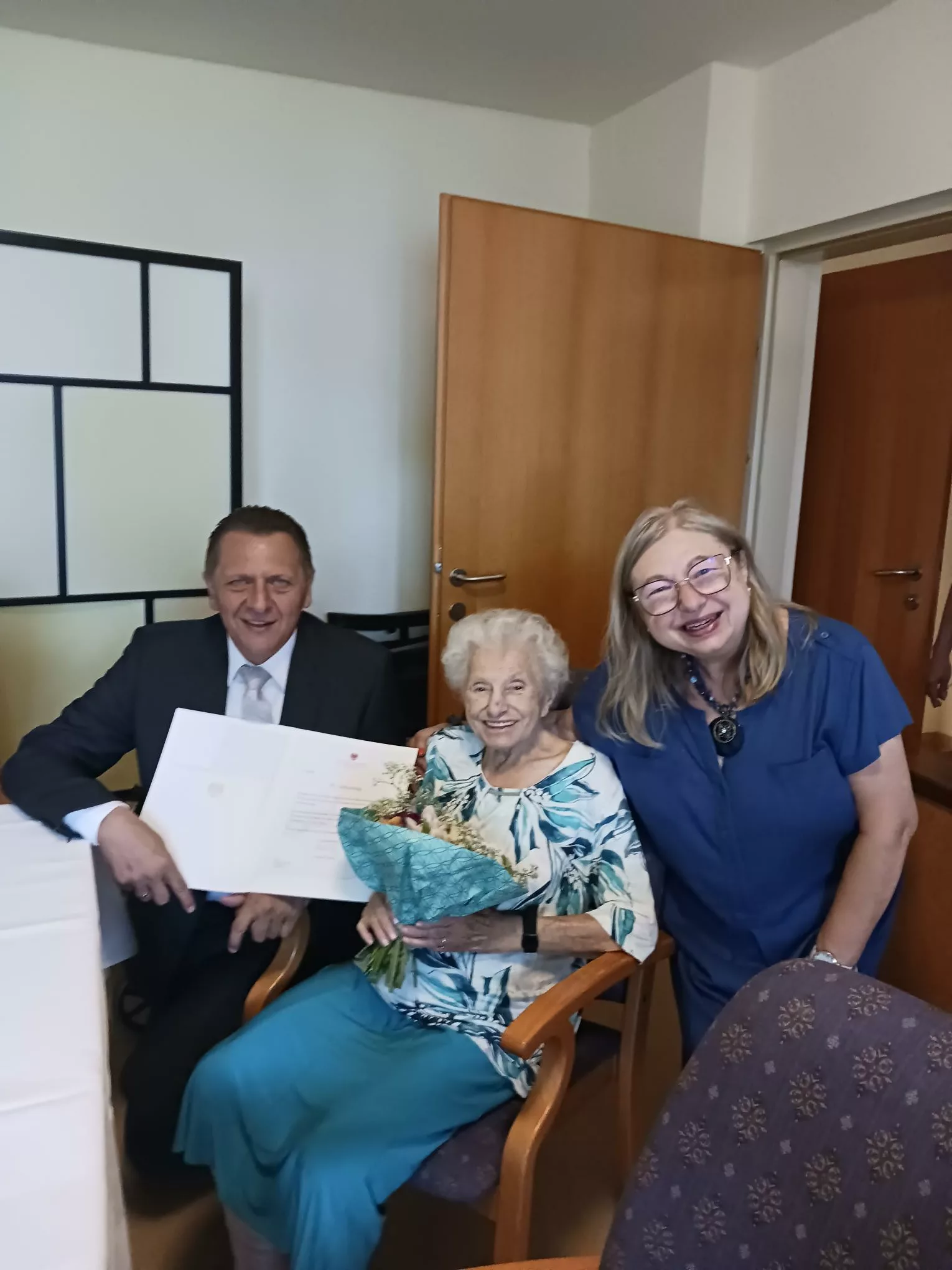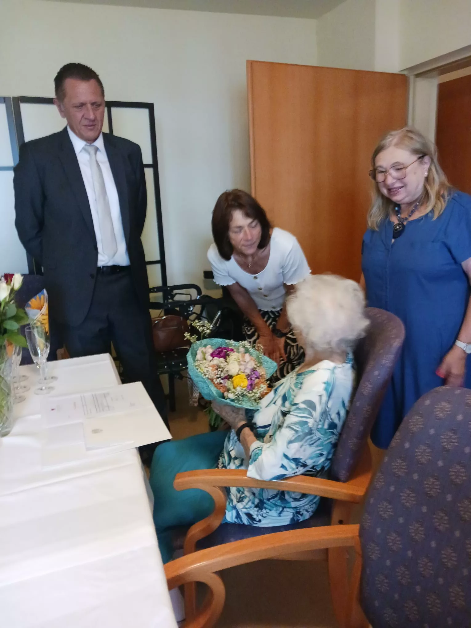 Zum 95. Geburtstag von Frau Grumbach durften wir unseren Bezirksvorsteher Thomas Steinhart begrüßen, der der rüstigen Seniorin zum Jubiläum gratulierte und ihr die Ehrengabe der Stadt überreichte. Im Anschluss wurde gemeinsam mit der Tochter der Bewohnerin bei Sekt, Brötchen, Kaffee und Kuchen beisammen gesessen und über die Erlebnisse von Frau Grumbach geredet und über die Vergangenheit sinniert.