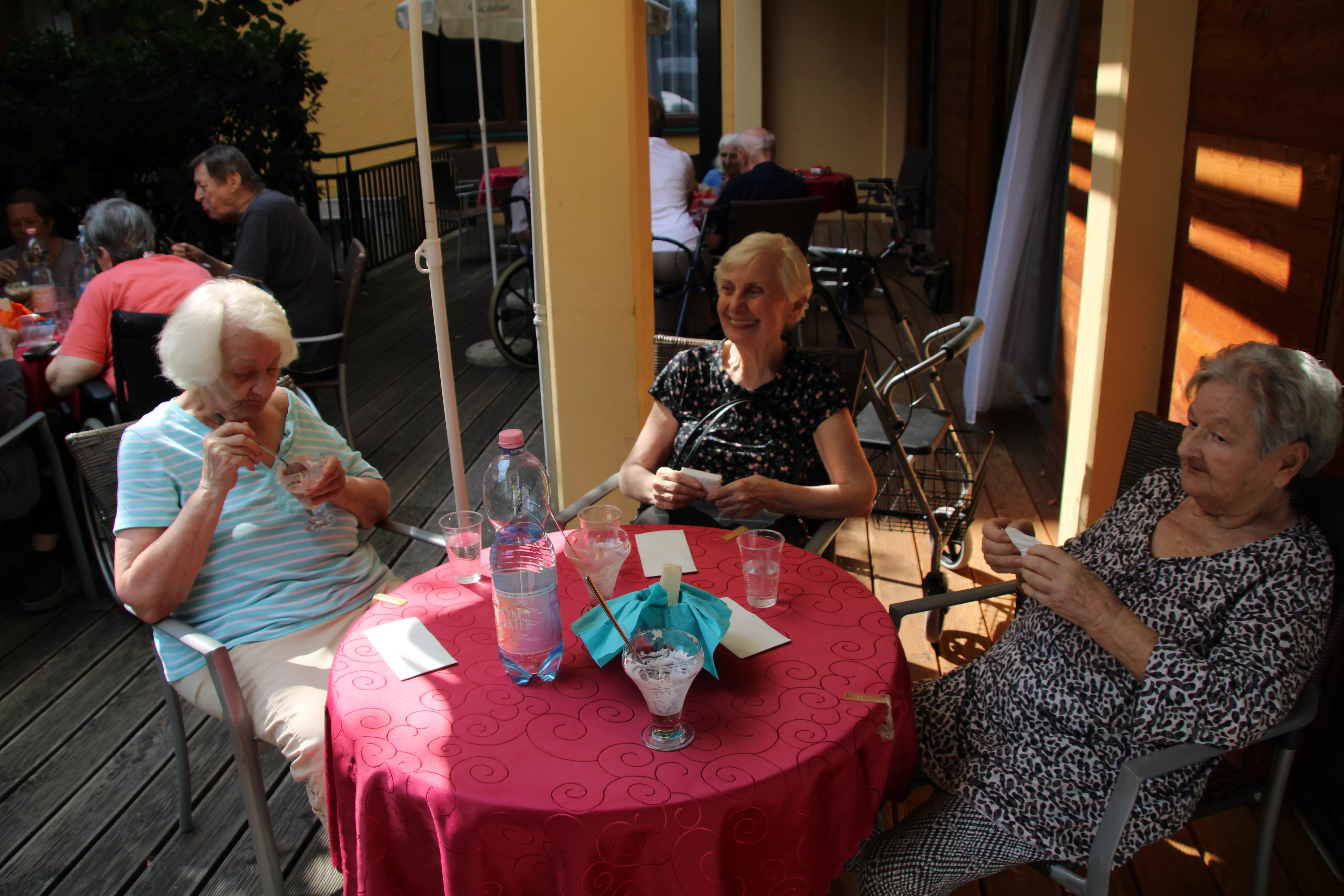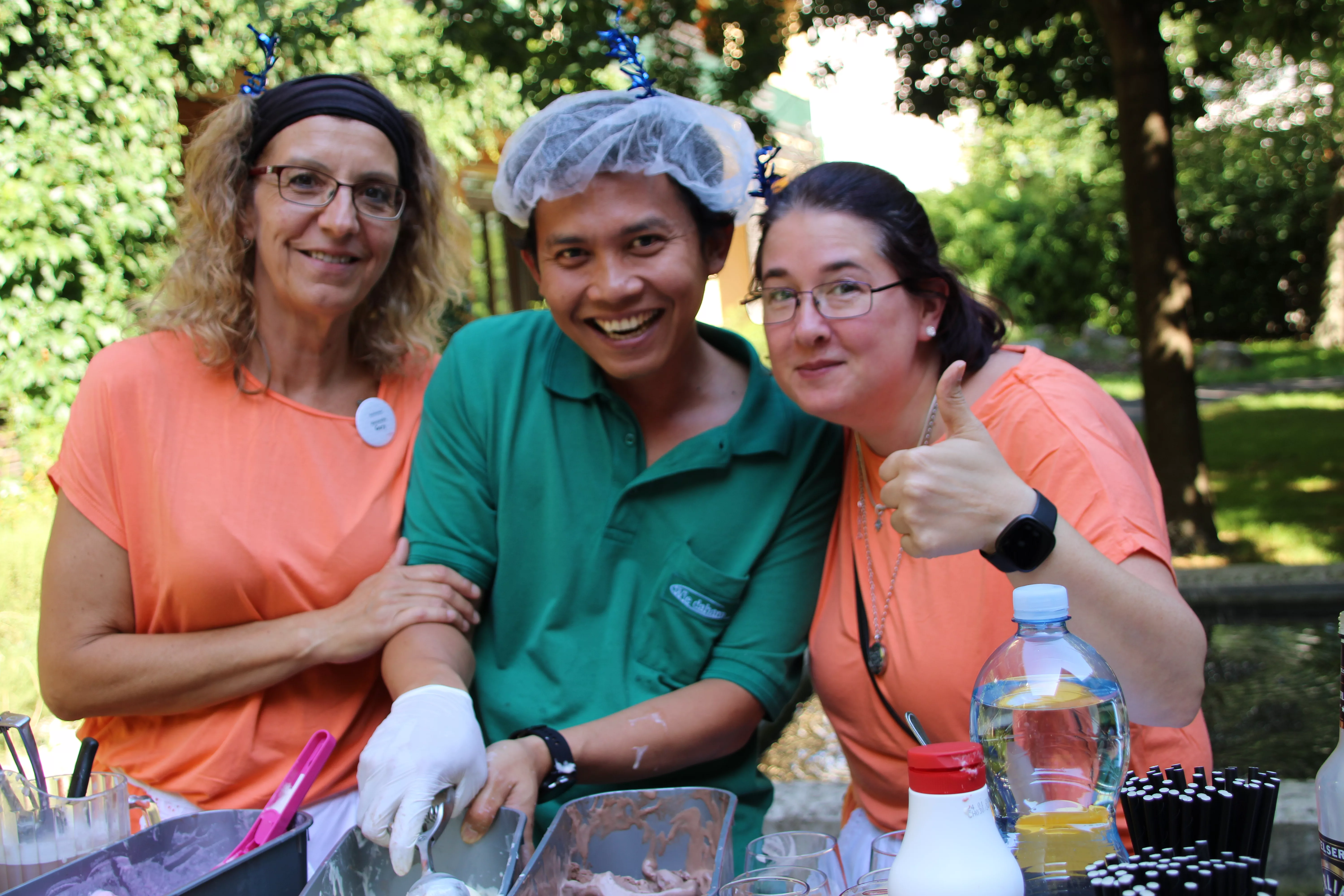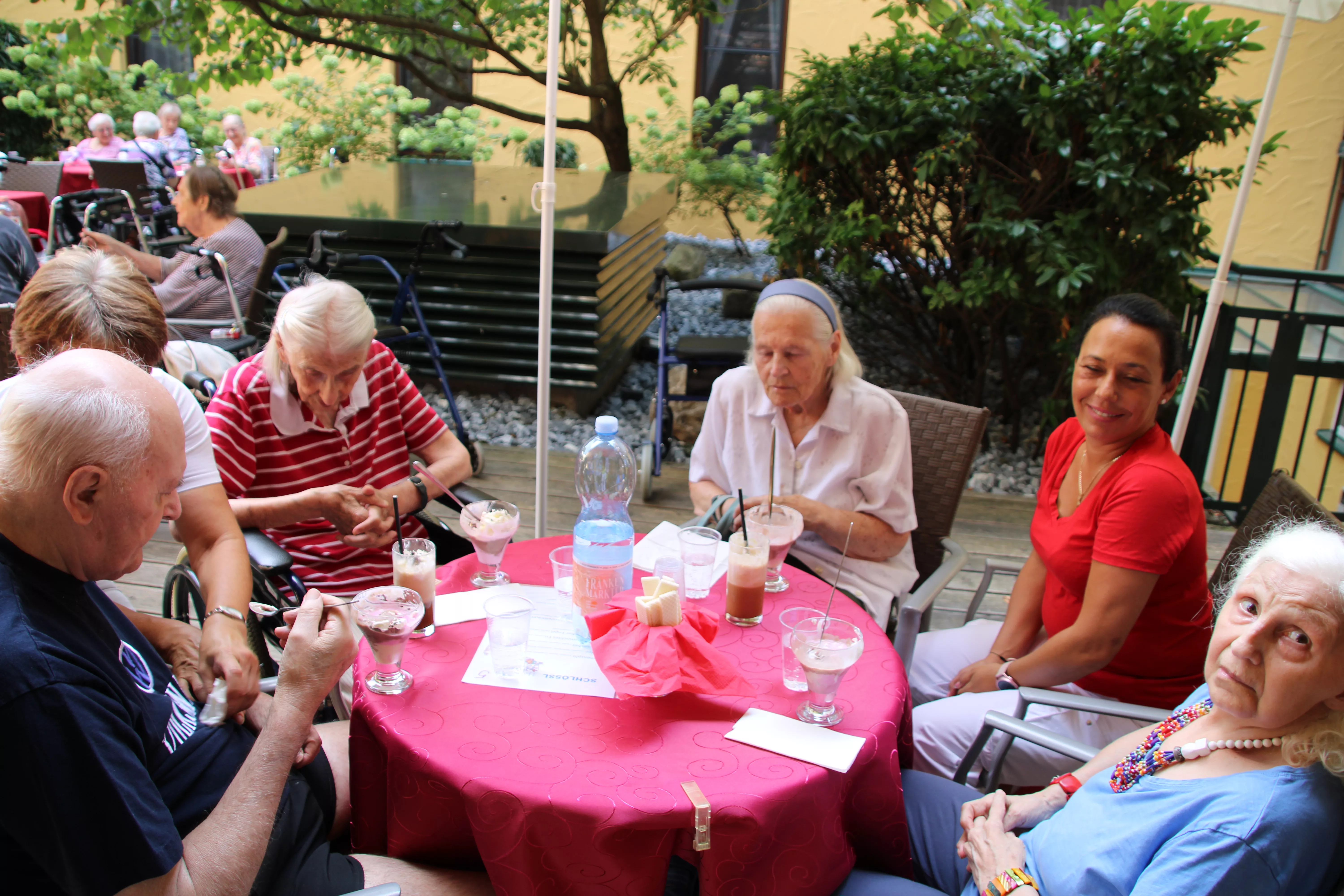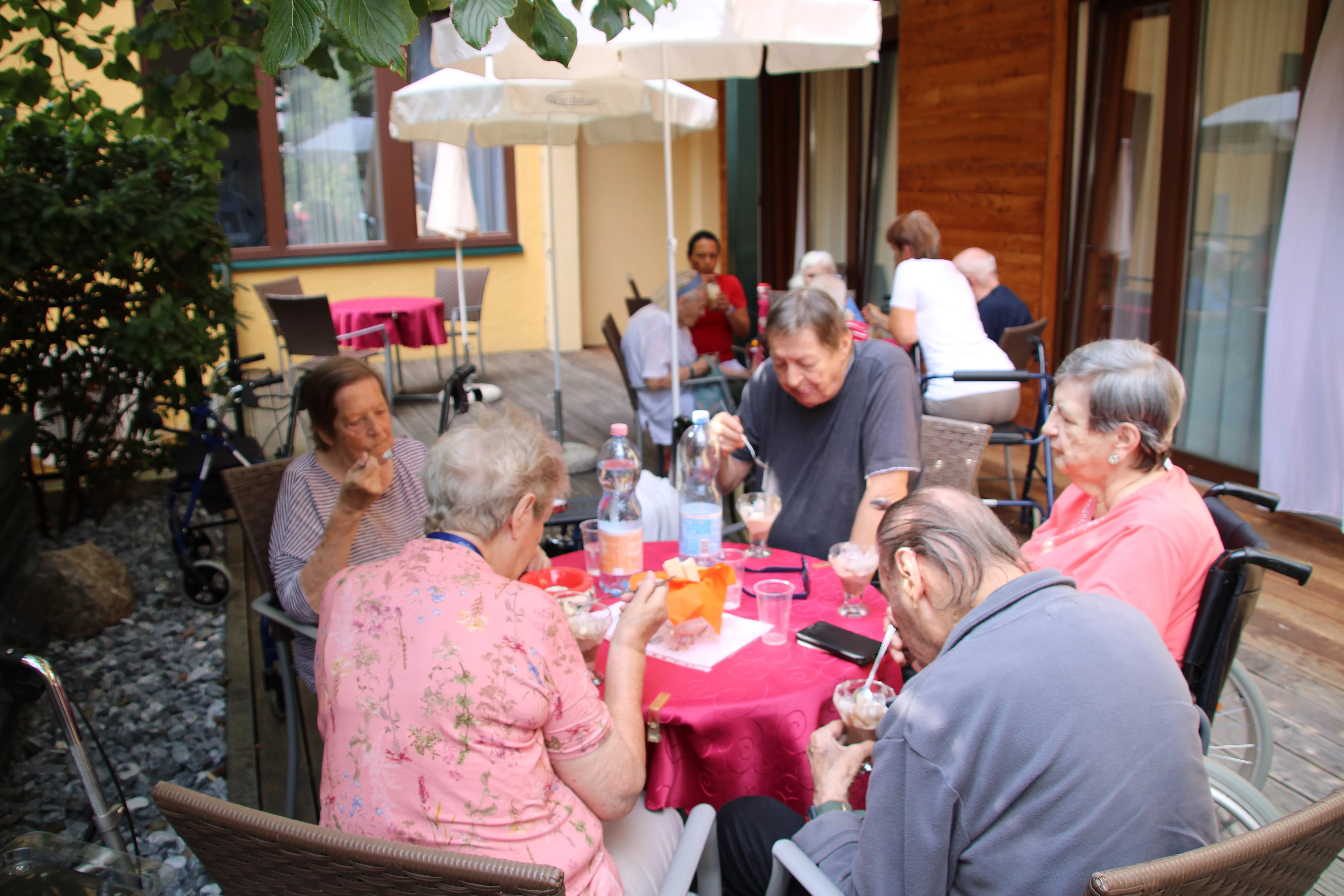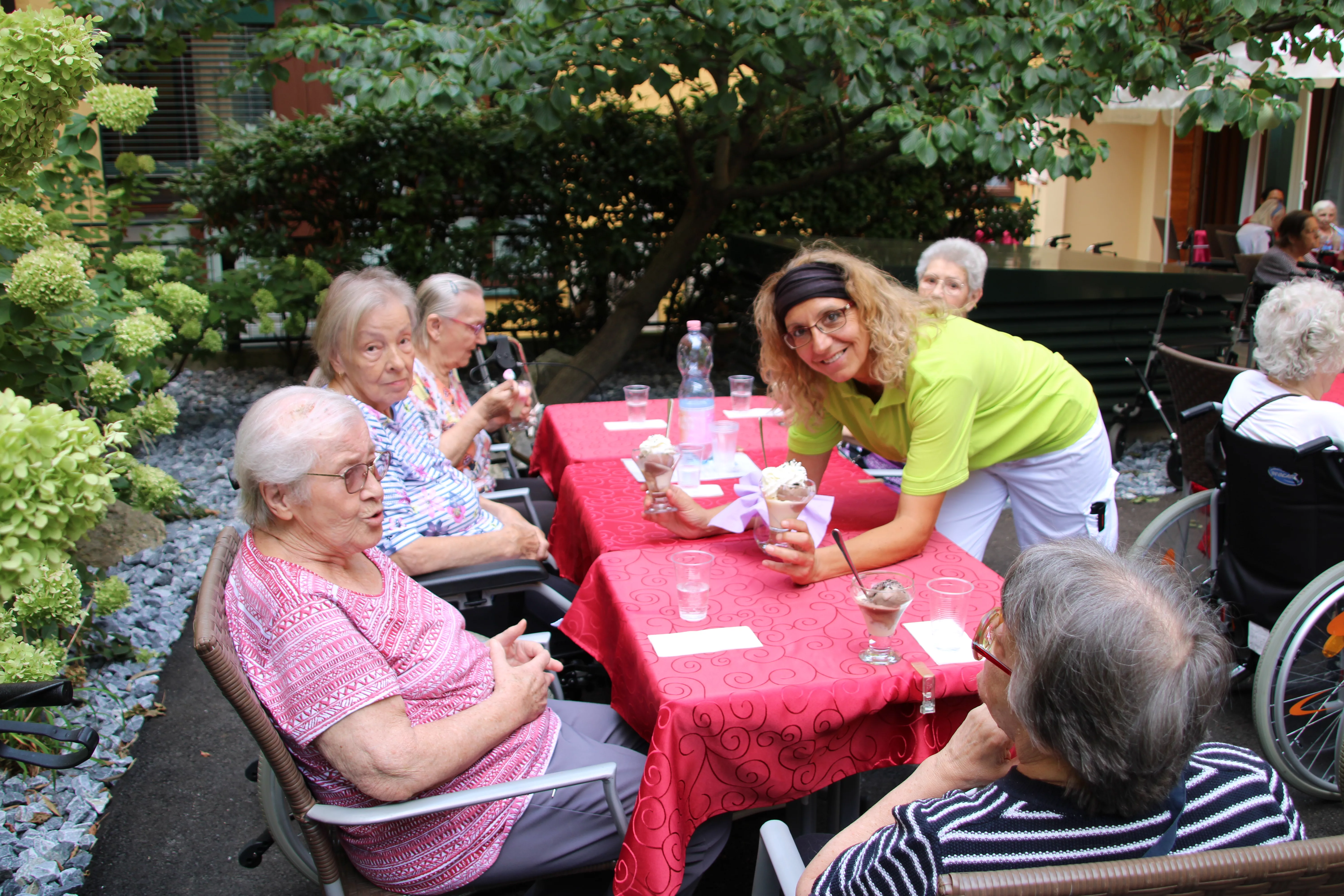 Eisparty im Garten Das schöne Sommerwetter trug zur guten Stimmung bei. BewohnerInnen treffen sich aus allen Stockwerken bei einem guten Eisbecher.