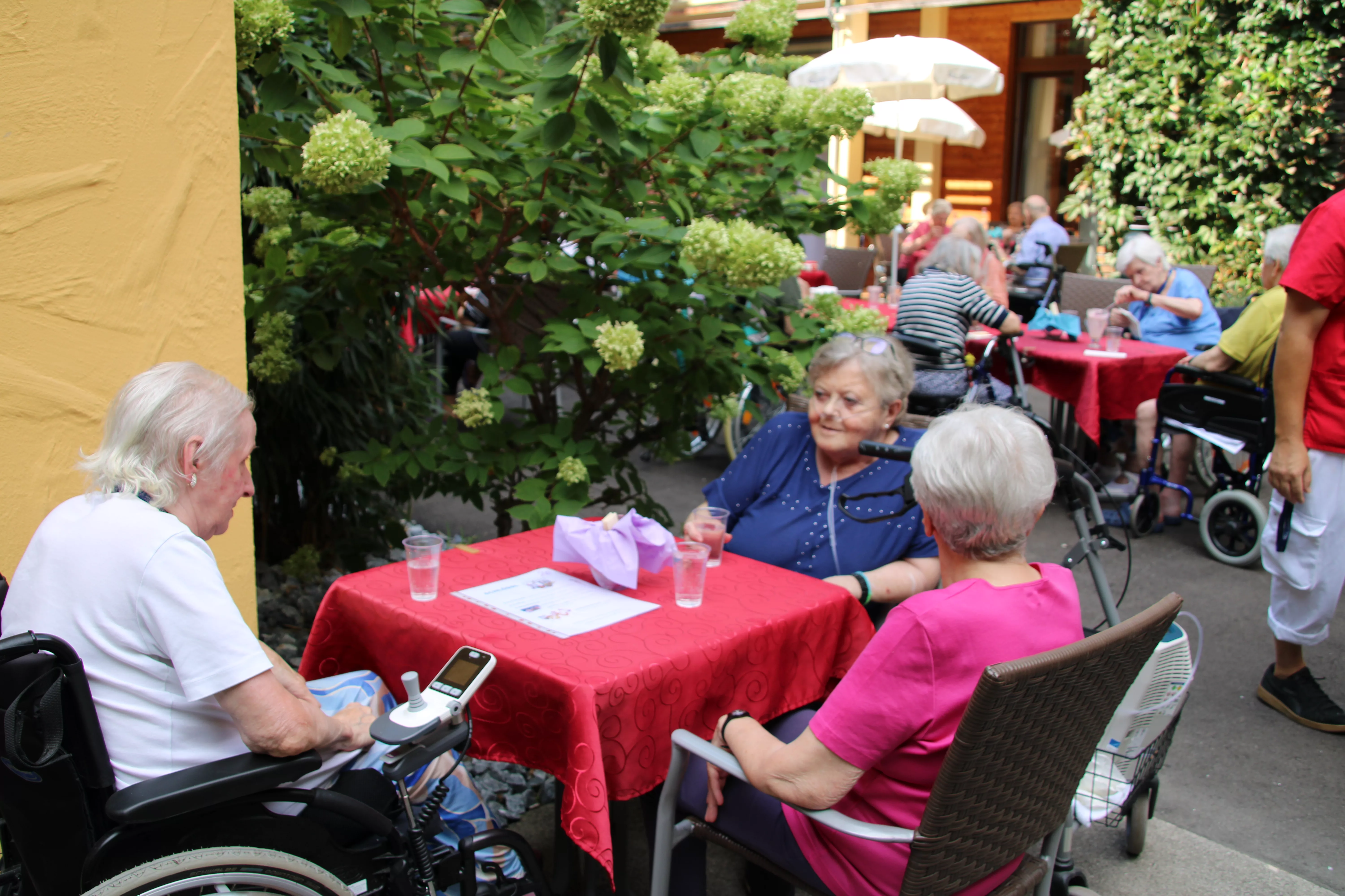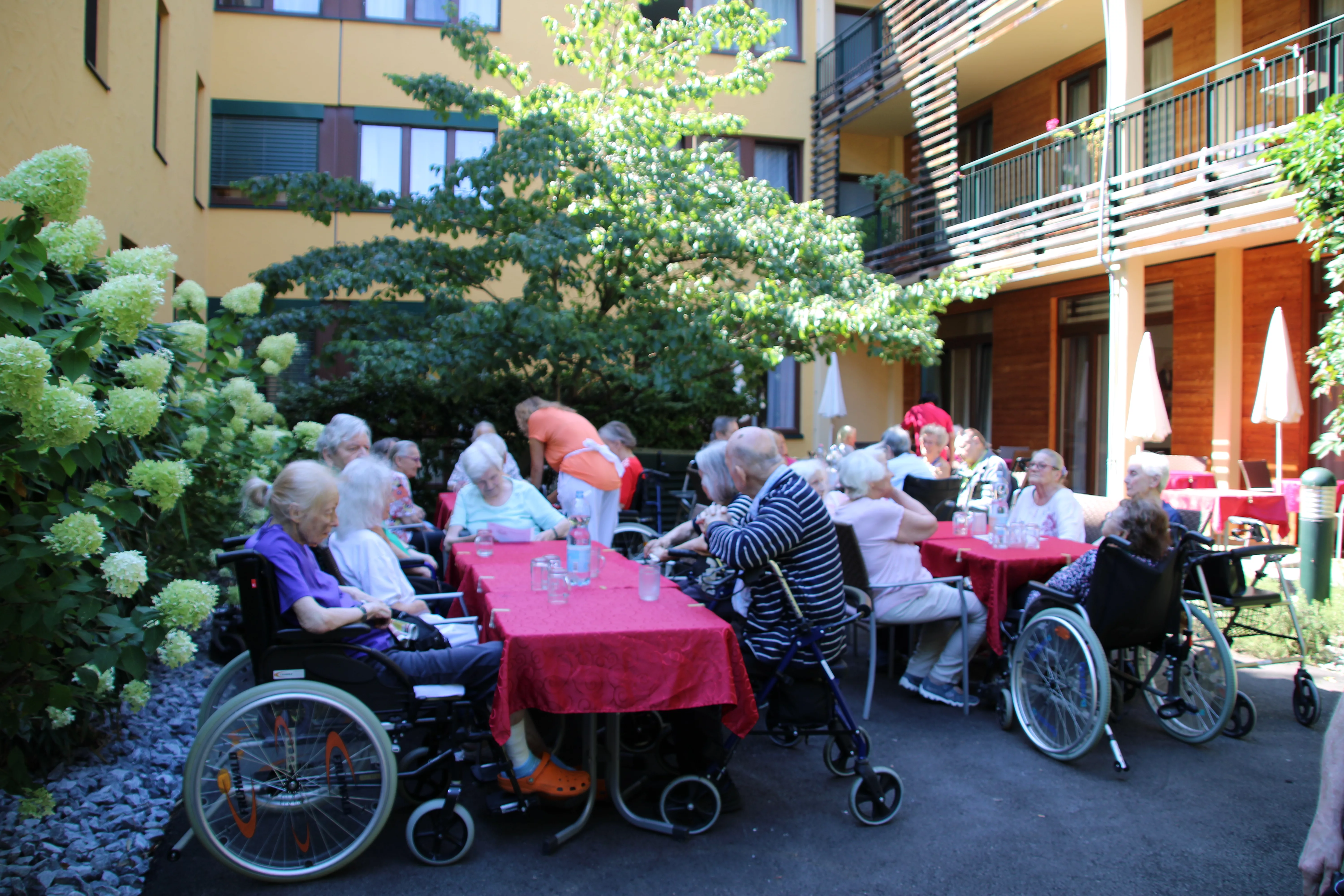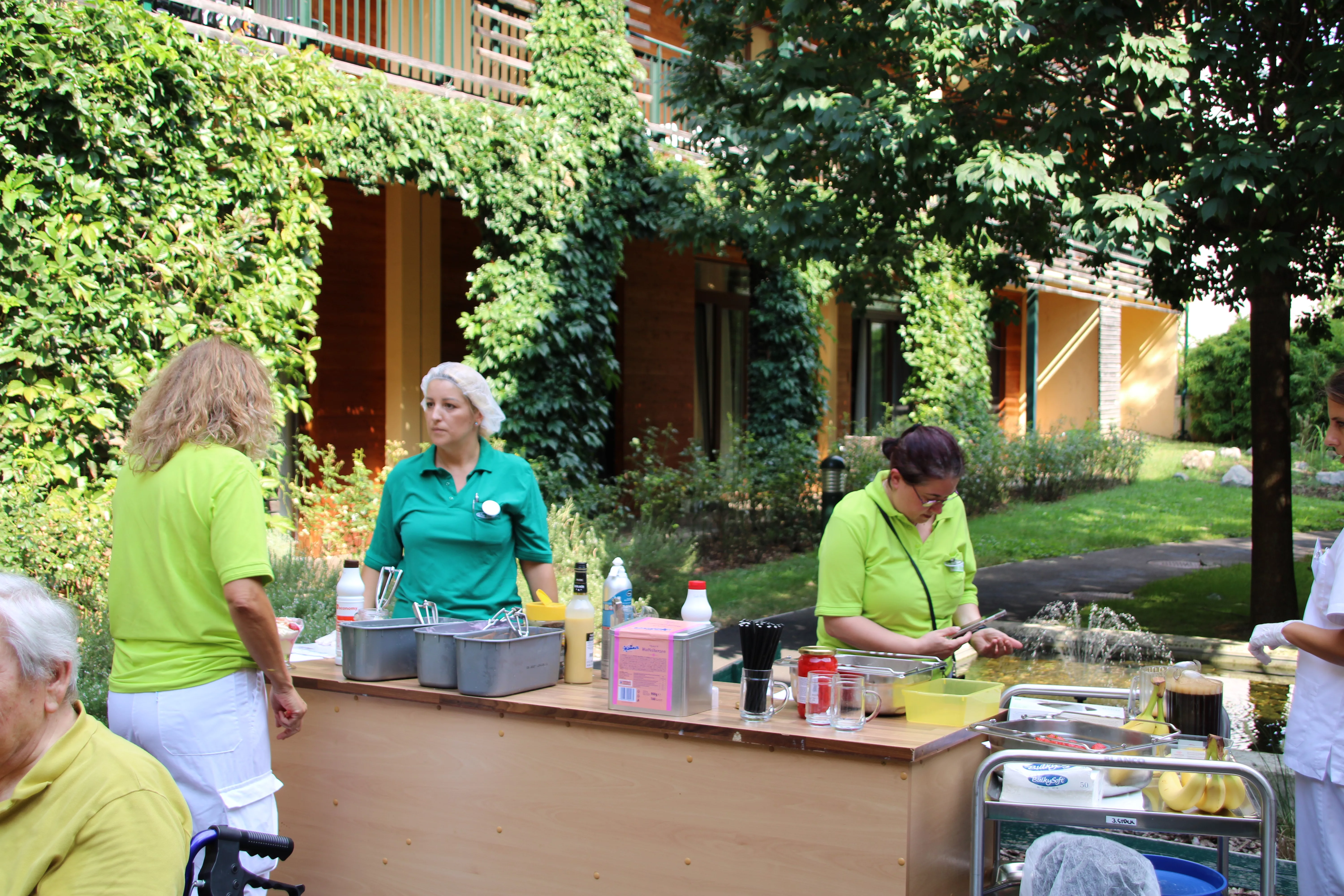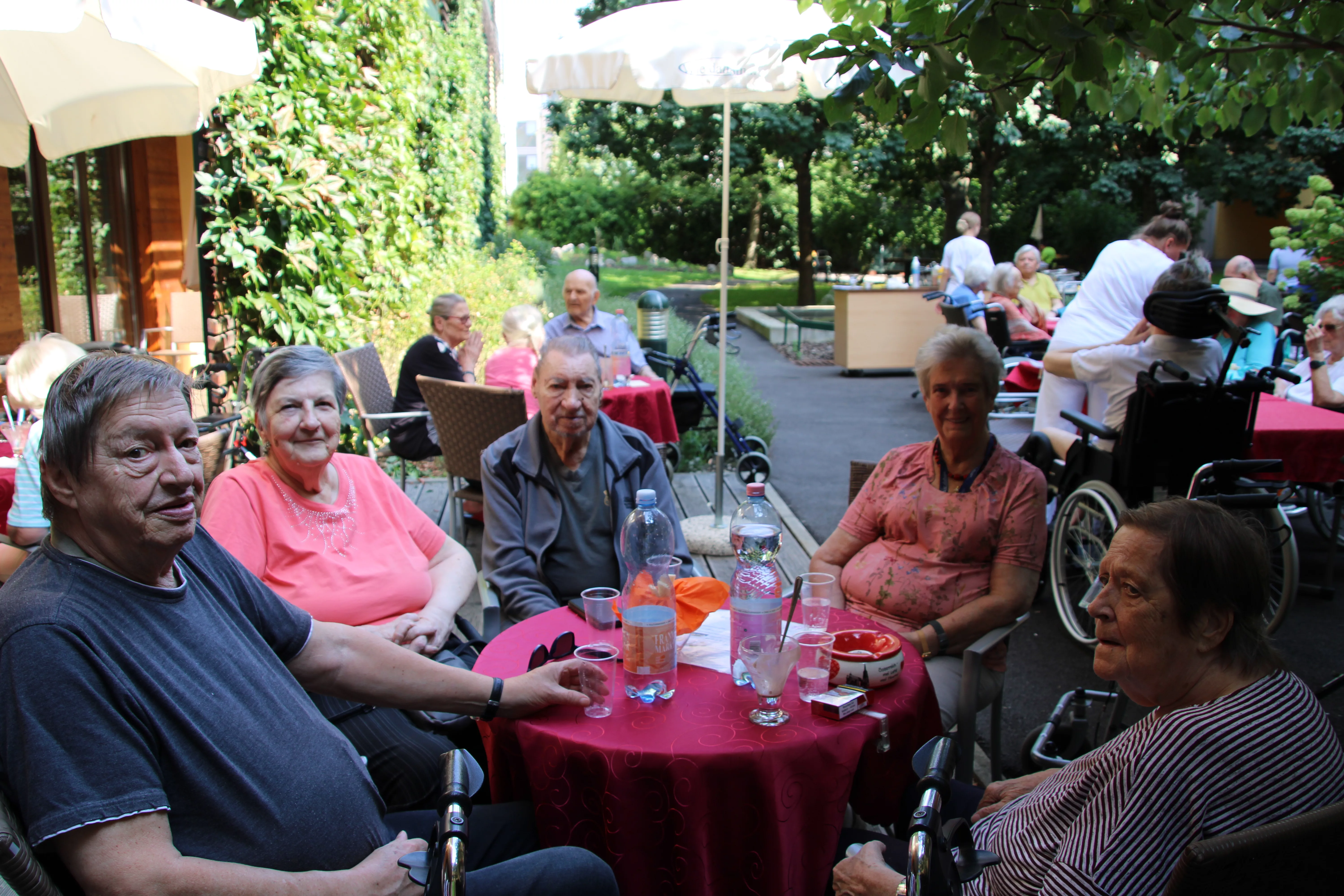 Eisparty im Garten Das schöne Sommerwetter trug zur guten Stimmung bei. BewohnerInnen treffen sich aus allen Stockwerken bei einem guten Eisbecher.