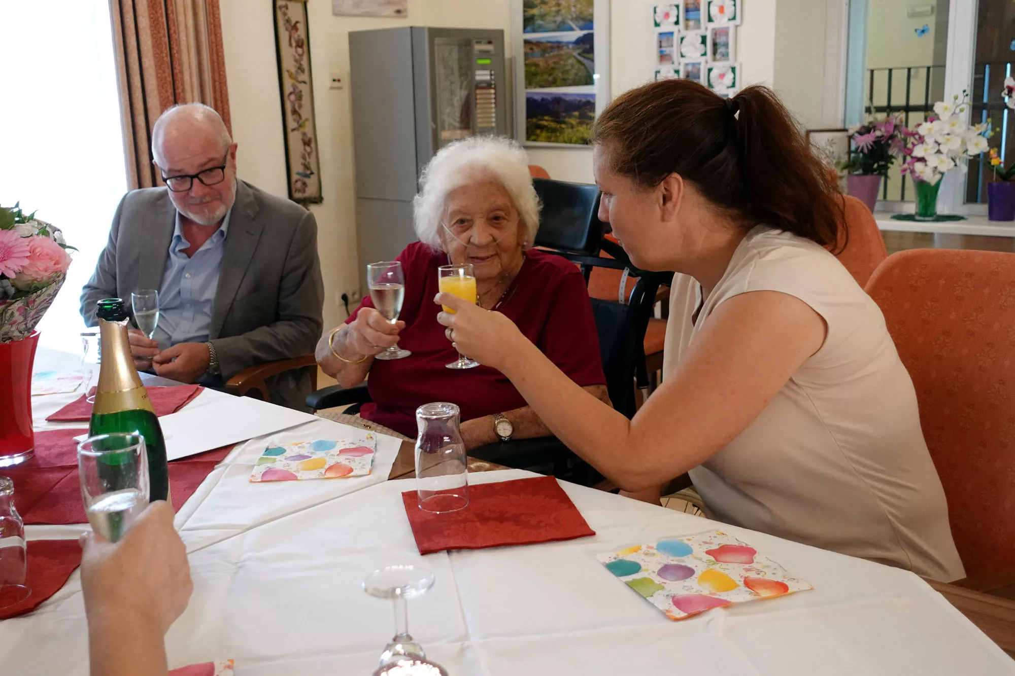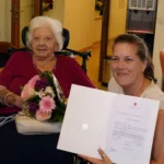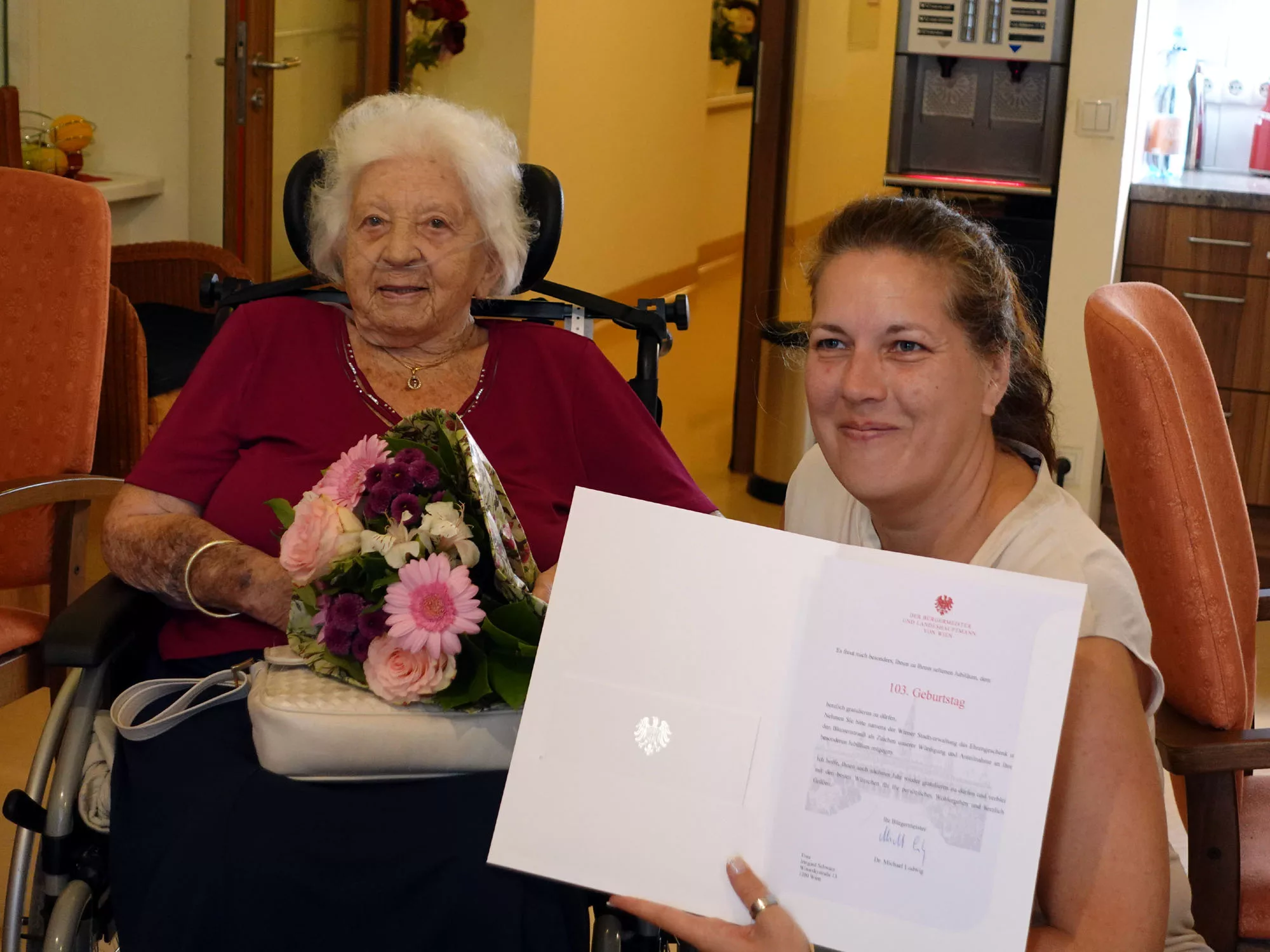 Vor ein paar Tagen feierte unsere Bewohnerin Irmgard Schwarz ihren 103. Geburtstag. Heute wurde nachgefeiert, denn sie erhielt Besuch von Bezirksvorsteherin Christina Dubravac-Widholm und Bezirksrat Flo Winkler, welche die obligatorischen Glückwünsche des Herrn Bürgermeisters überbrachten. Eine gute Stunde plauderten wir mit Frau Schwarz und lauschten gespannt den interessanten Erzählungen aus ihrem Leben.