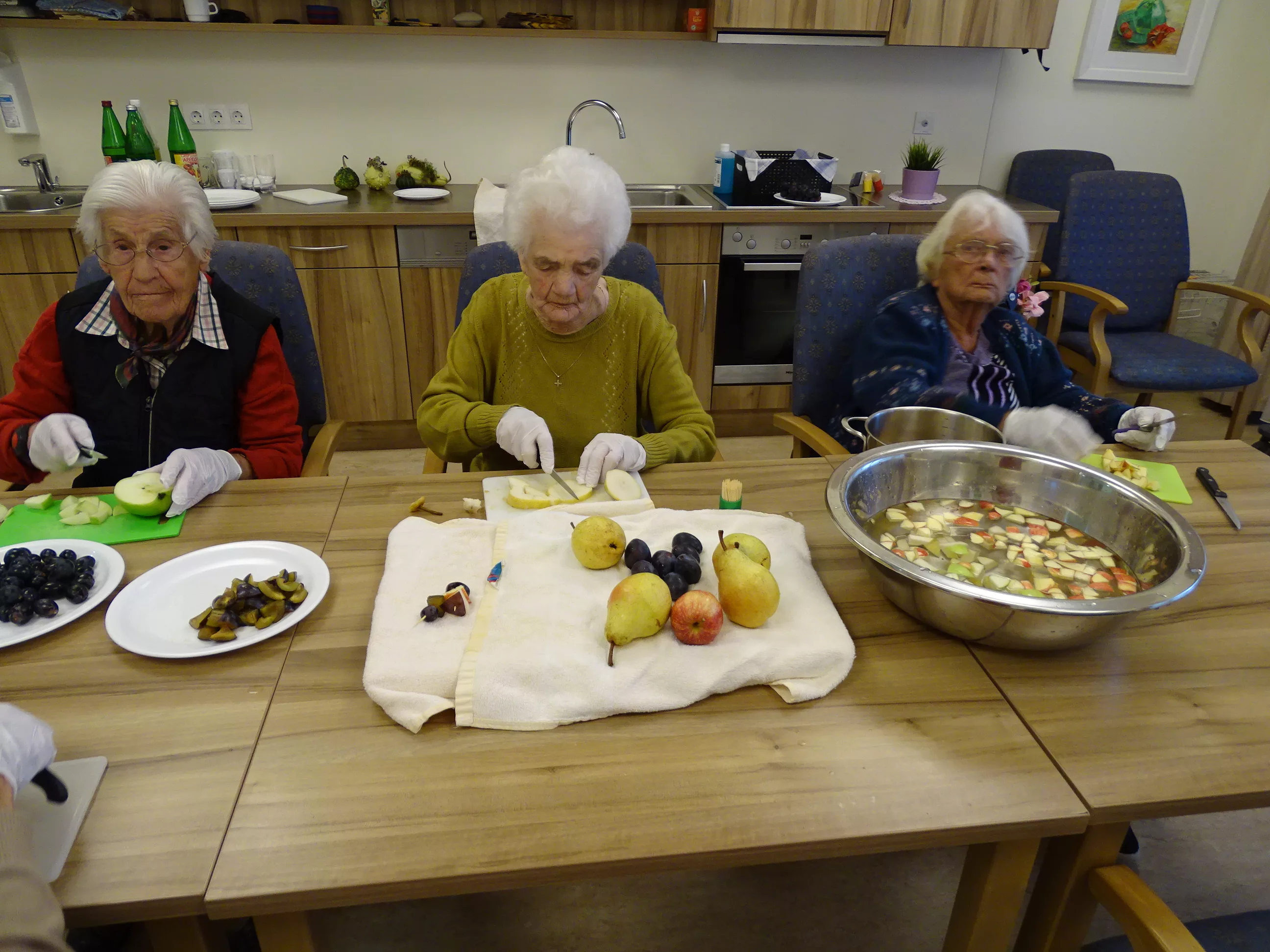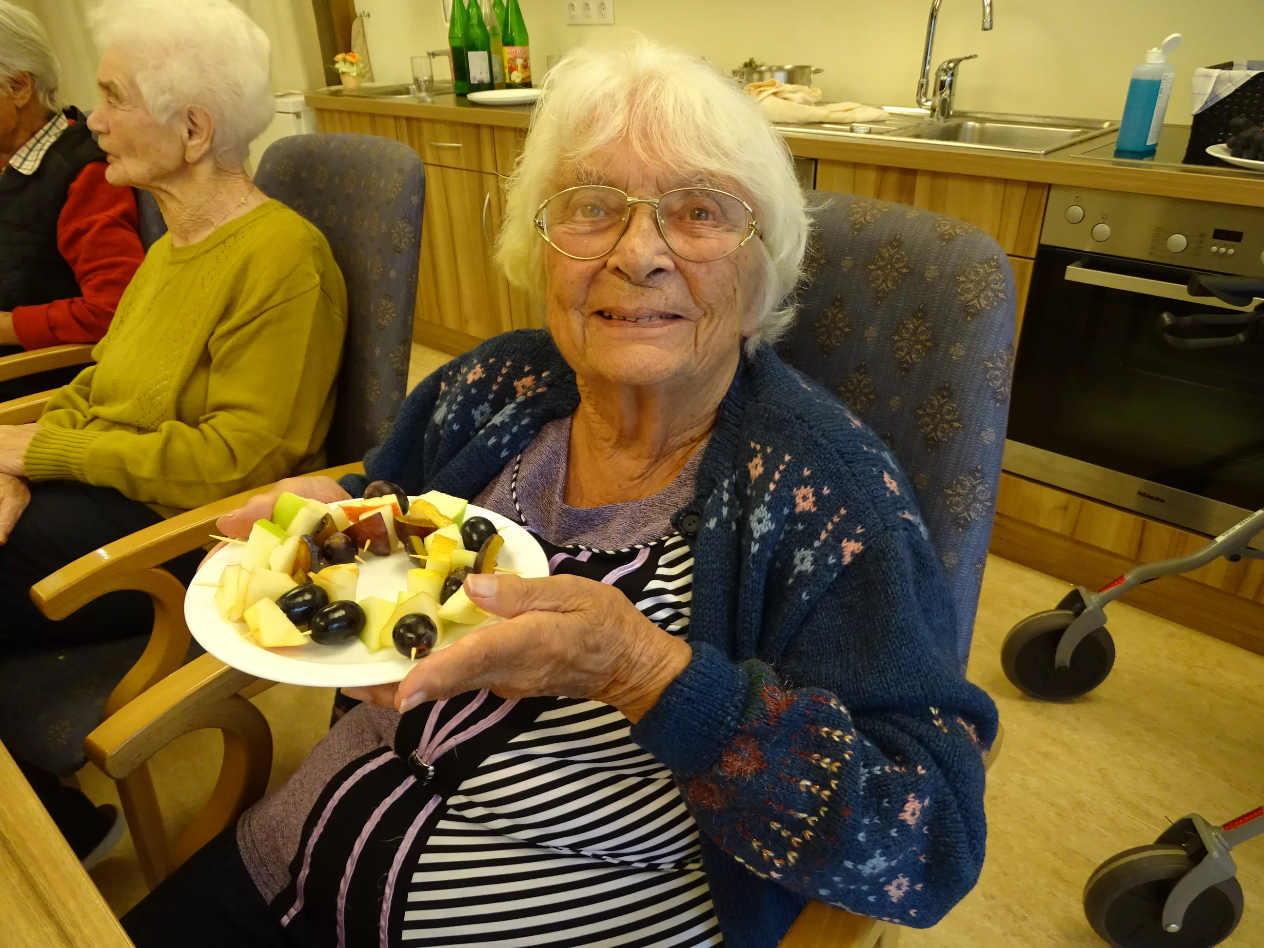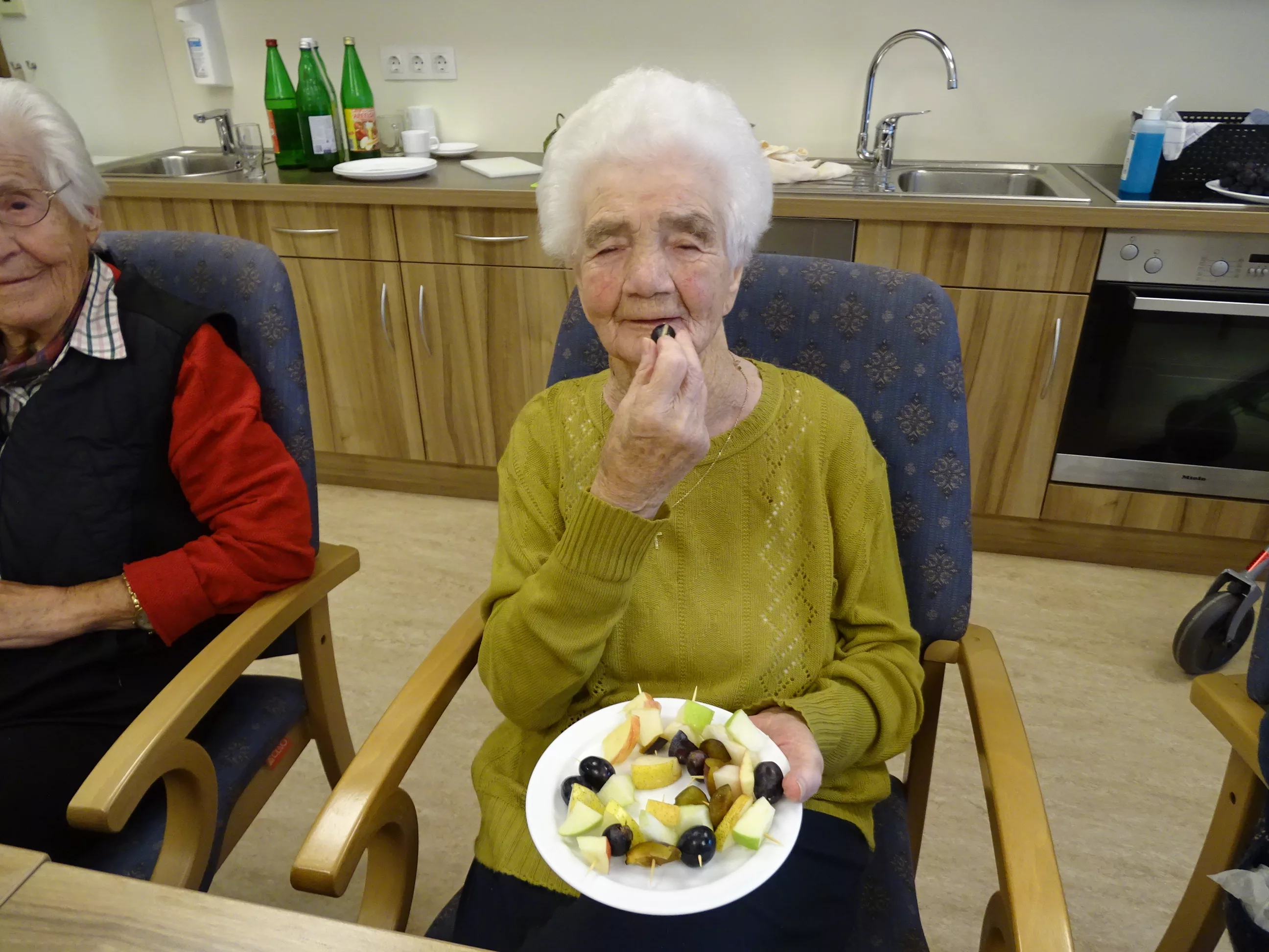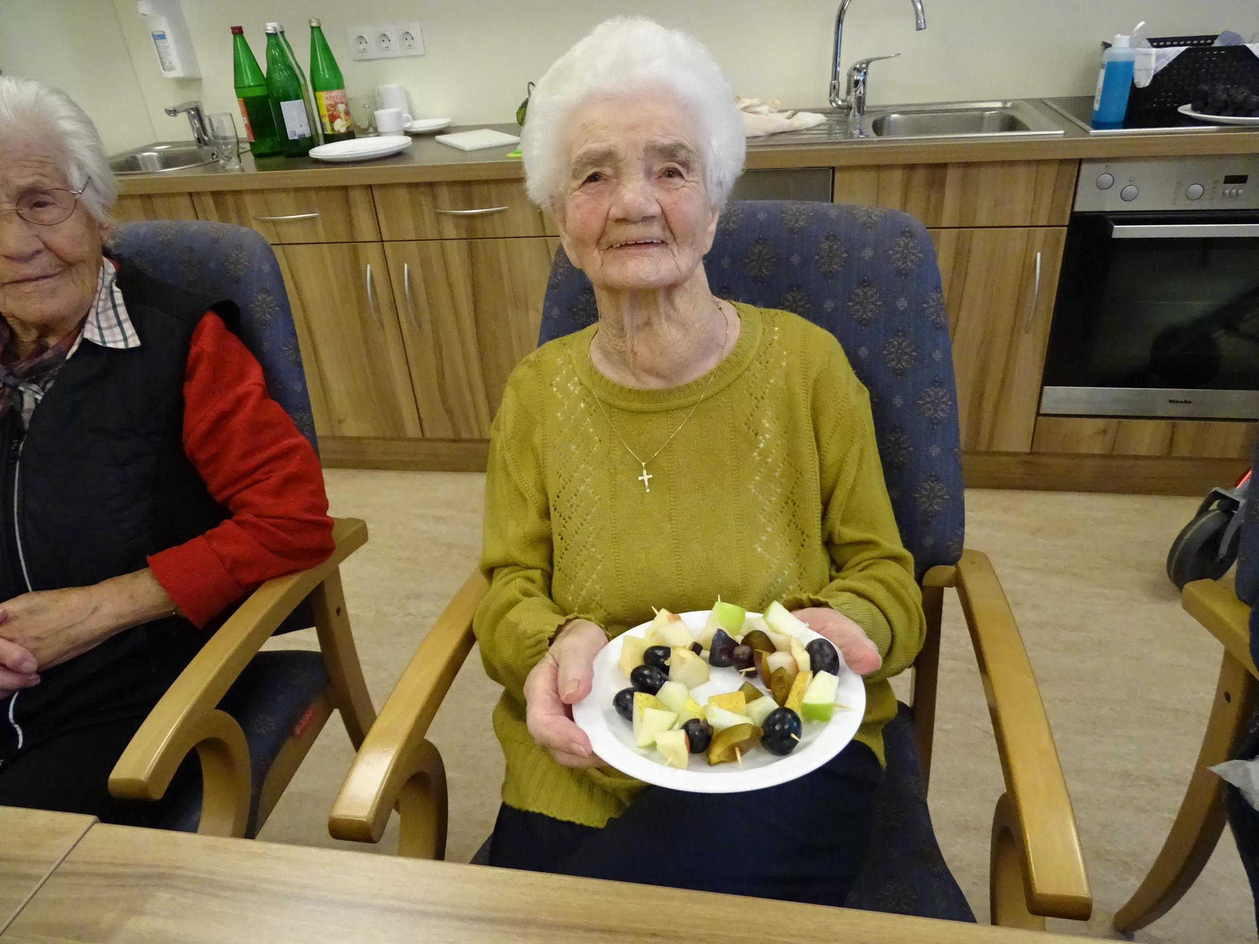 Nach der Speisensegnung bekamen wir alle ein Stück Brot , am Nachmittag bereiteten wir Obstspieße mit unseren BewohnerInnen vor, welche wir mit dem gesegnetem Most und Apfelsaft und gemütlichen Beisammensein genossen.
