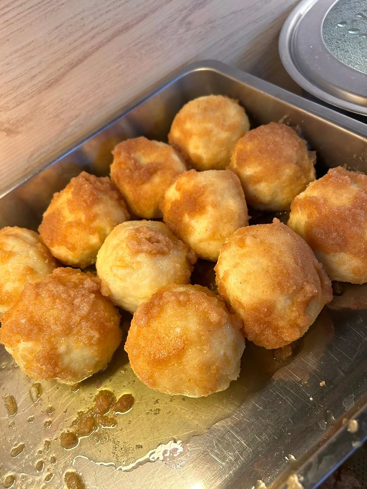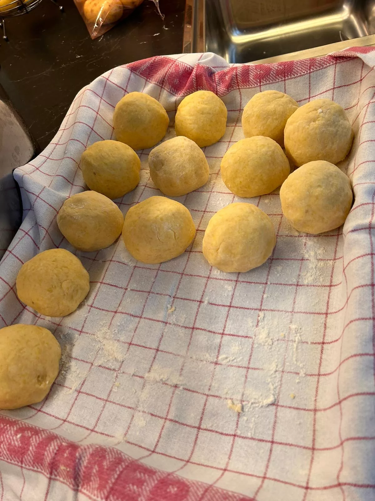Die Knödel machten sie, wie es früher üblich war, aus Kartoffelteig und wälzten dies anschließend in Butter-Zimt-Zuckerbrösel. Viele fleißige Hände halfen, damit sie dieses köstliche Essen genießen konnten.