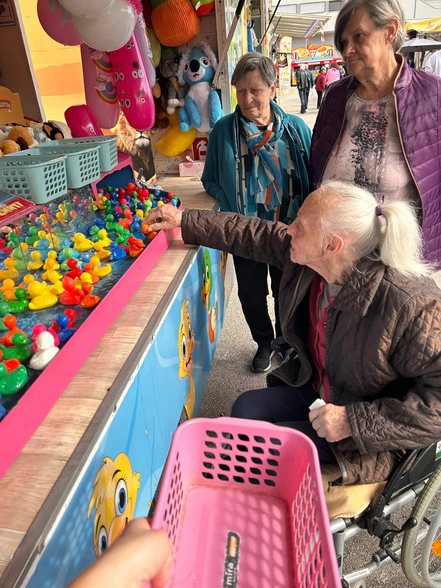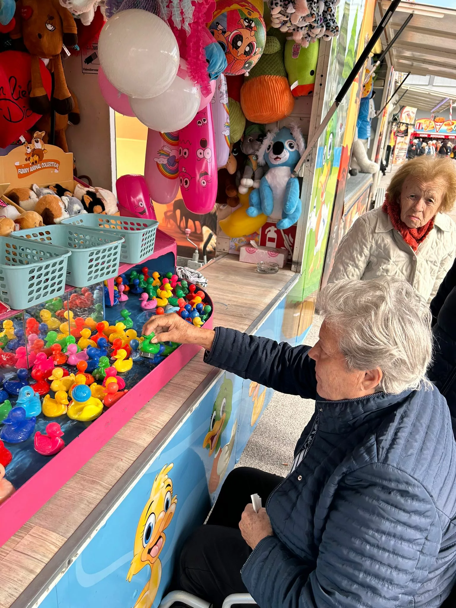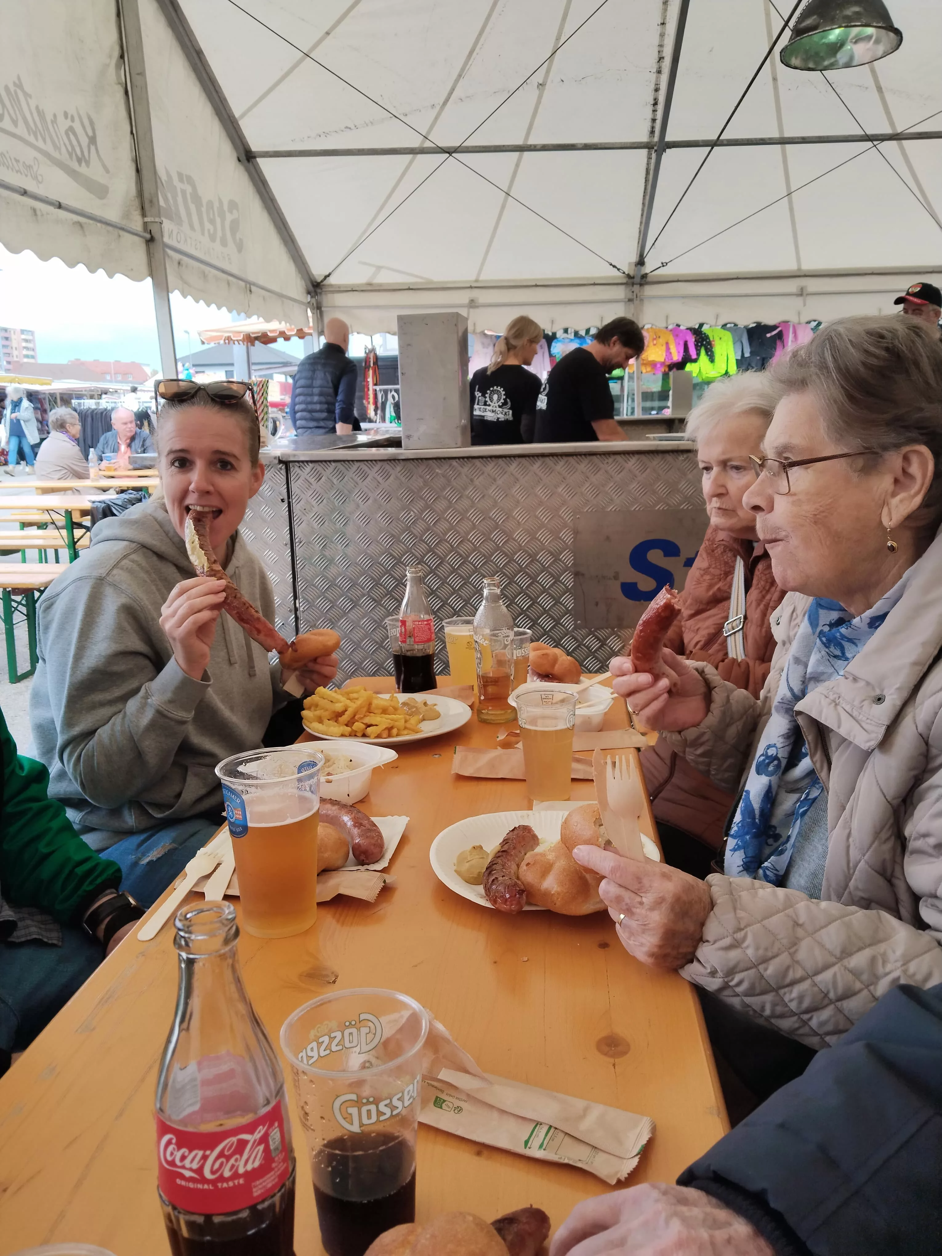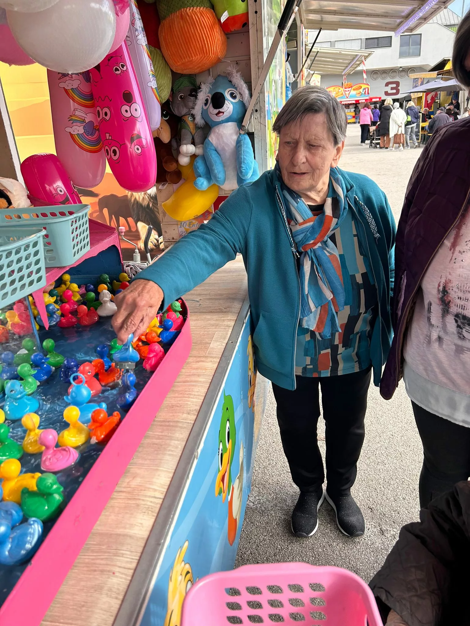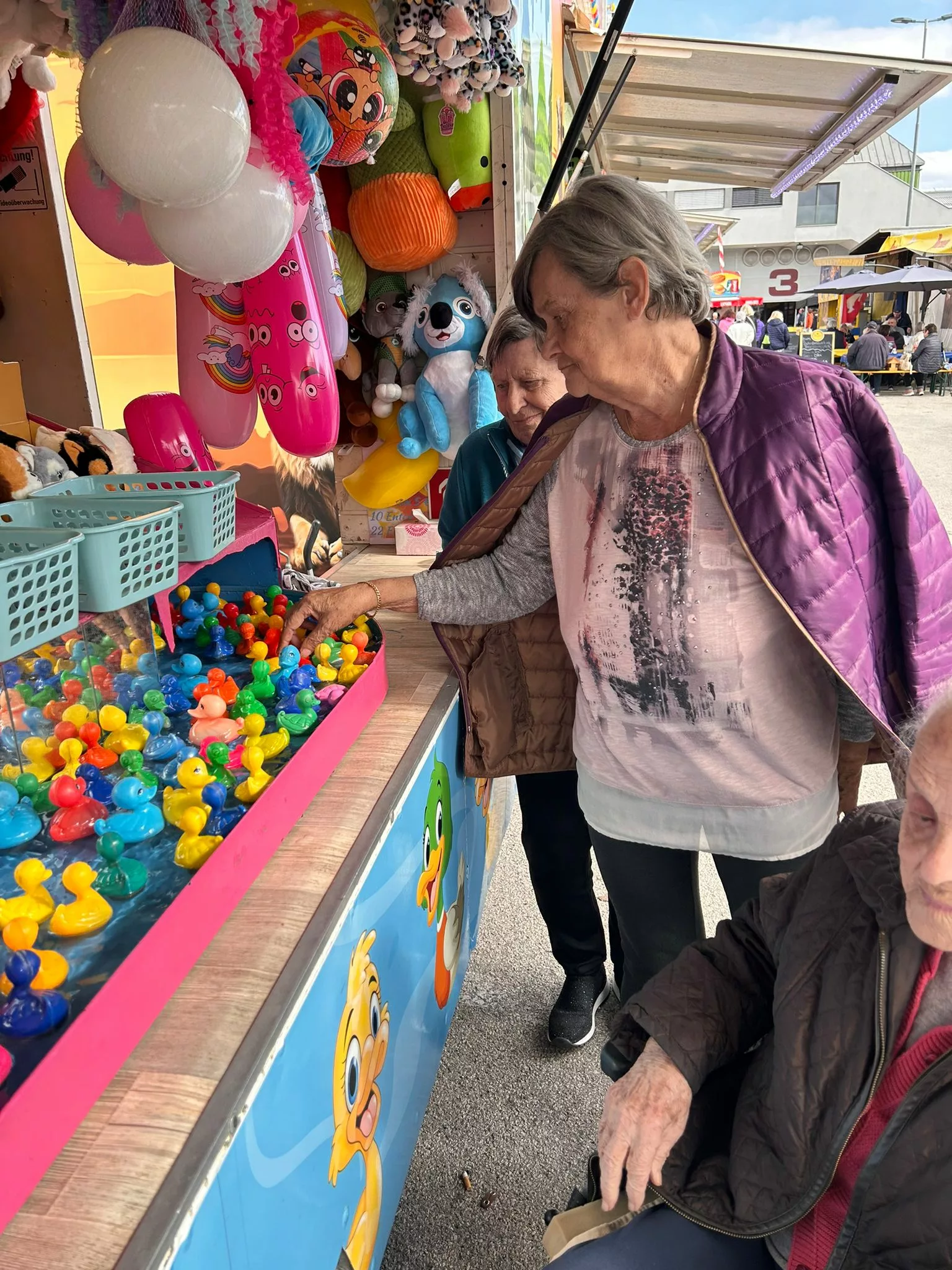 Mittagessen gingen wir zum Jammer am Messegelände und der Großteil freute sich auf ein frisches Wiener mit Pommes. Nach der Stärkung erkundeten wir den Markt genauer. Eine Runde Enten ziehen für alle durfte auch nicht fehlen. Wir gewannen einen riesigen Stofftier-Affen. Frau Ogris und Herr Samitz passten abwechselnd darauf auf.
