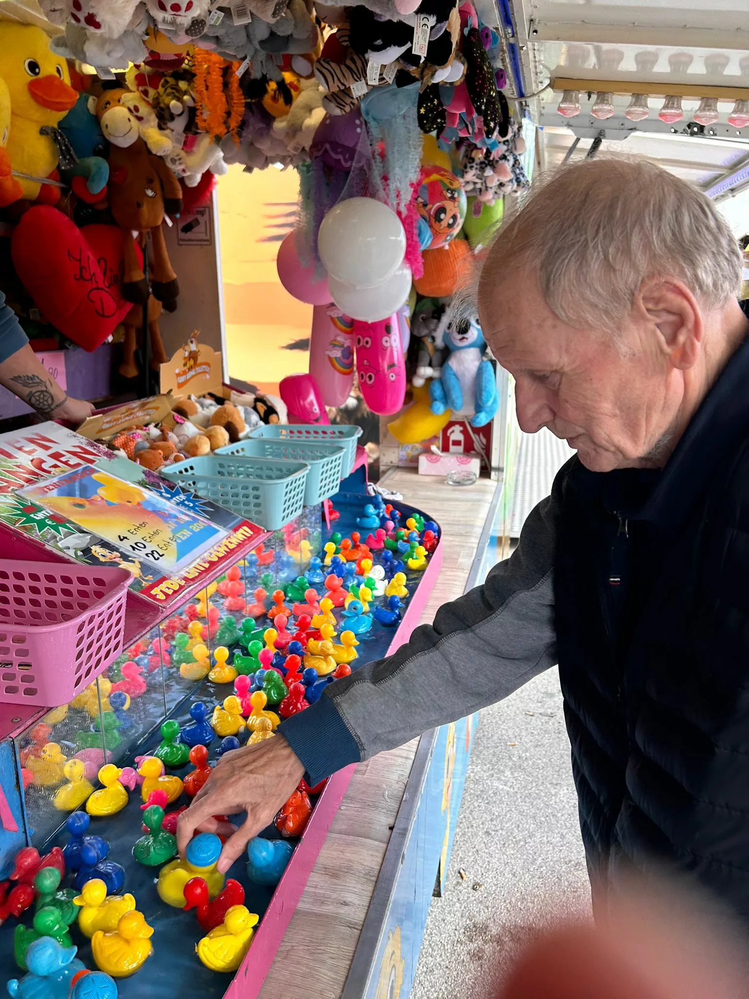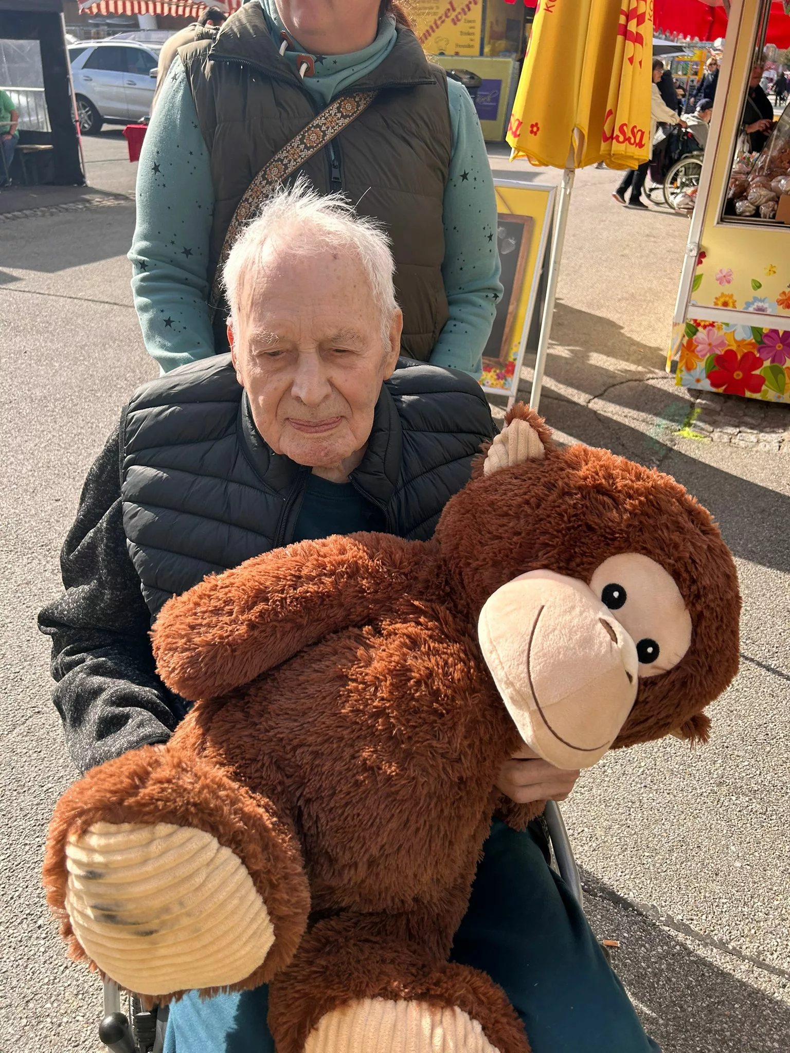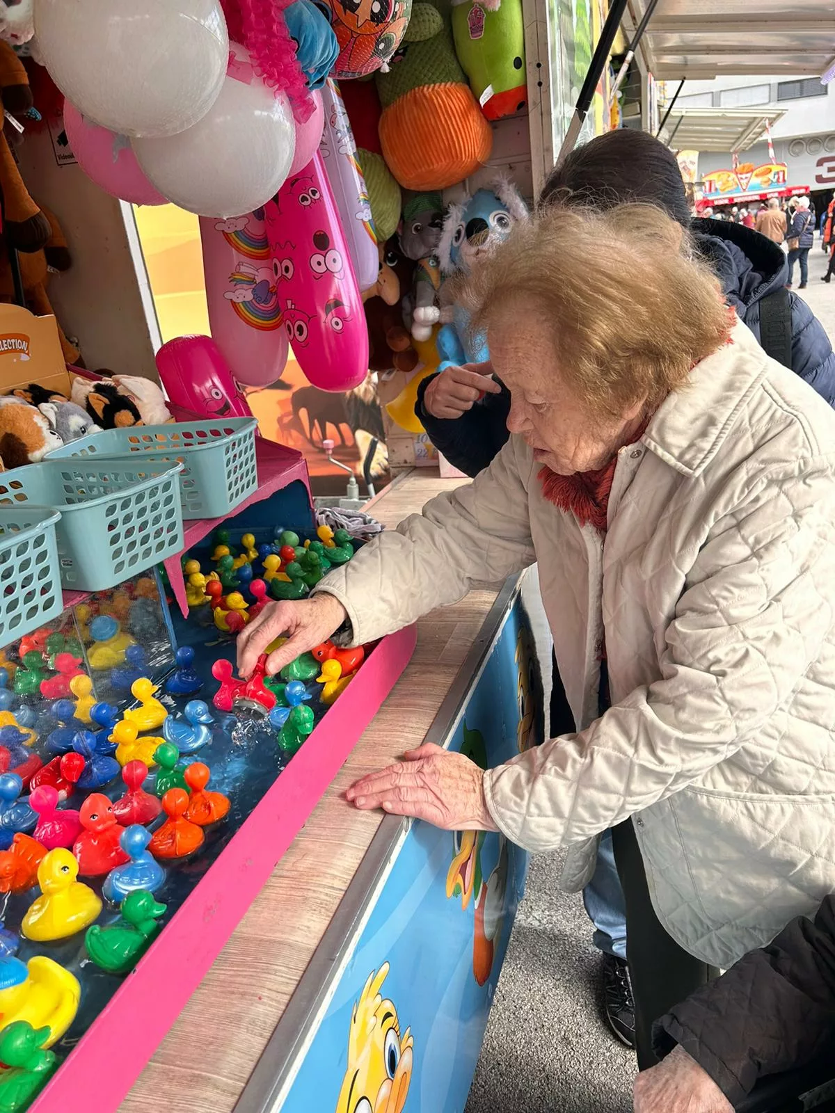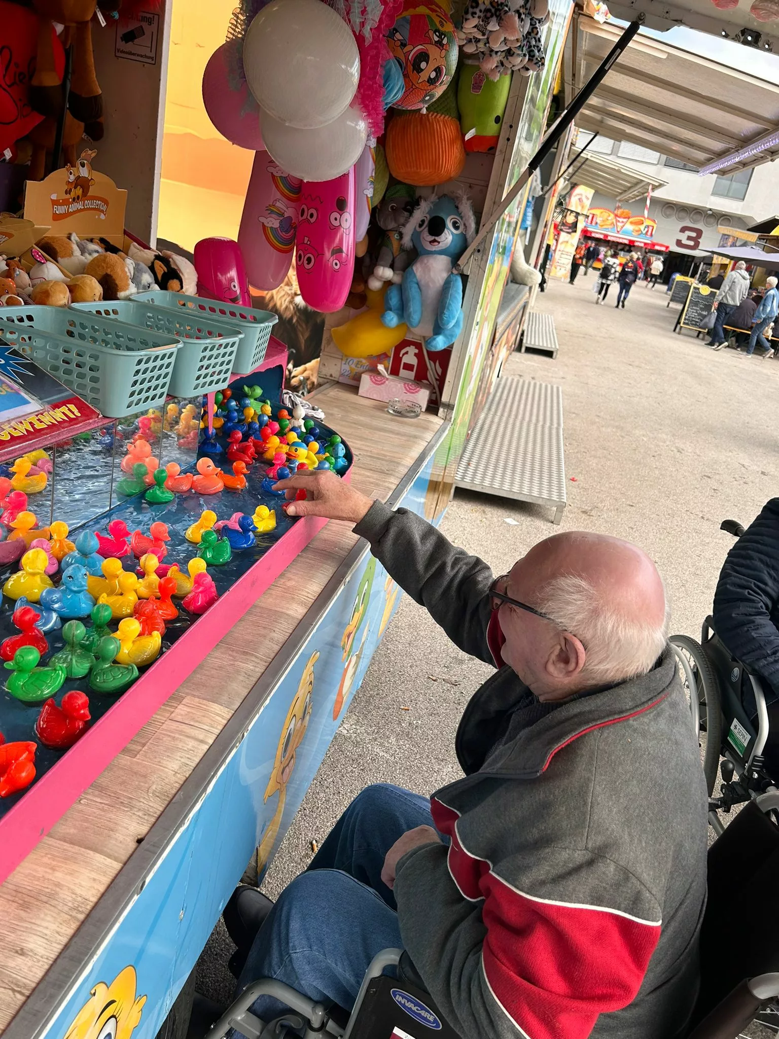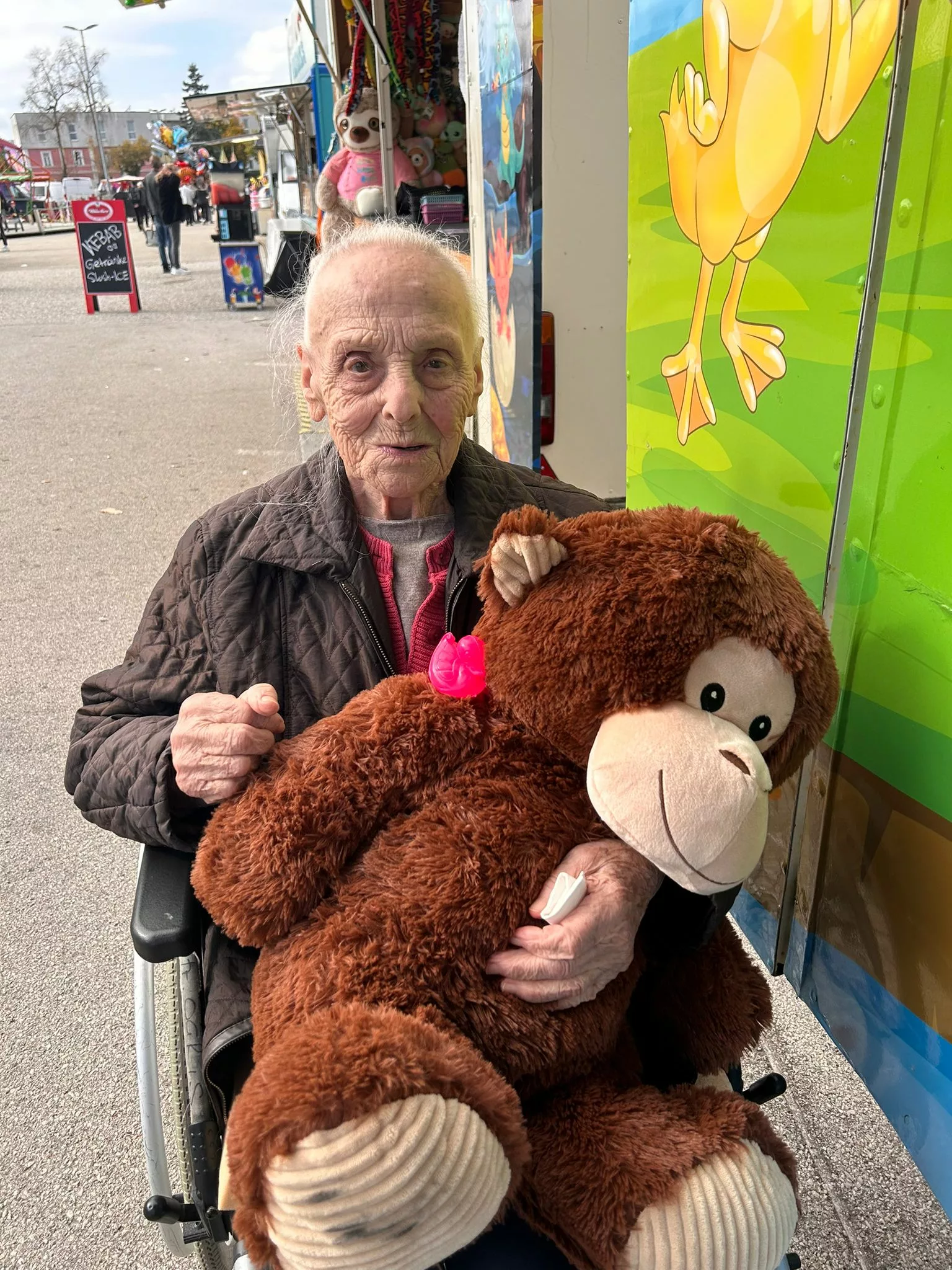 Mittagessen gingen wir zum Jammer am Messegelände und der Großteil freute sich auf ein frisches Wiener mit Pommes. Nach der Stärkung erkundeten wir den Markt genauer. Eine Runde Enten ziehen für alle durfte auch nicht fehlen. Wir gewannen einen riesigen Stofftier-Affen. Frau Ogris und Herr Samitz passten abwechselnd darauf auf.
