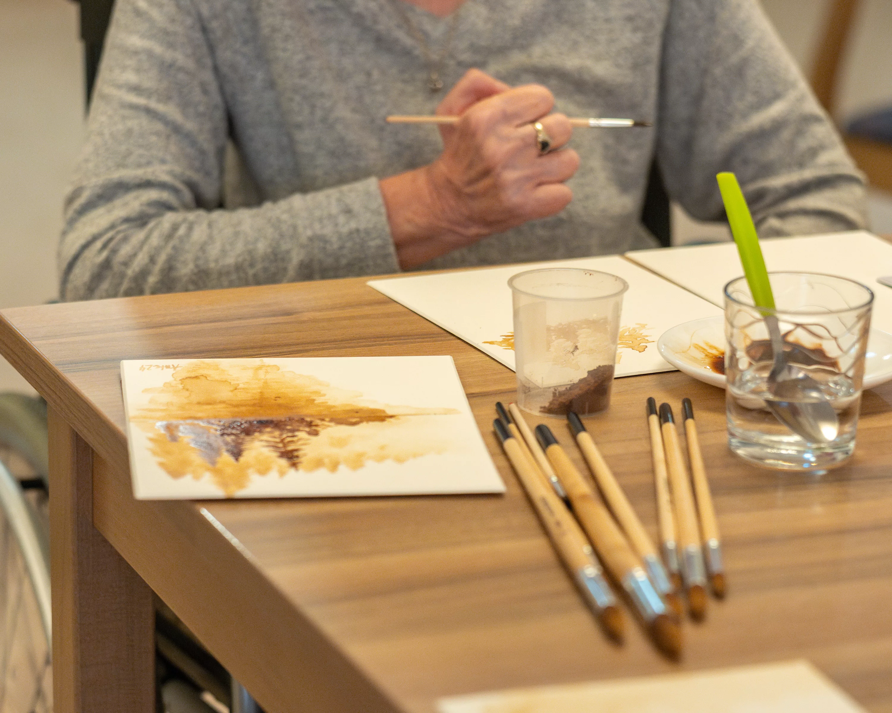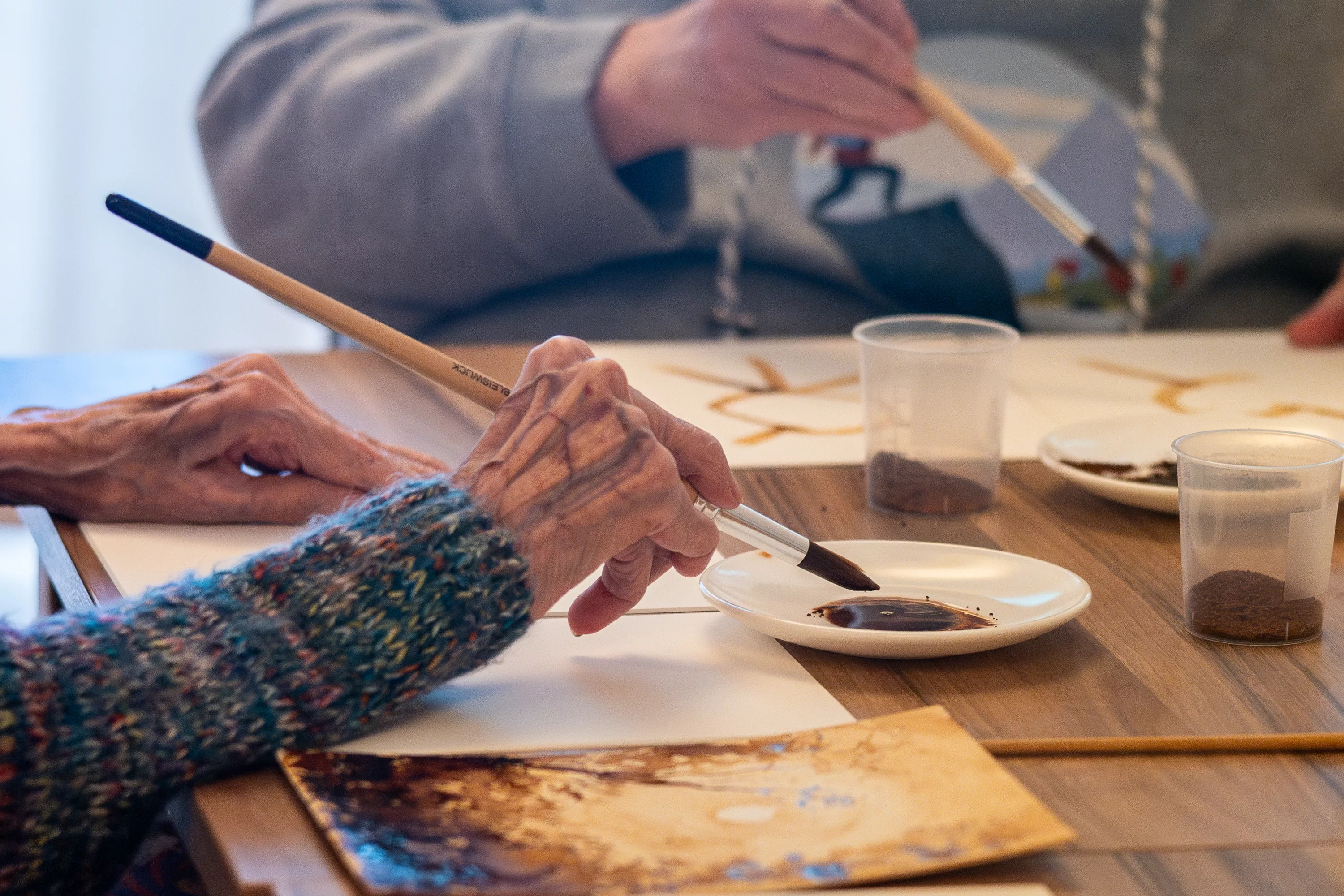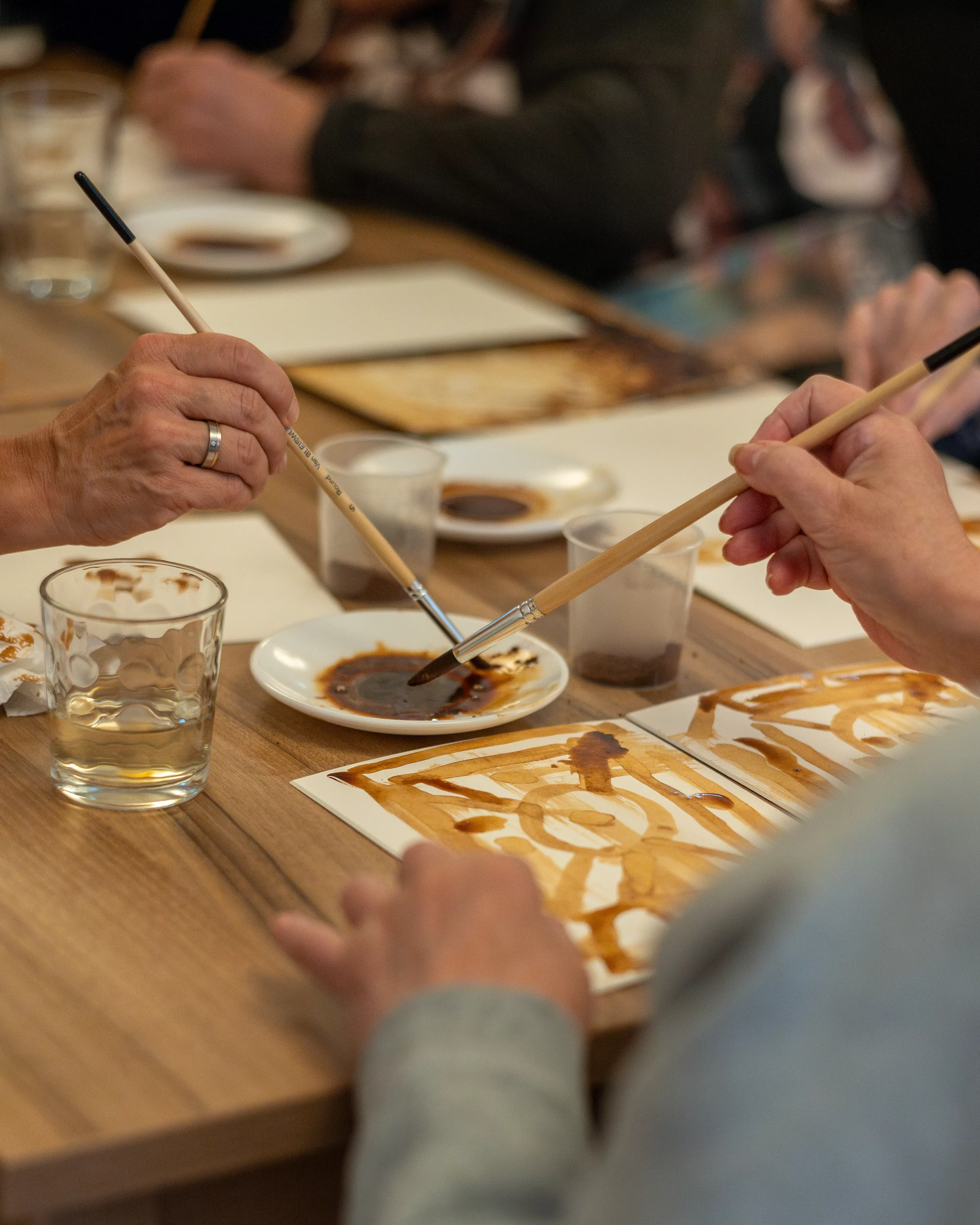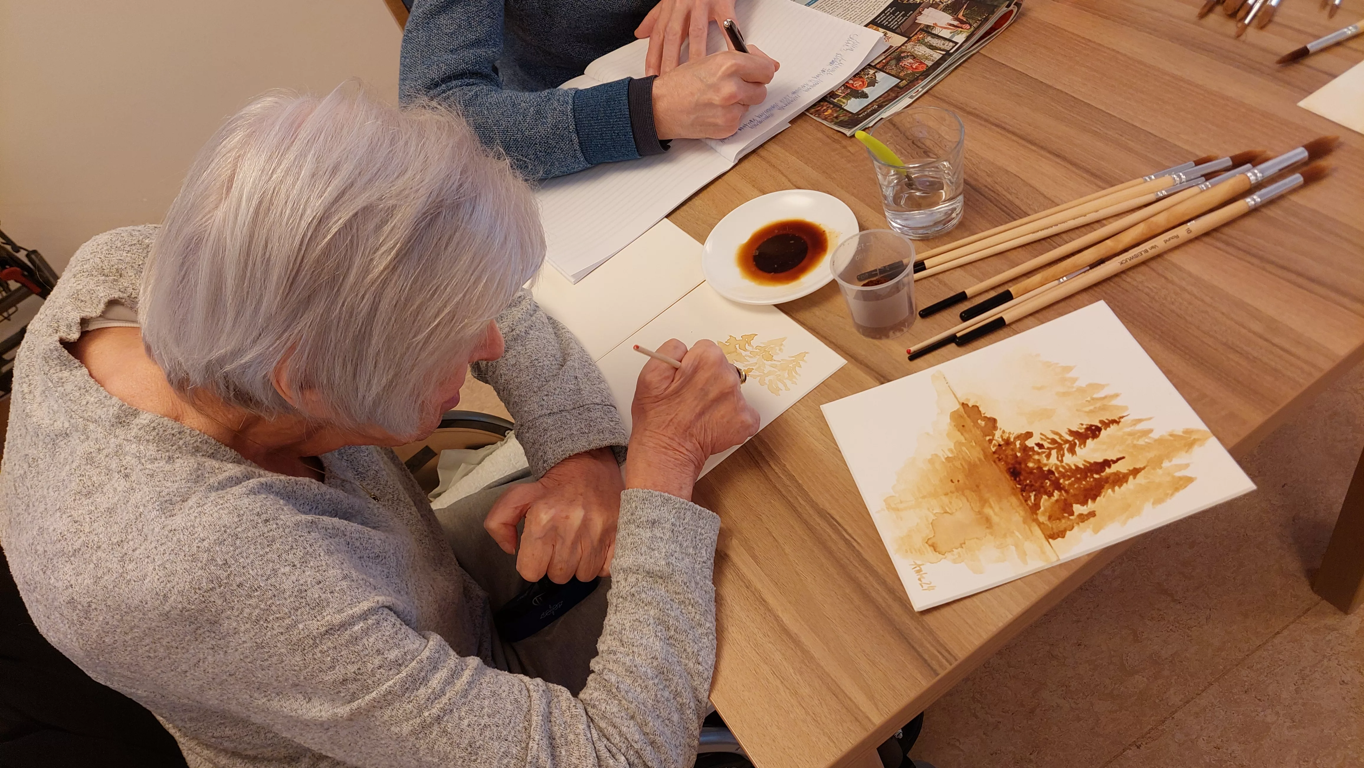 Anschließend durften die TeilnehmerInnen selbst kreativ werden und mit Kaffee auf Pappe malen. Die Technik erinnerte sie ein wenig an Wasserfarben, doch der Duft des frisch angerührten Kaffees und die ungewöhnliche Farbe machten das Malen zu einem besonderen Erlebnis. Während des gesamten Workshops wurde viel gelacht, erzählt und an persönliche Erlebnisse angeknüpft. Die entspannte Atmosphäre bot viel Raum für Gespräche und kreative Entfaltung.