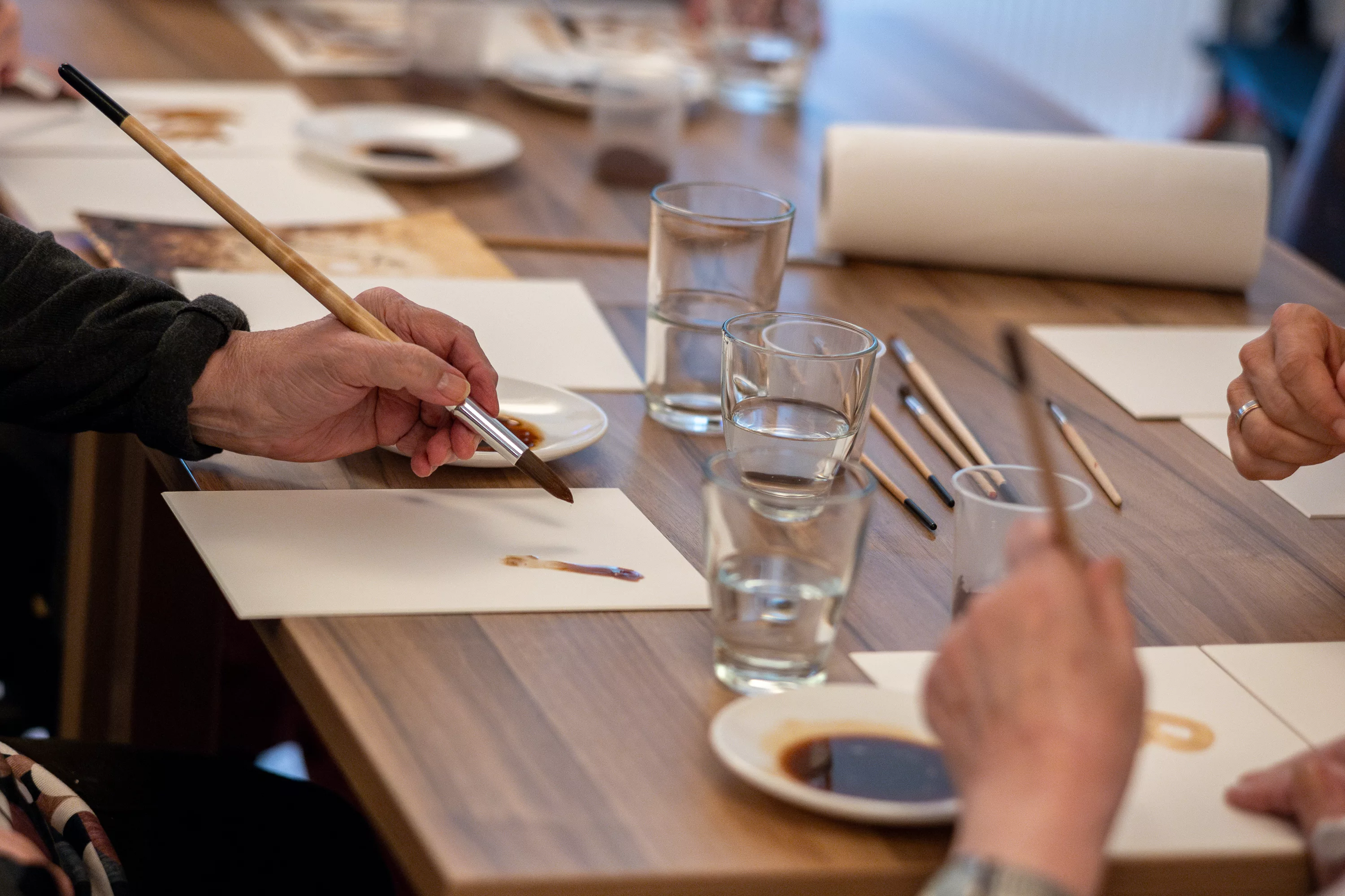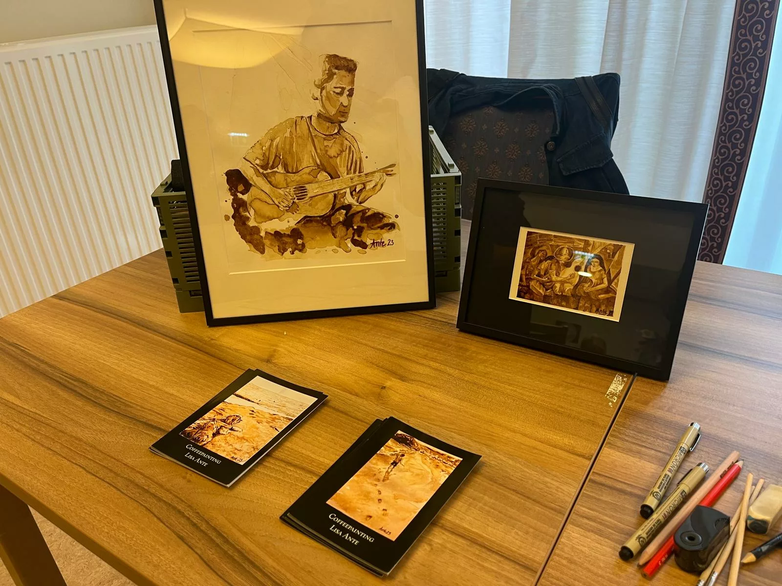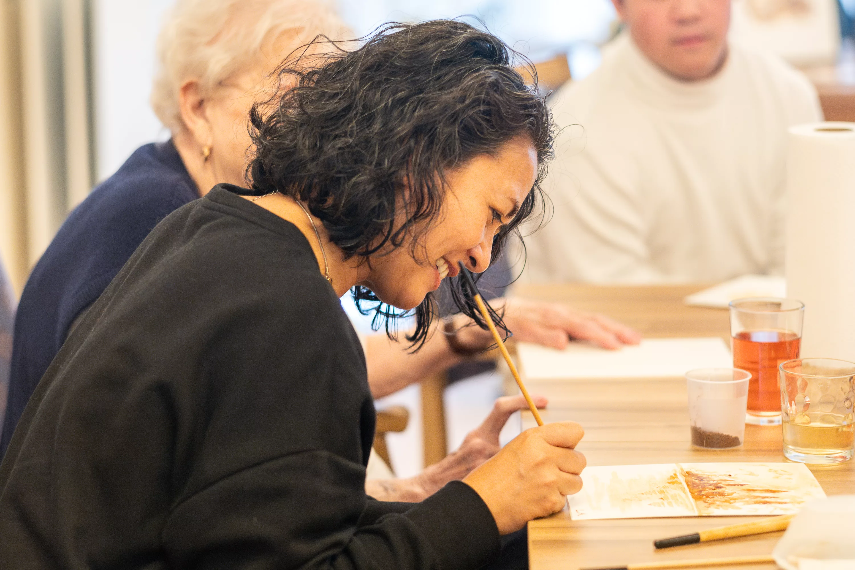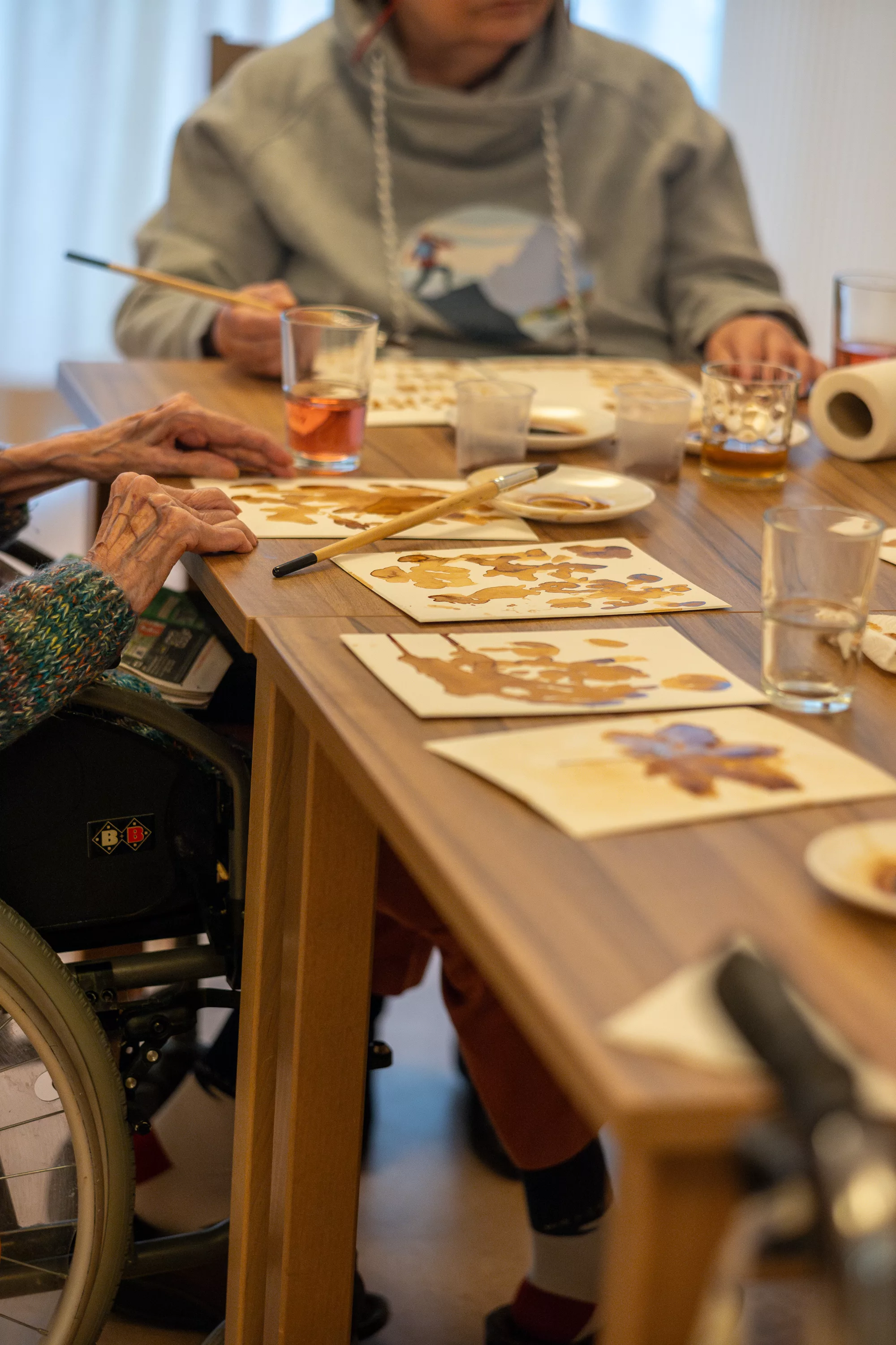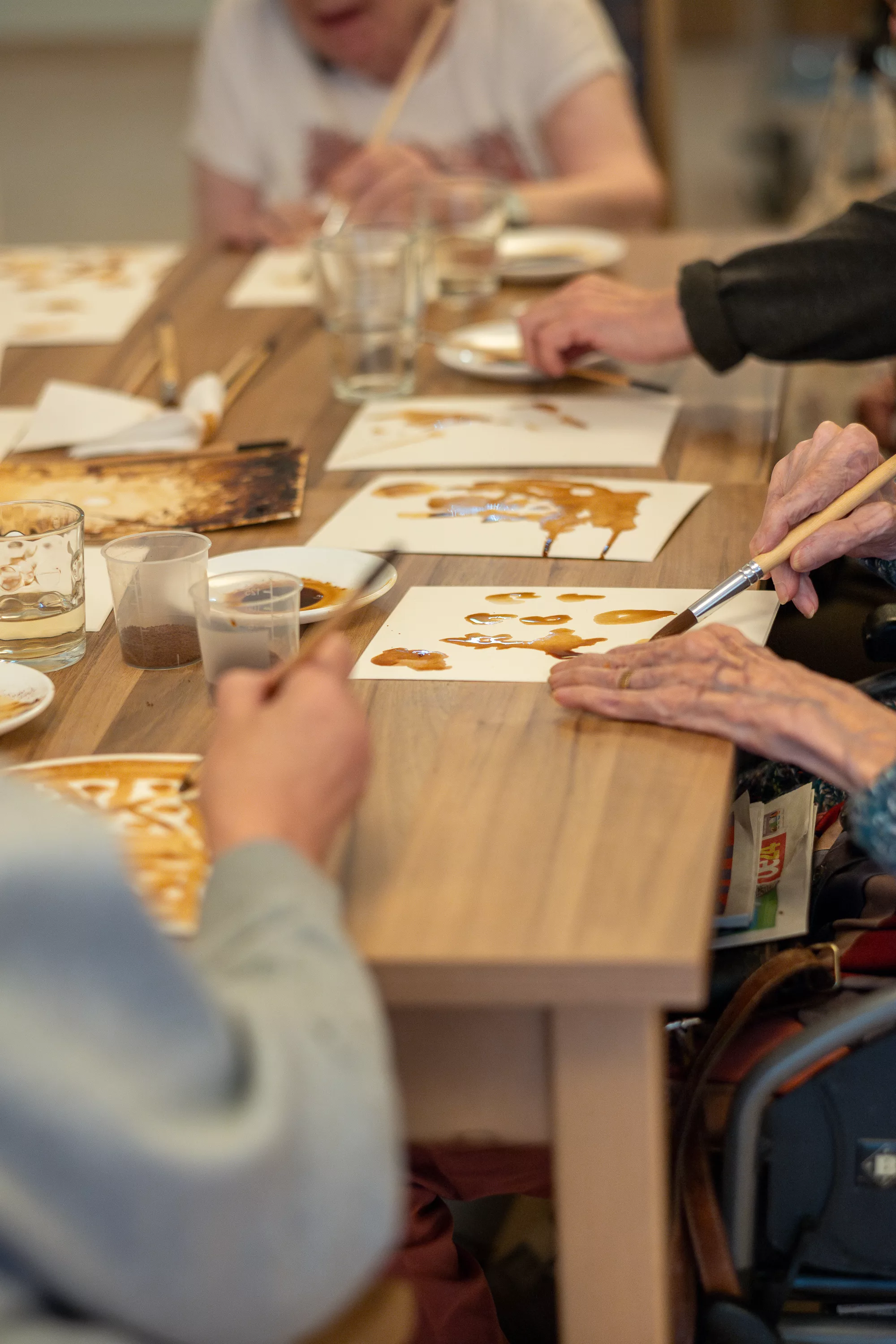 Anschließend durften die TeilnehmerInnen selbst kreativ werden und mit Kaffee auf Pappe malen. Die Technik erinnerte sie ein wenig an Wasserfarben, doch der Duft des frisch angerührten Kaffees und die ungewöhnliche Farbe machten das Malen zu einem besonderen Erlebnis. Während des gesamten Workshops wurde viel gelacht, erzählt und an persönliche Erlebnisse angeknüpft. Die entspannte Atmosphäre bot viel Raum für Gespräche und kreative Entfaltung.