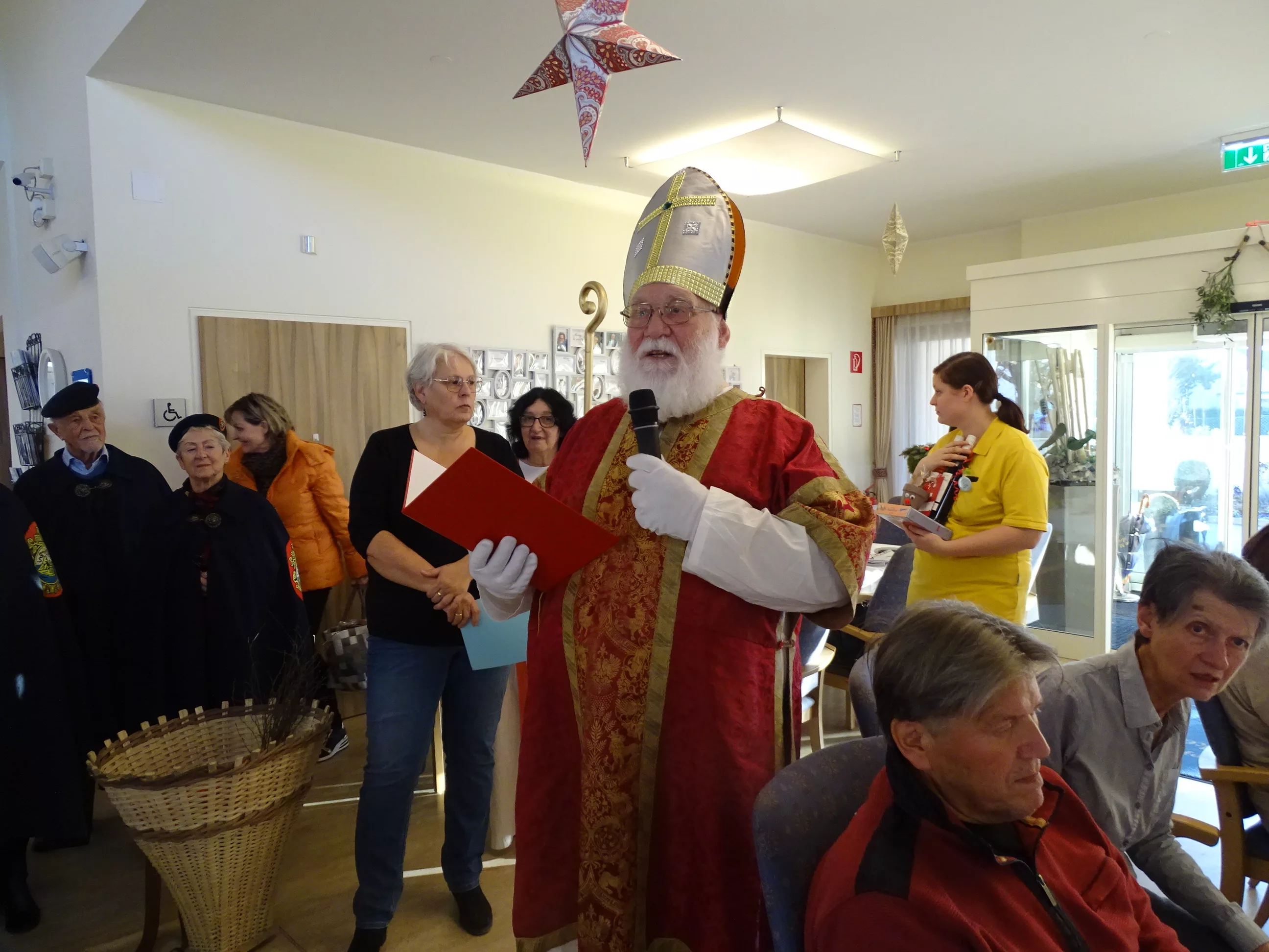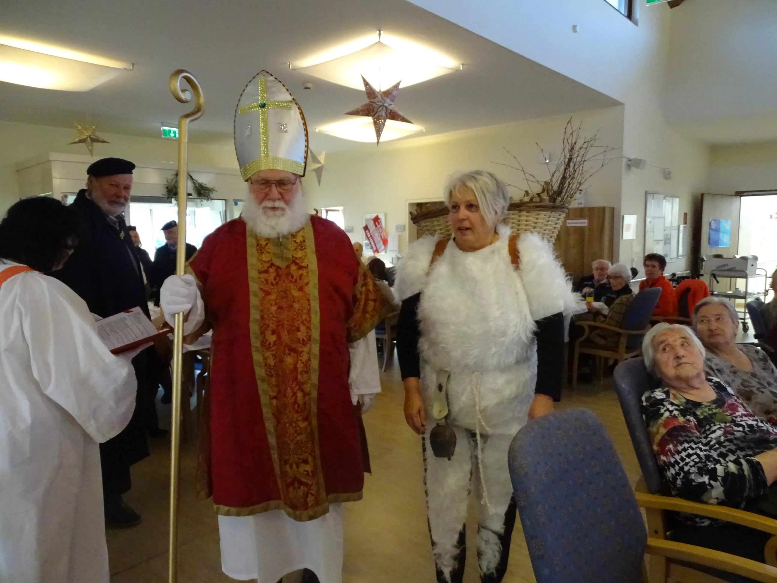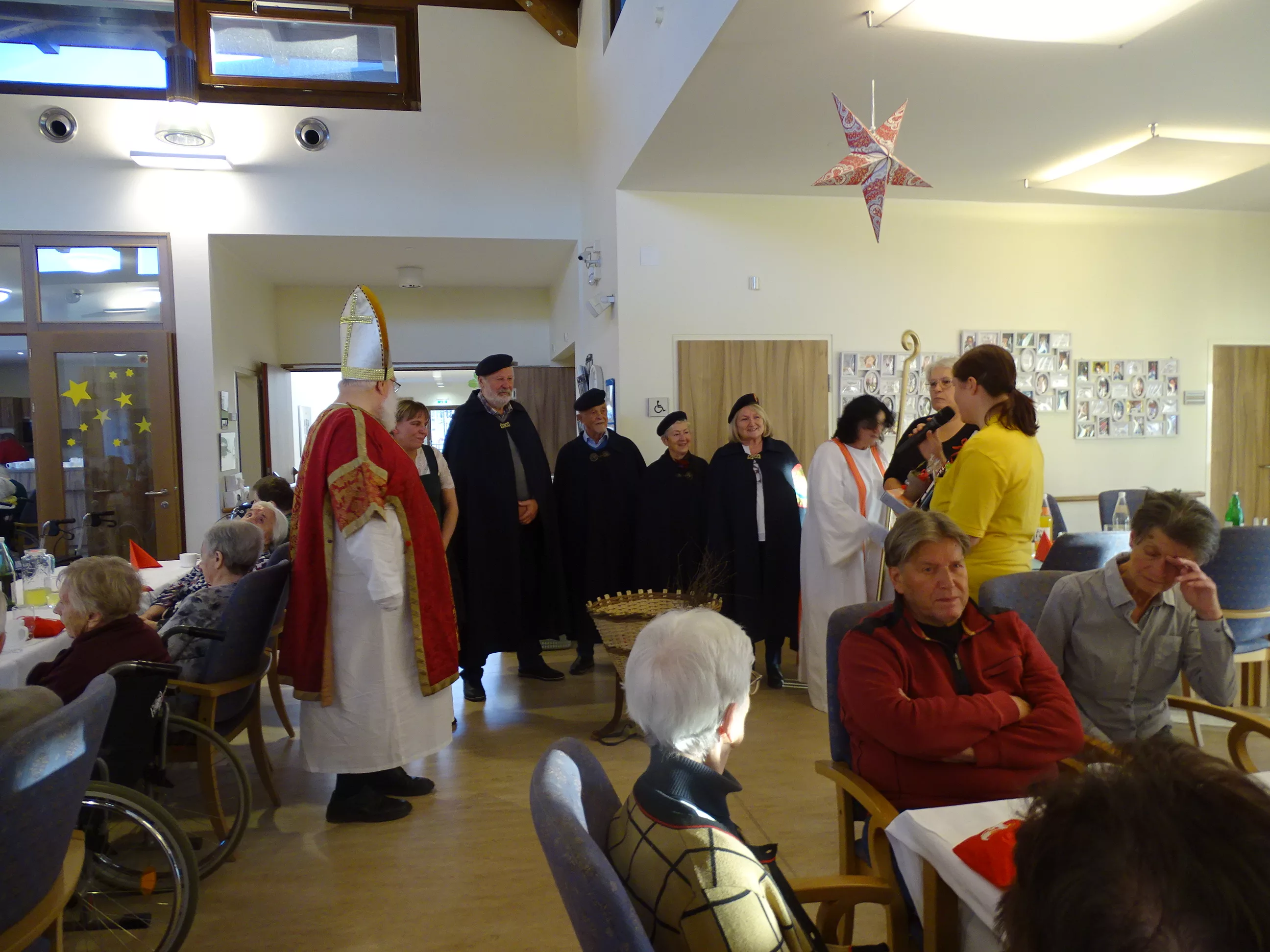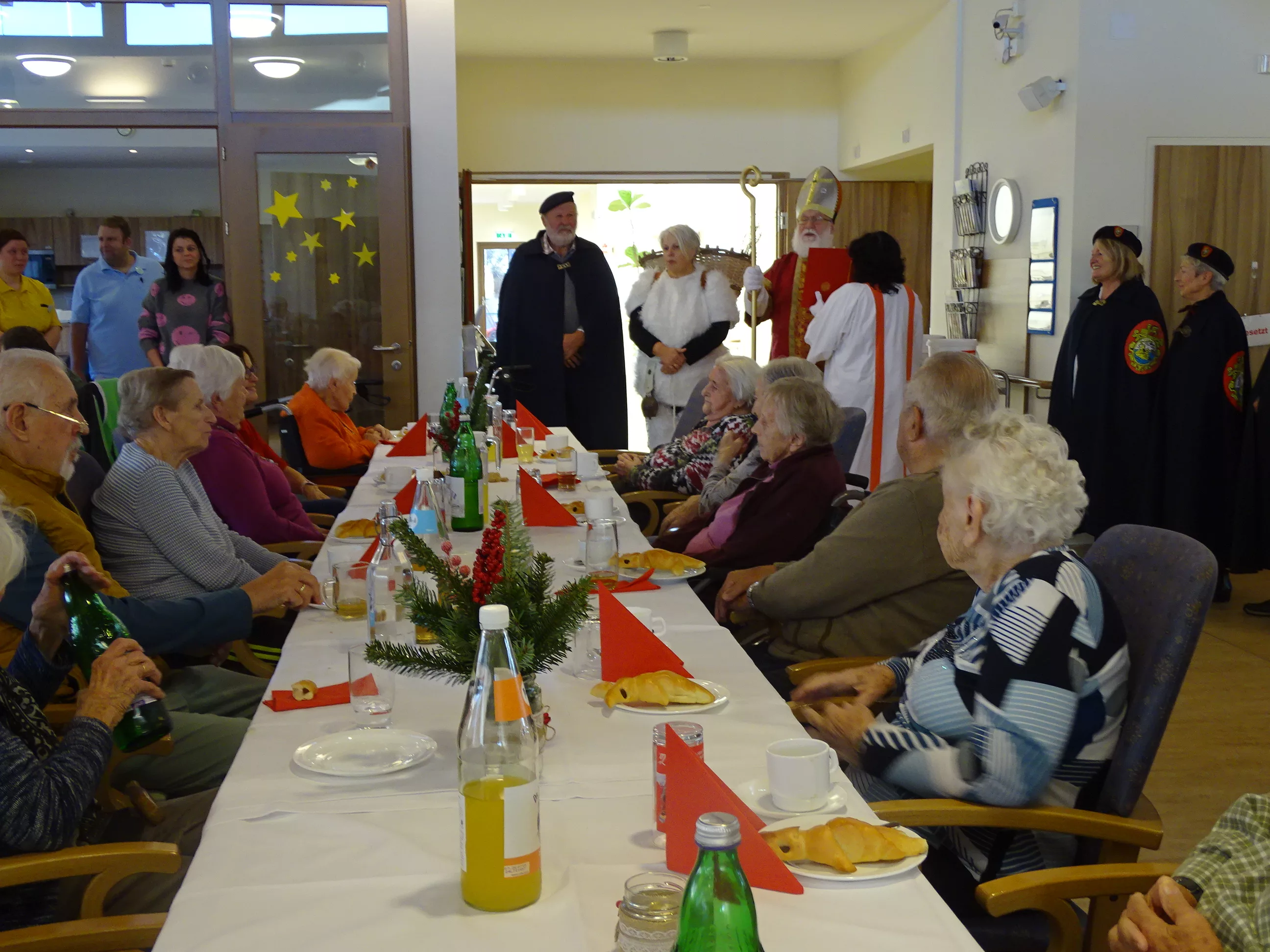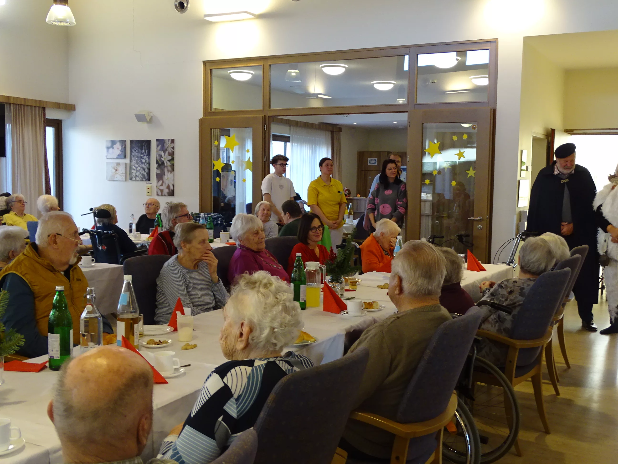Pünktlich am 05. Dezember bekamen wir hohen Besuch vom Nikolaus mit seinem Engerl, seinem Krampus und den RITTERN VON DELO! Unsere Sabine begleitet mit Ihrer Gitarre den Einzug des Nikolaus, mit wunderschönen Nikolaus- und Weihnachtsliedern umrahmte sie unsere Nikolausfeier! Unsere BewohnerInnen bekamen eine Krampus zur Jause und ein Packerl vom Nikolaus. Den Punsch und den Glühwein ließen wir uns schmecken. Es war ein schöner Nachmittag und die Augen unserer Bewohner strahlten um die Wette!