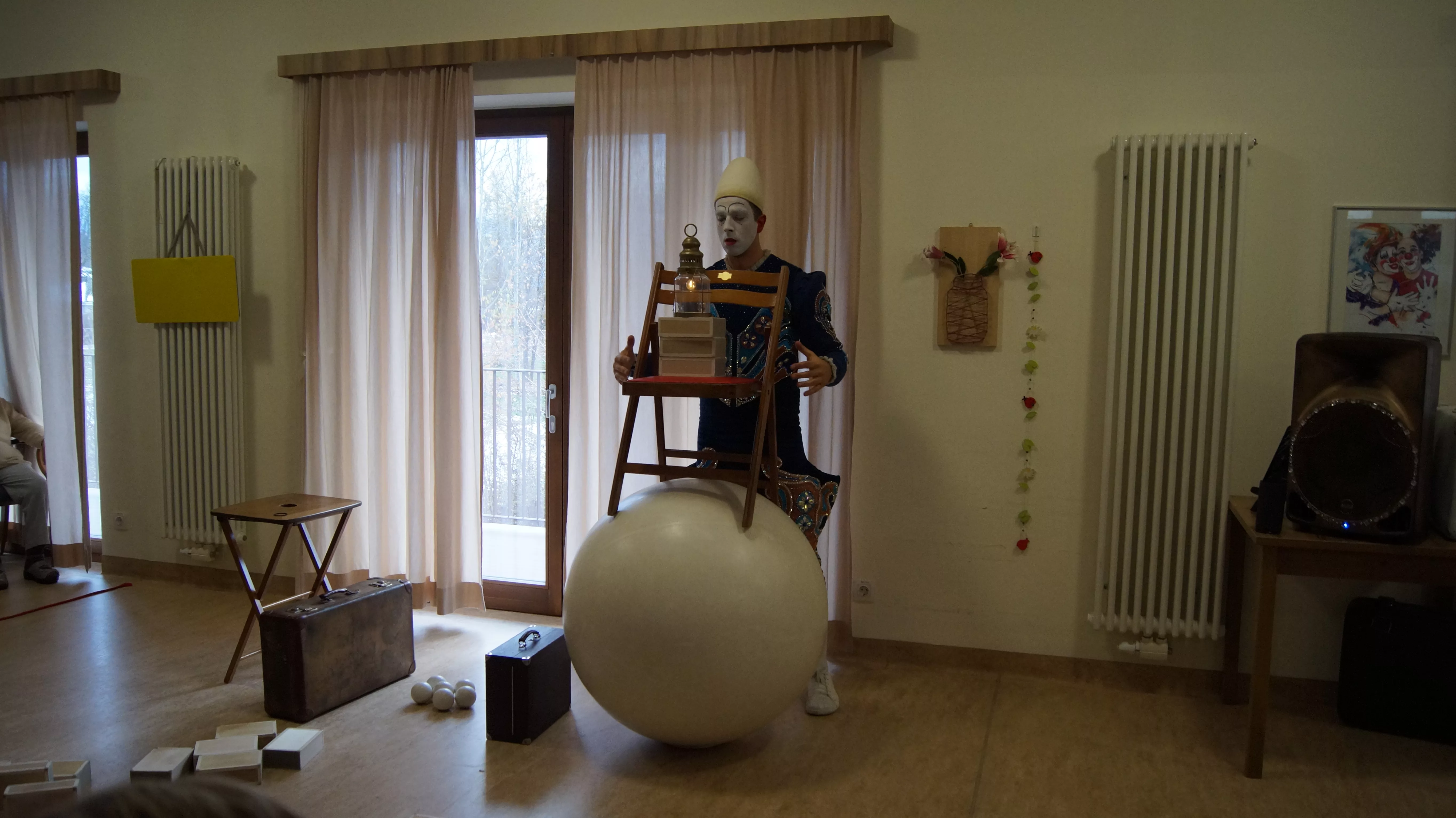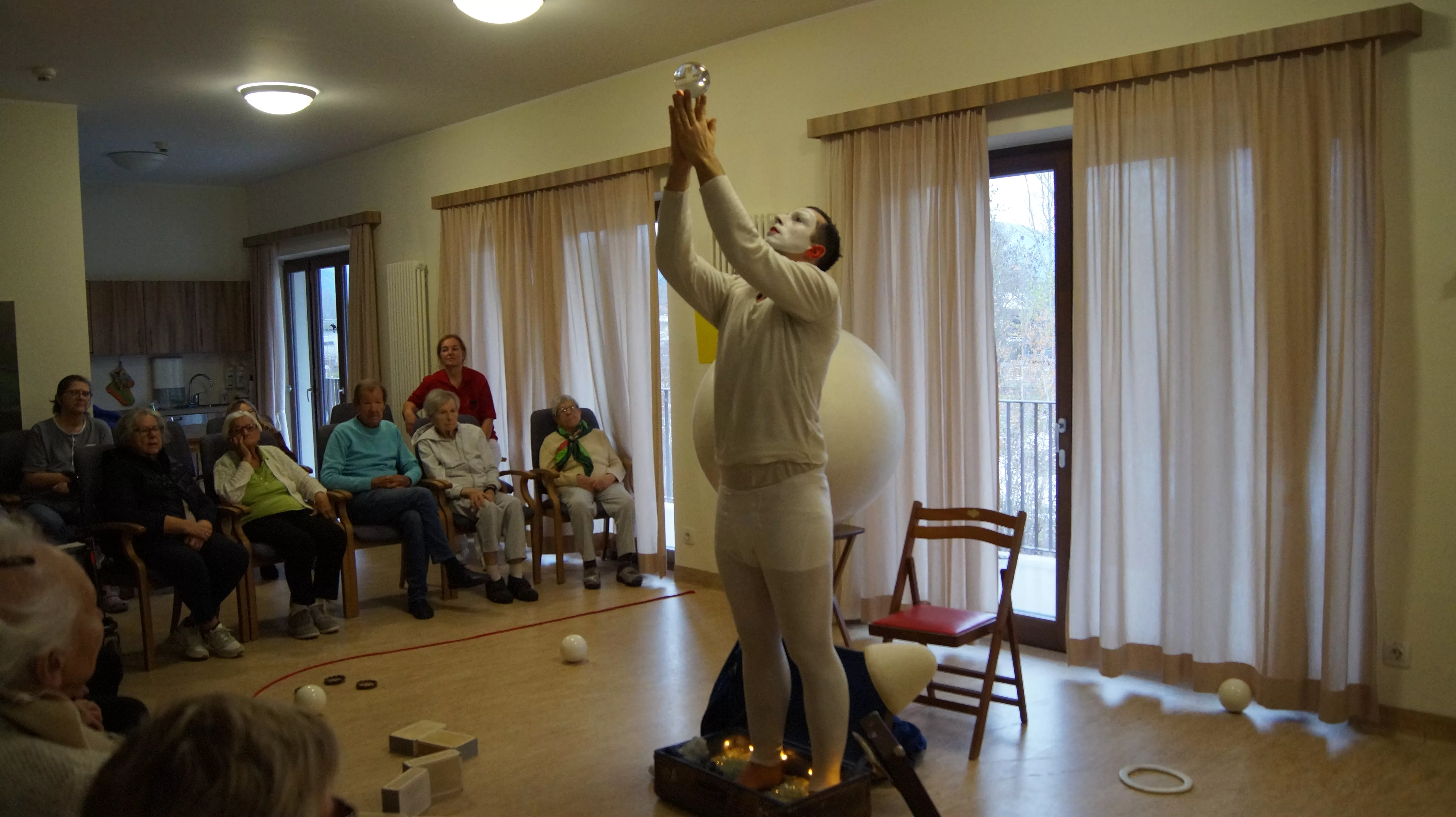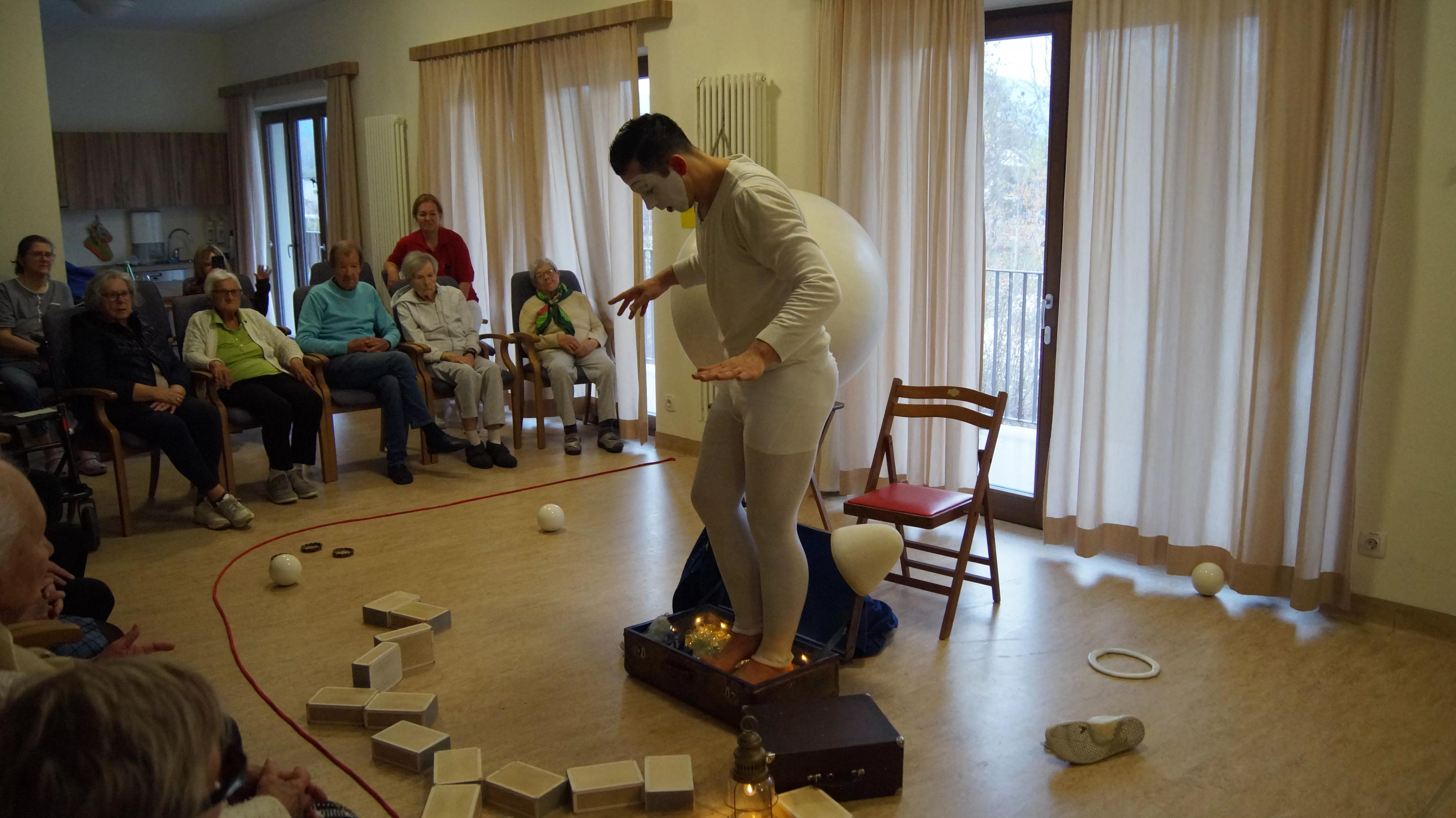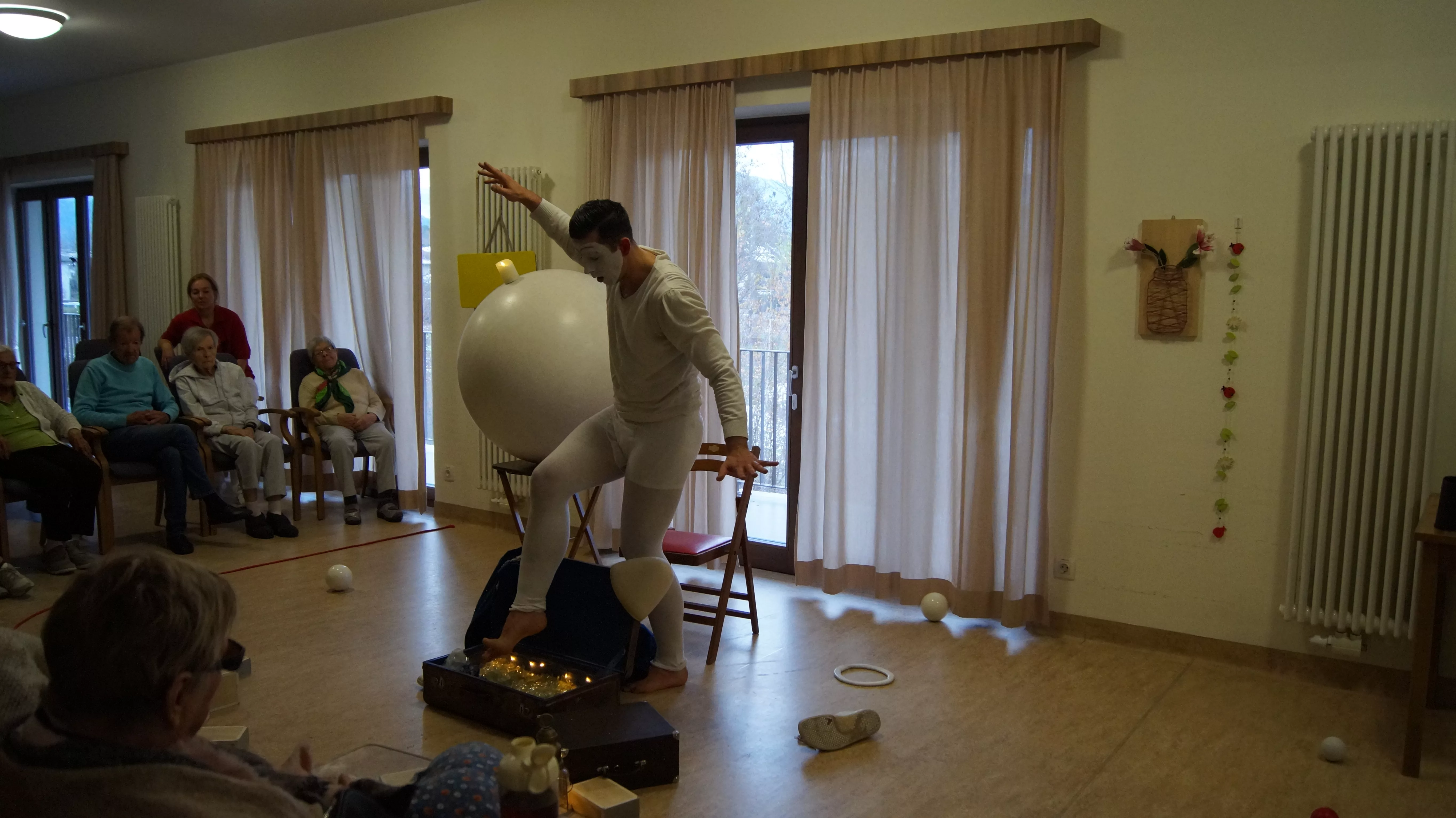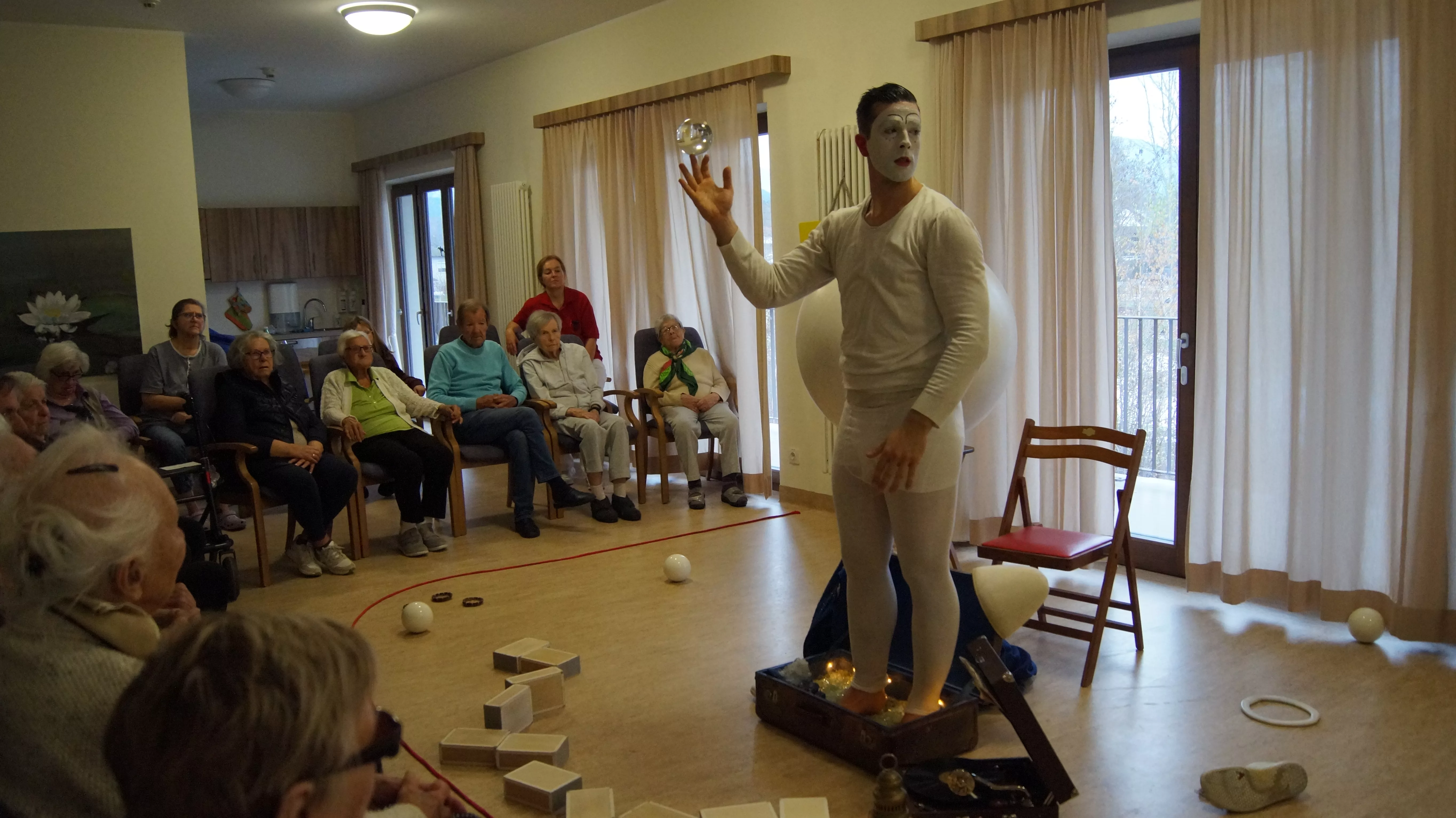 Es war eine faszinierende Darbietung, die Kombinationen aus Jonglage und Objektmanipulation sowie die charakteristischen Bewegungen eines Weißclowns vereinte.