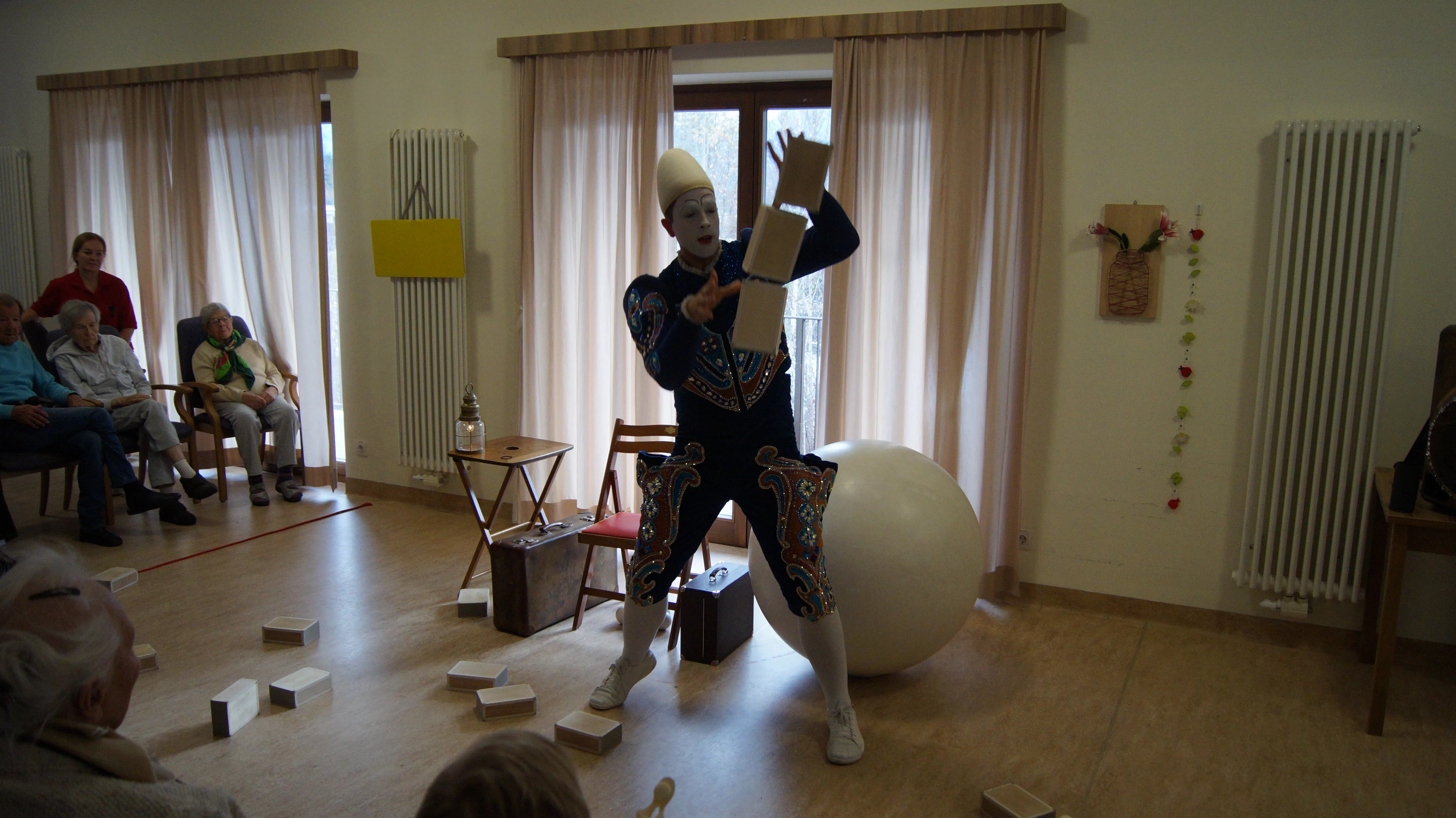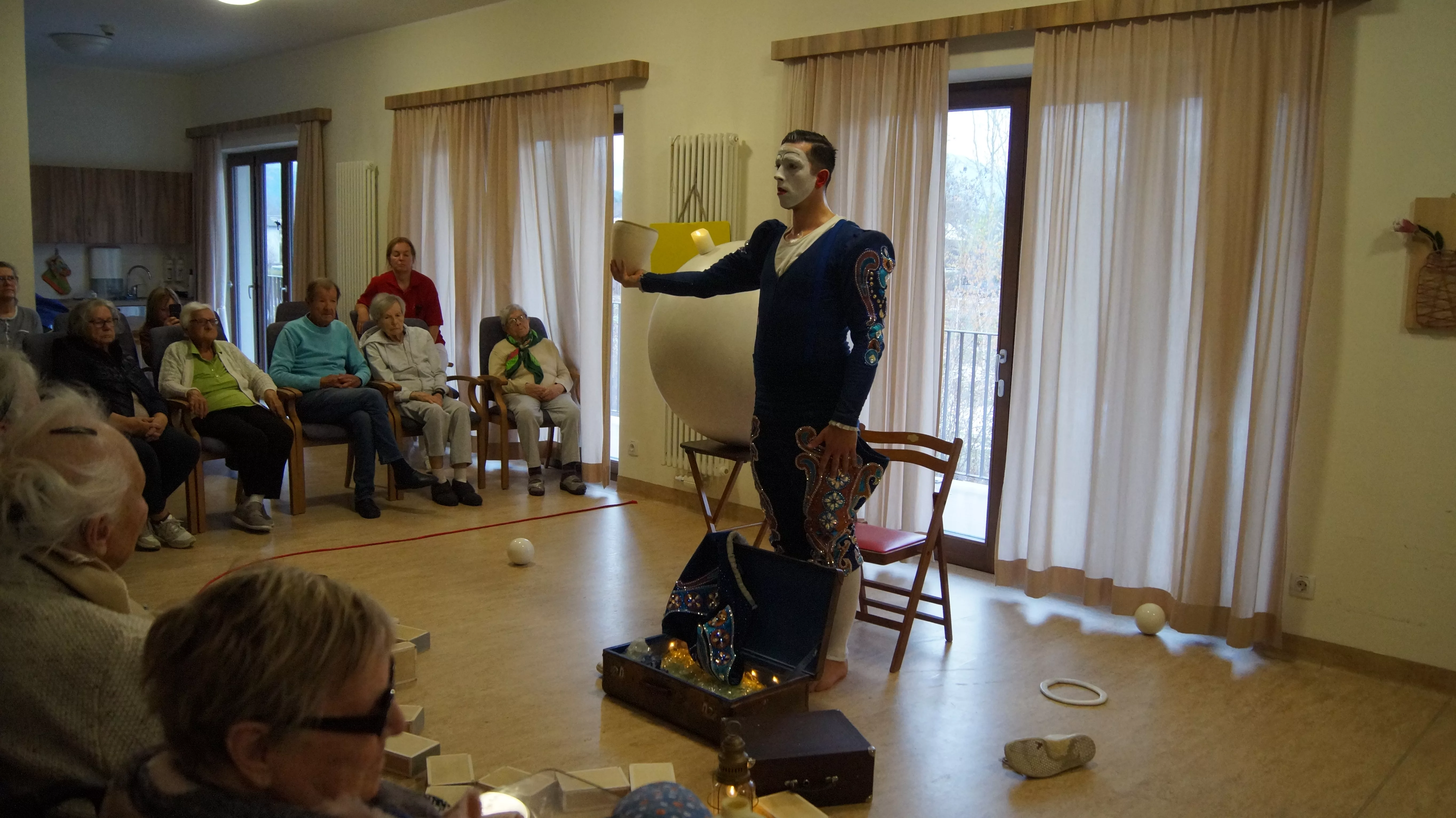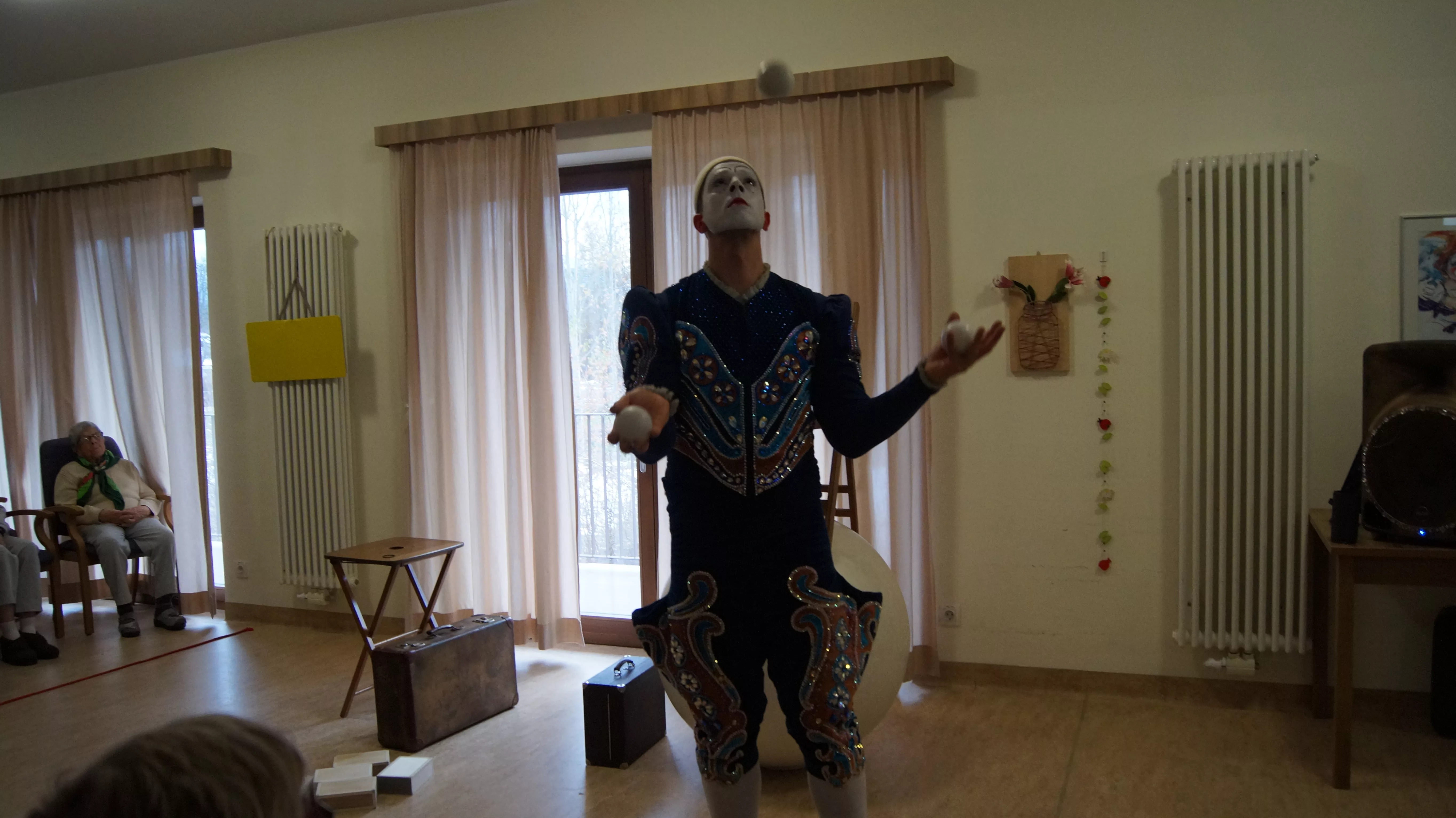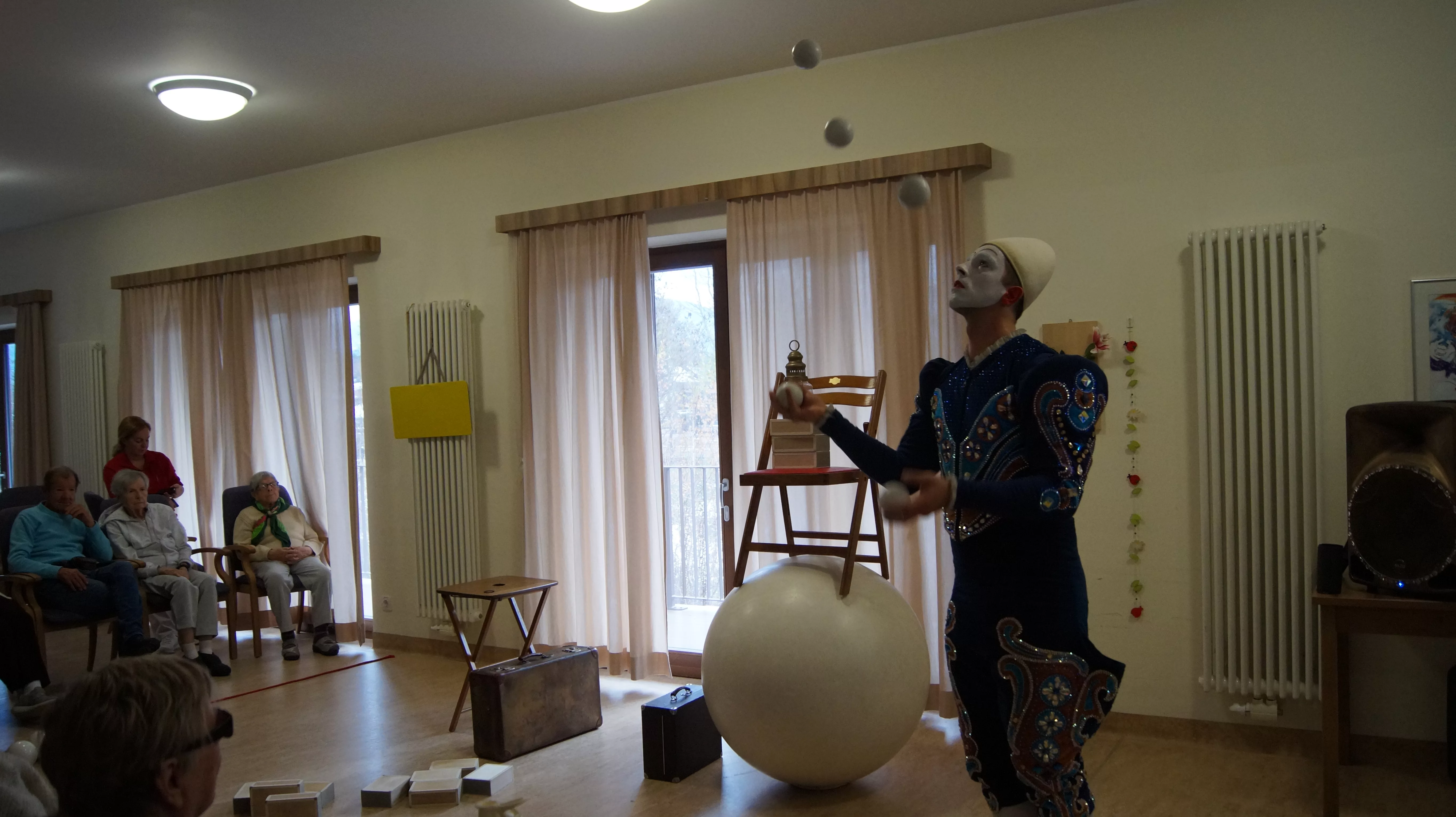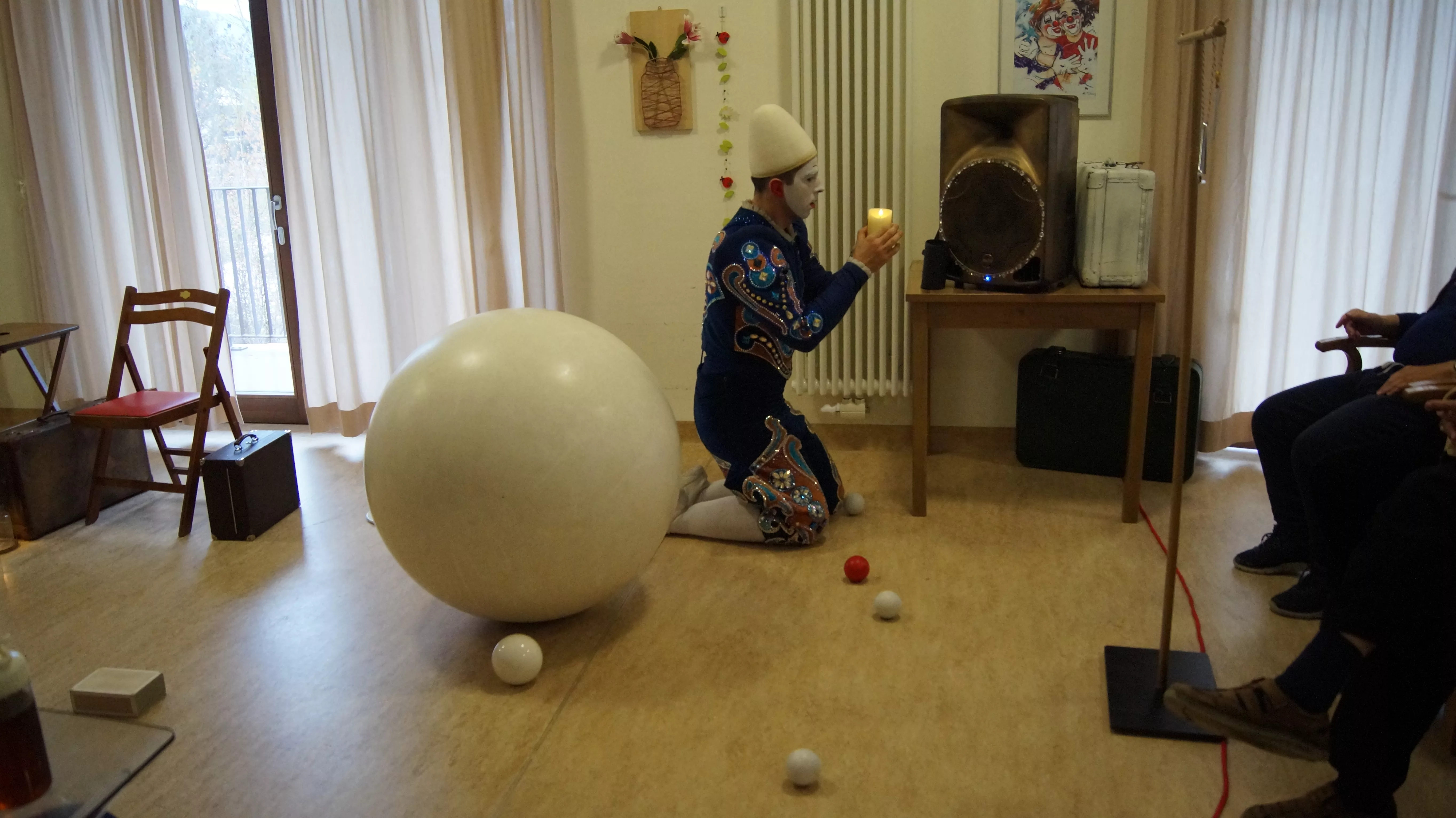 Es war eine faszinierende Darbietung, die Kombinationen aus Jonglage und Objektmanipulation sowie die charakteristischen Bewegungen eines Weißclowns vereinte.