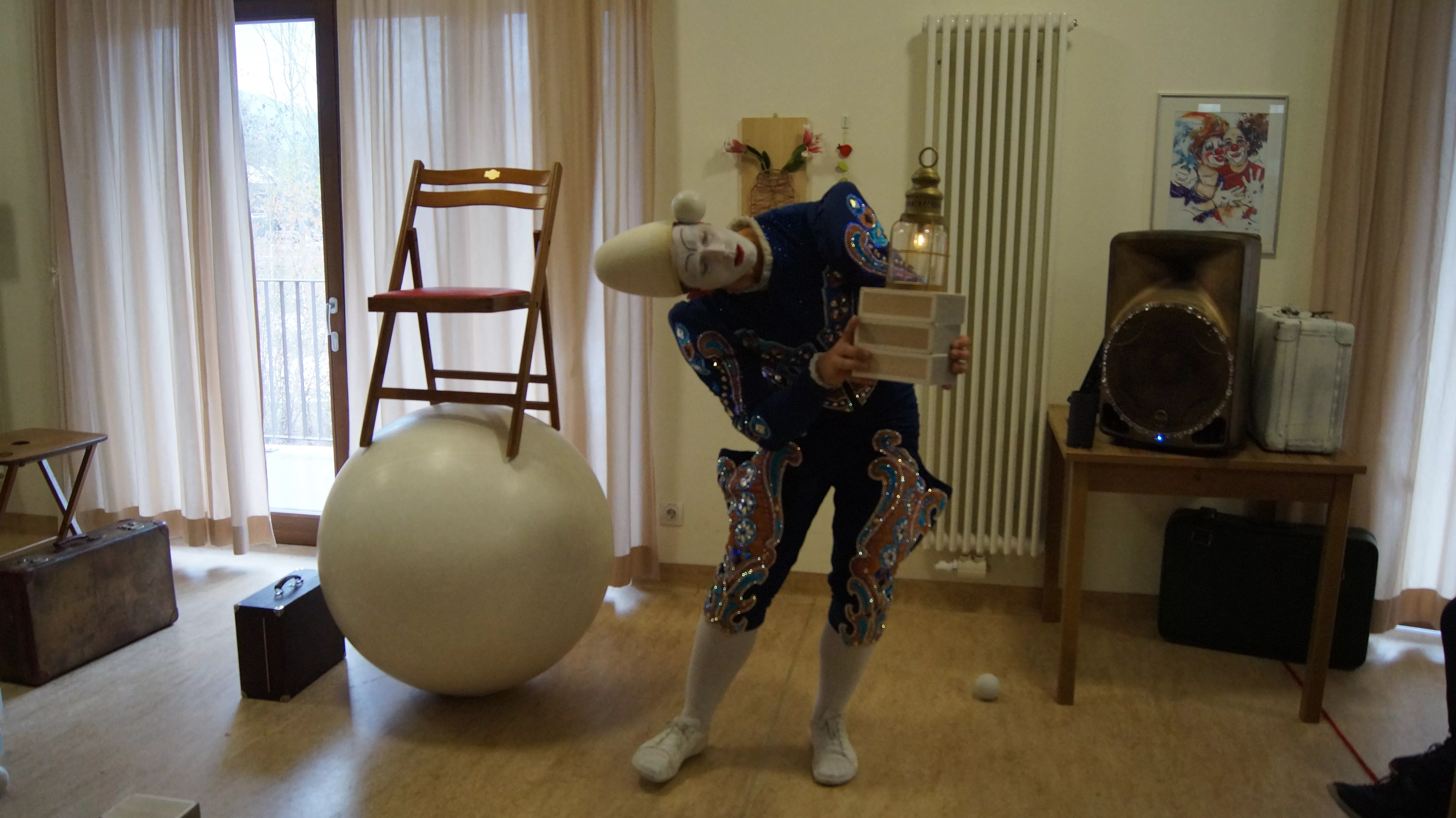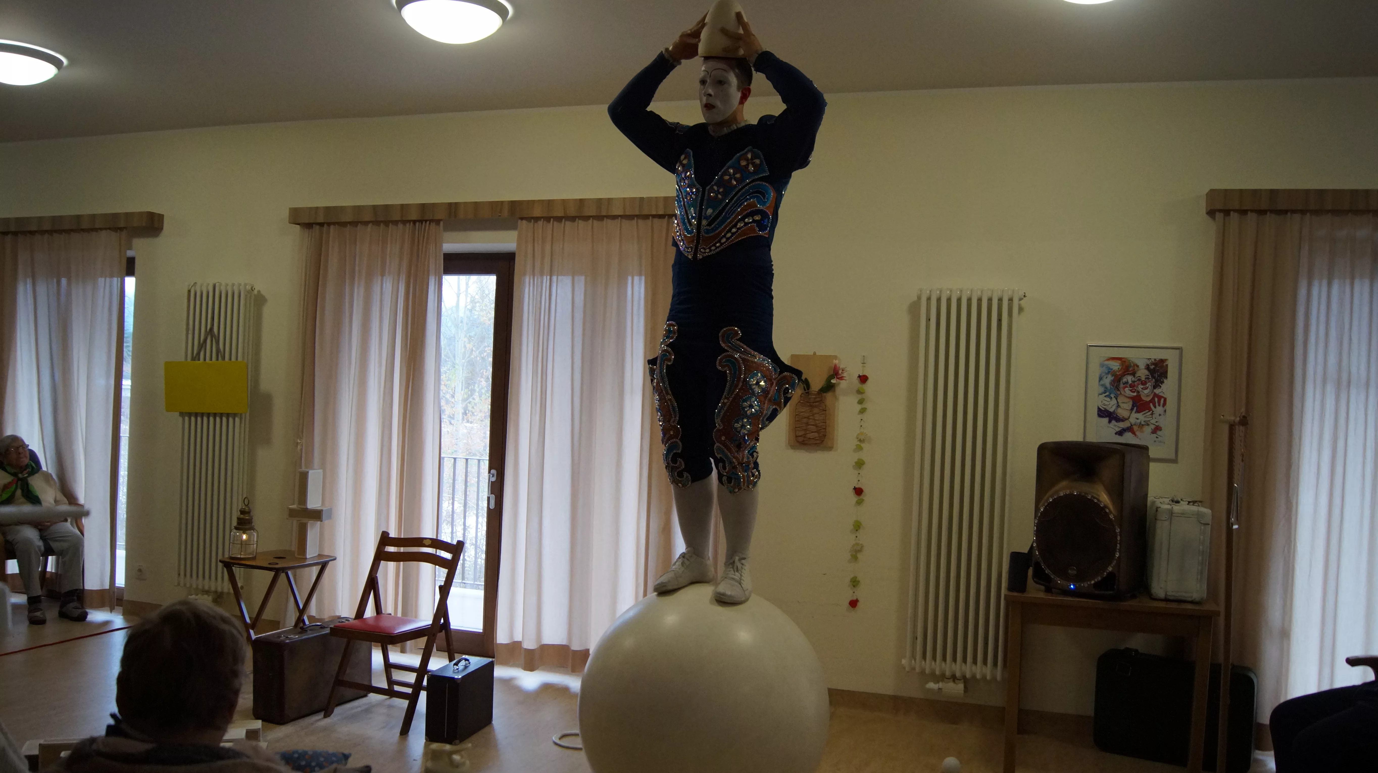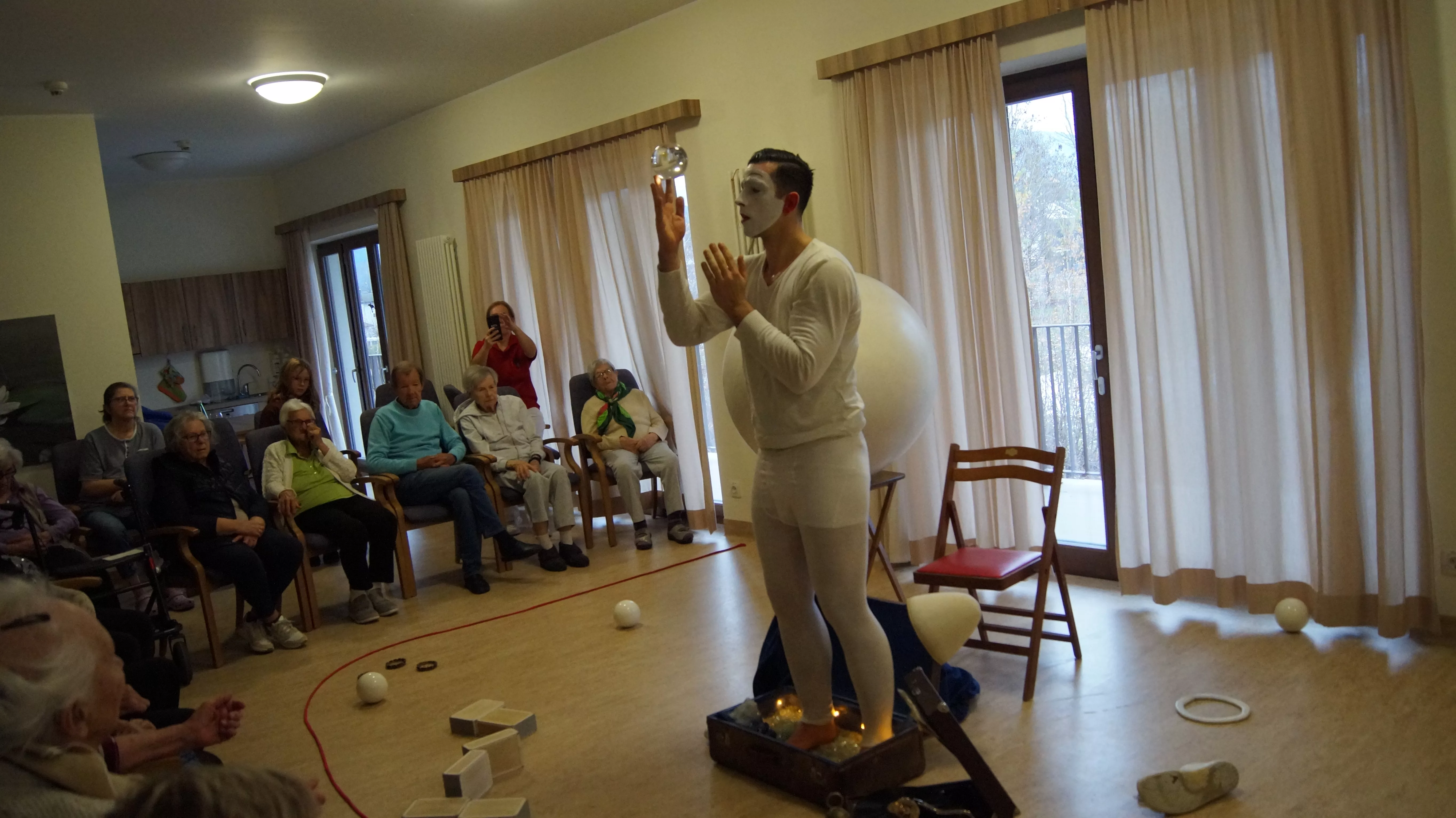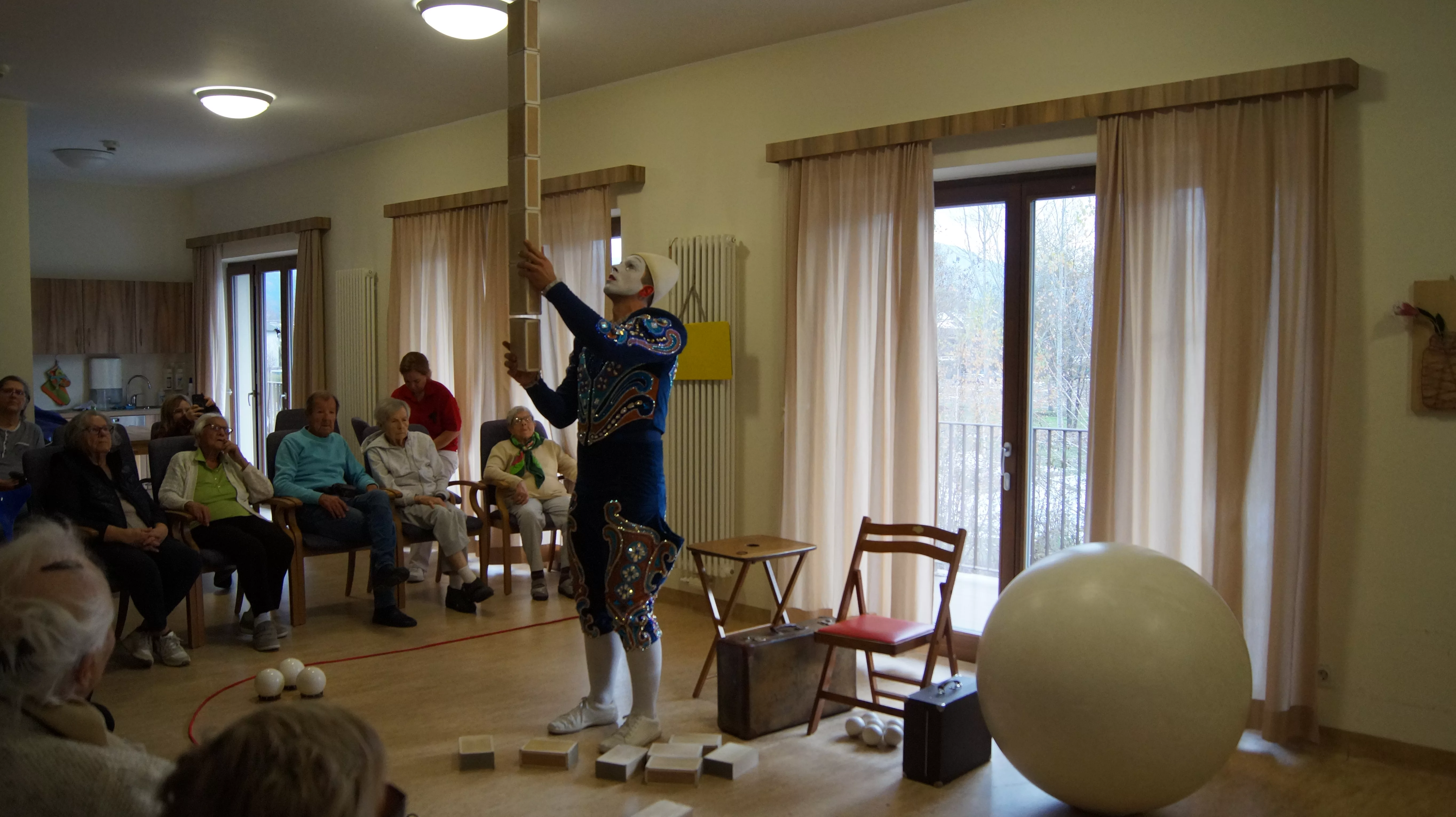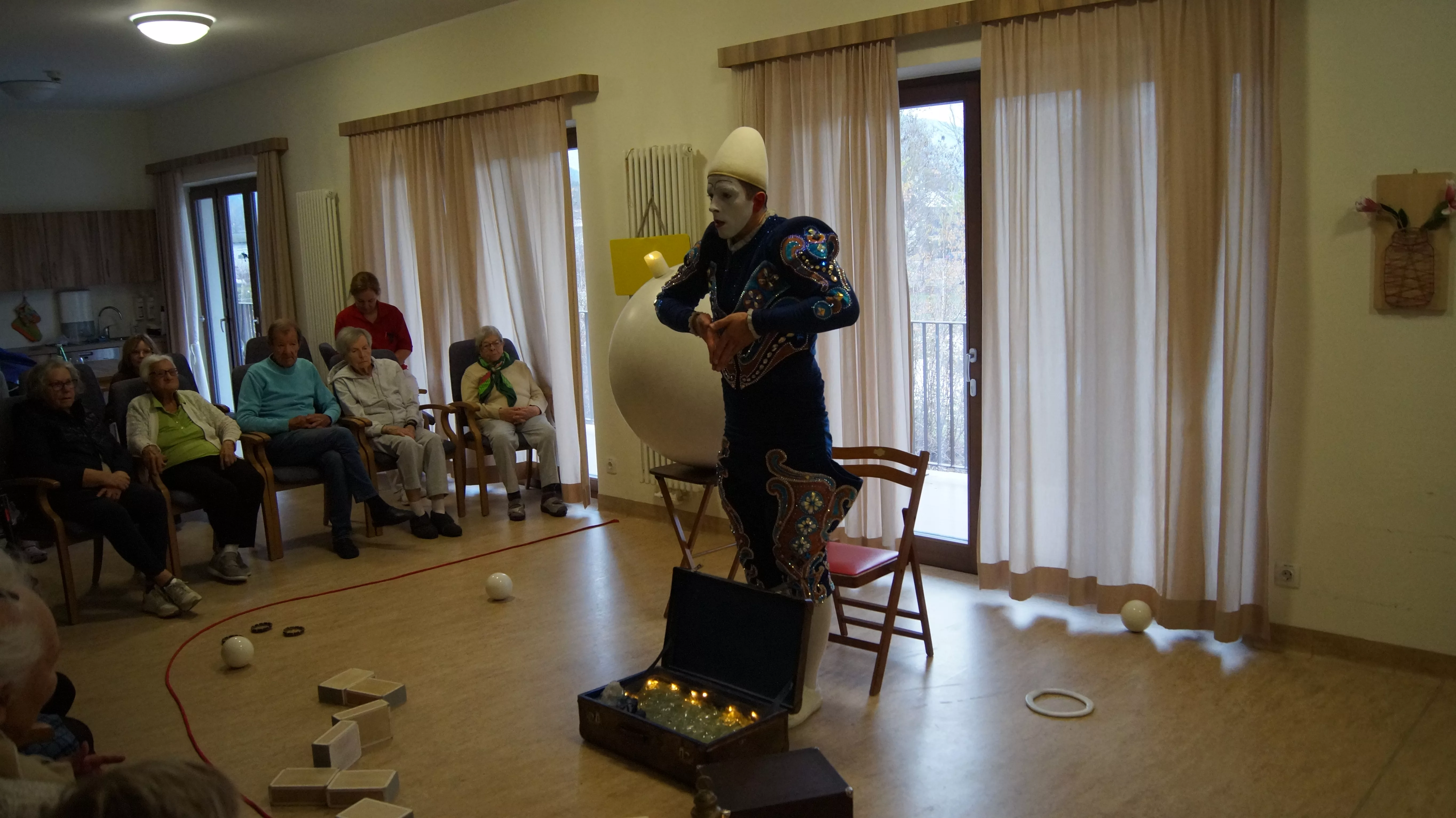 Es war eine faszinierende Darbietung, die Kombinationen aus Jonglage und Objektmanipulation sowie die charakteristischen Bewegungen eines Weißclowns vereinte.