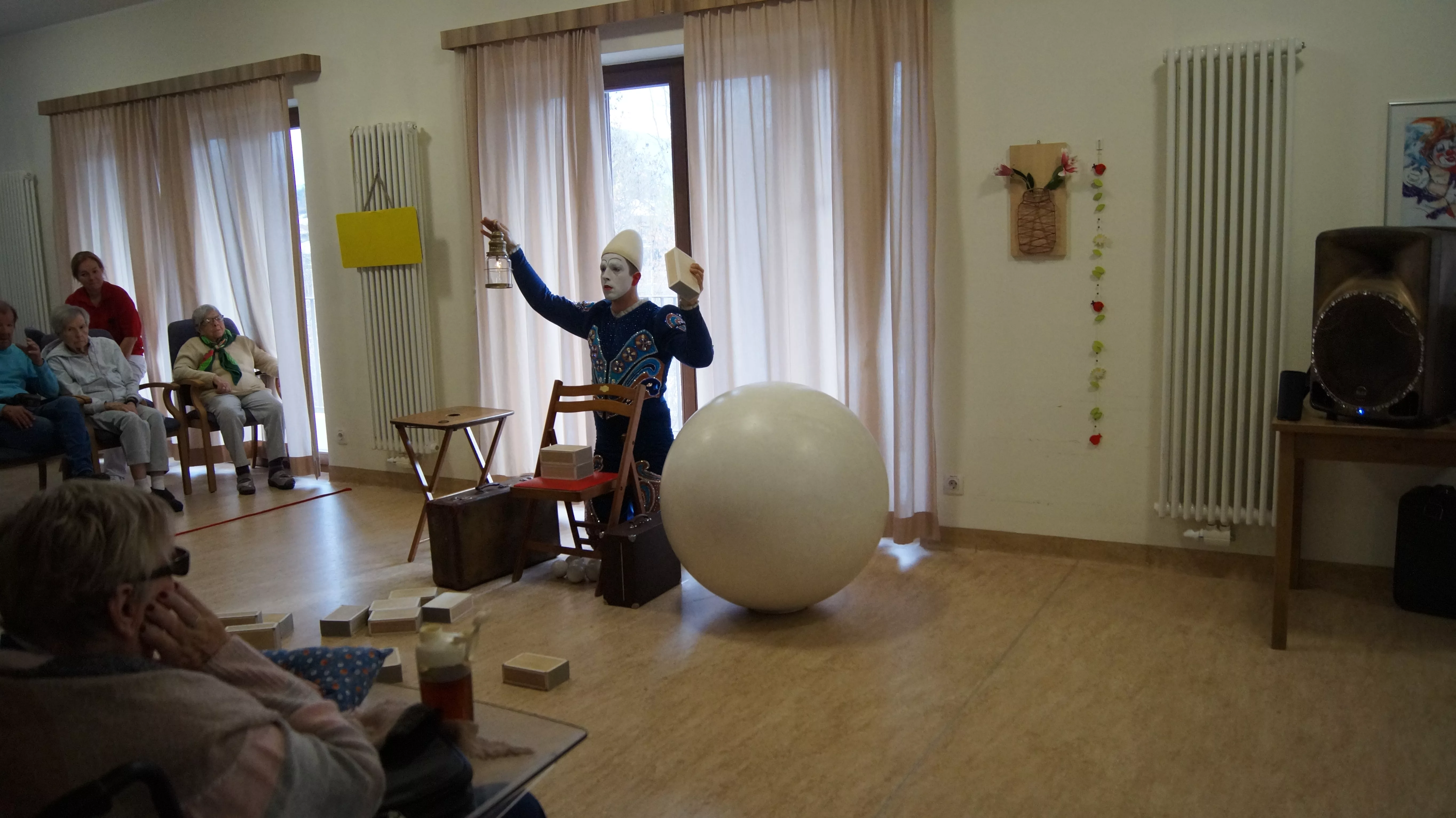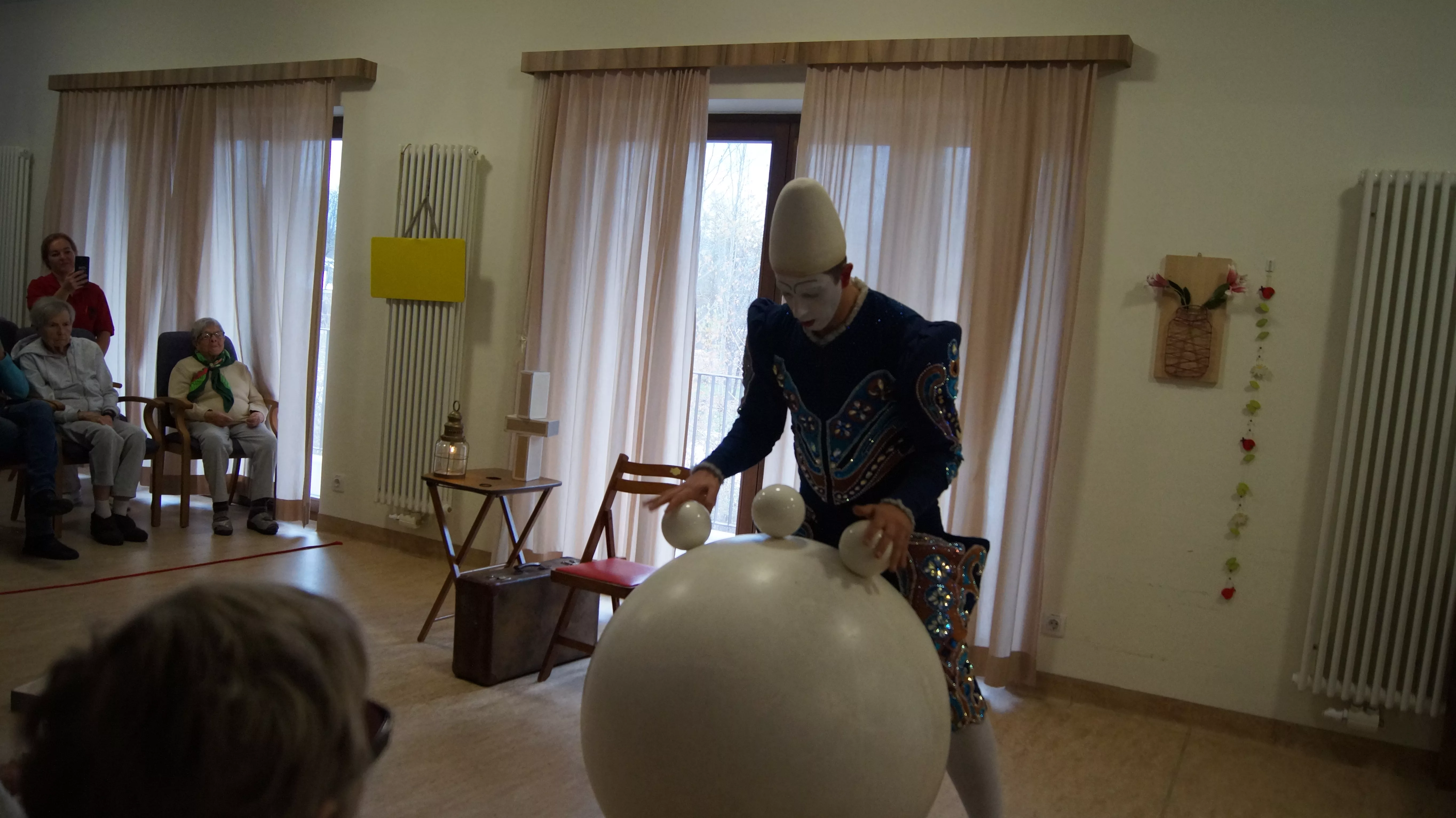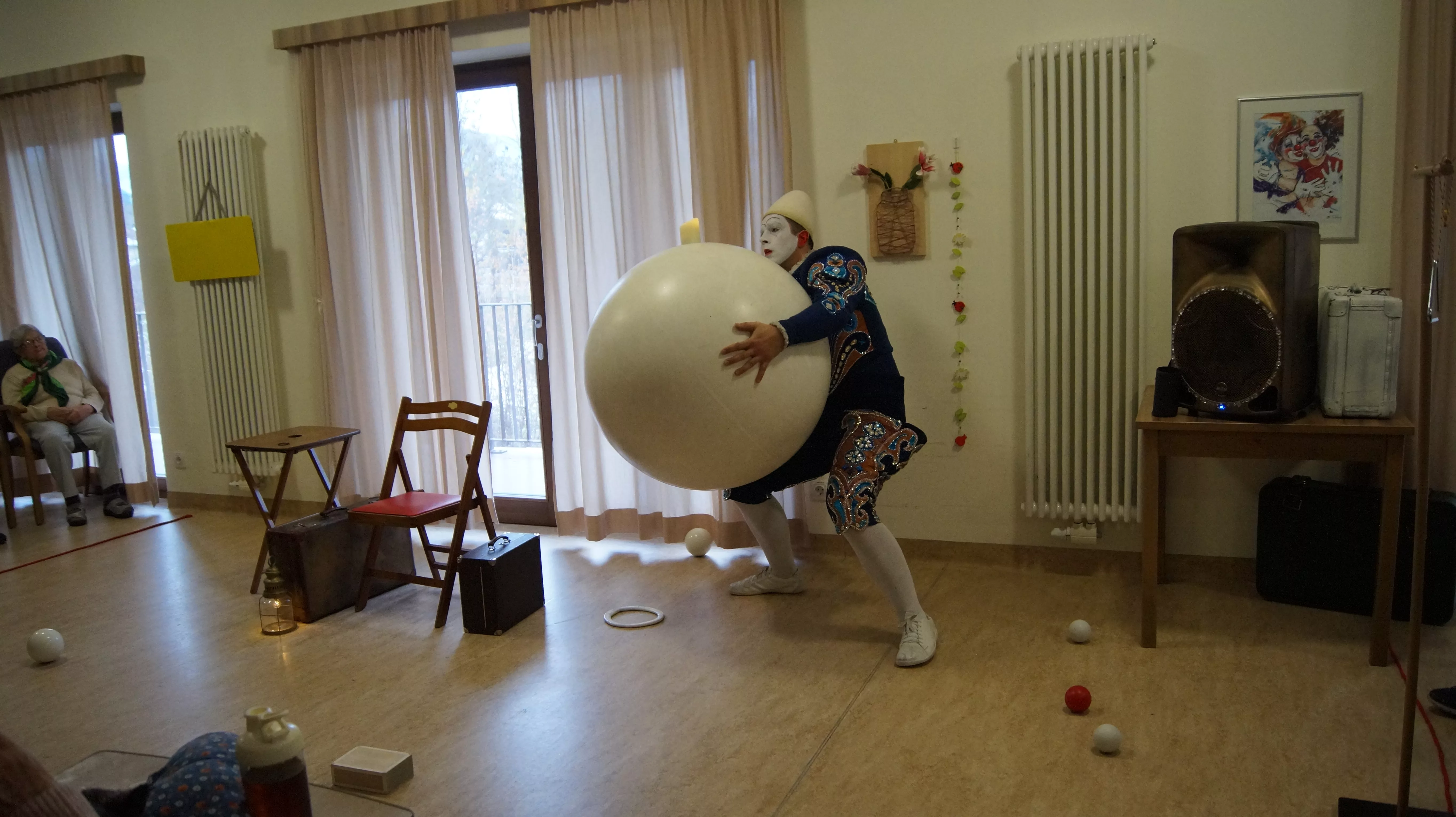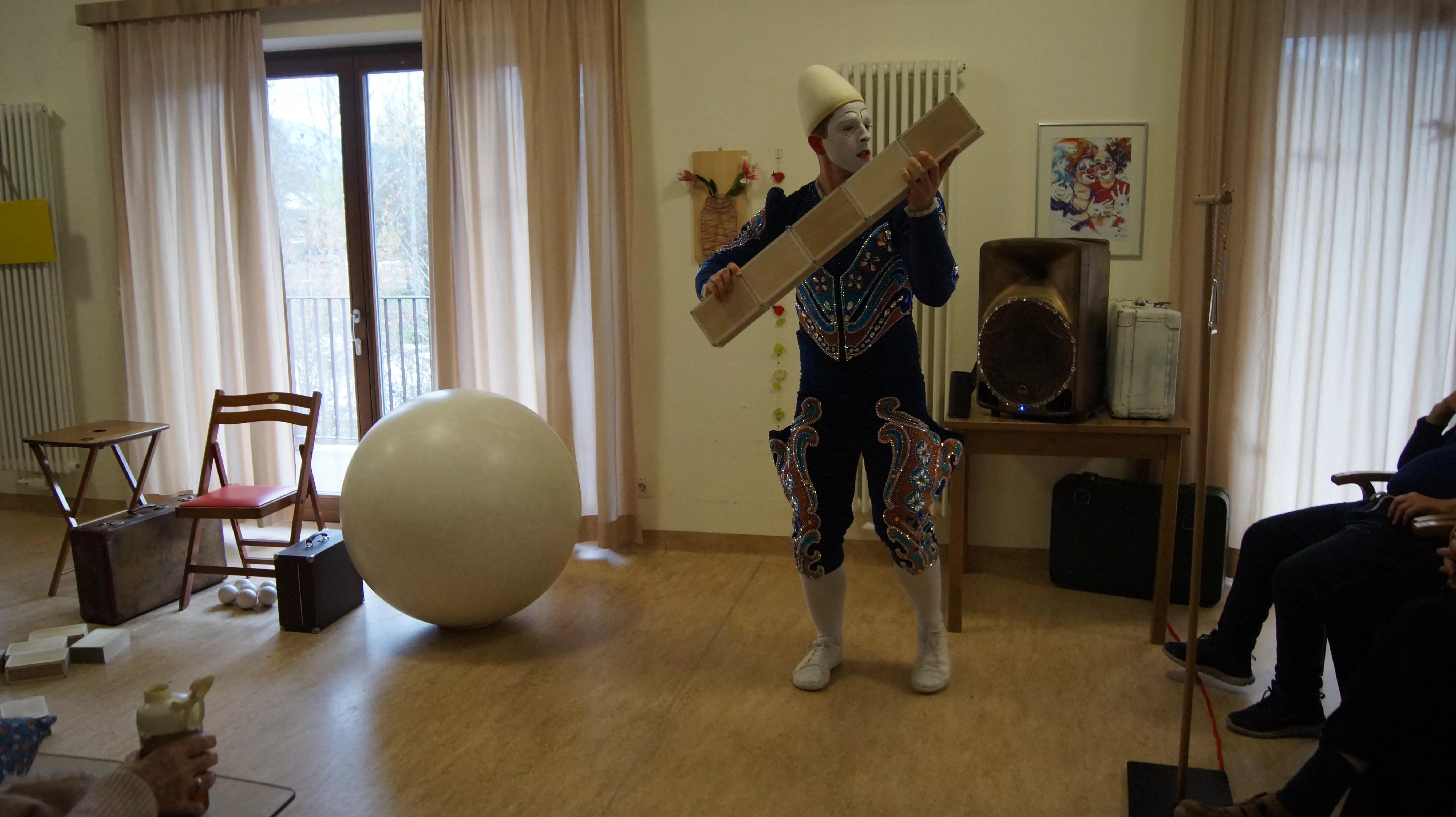 Es war eine faszinierende Darbietung, die Kombinationen aus Jonglage und Objektmanipulation sowie die charakteristischen Bewegungen eines Weißclowns vereinte.