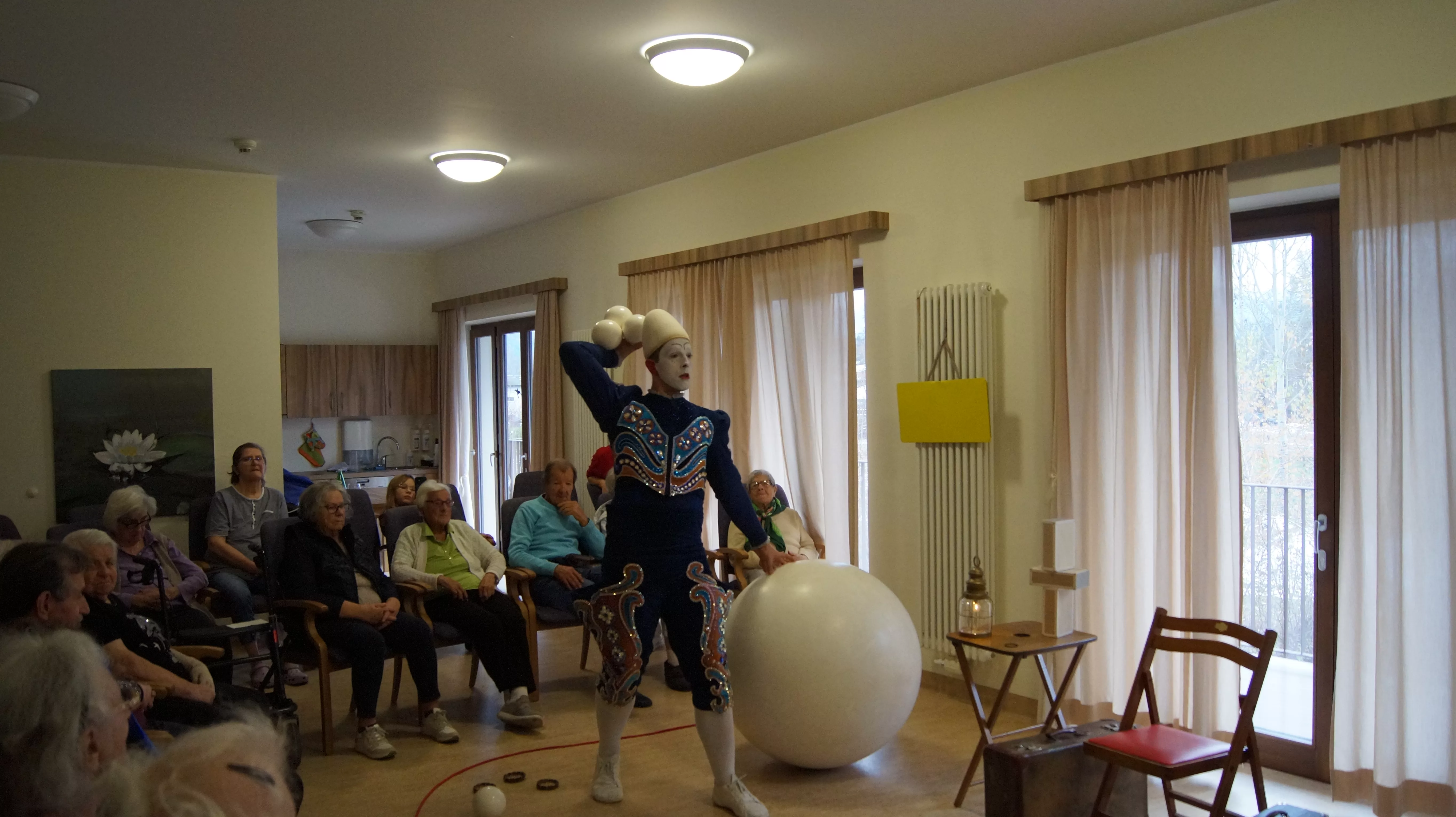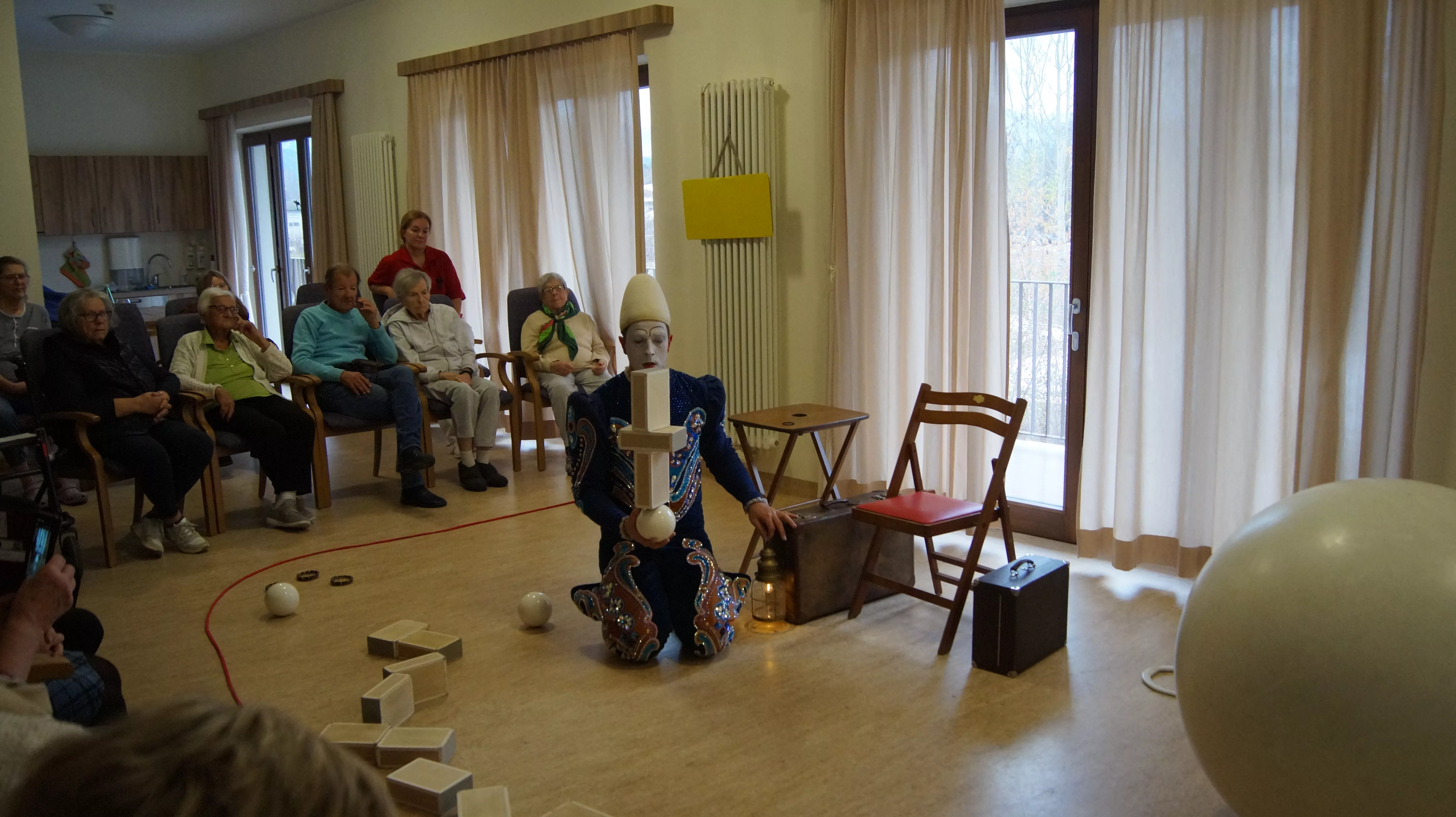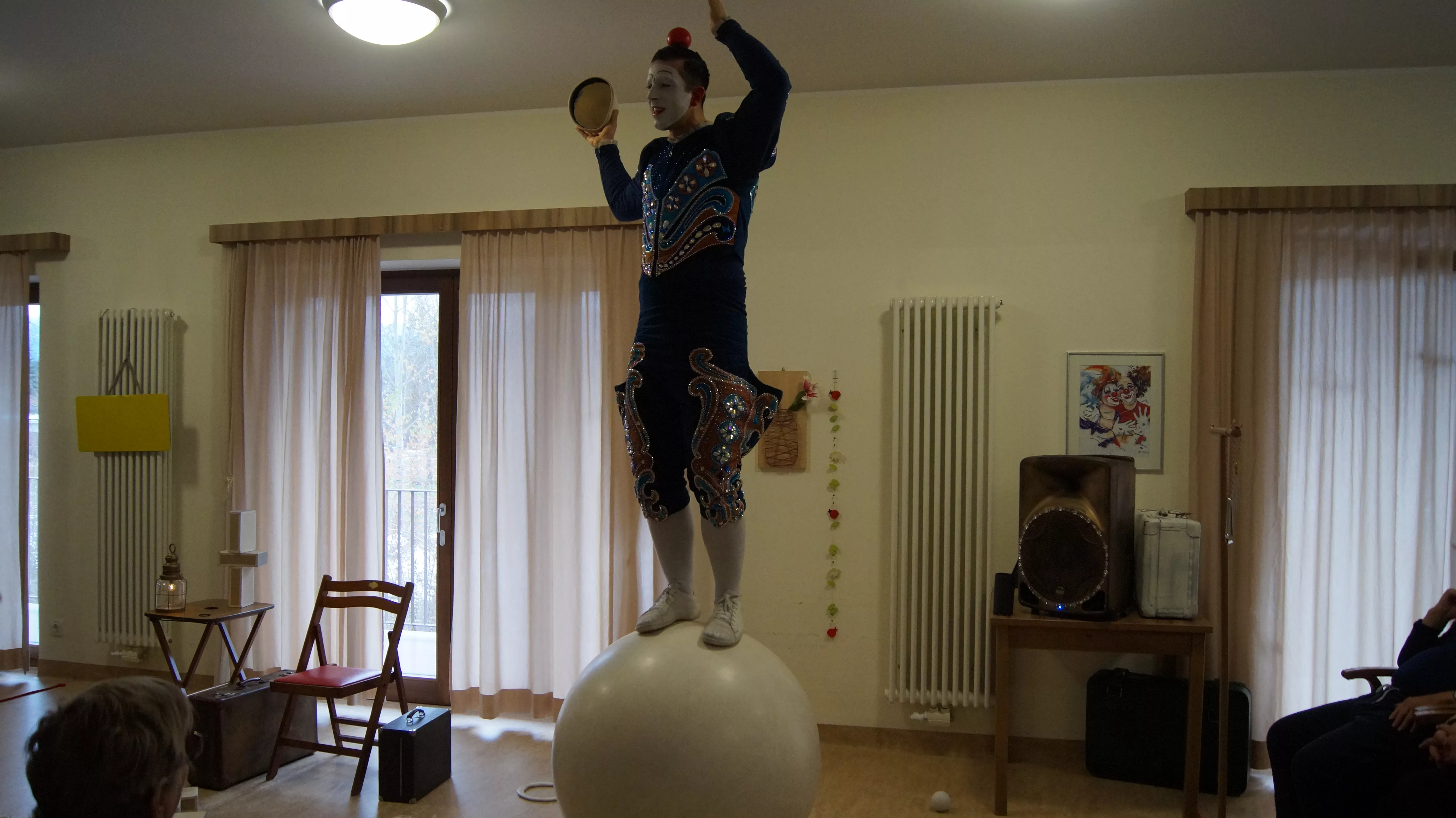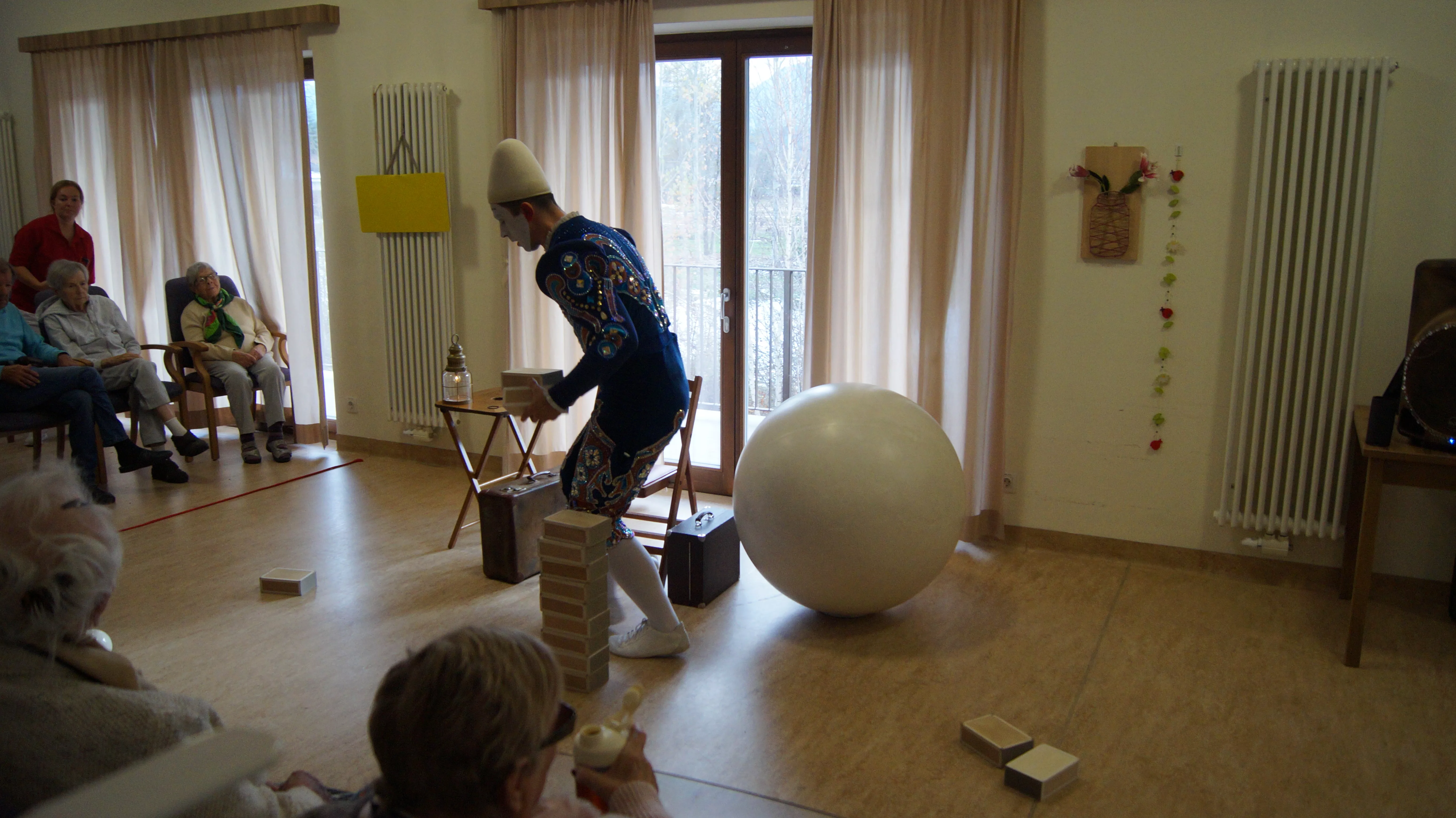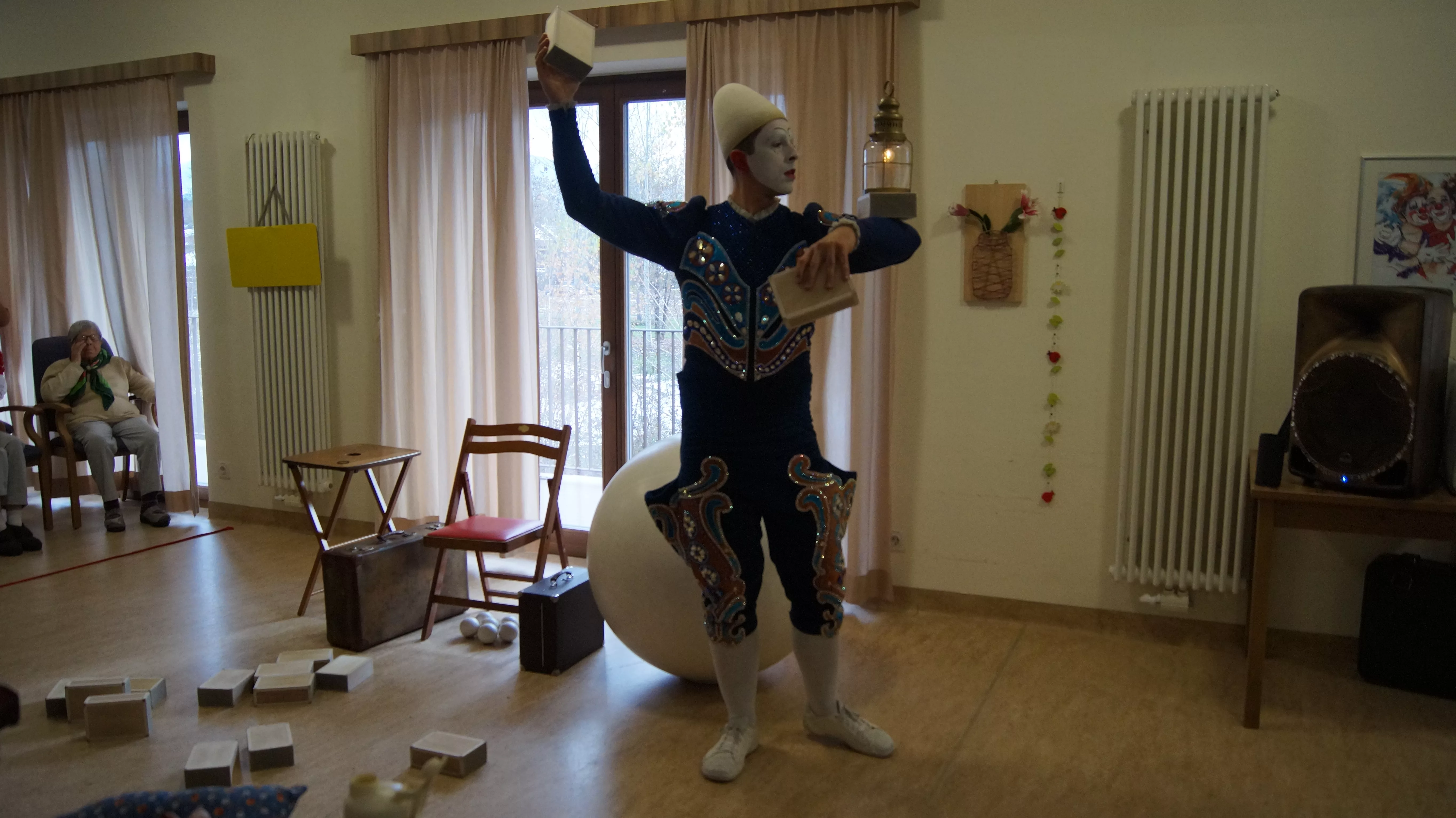 Es war eine faszinierende Darbietung, die Kombinationen aus Jonglage und Objektmanipulation sowie die charakteristischen Bewegungen eines Weißclowns vereinte.