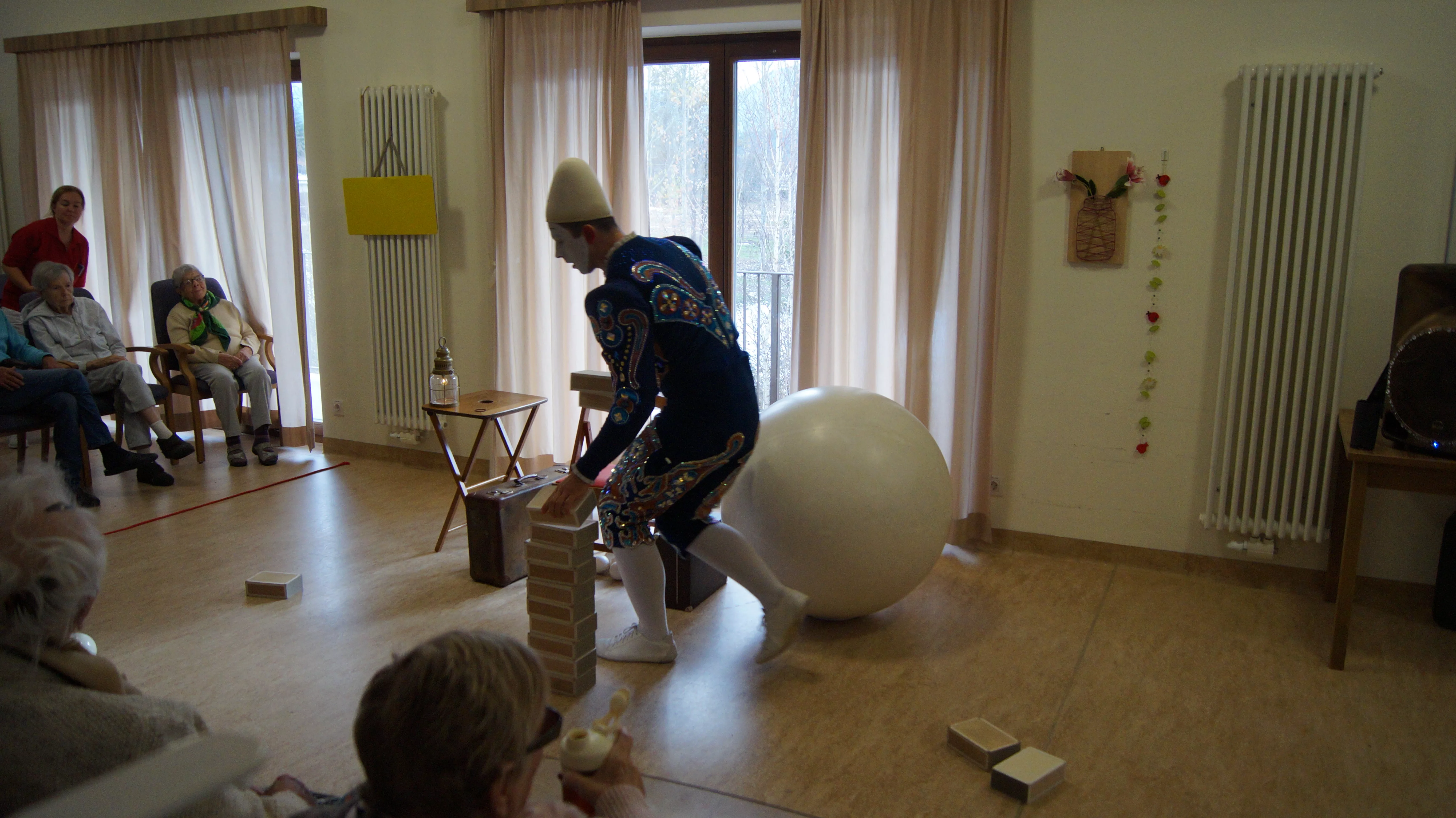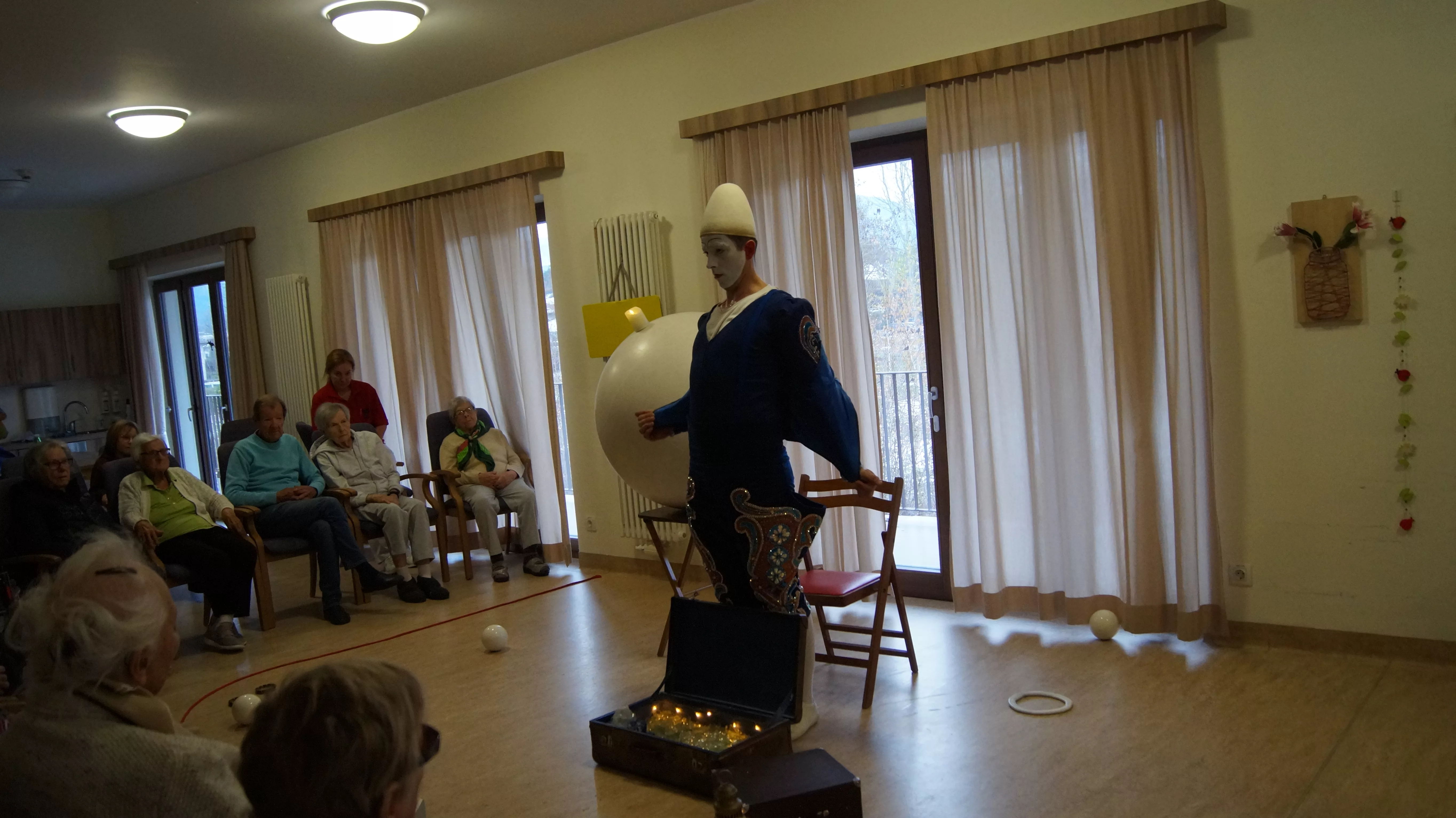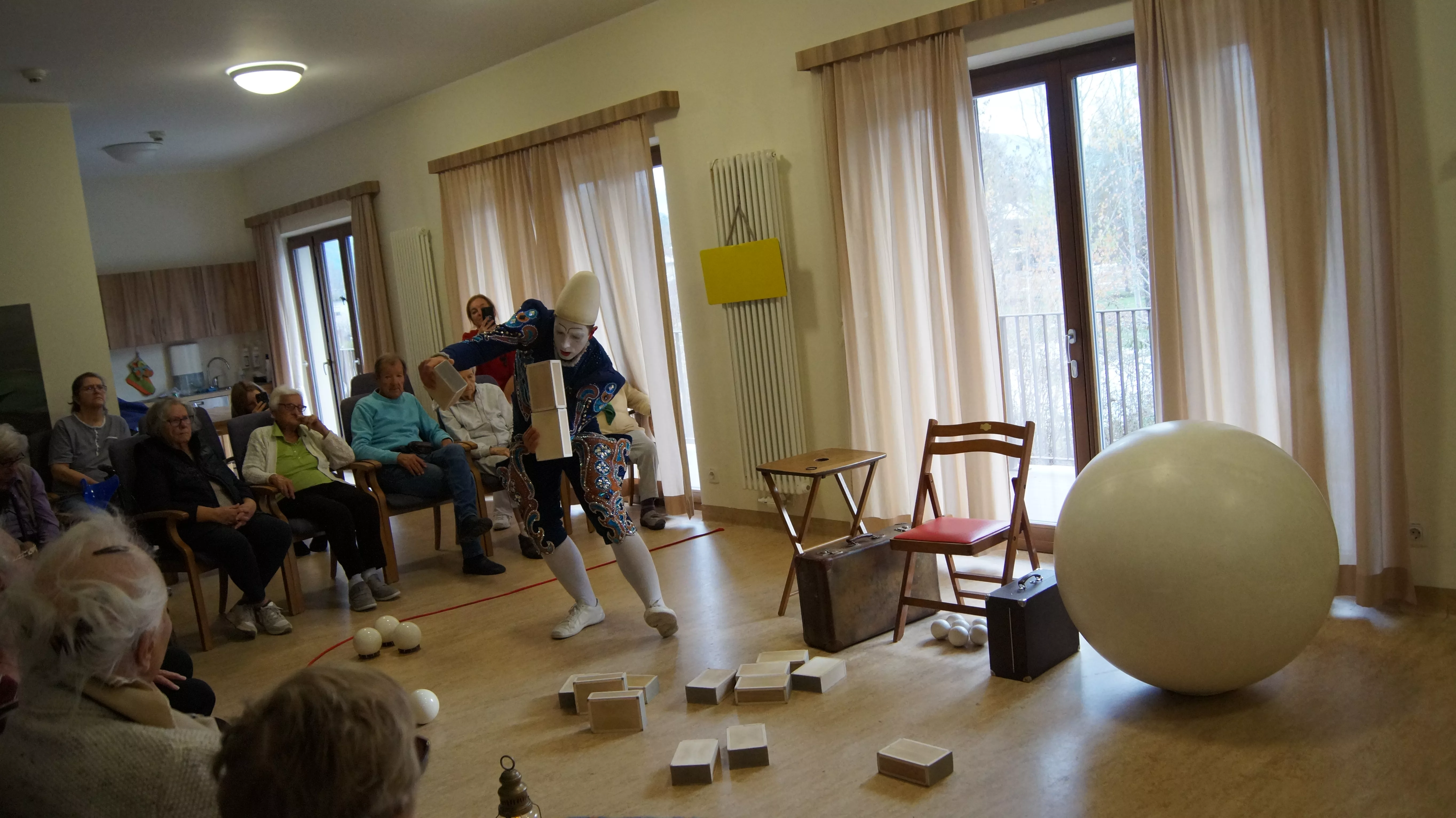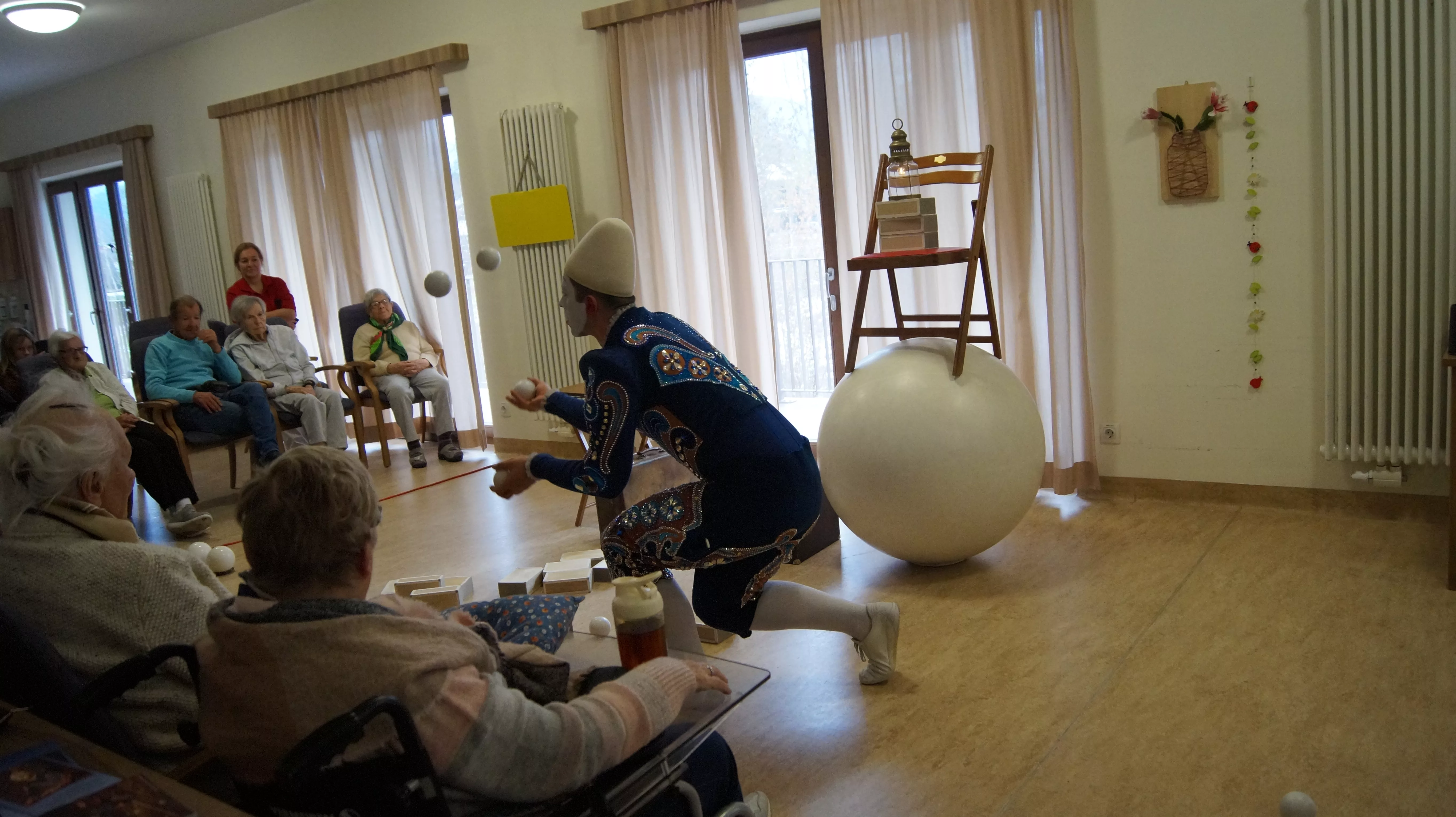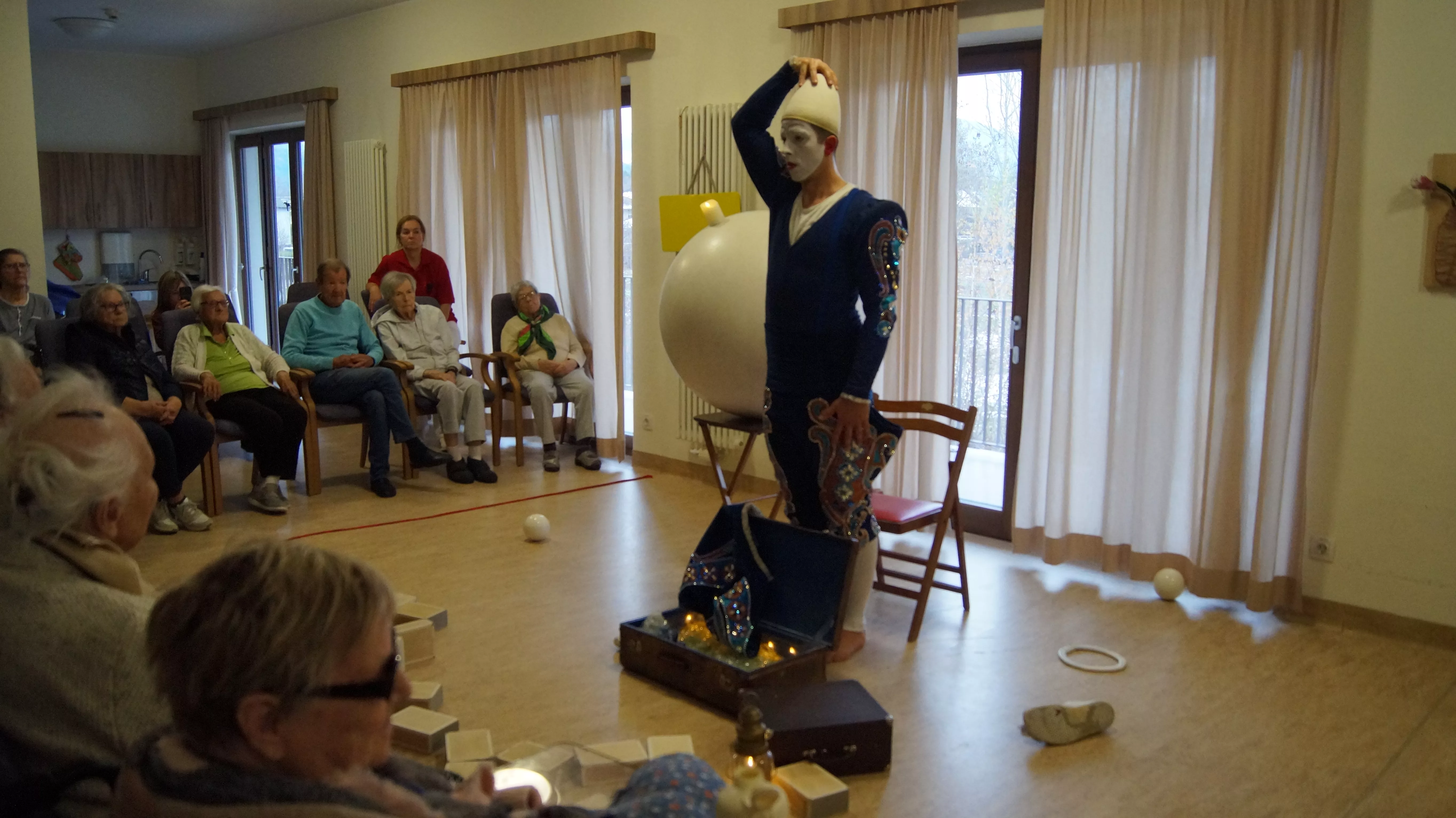 Es war eine faszinierende Darbietung, die Kombinationen aus Jonglage und Objektmanipulation sowie die charakteristischen Bewegungen eines Weißclowns vereinte.