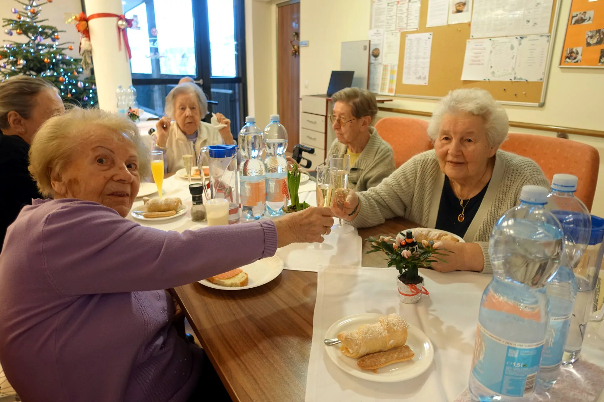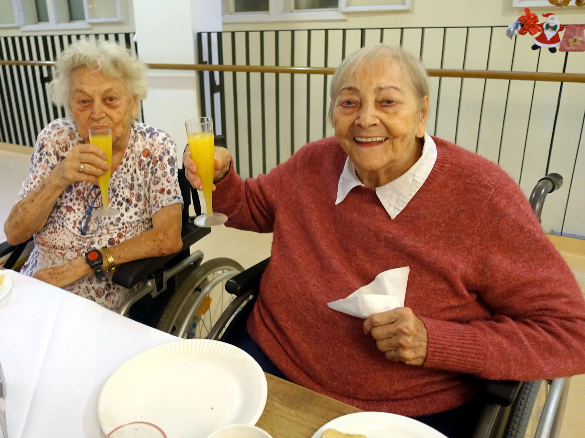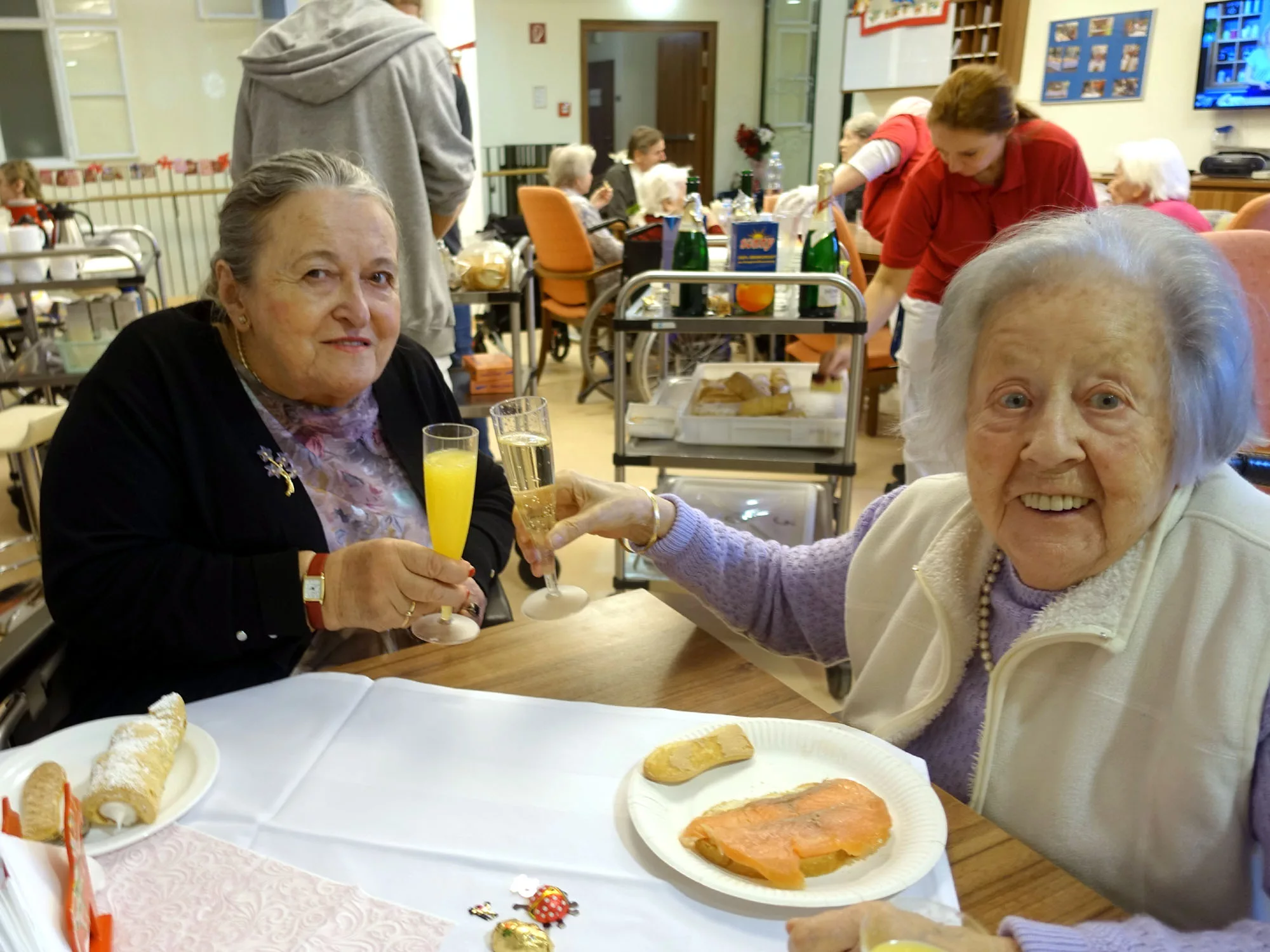 Prosit Neujahr! Mit Sekt und Lachsbrötchen begrüßten die Senioren das neue Jahr.Wir bedanken uns bei der Blumenecke am Floridsdorfer Schlingermarkt, welche die Tische der Aufenthaltsbereiche mit Glücksbringern geschmückt hat.Prosit Neujahr, Glück und Gesundheit!