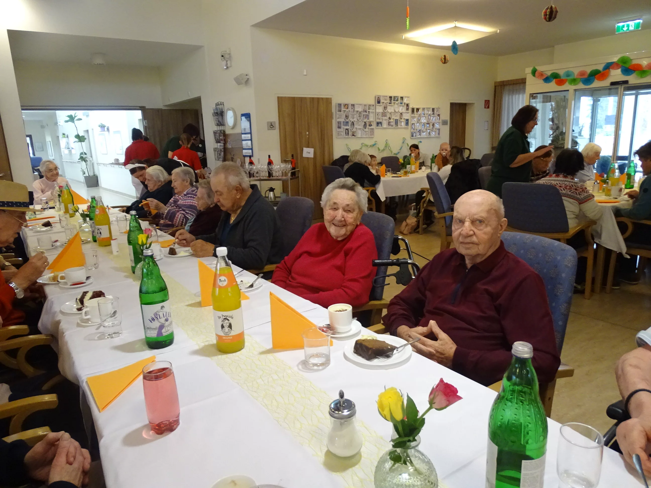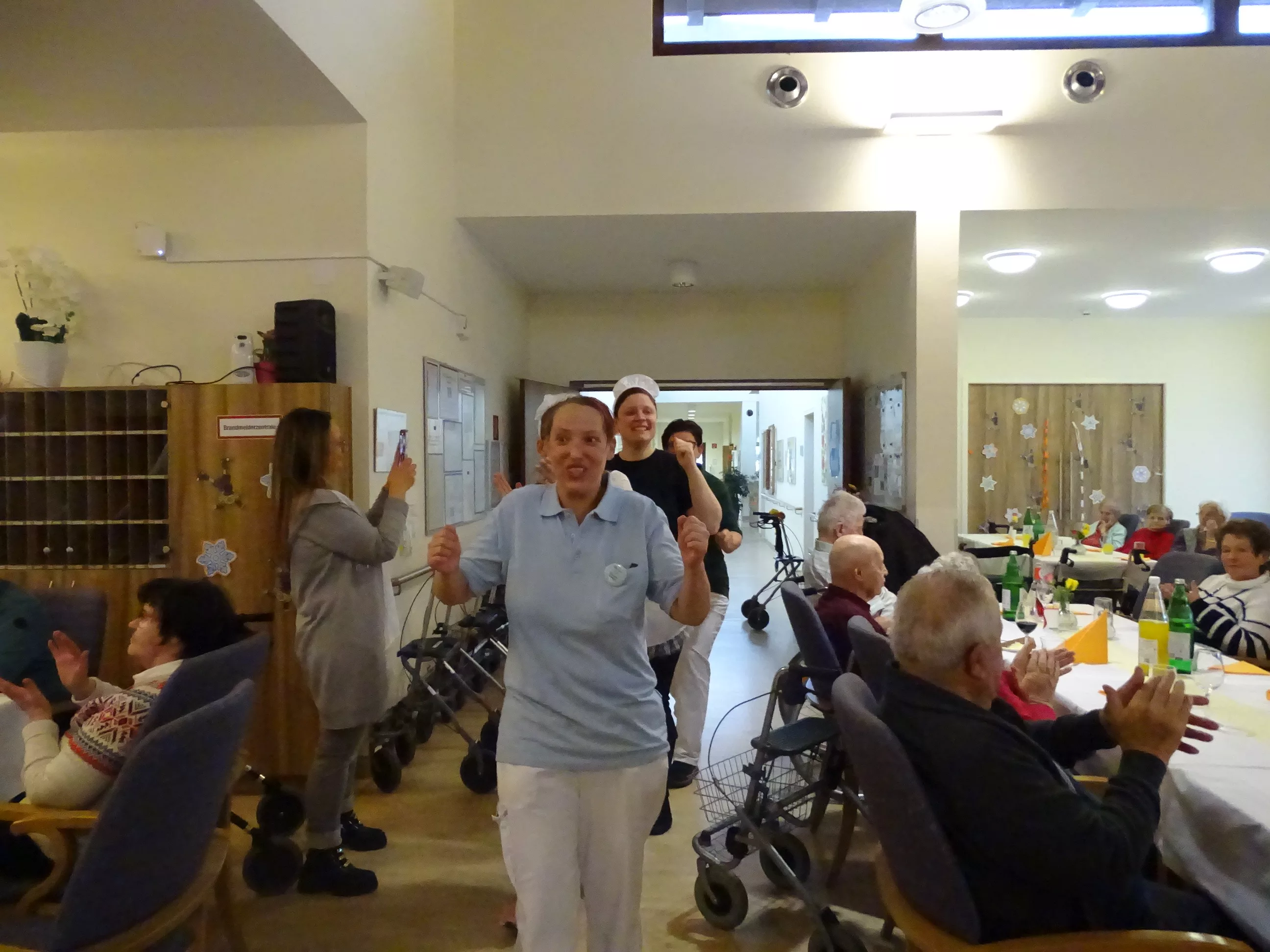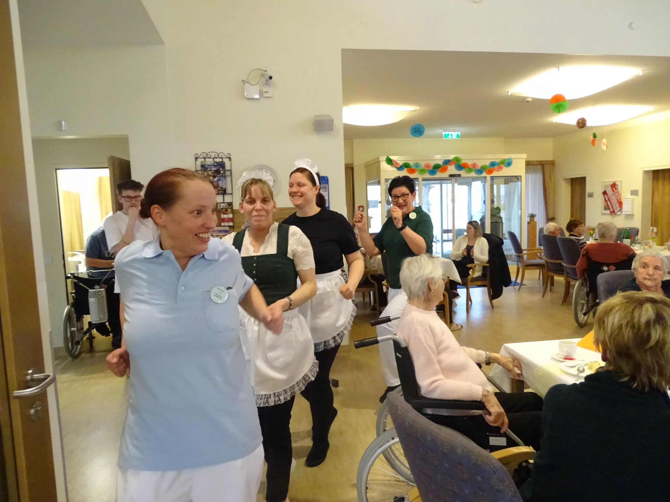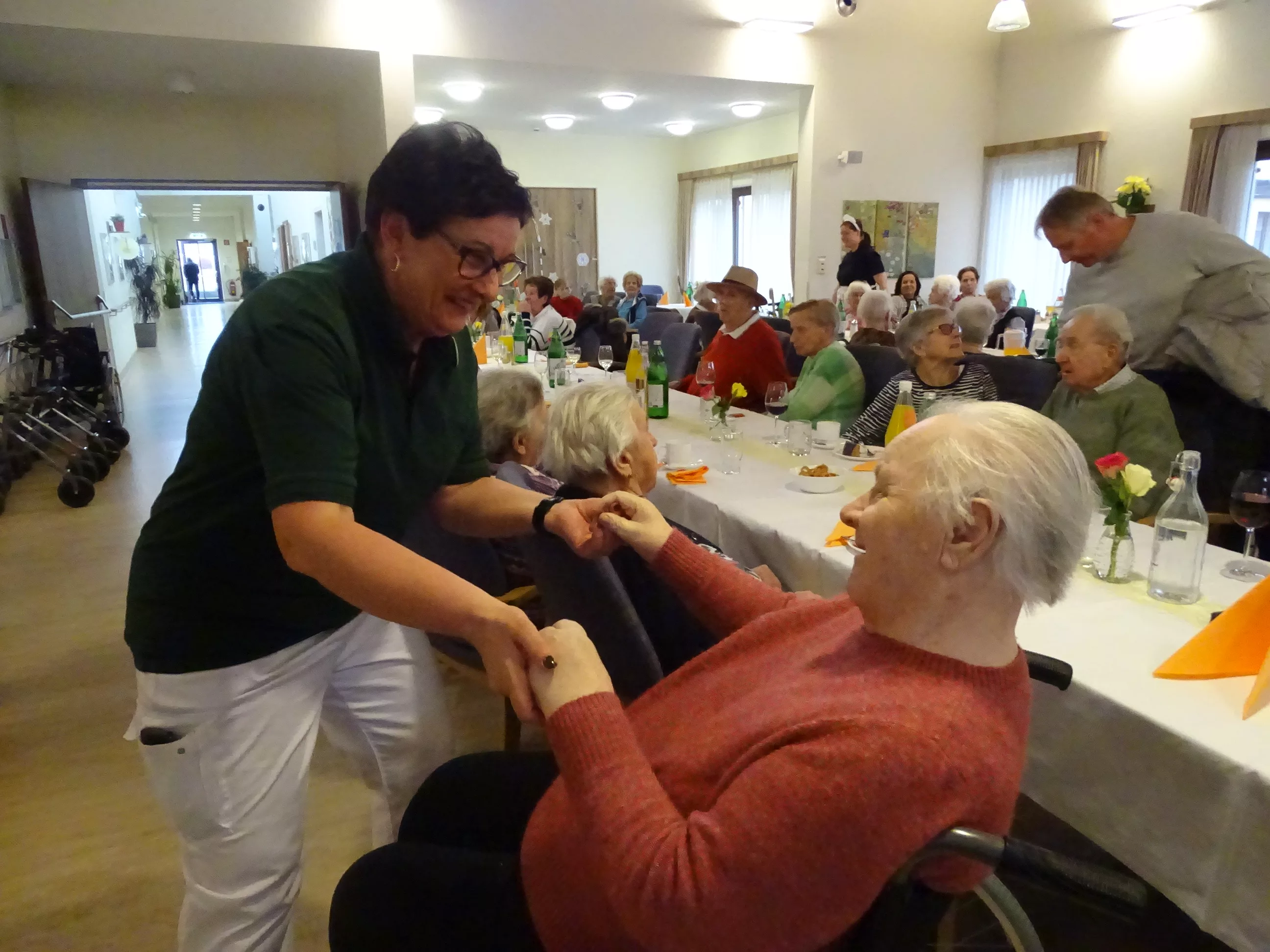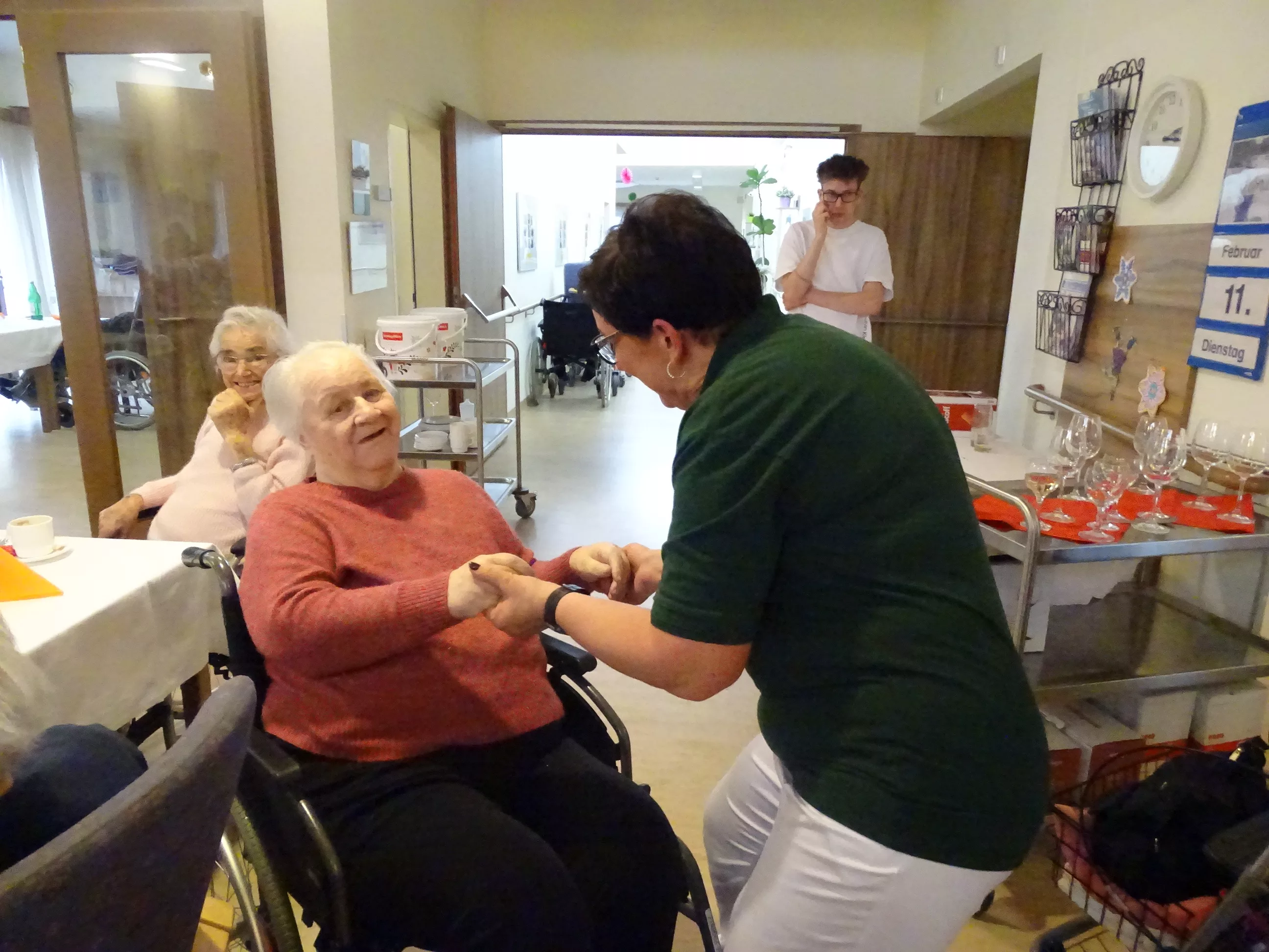 Unser „Wiener Cafehaus“ am 11.02.2025 war ein tolles Zusammenkommen von unseren BewohnerInnen. Unsere DJ Sabine brachte mit Ihrem Wurlitzer beste Stimmungunser Haus! Unsere BewohnerInnen wünschten sich die verschiedensten Lieder. Es wurde getanzt, gesungen miteinander ein Achterl Wein getrunken und geschunkelt. Der Höhepunkt war das Service von unseren „Servierpersonal“ Sabine und Sabine, die die leckeren Torten unserer Claudia im perfekten Servier „Look“ unseren BewohnerInnen brachten. Die Polonaise war ein weiterer Höhepunkt unserer kleinen aber feinen Feier!