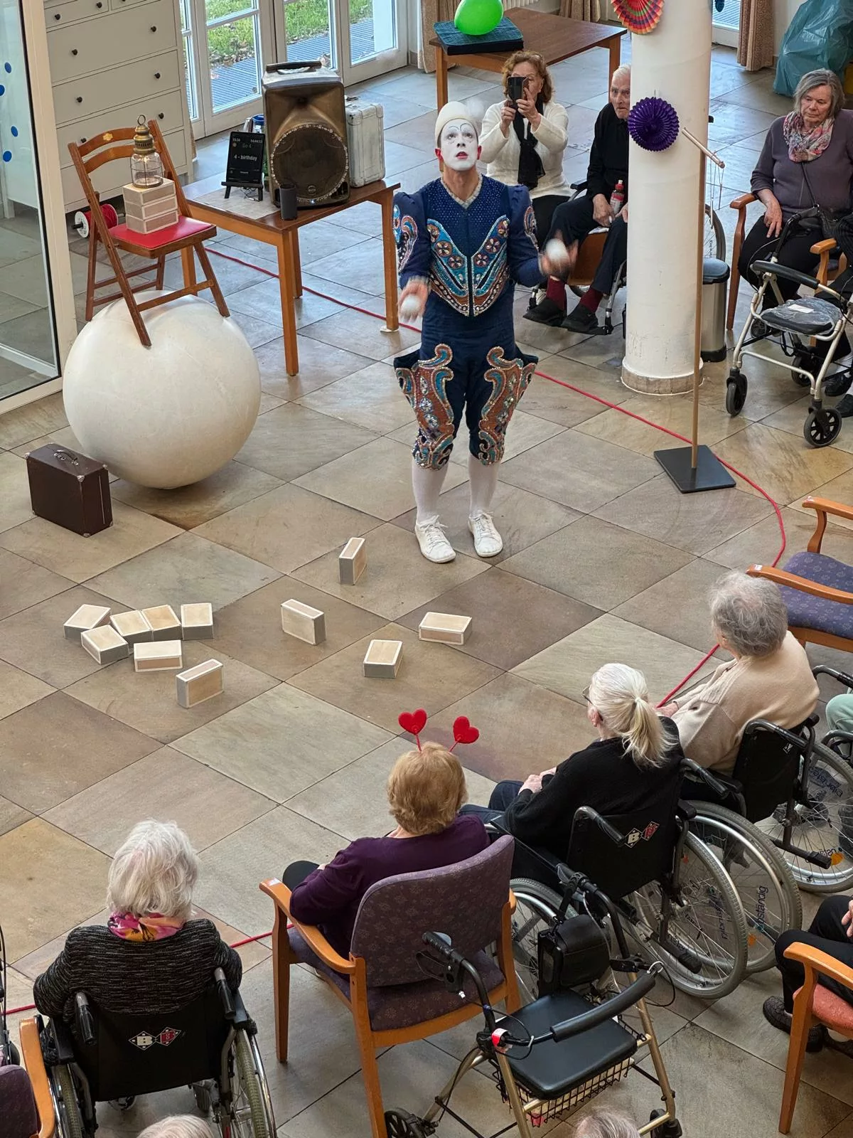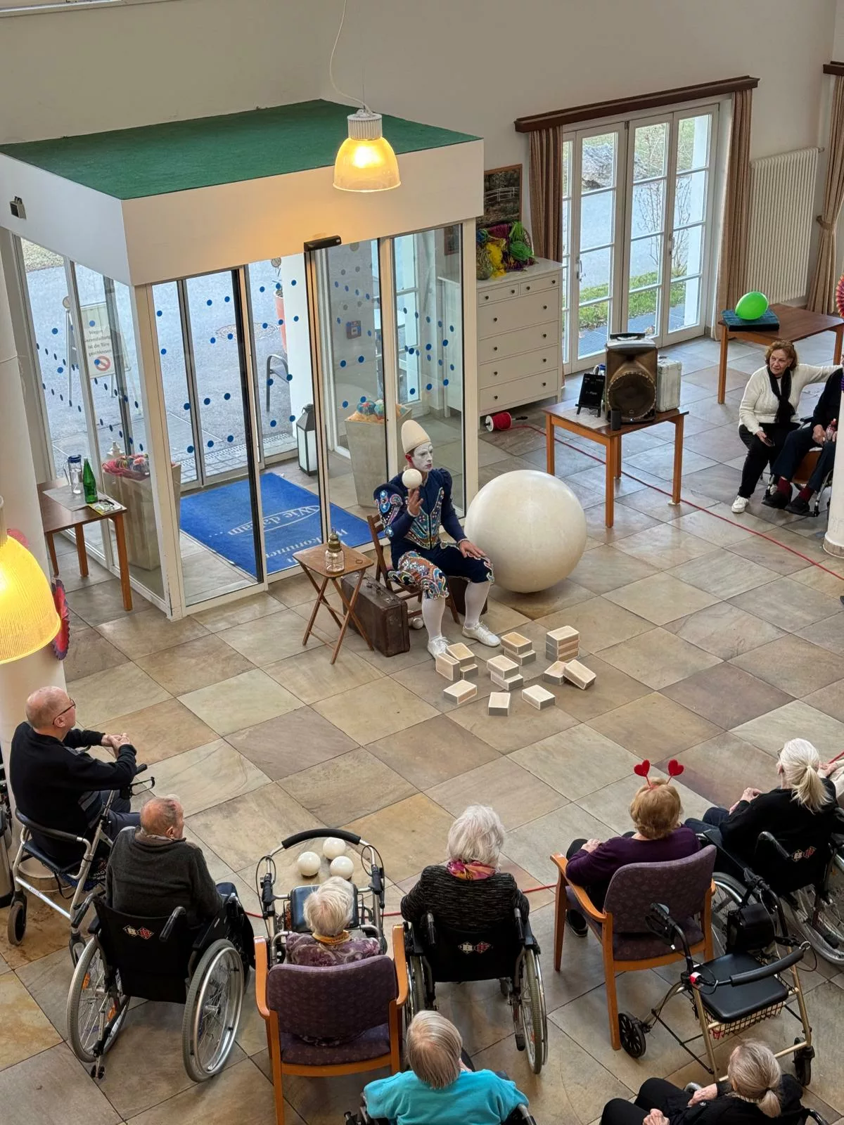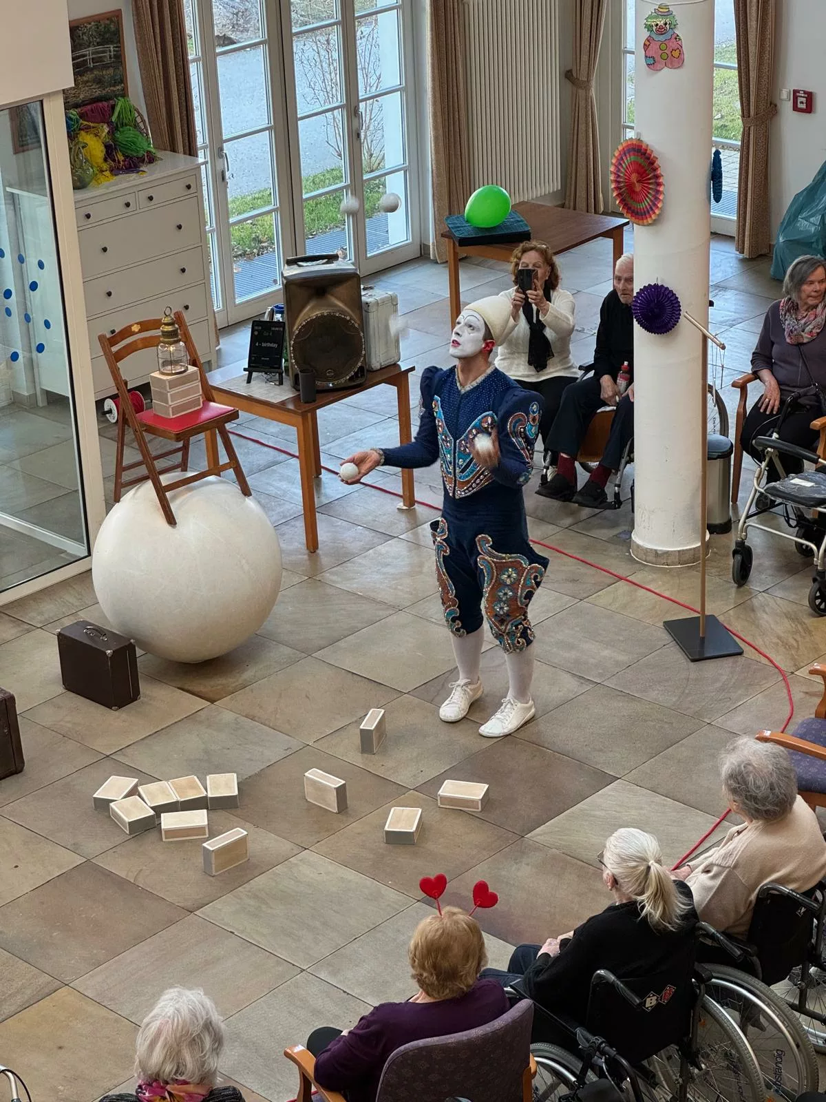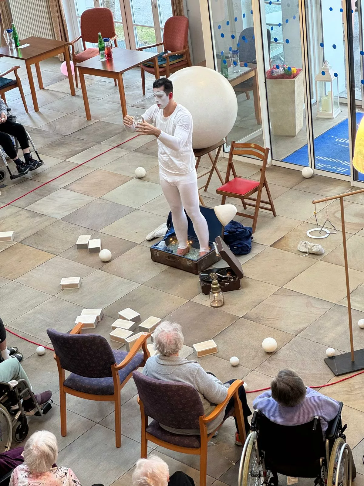 Um den Bewohnern und Bewohnerinnen das Handwerk des Weißclowns näher zu bringen gab es im Anschluss noch die Möglichkeit sich mit dem Künstler auszutauschen und Fragen zu stellen.