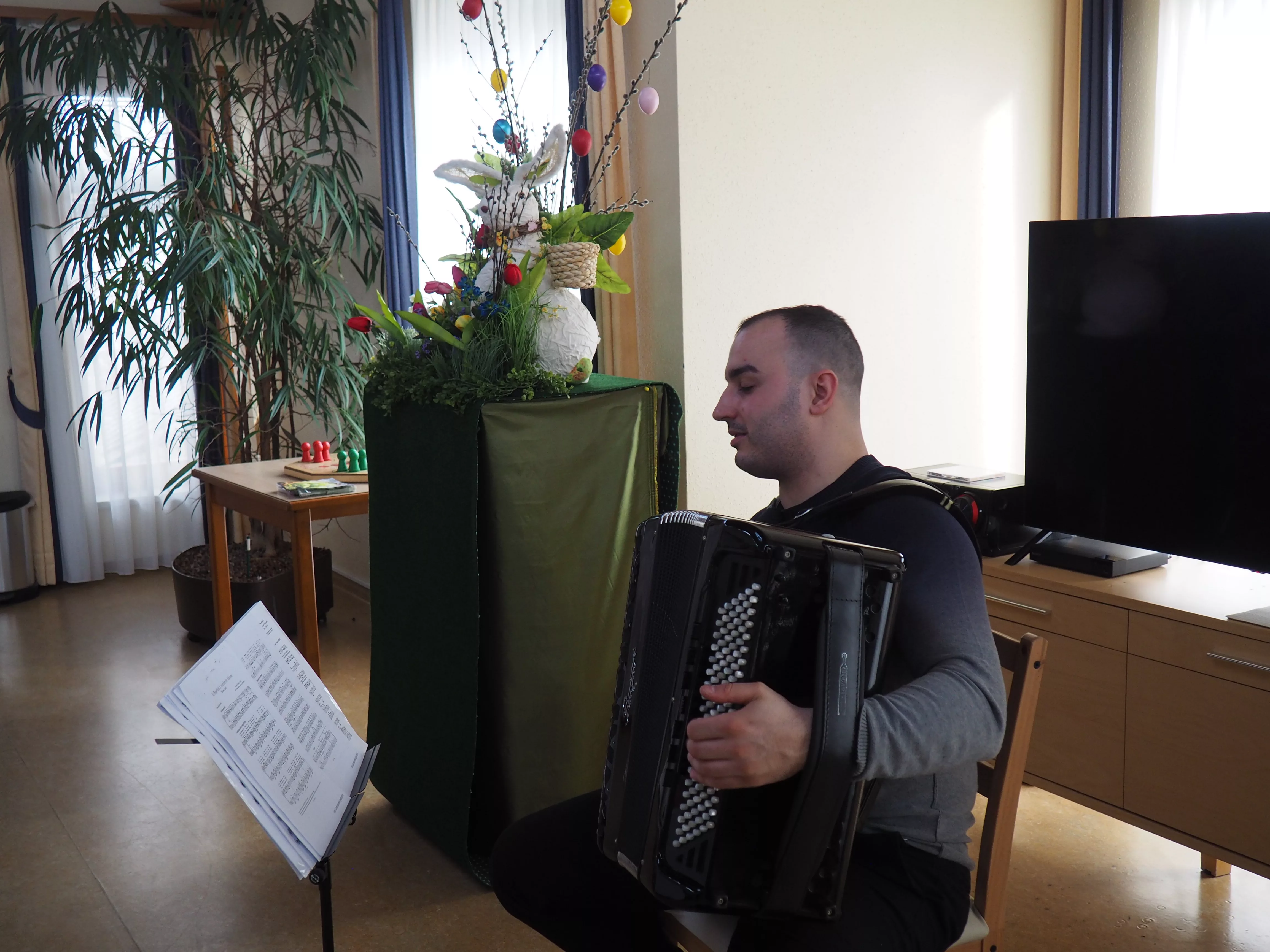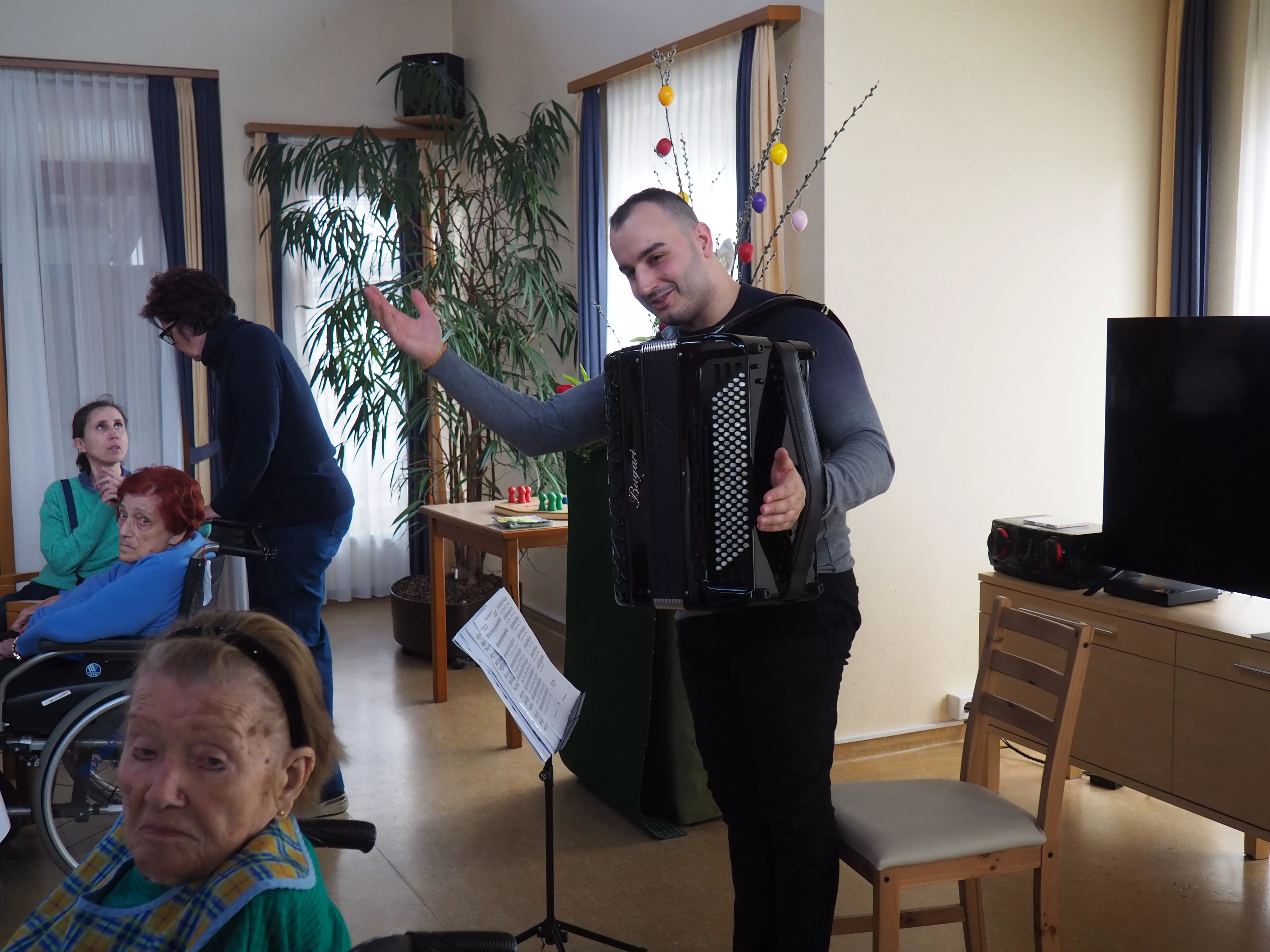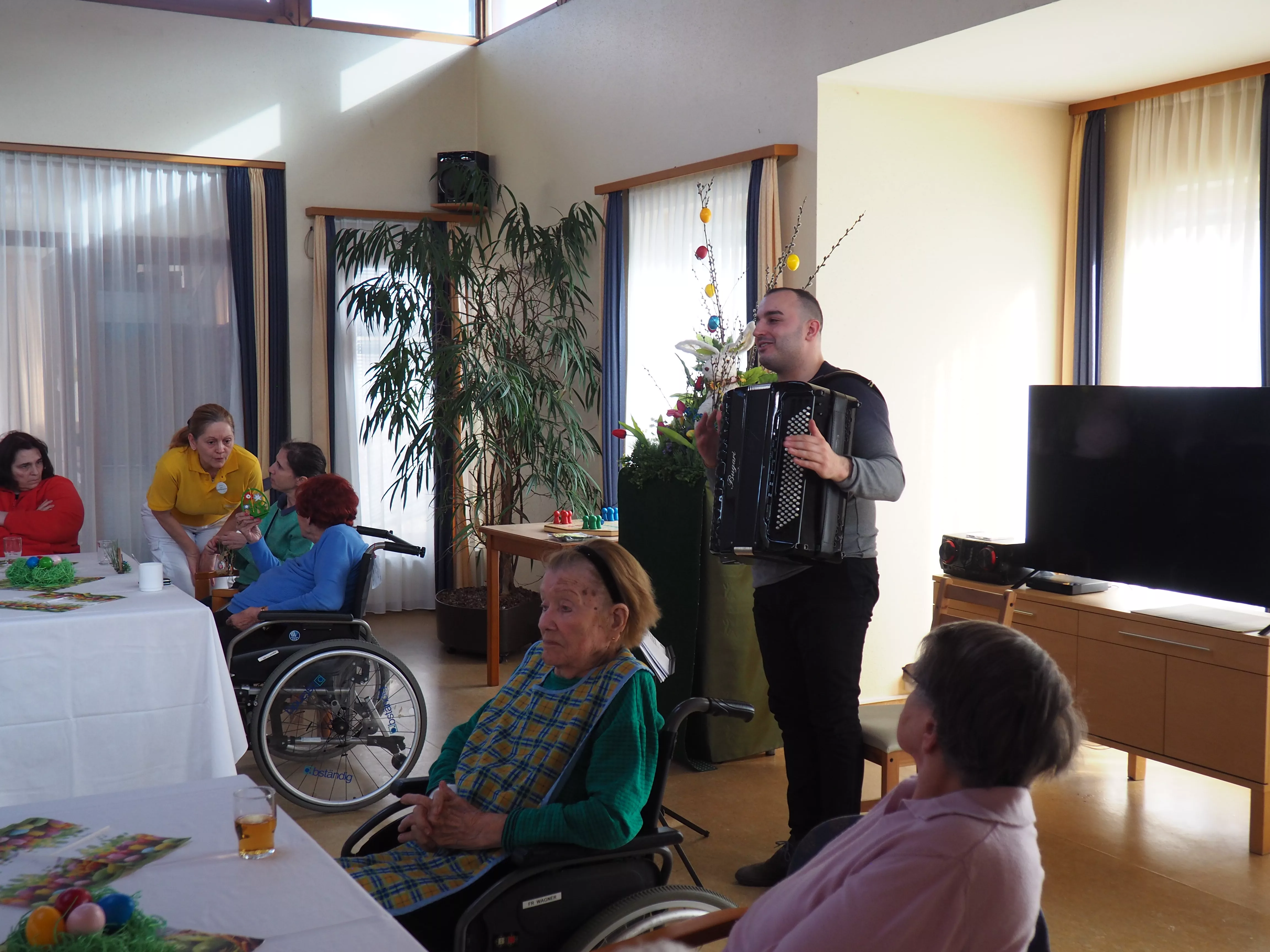 Unser diesjähriger Osterbasar war ein voller Erfolg. Die von den Bewohnerinnen und Bewohnern selbstgebastelten Osterdekorationen wurden vollständig verkauft. Für die musikalische Umrahmung sorgte Herr Djordje Davidovic mit seinem Akkordeon, womit er den Bewohnerinnen und Bewohnern sowie den Gästen einen Tanz aufzwang.