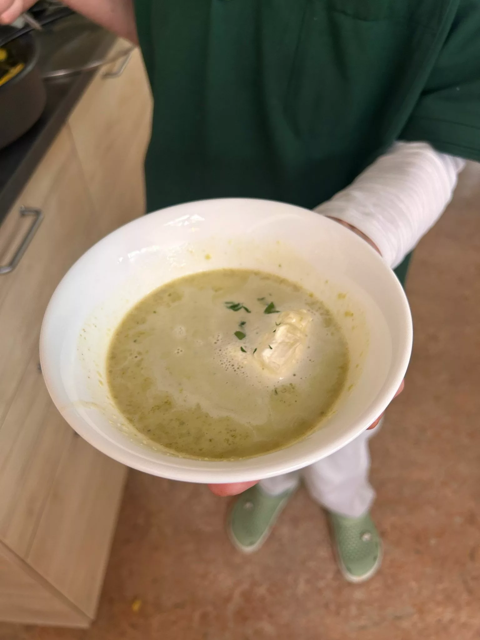 Bei unserer heutigen Geburtstagsfeier der Märzkinder gab es eine herzhafte Bärlauchsuppe und Pariser Schnitzel mit Petersielkartoffeln .