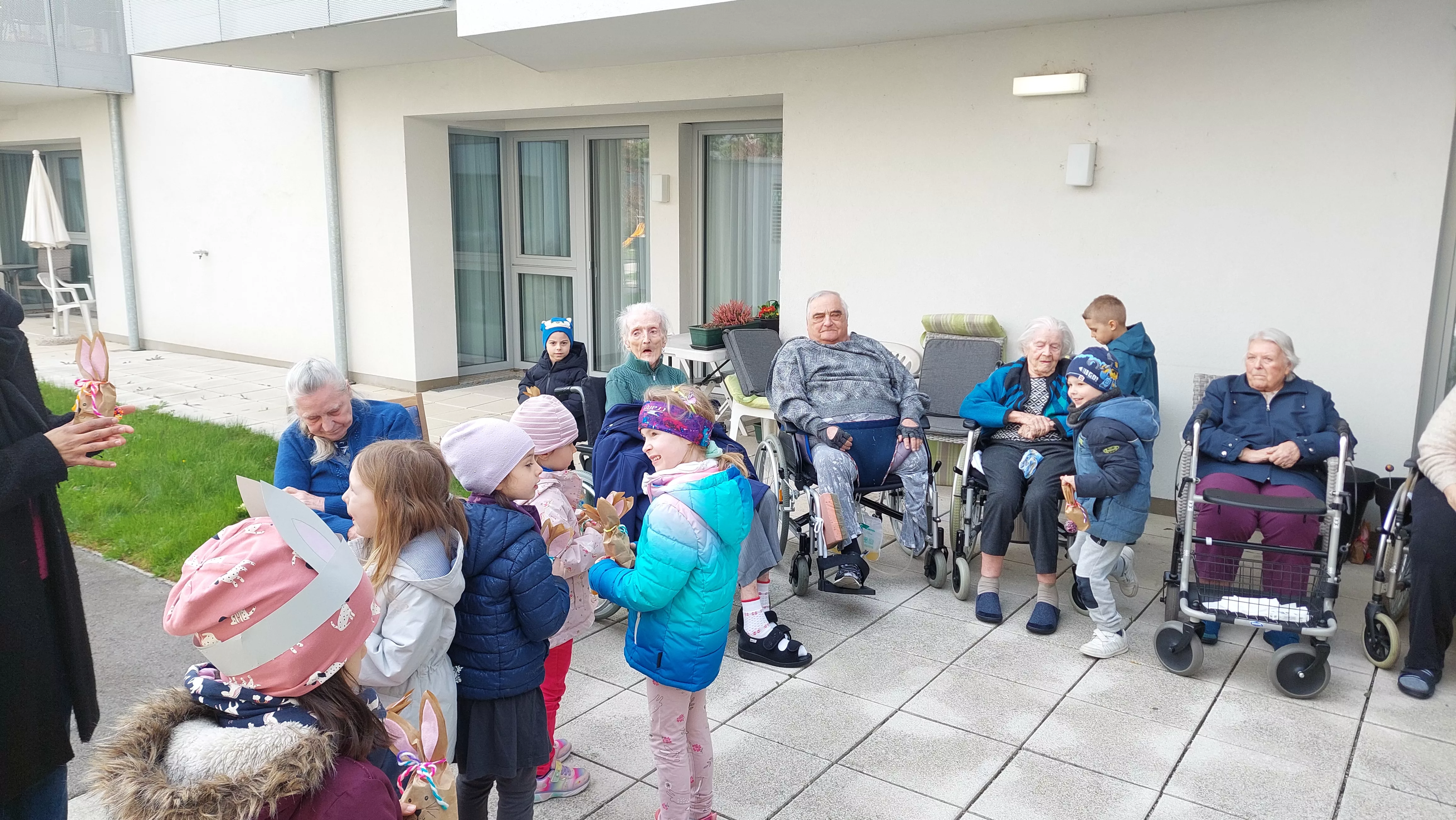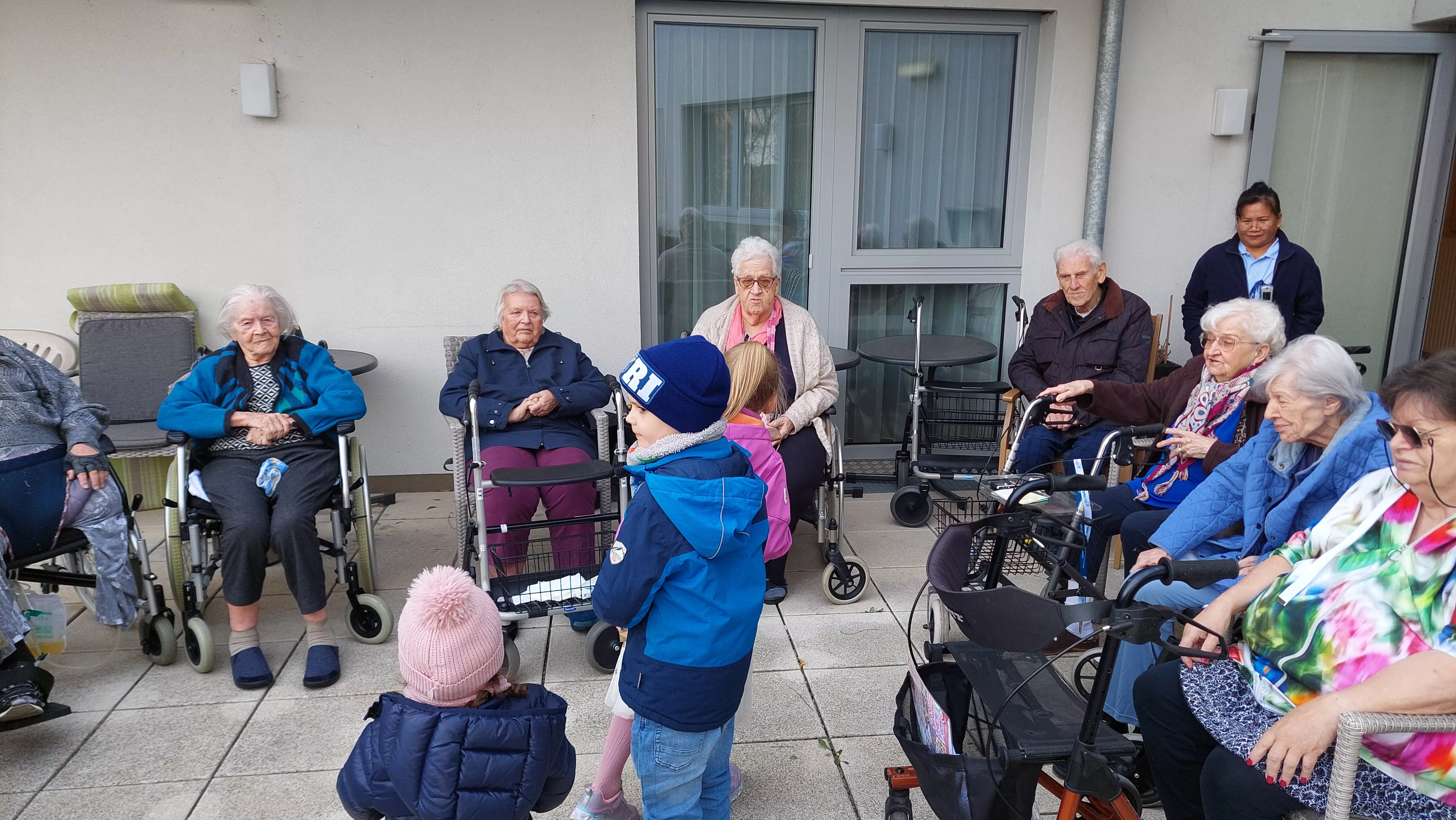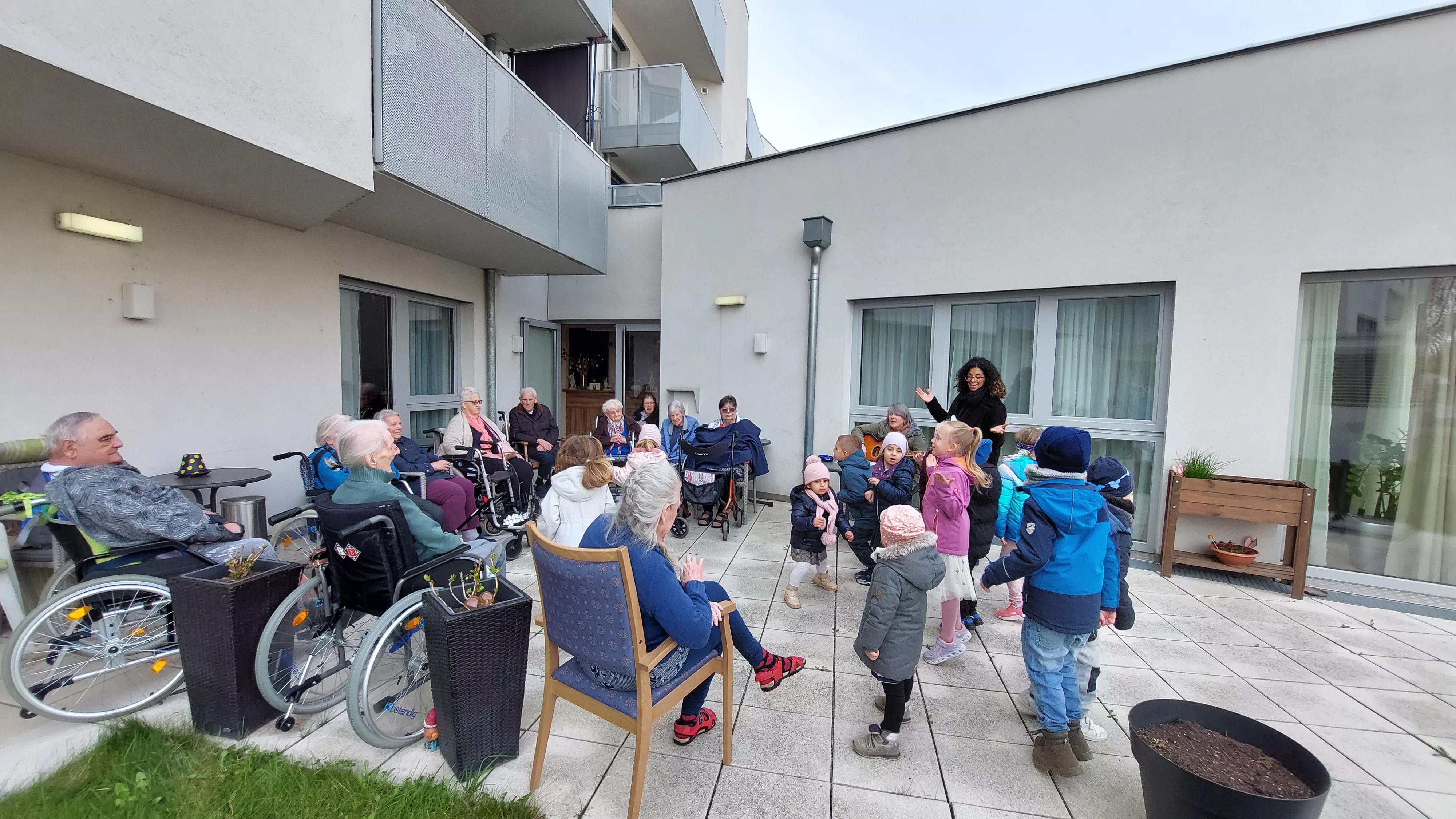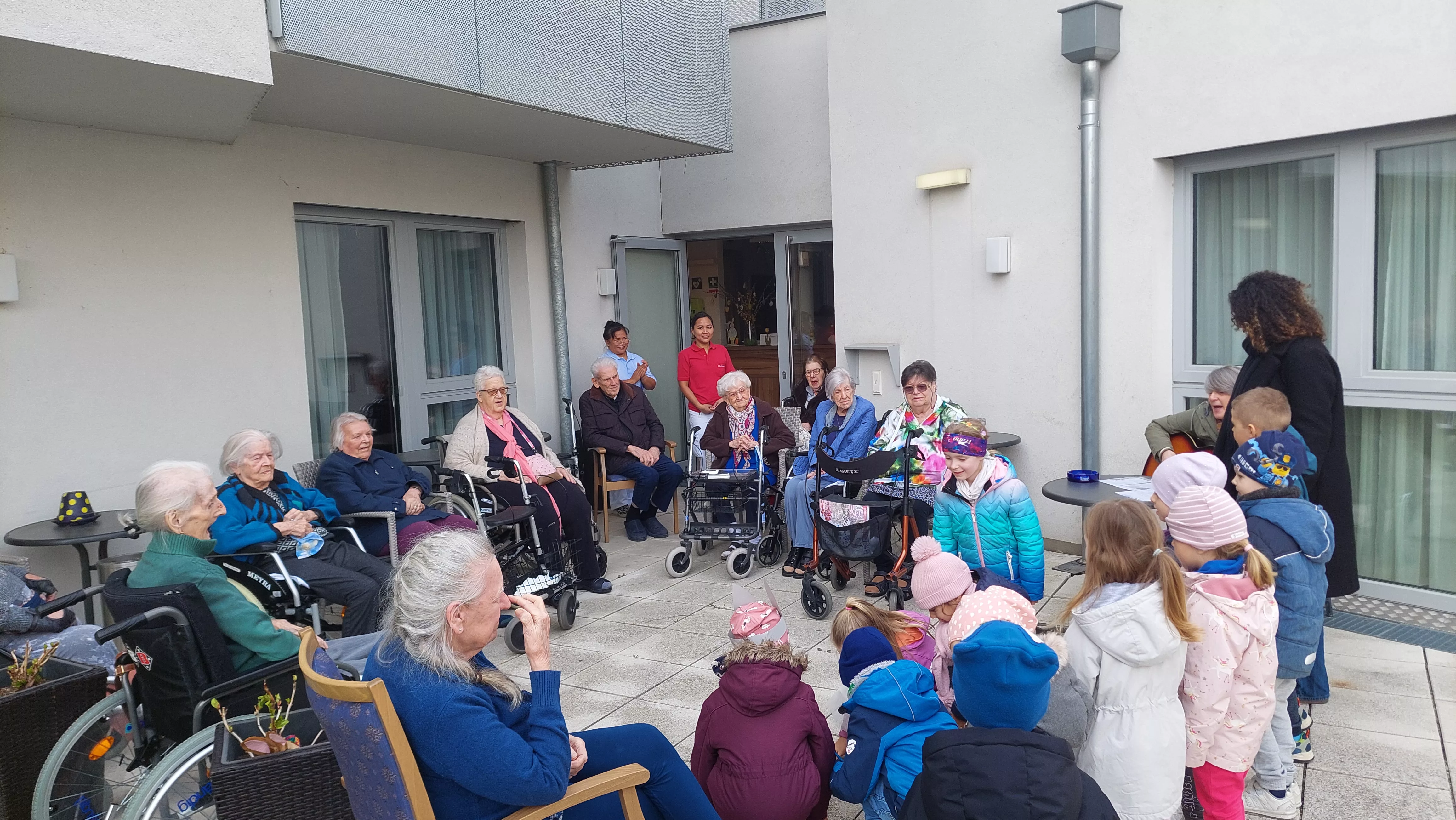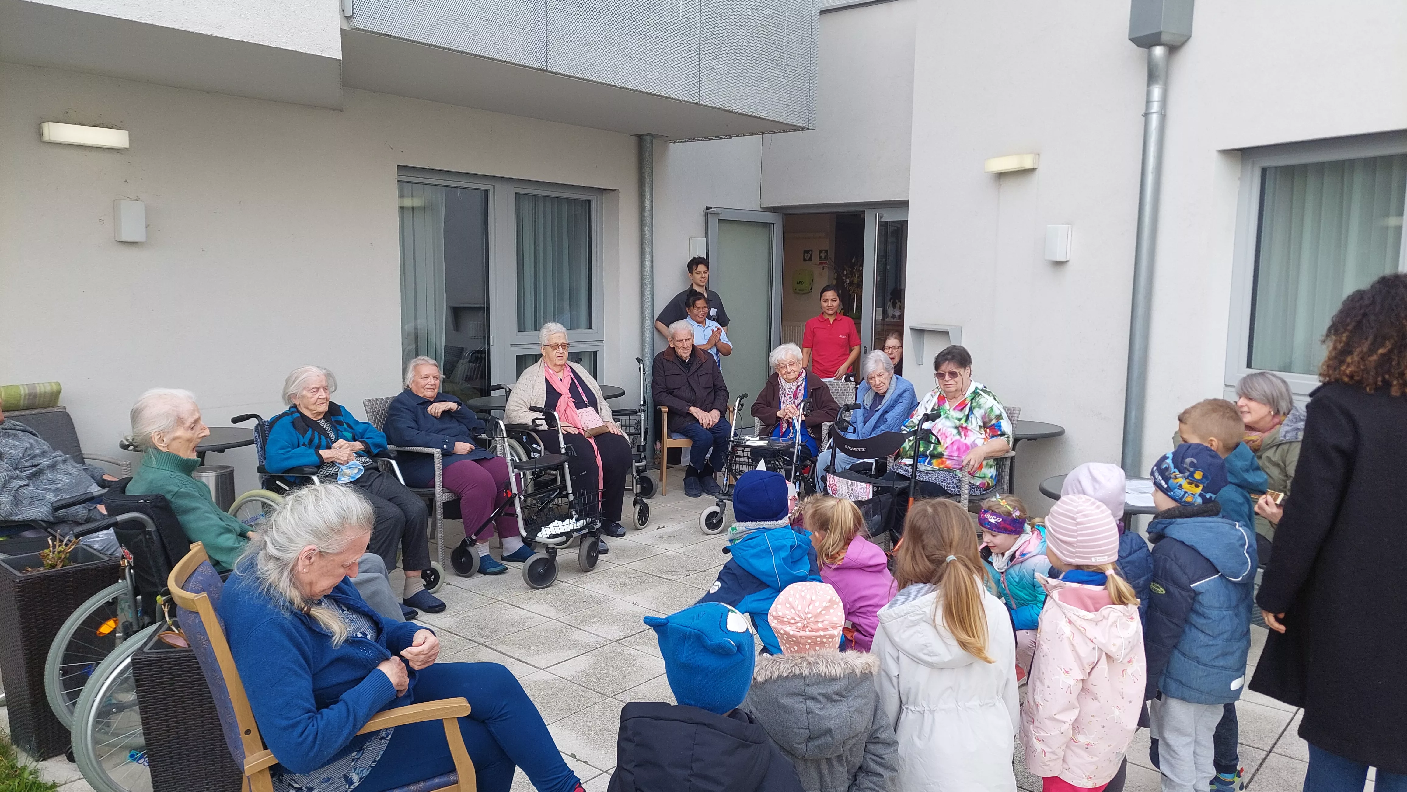 im Generationendorf Töllergarten Wir freuen uns sehr, dass die Kindergartengruppe KIWI bei uns zu Besuch war. Die Kinder haben unsere Bewohnerinnen und Bewohner mit einem wunderschönen Tanz und Gesang erfreut.