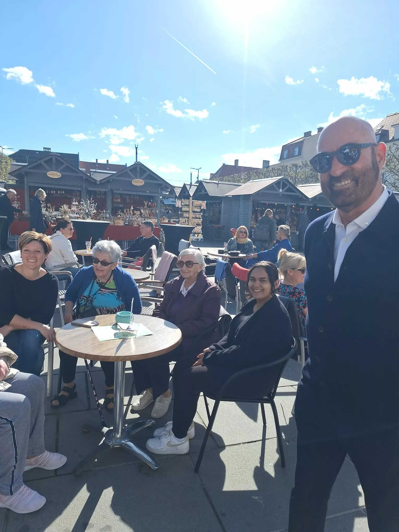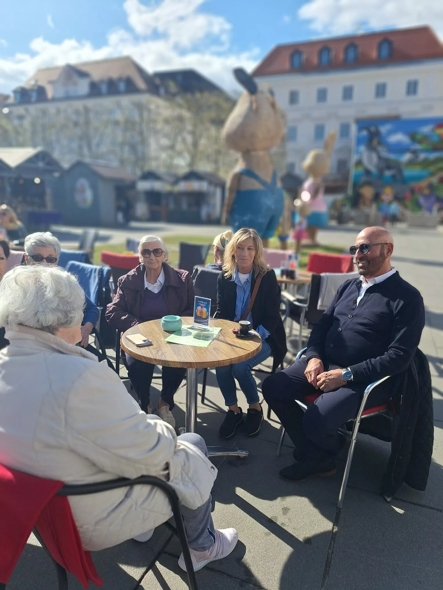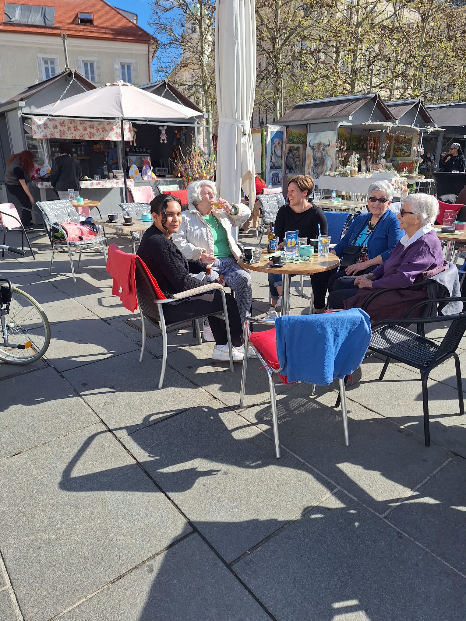 Besonders gefreut haben sich alle über das persönliche Treffen mit KommR Otto Scheiflinger dem Eigentümer und Geschäftsführer der „Wie daham…“ Senioren und Pflegezentren. Bei einer Tasse Kaffee nutzten wir die Gelegenheit zum Austausch, während wir das herrliche Wetter genossen und das bunte Markttreiben auf uns wirken ließen.