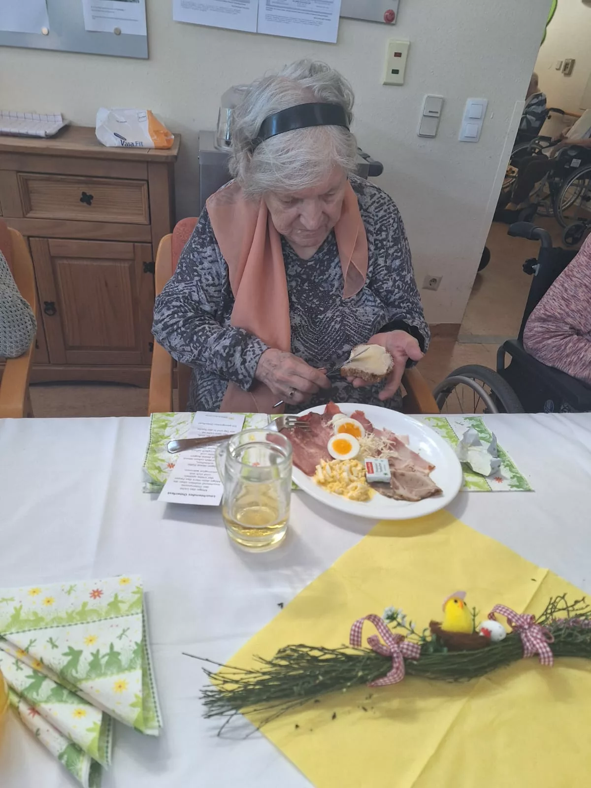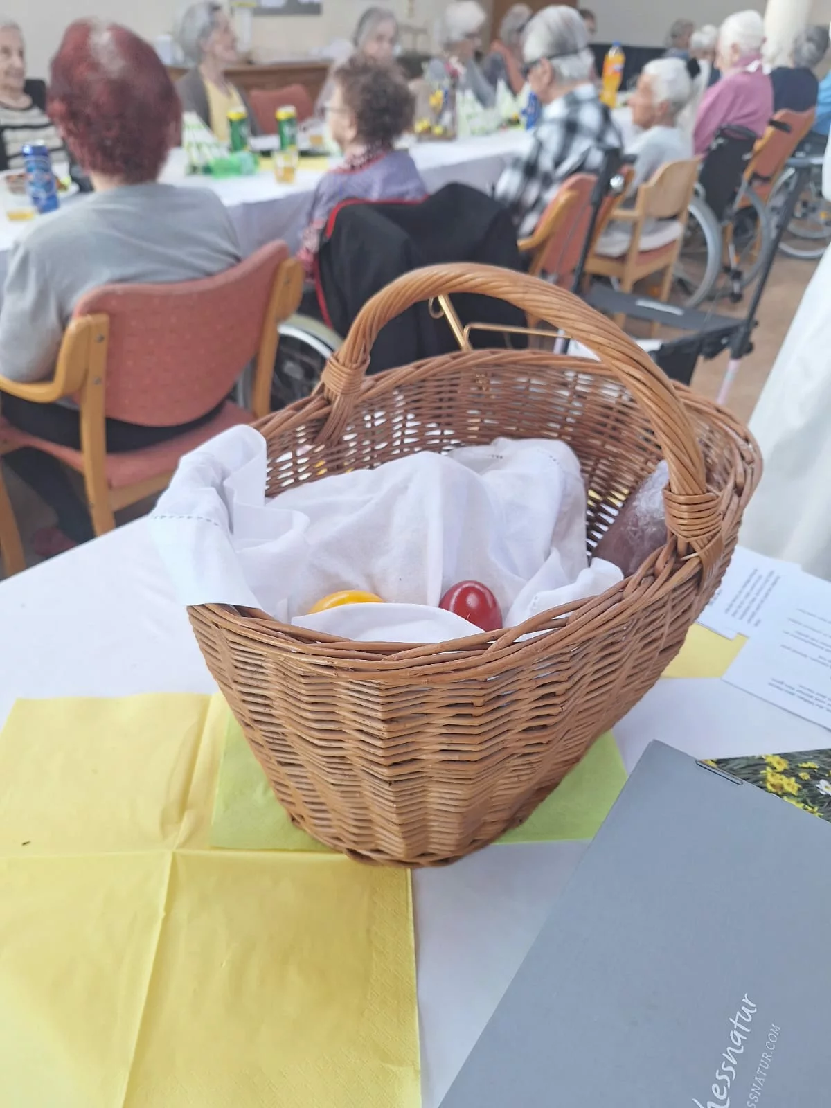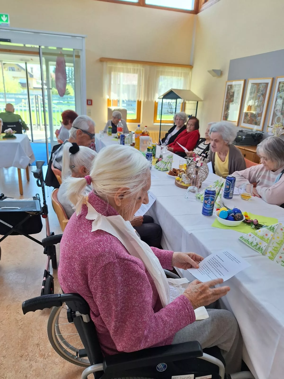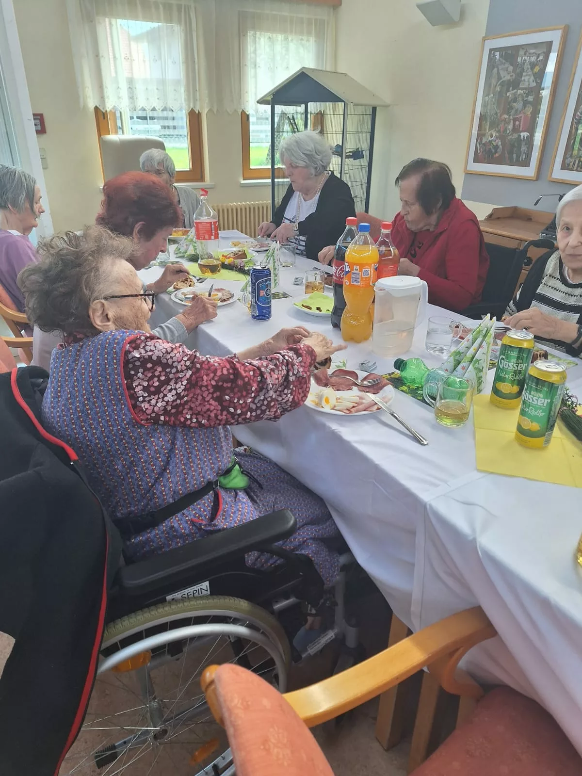 Im „Wie daham“ Generationenpark Welzenegg wurde Ostern ausgiebig gefeiert: Schön geschmückte Tische mit liebevoller Osterdekoration sorgten für eine fröhliche Atmosphäre. Die Bewohnerinnen und Bewohner genossen eine köstliche Osterjause mit Eierkren, Osterschinken, Selchwürste und Zunge – alles, was dazugehört. Festlich gekleidet und mit vielen lachenden Gesichtern wurde der Tag zu einem rundum gelungenen Fest für alle.