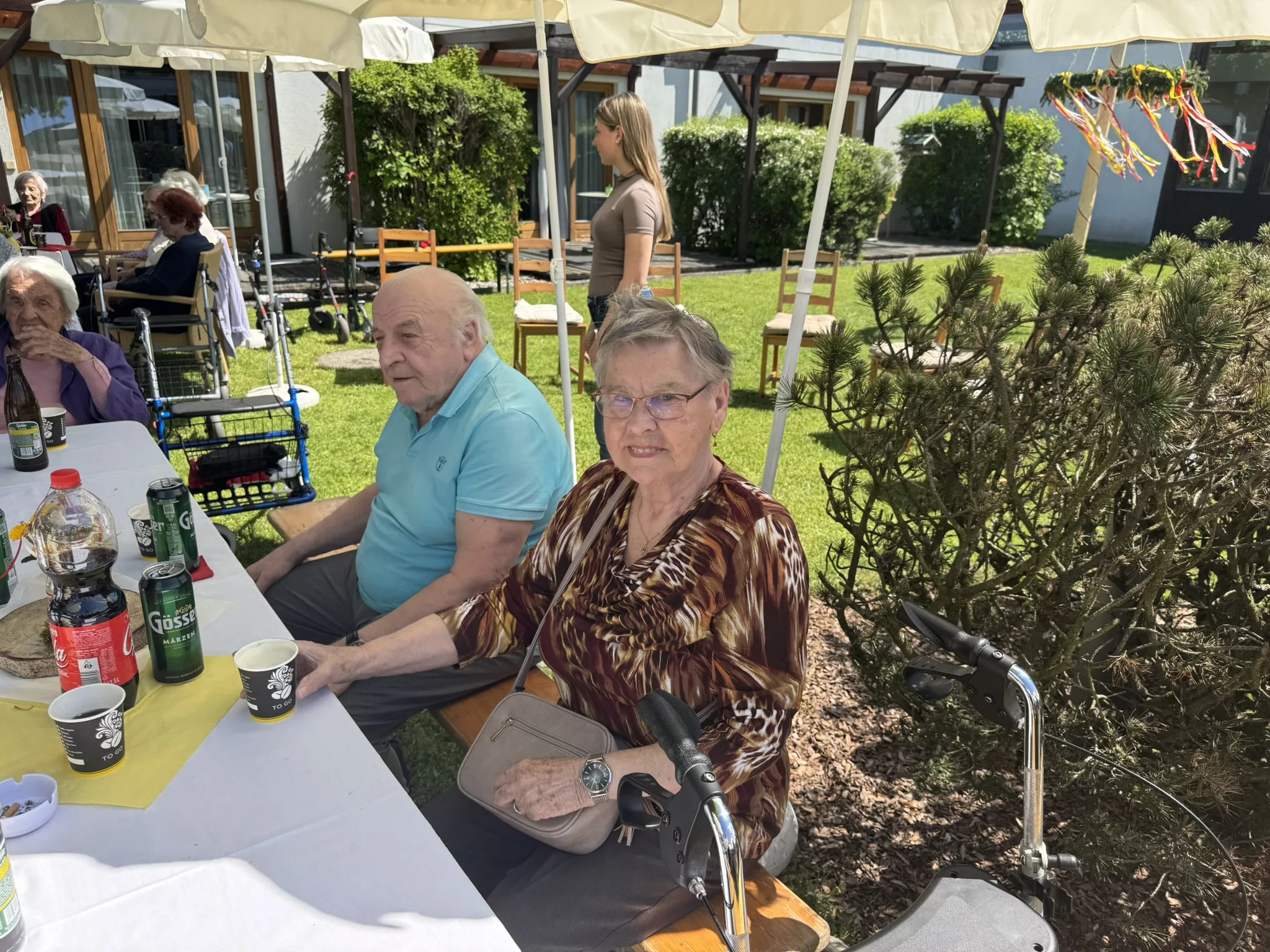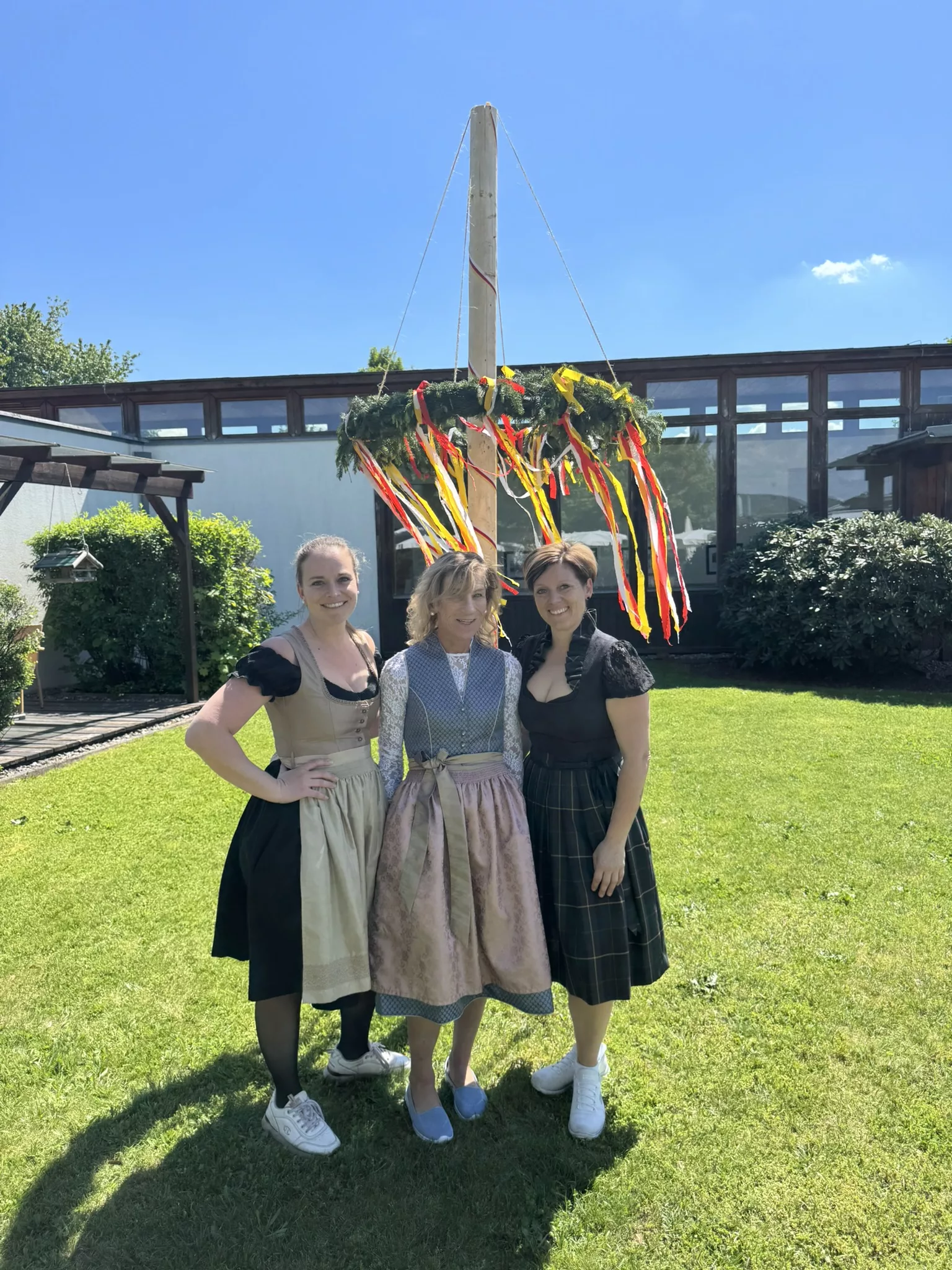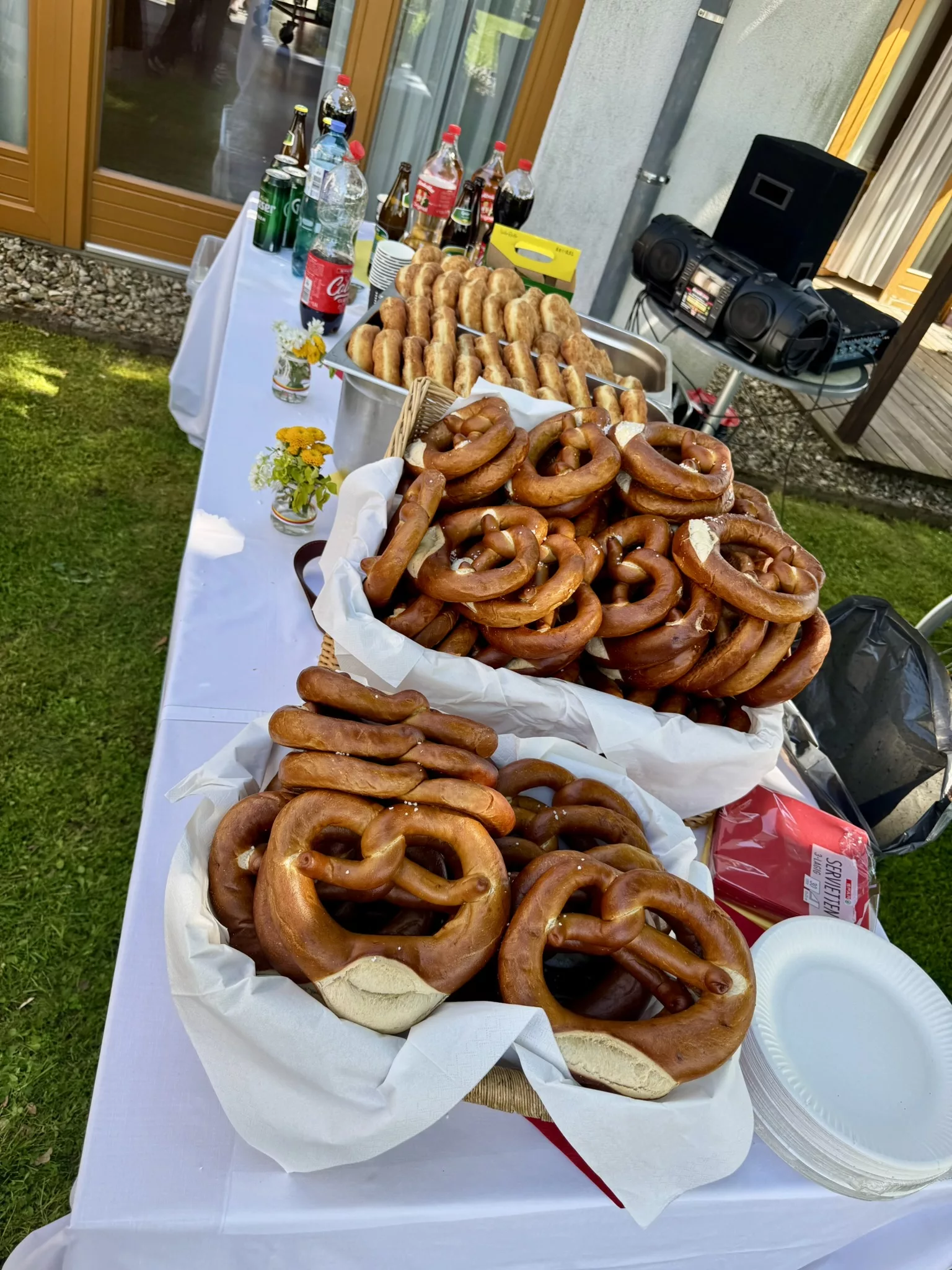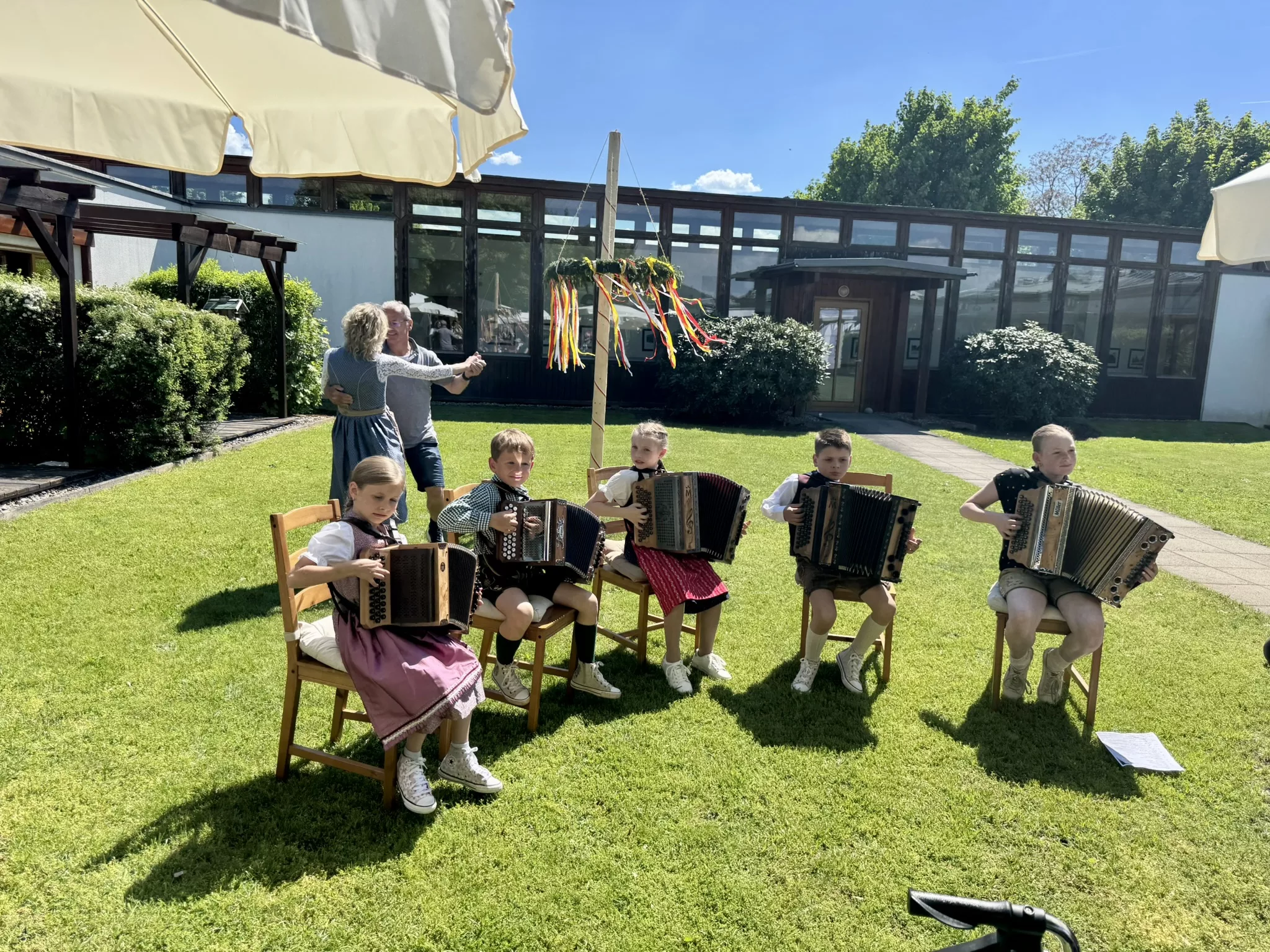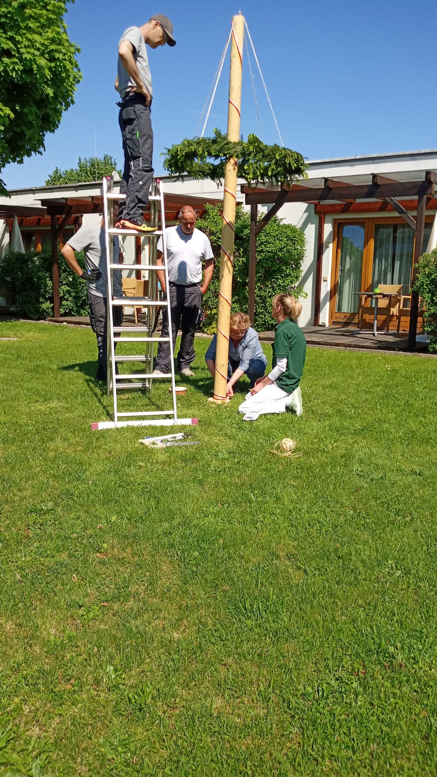 Neben der Musik sorgten kühle Getränke, frische Bauernkrapfen und knusprige Brezen für das leibliche Wohl. Und natürlich durfte auch ein prächtig geschmückter Maibaum nicht fehlen, der für festliche Stimmung im Innenhof sorgte.