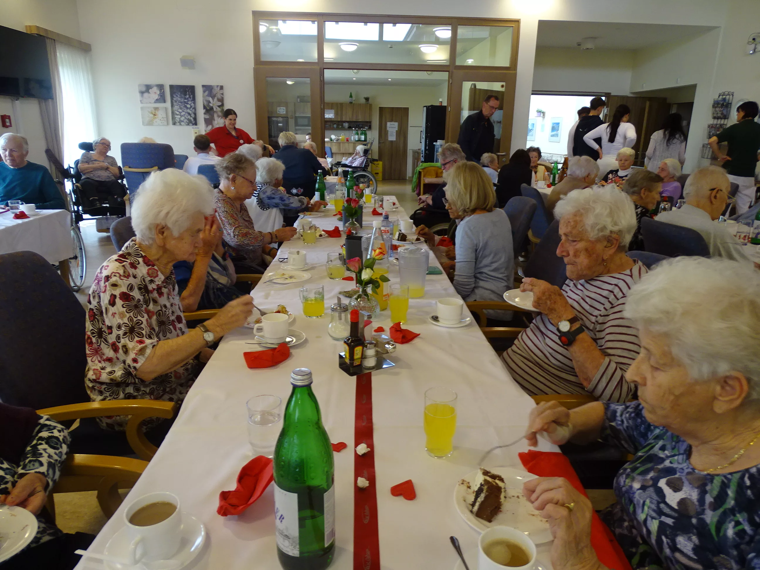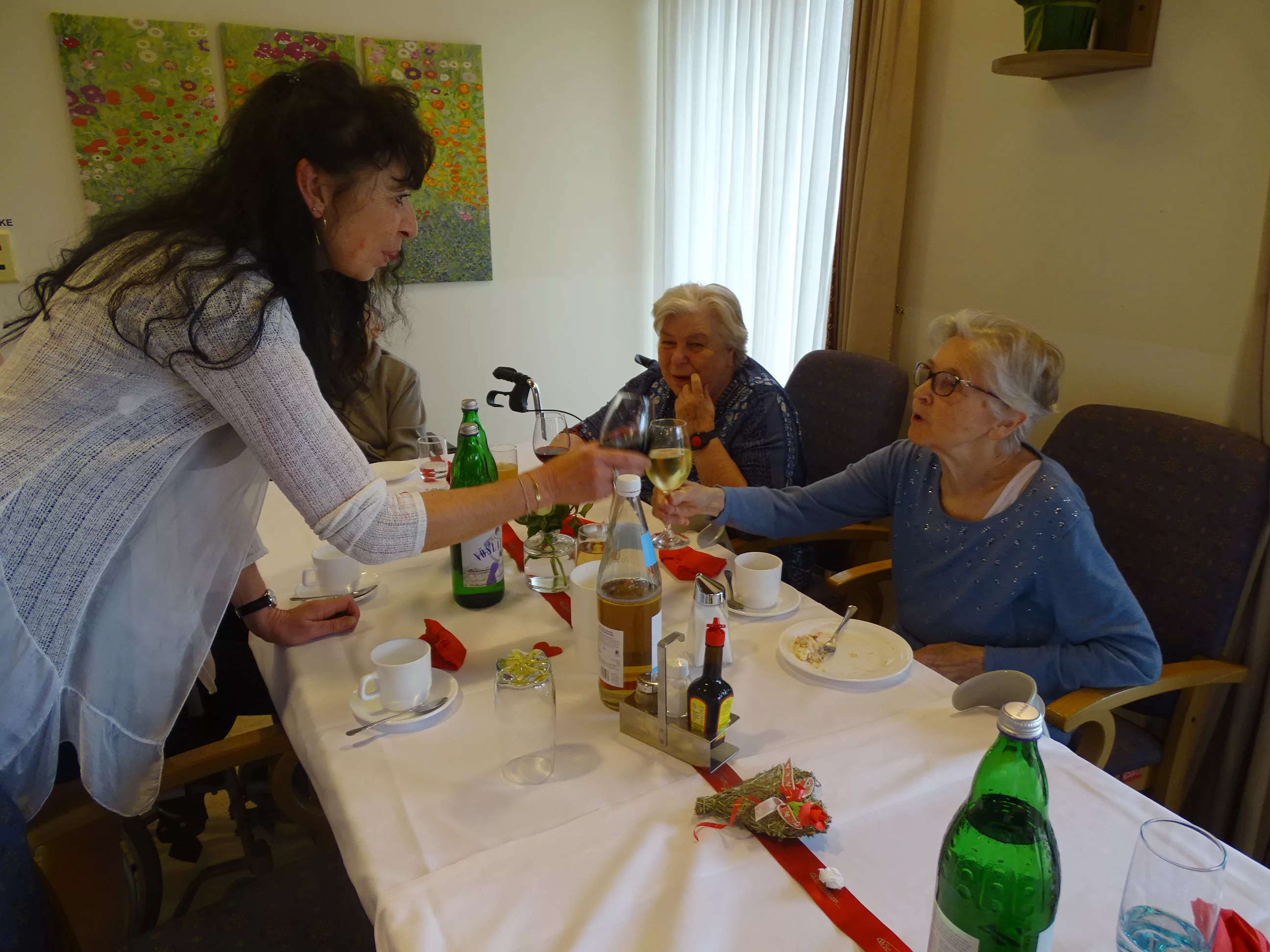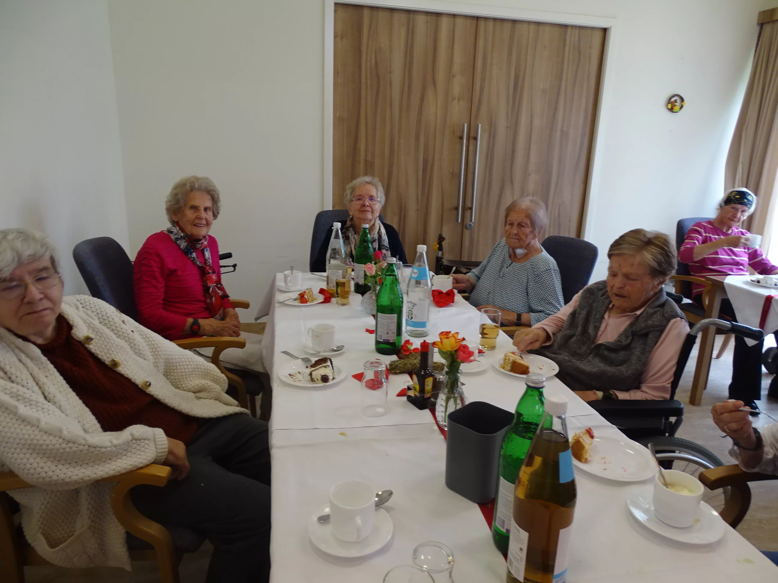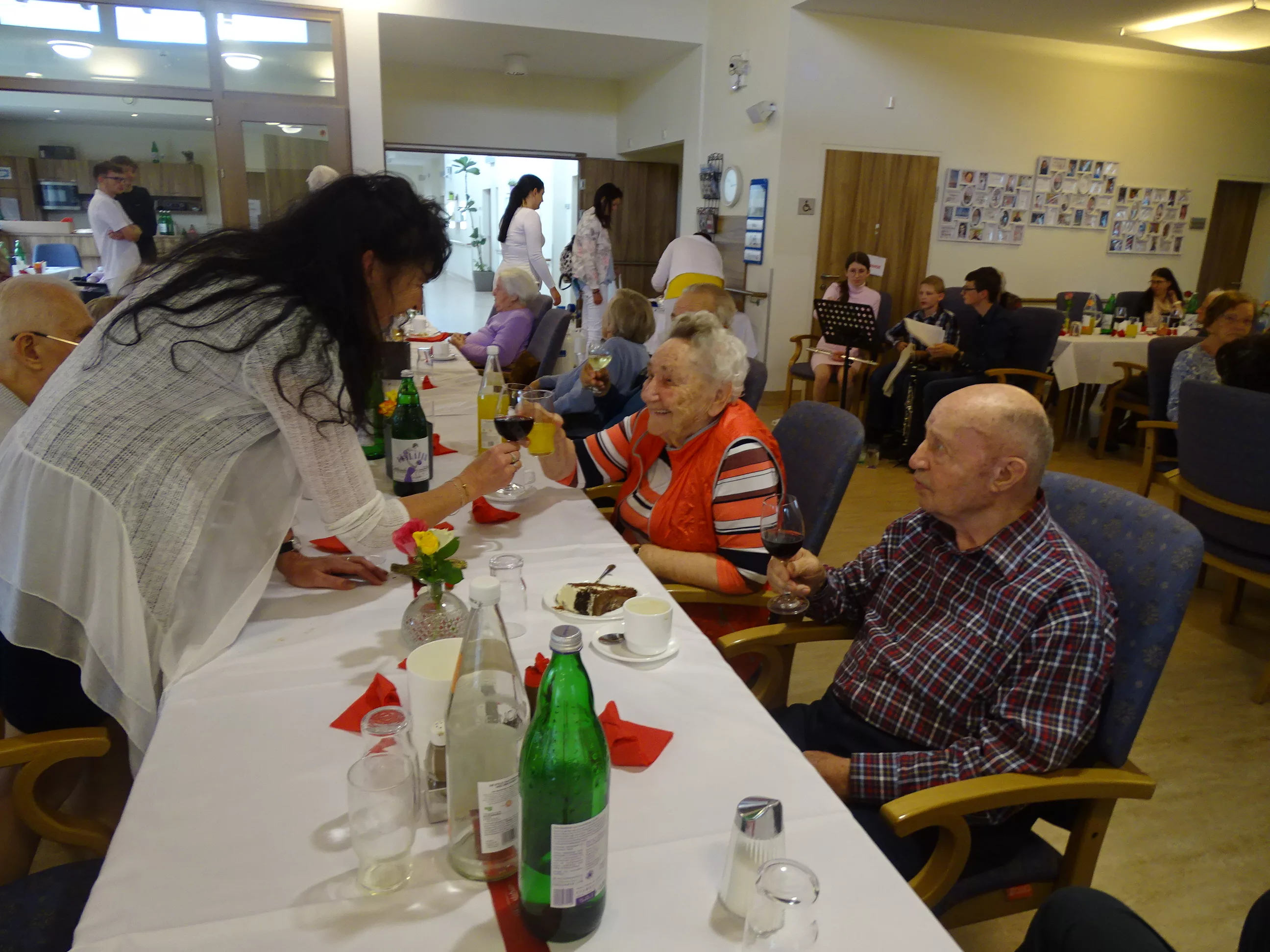Nach dem Essen besuchte uns das Trio Alseto und unsere BewohnerInnen erfreuten sich sehr an ihrer Musik! Unsere Claudia backte sechs verschiedene Torten für unsere Feier, eine besser wie die andere! Mit einem Achterl Wein wurde auf die Mamas, Omas und Uromas angestossen. Es war wieder ein wunderbares Fest im „wie daham Generationenpark Zeltweg“!