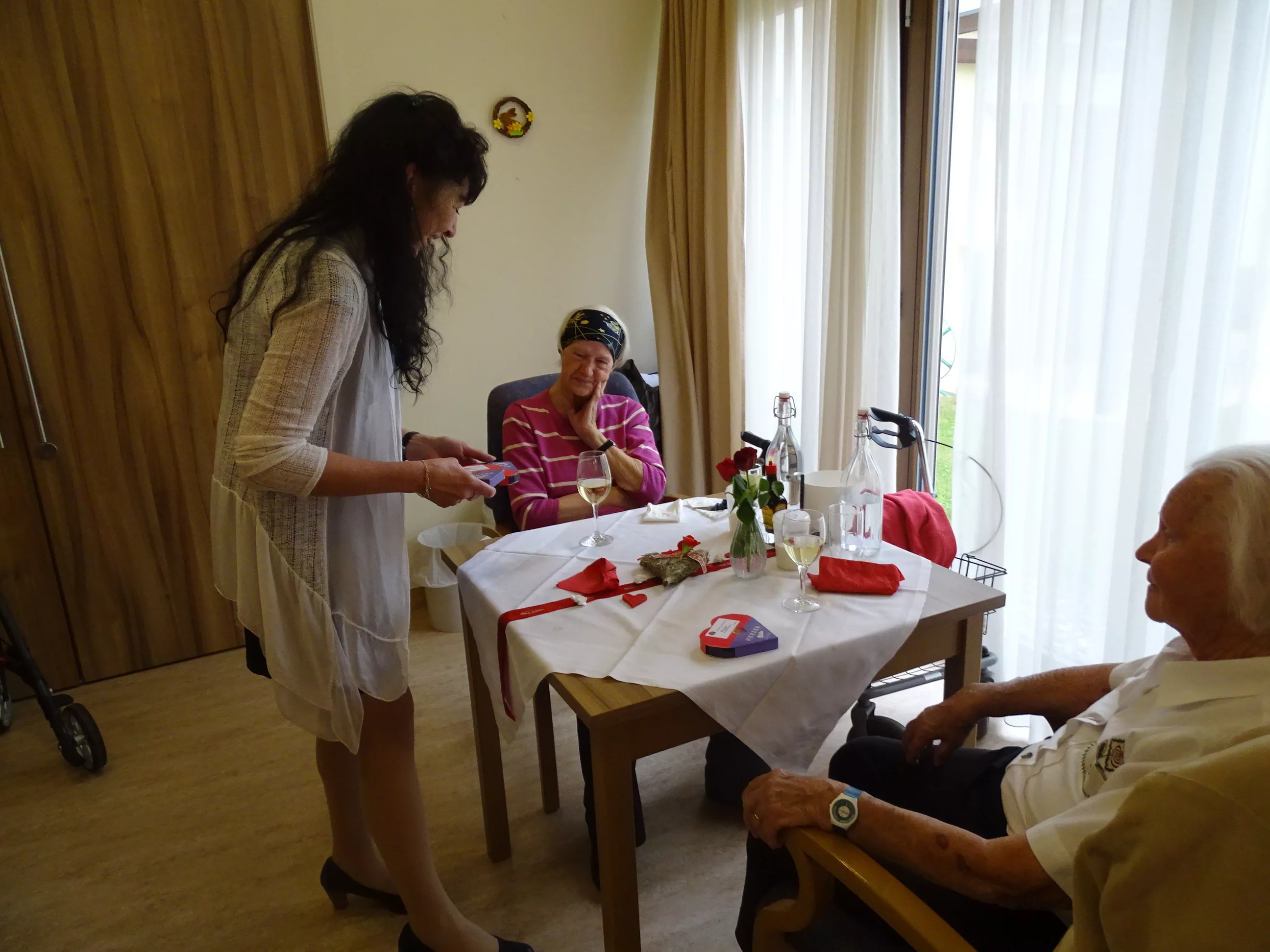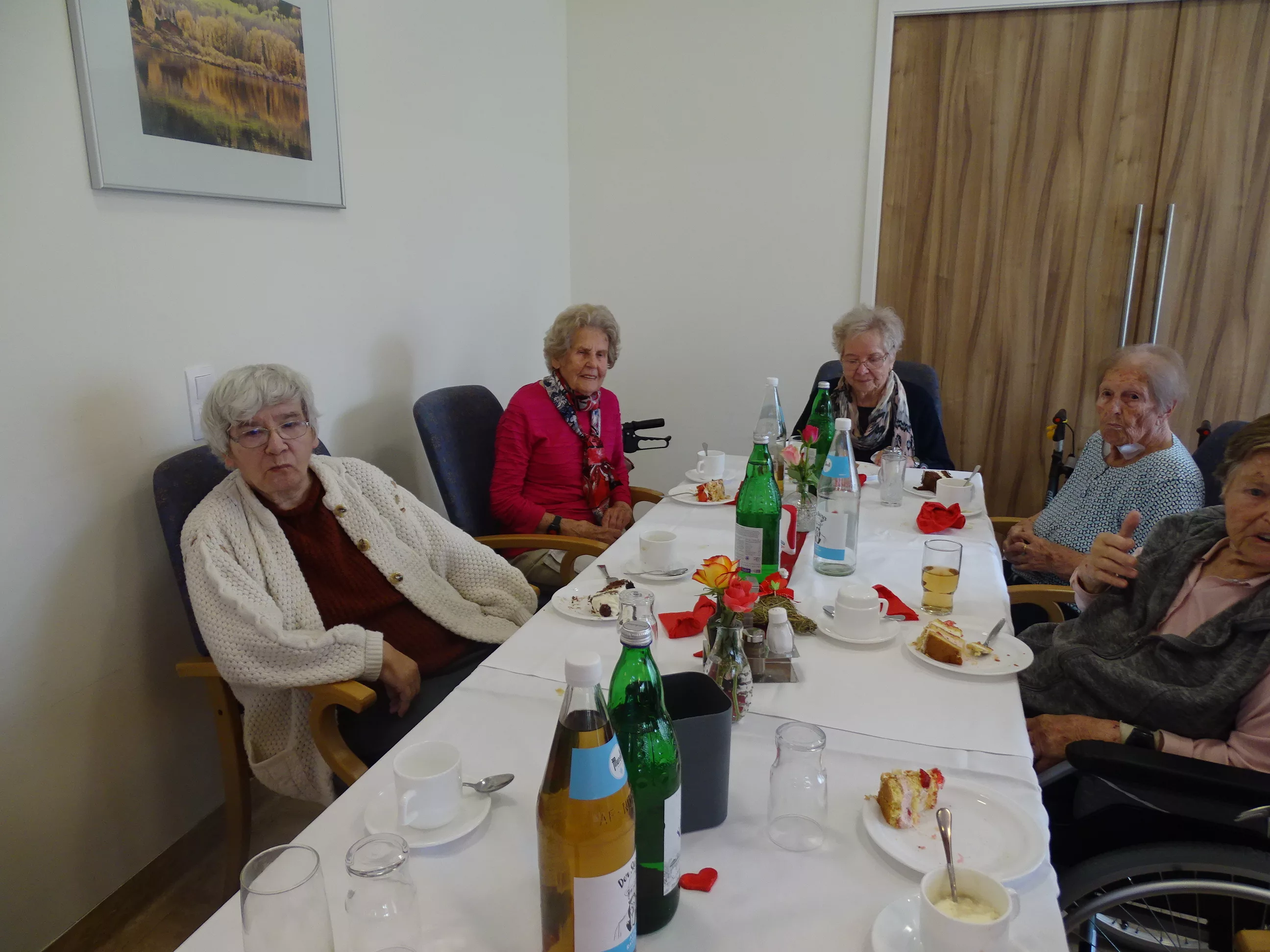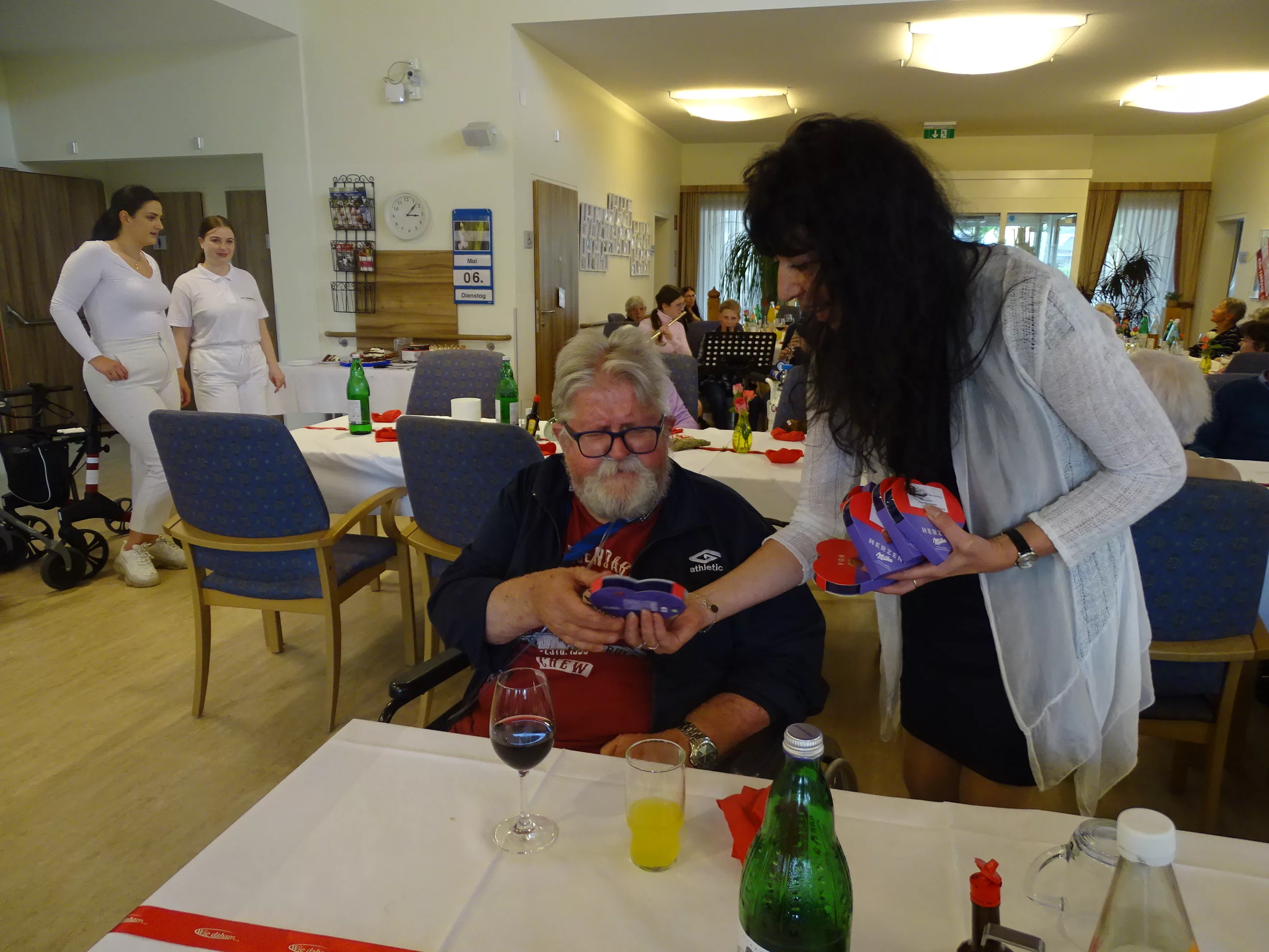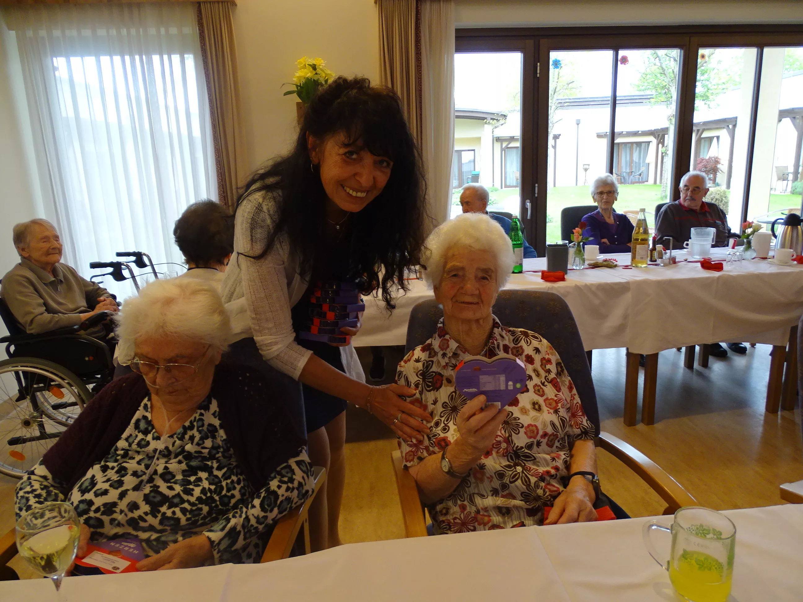 Nach dem Essen besuchte uns das Trio Alseto und unsere BewohnerInnen erfreuten sich sehr an ihrer Musik! Unsere Claudia backte sechs verschiedene Torten für unsere Feier, eine besser wie die andere! Mit einem Achterl Wein wurde auf die Mamas, Omas und Uromas angestossen. Es war wieder ein wunderbares Fest im „wie daham Generationenpark Zeltweg“!