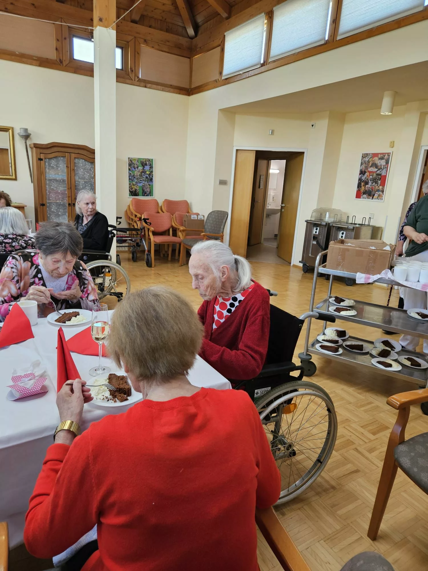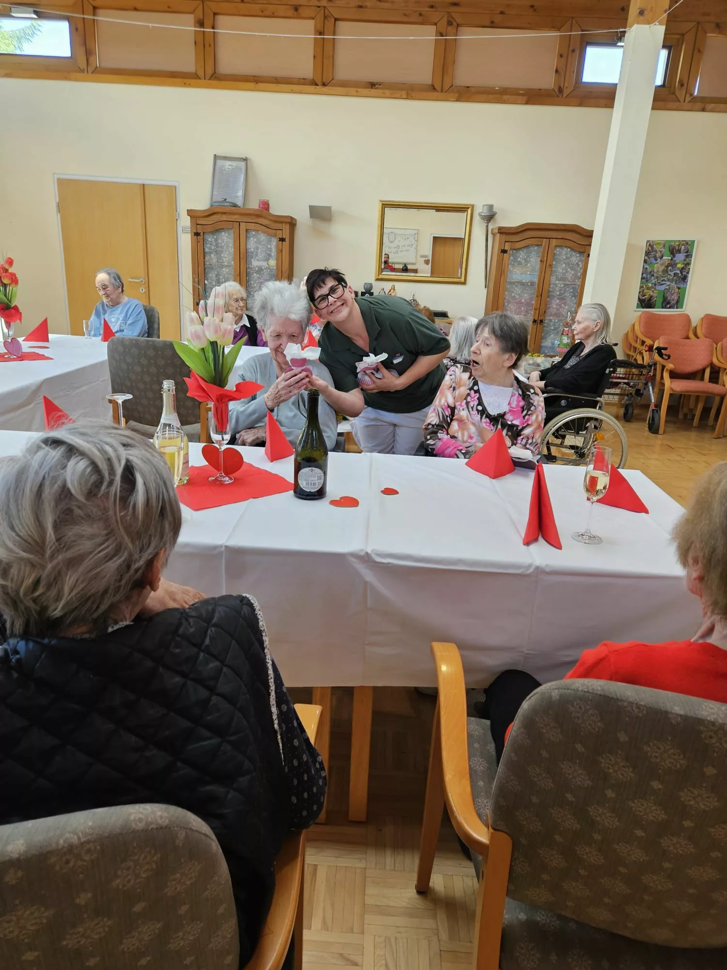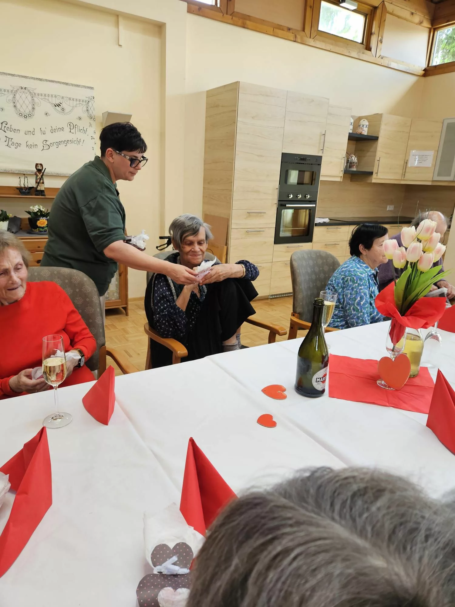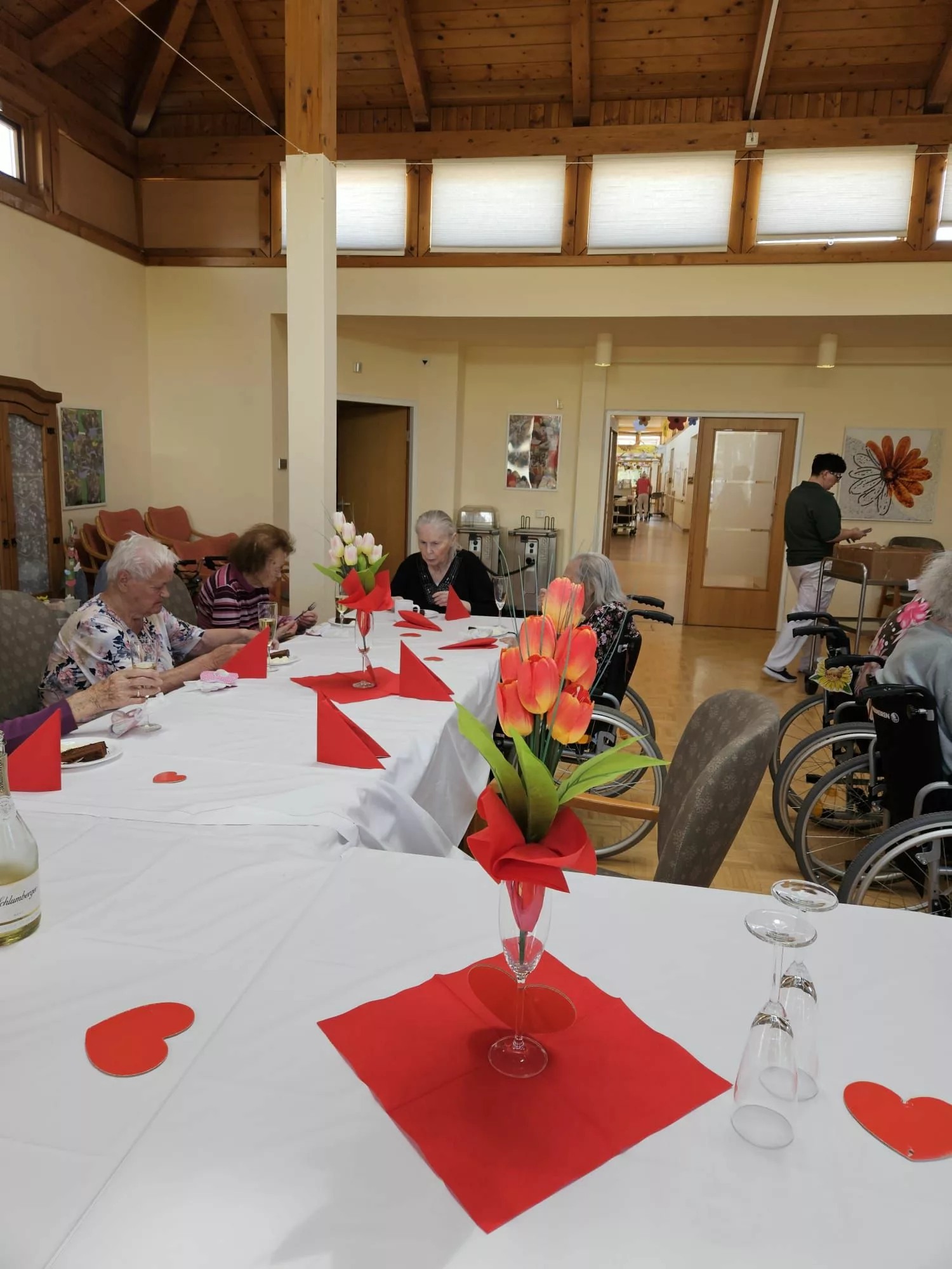 Die Tische waren liebevoll mit Herzen, Tulpen und frischen Blumen dekoriert, die eine fröhliche und festliche Atmosphäre schufen. Bei einem Glas Sekt und köstlicher Sachertorte verbrachten wir gemeinsam einen gemütlichen Nachmittag.