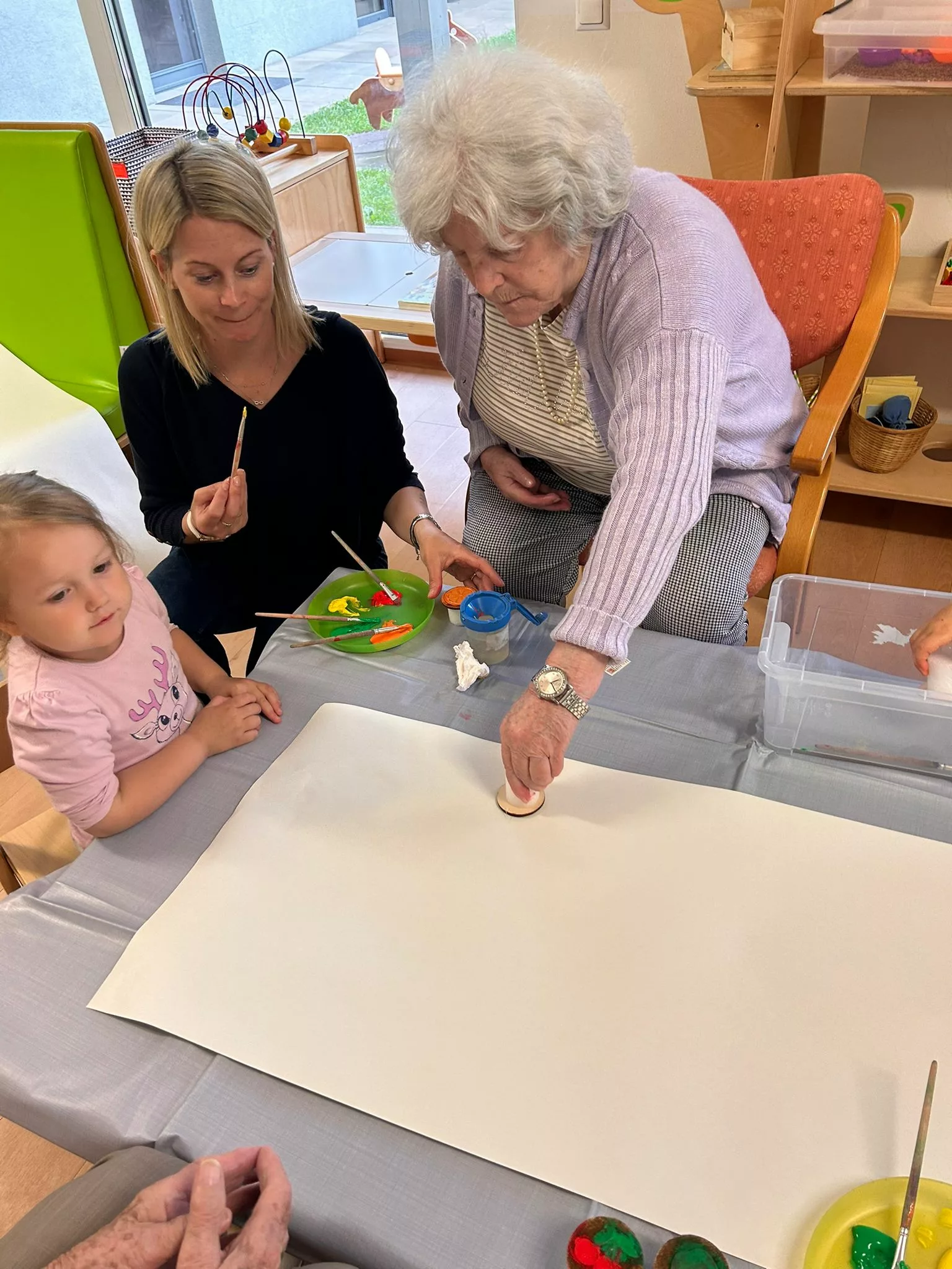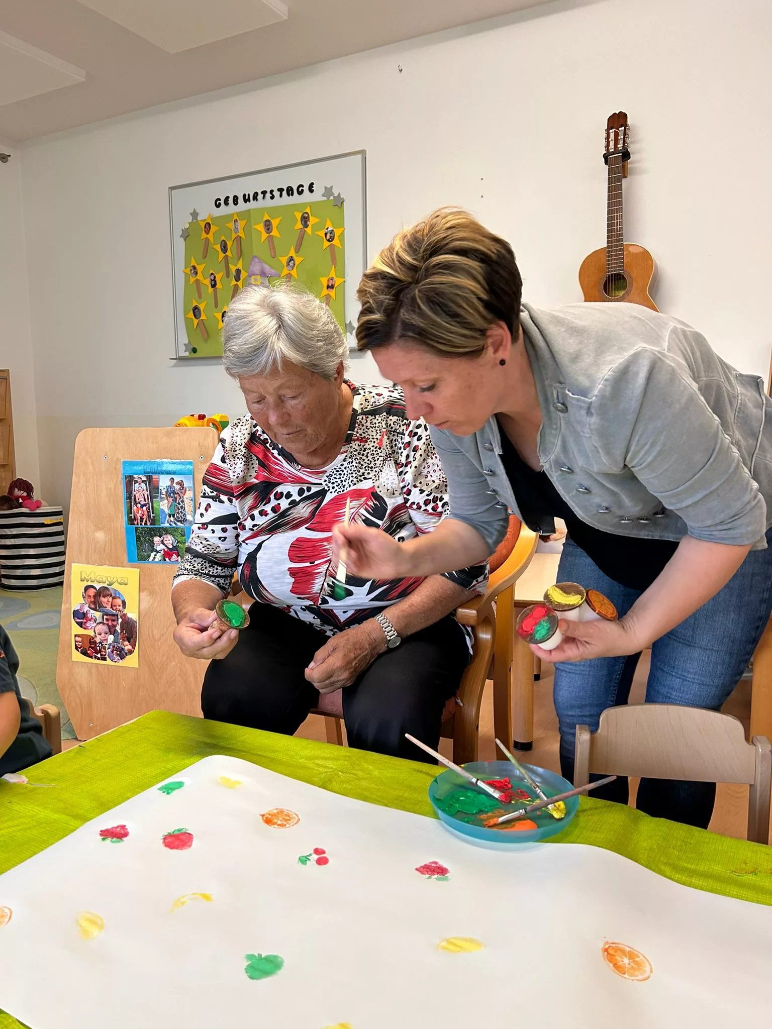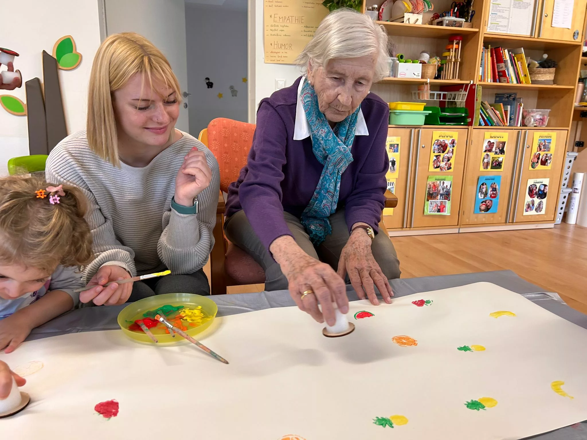 Im Anschluss daran wurde gemeinsam mit den Seniorinnen gebastelt. Für das kommende Sommerfest haben die Kinder zusammen mit den Bewohnerinnen farbenfrohe Tischdecken mit Stempeltechnik gestaltet. Besonders herzerwärmend war dabei zu beobachten, wie liebevoll die Kinder die Seniorinnen begleiteten, sie an die Tische führten und ihnen mit Begeisterung erklärten, was sie nun gemeinsam gestalten würden. Ein schönes Miteinander der Generationen, das alle mit Freude erfüllte.