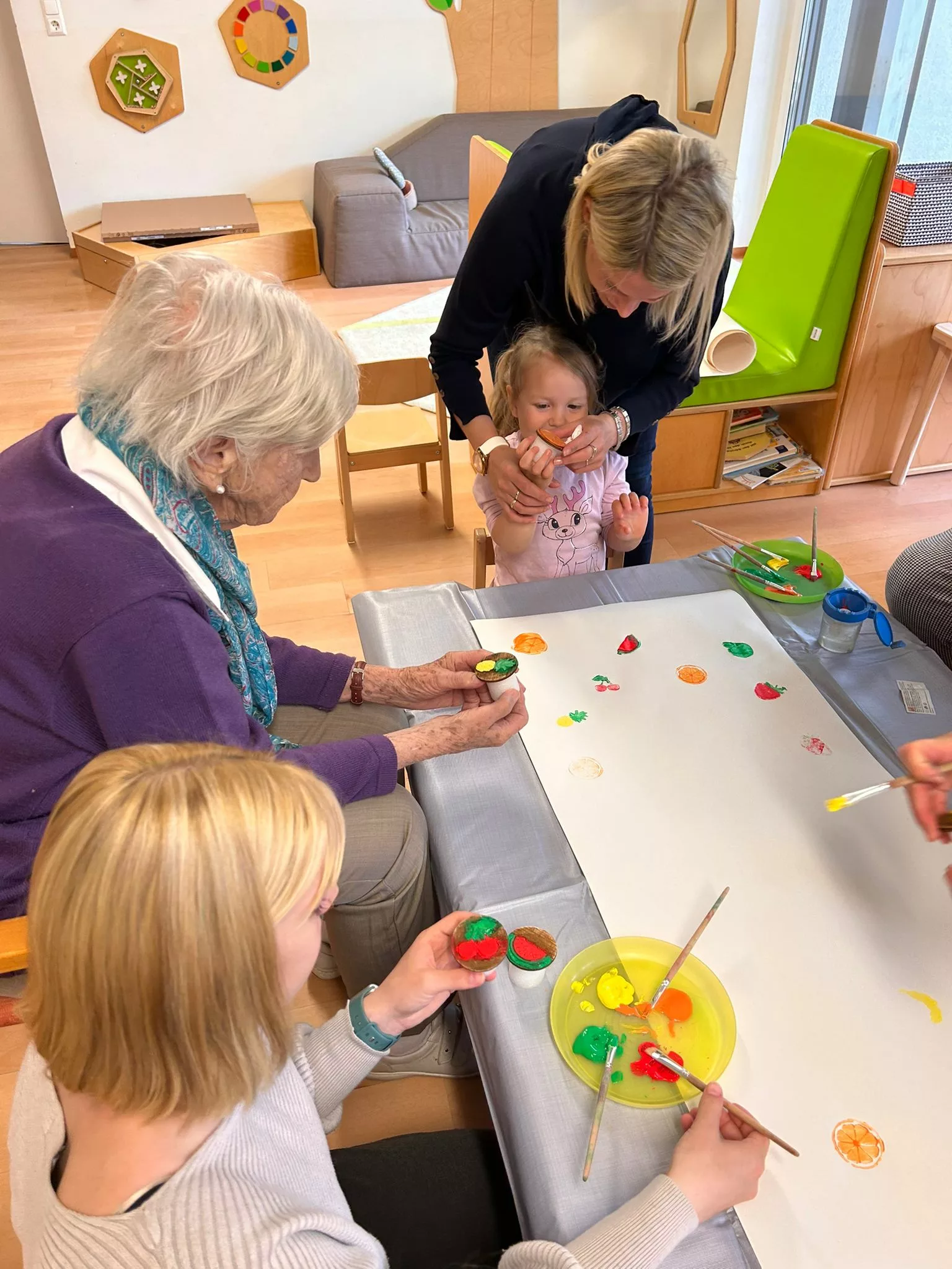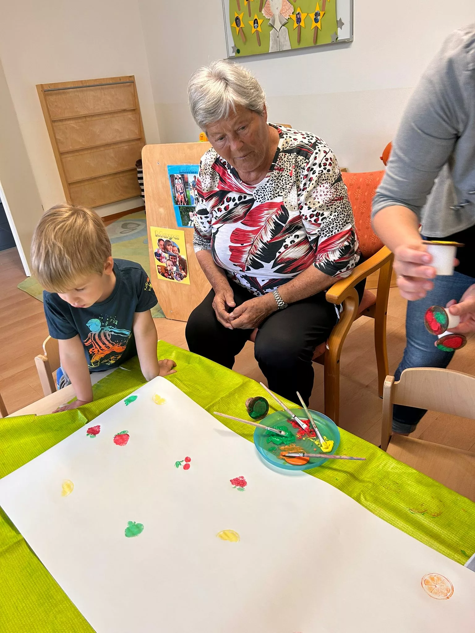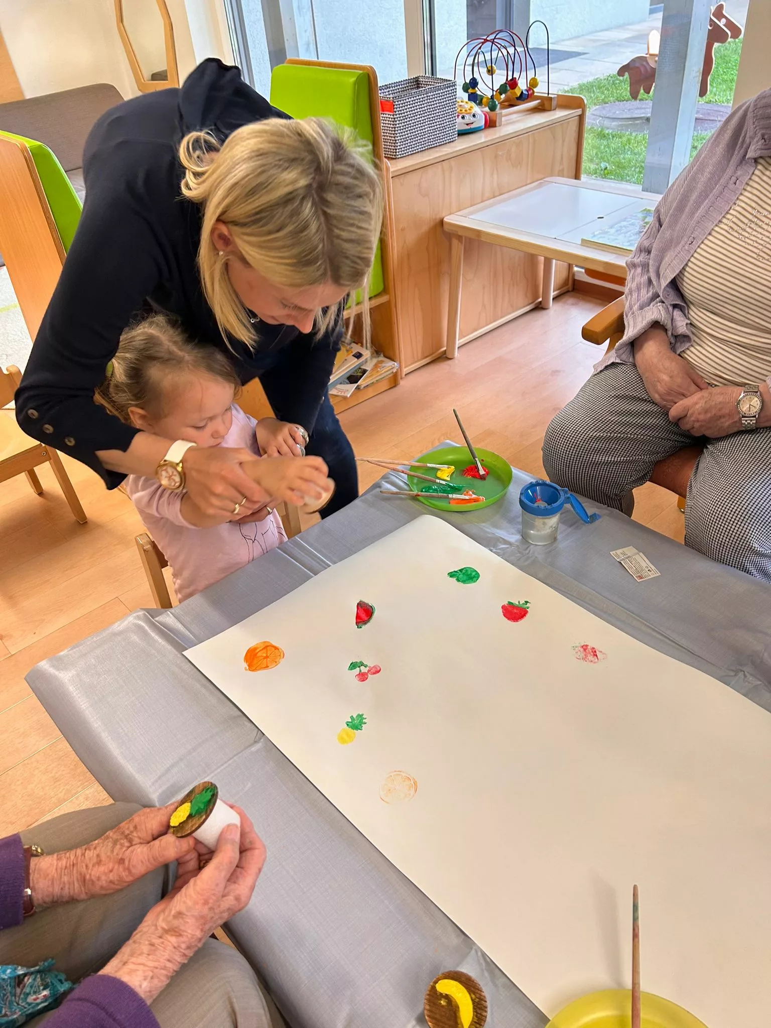 Im Anschluss daran wurde gemeinsam mit den Seniorinnen gebastelt. Für das kommende Sommerfest haben die Kinder zusammen mit den Bewohnerinnen farbenfrohe Tischdecken mit Stempeltechnik gestaltet. Besonders herzerwärmend war dabei zu beobachten, wie liebevoll die Kinder die Seniorinnen begleiteten, sie an die Tische führten und ihnen mit Begeisterung erklärten, was sie nun gemeinsam gestalten würden. Ein schönes Miteinander der Generationen, das alle mit Freude erfüllte.
