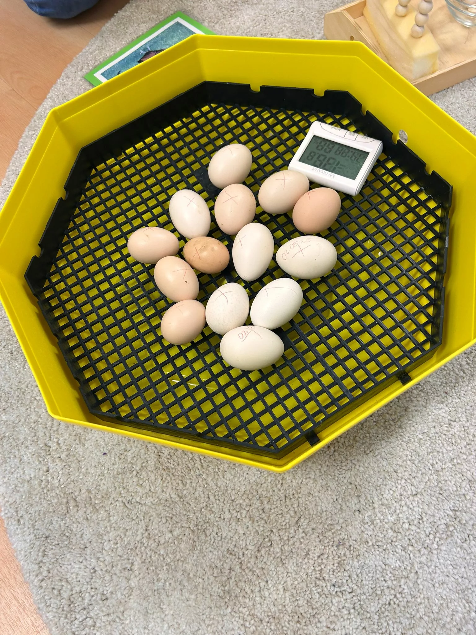 In der KITA dreht sich aktuell alles um das Thema Hühner und Küken. Ein Brutautomat mit befruchteten Eiern wurde aufgestellt, und die Kinder können täglich beobachten, wie sich in den Eiern langsam Leben entwickelt.
